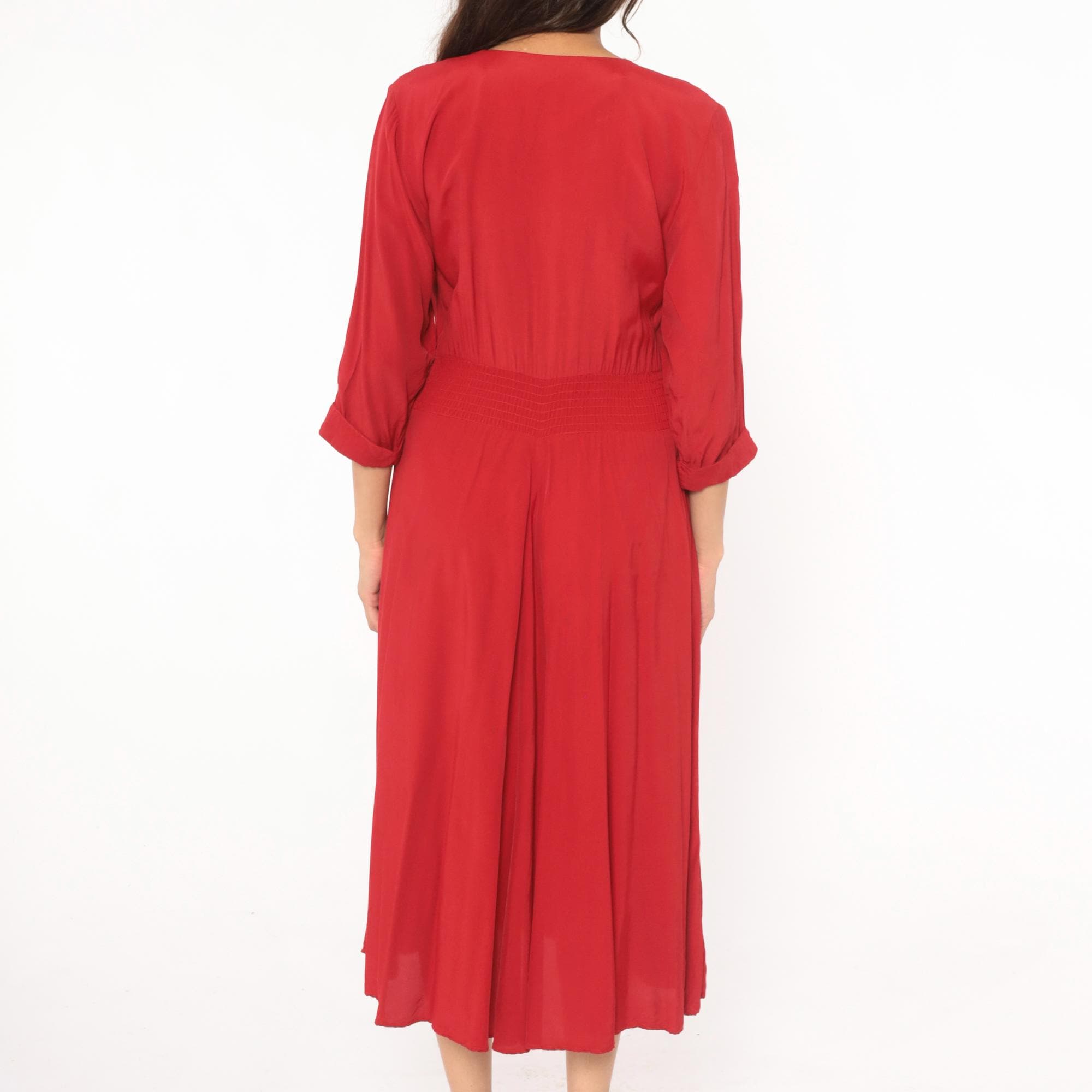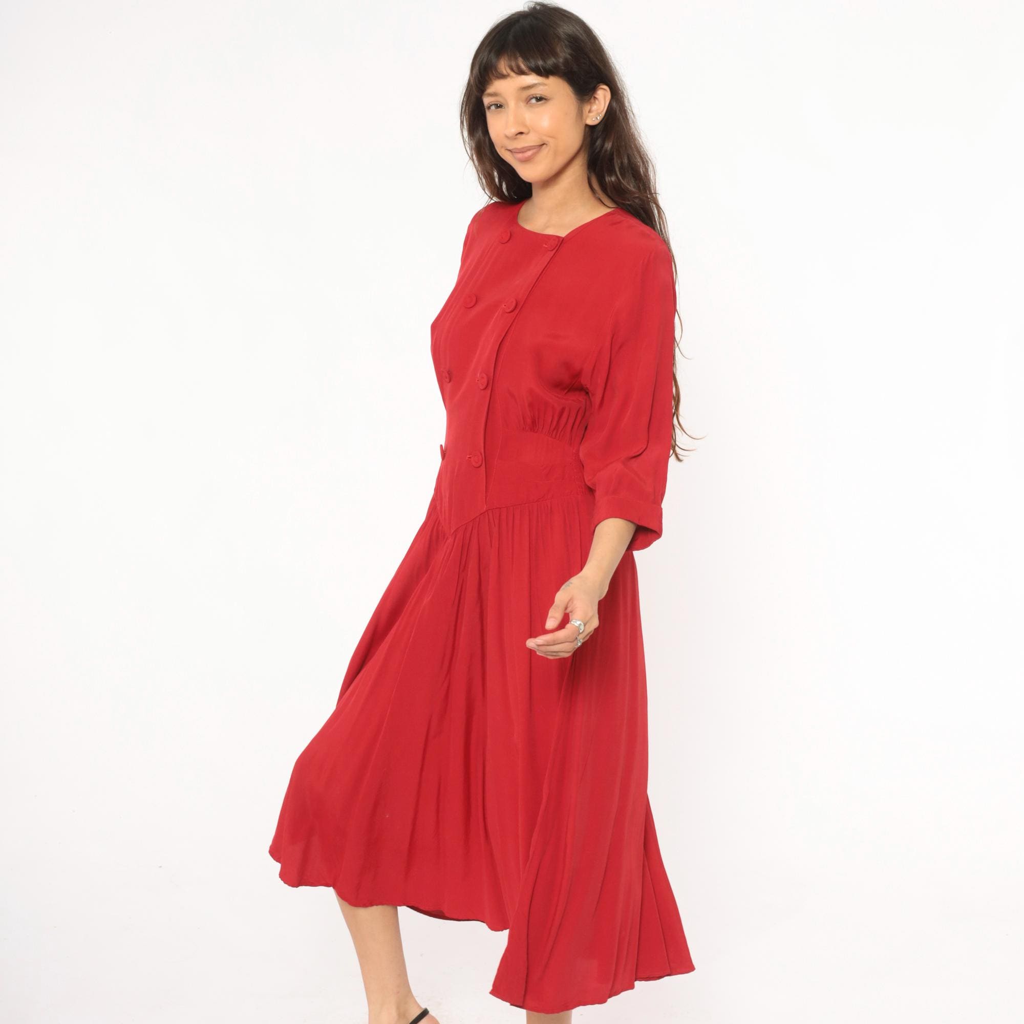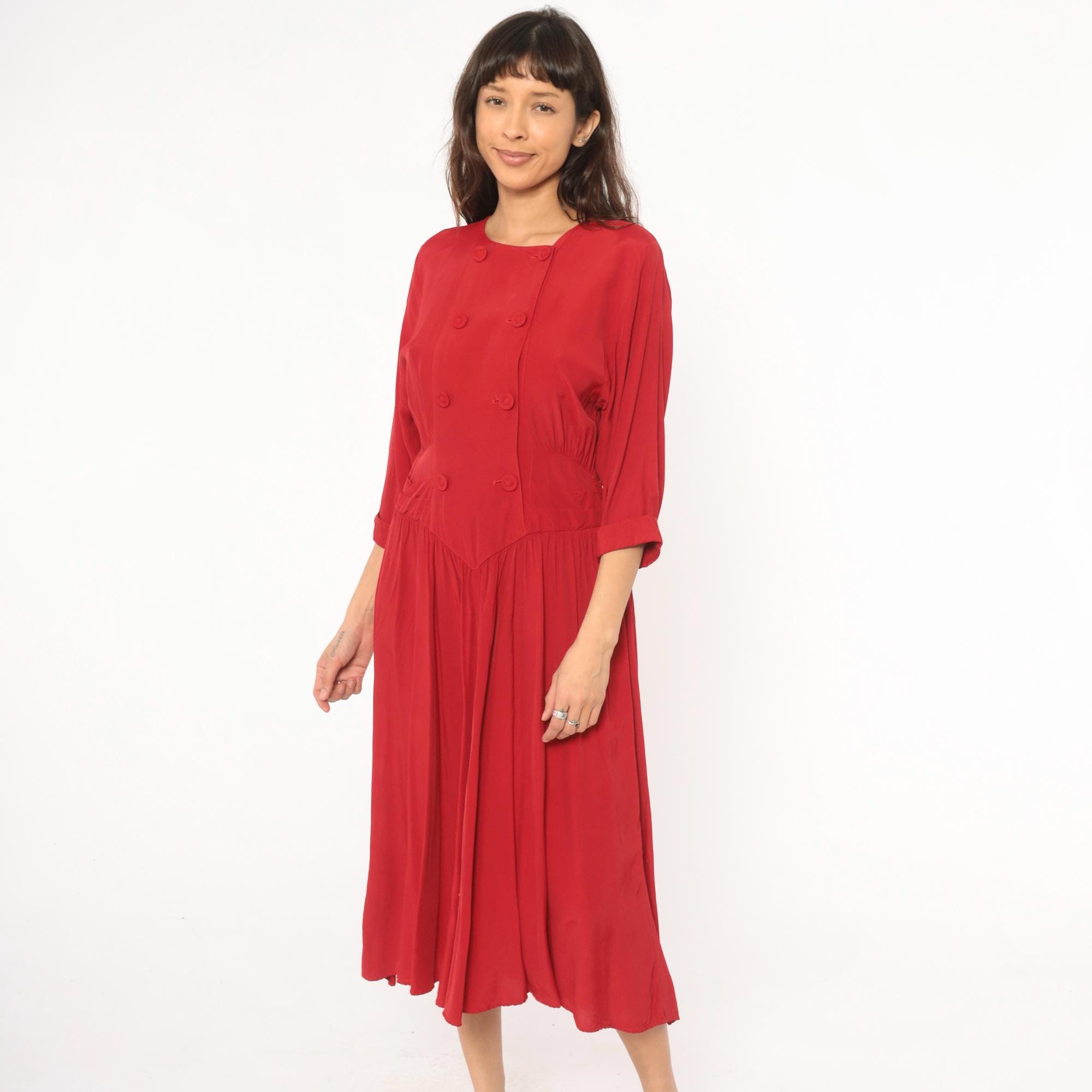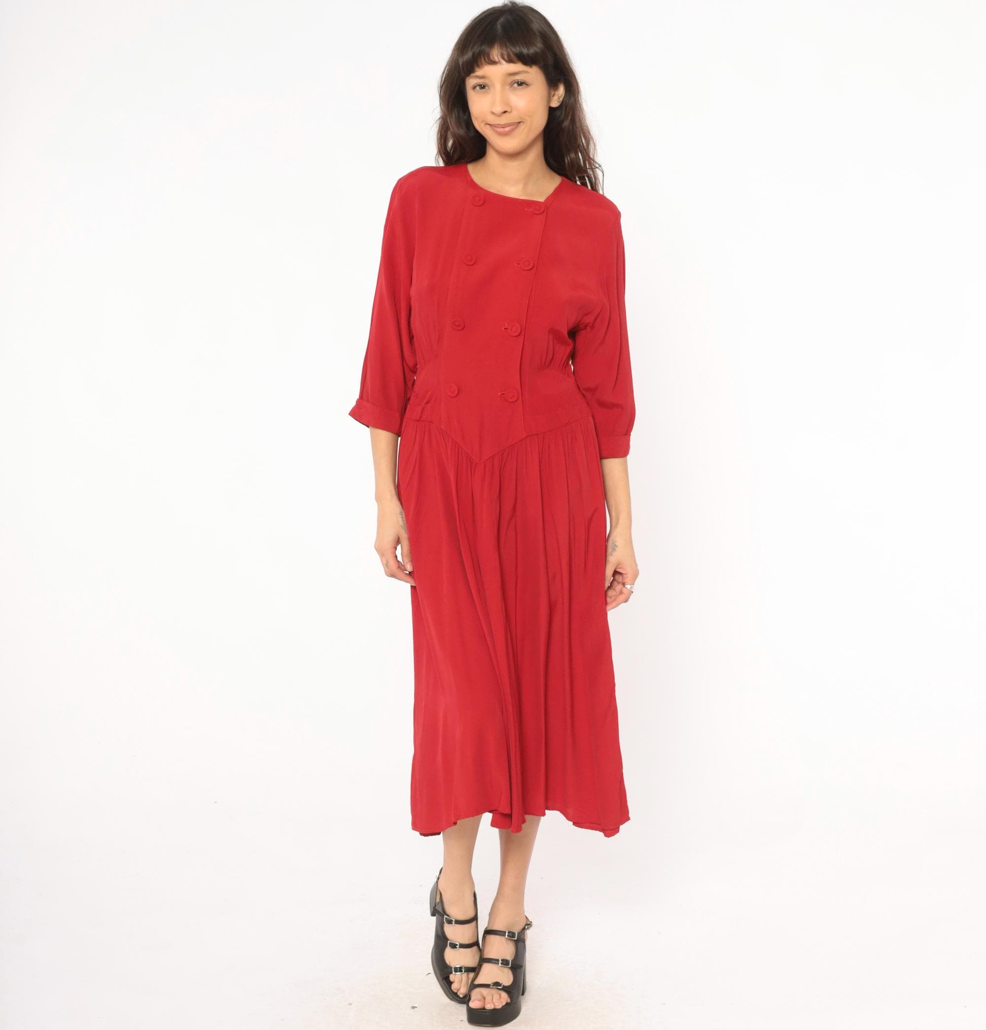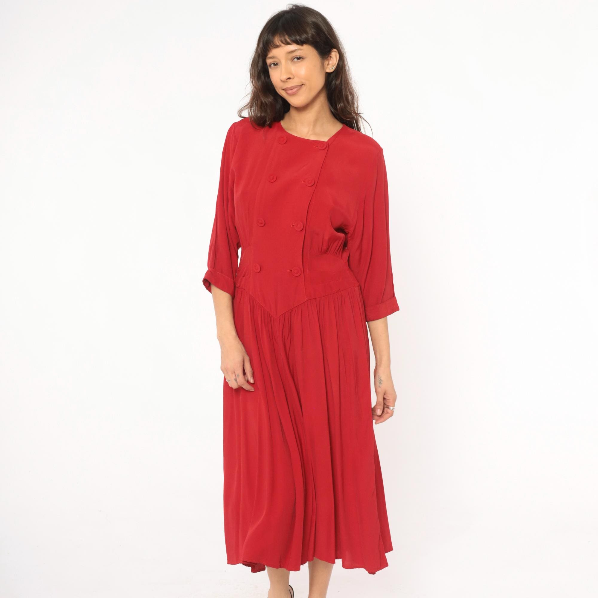 80s crimson double breasted dress from Piccolino Petites with round collarless neckline and two rows of fabric-covered buttons down the front. Fitted bodice with a pointed chevron waistline, smocked elastic back waist, and gathered full skirt falling to mid-calf.