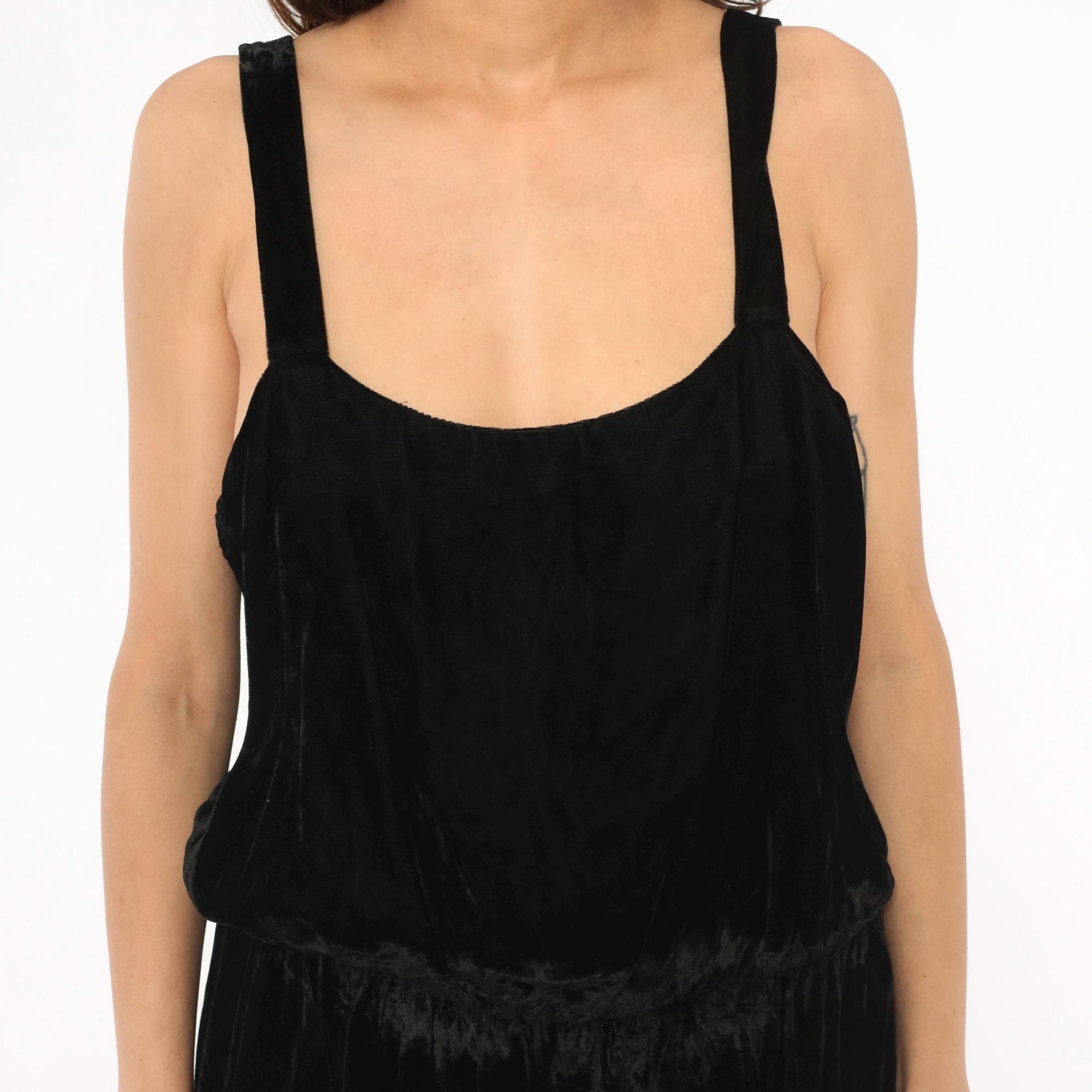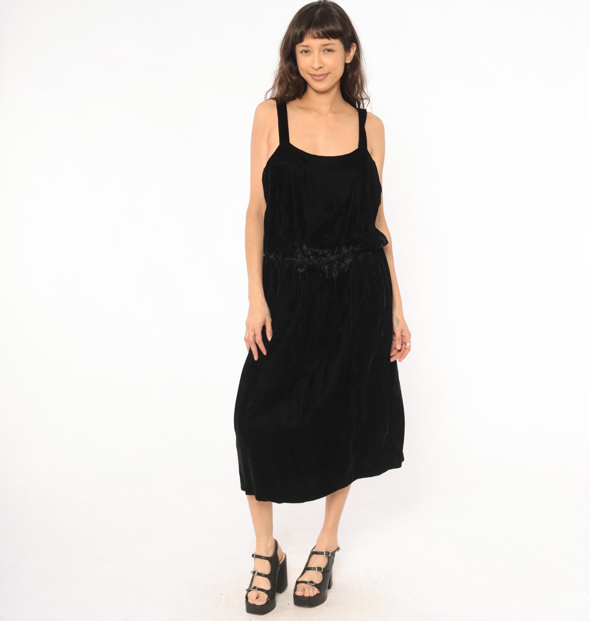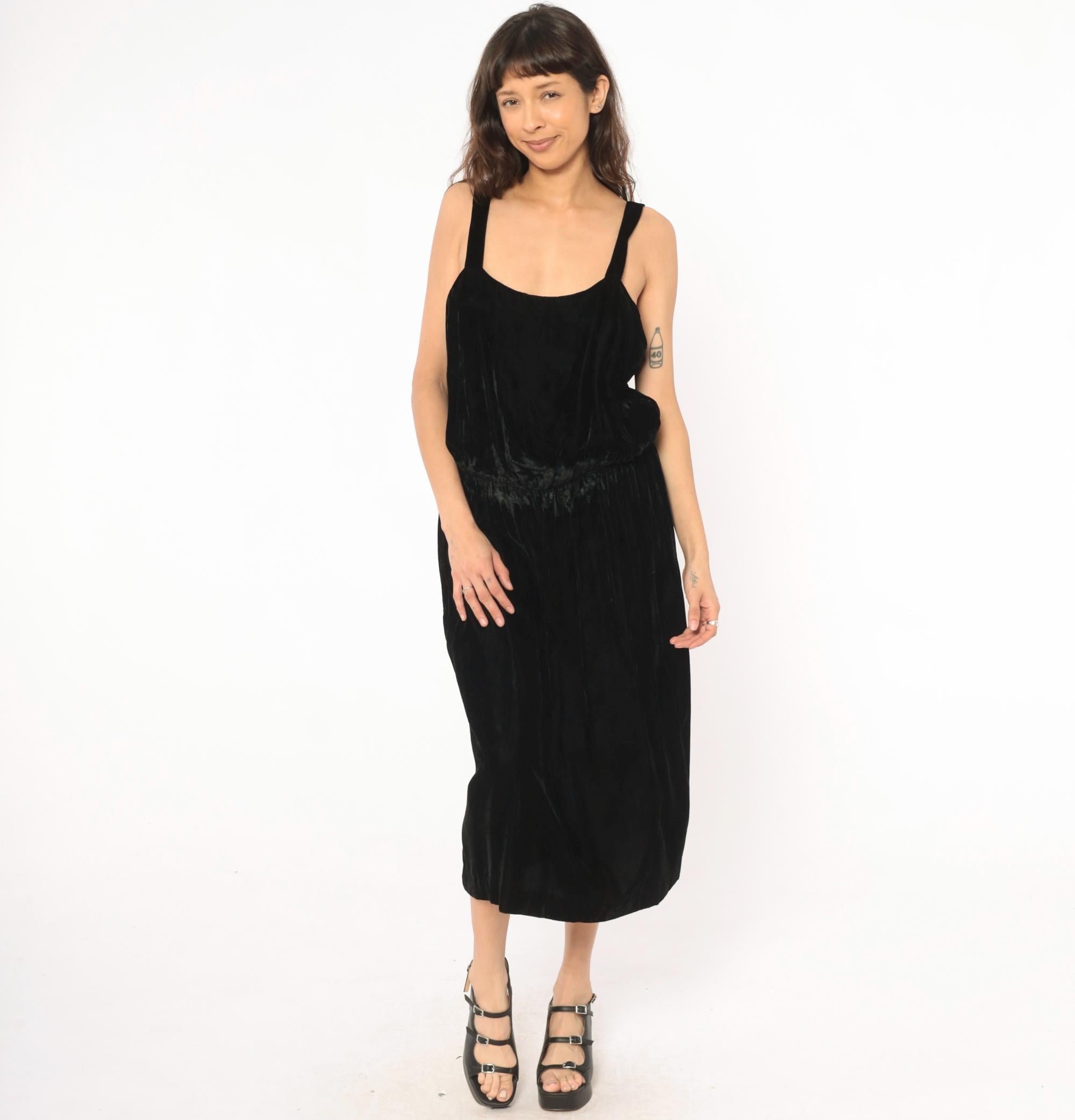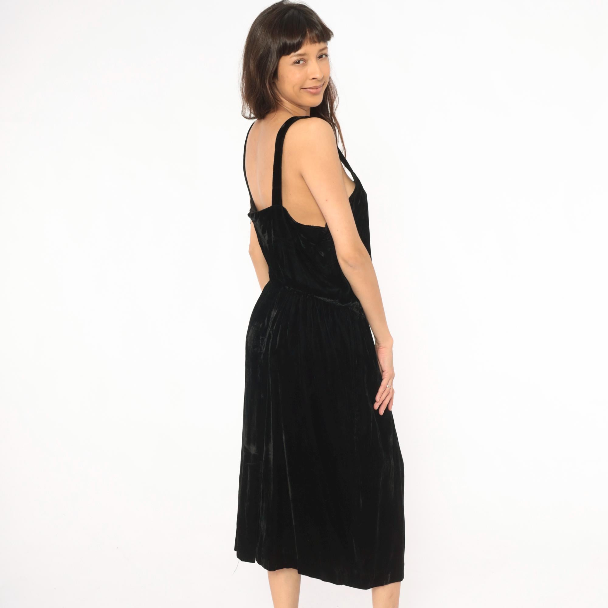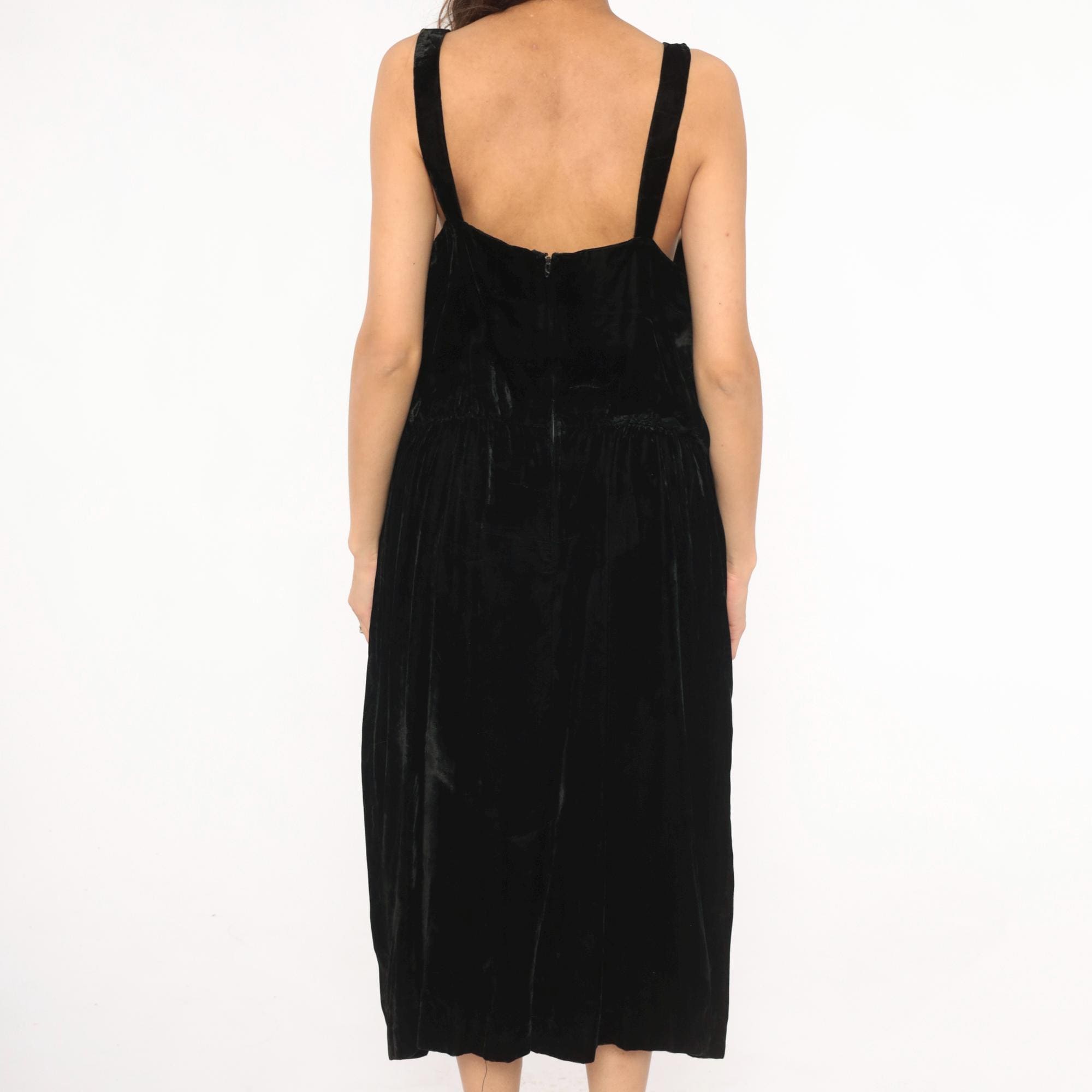 80s black velvet jumper dress from Late Edition LTD with wide straps and a scoop neckline on both the front and back. Gathered waist with a back zipper closure, fitted bodice and a full skirt falling to mid-calf length.