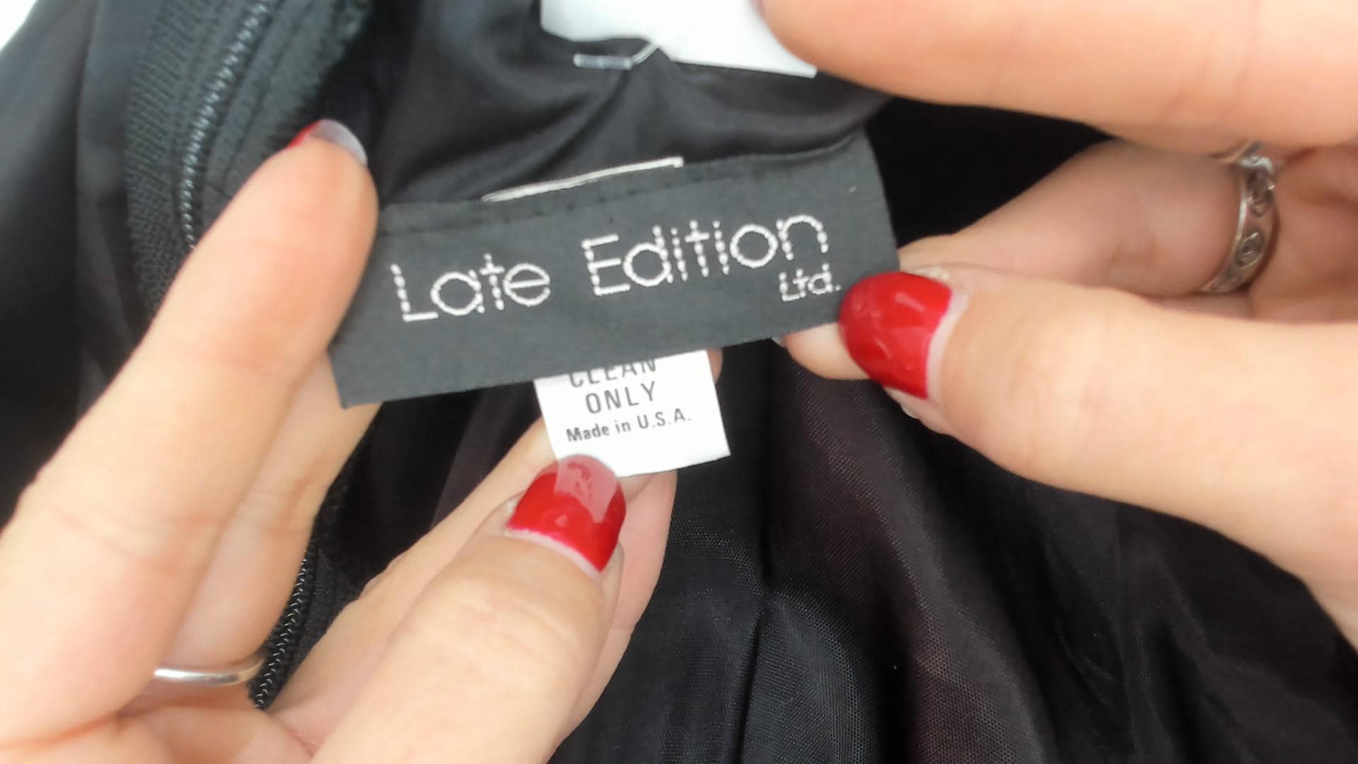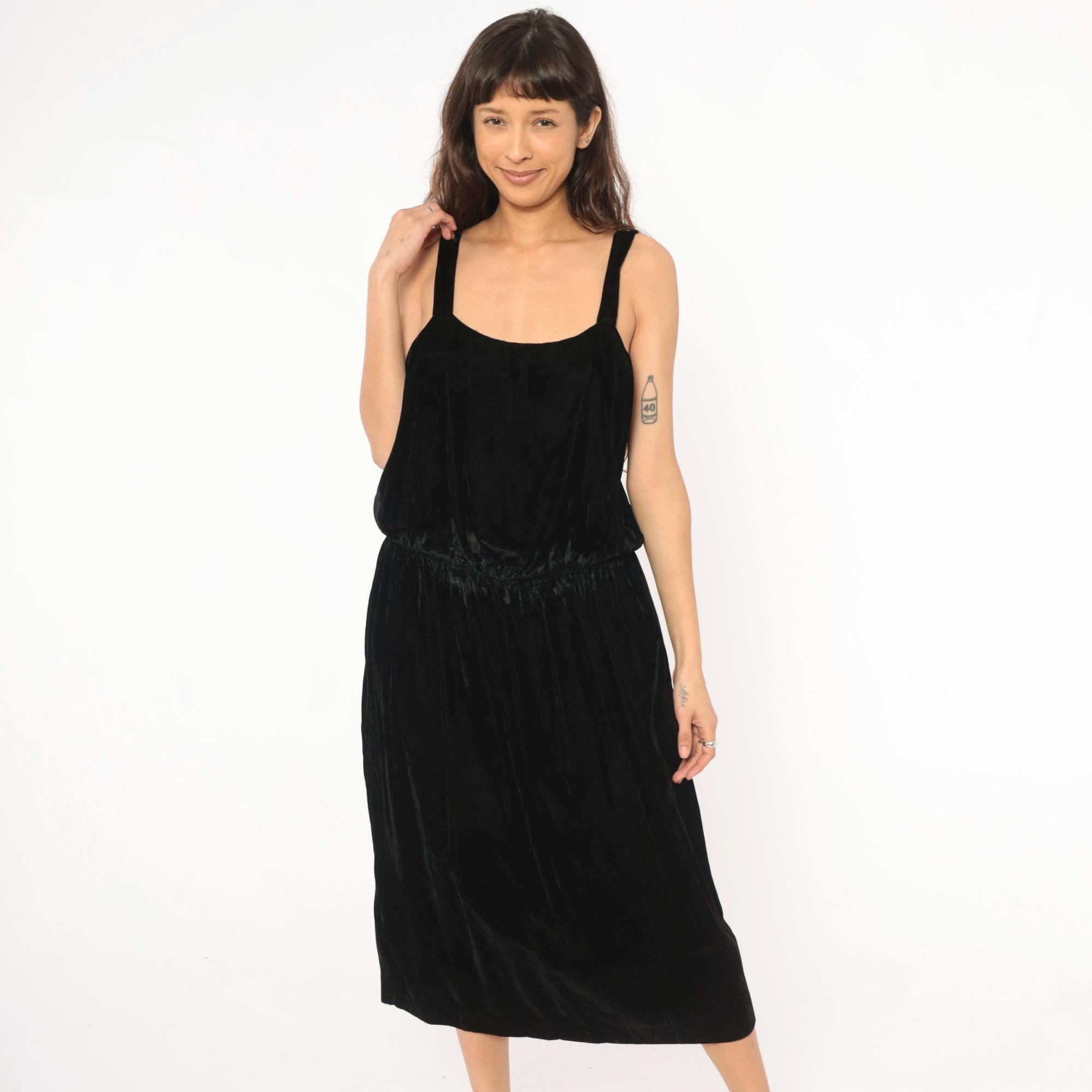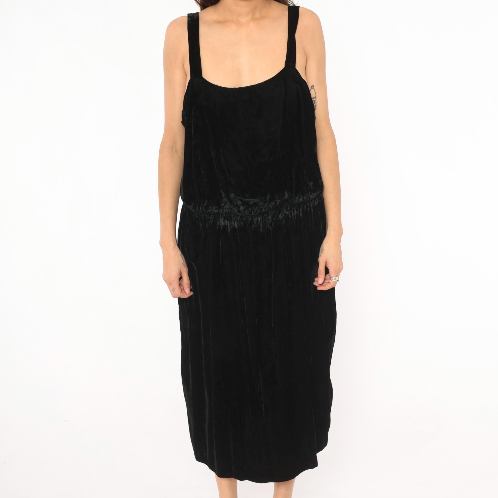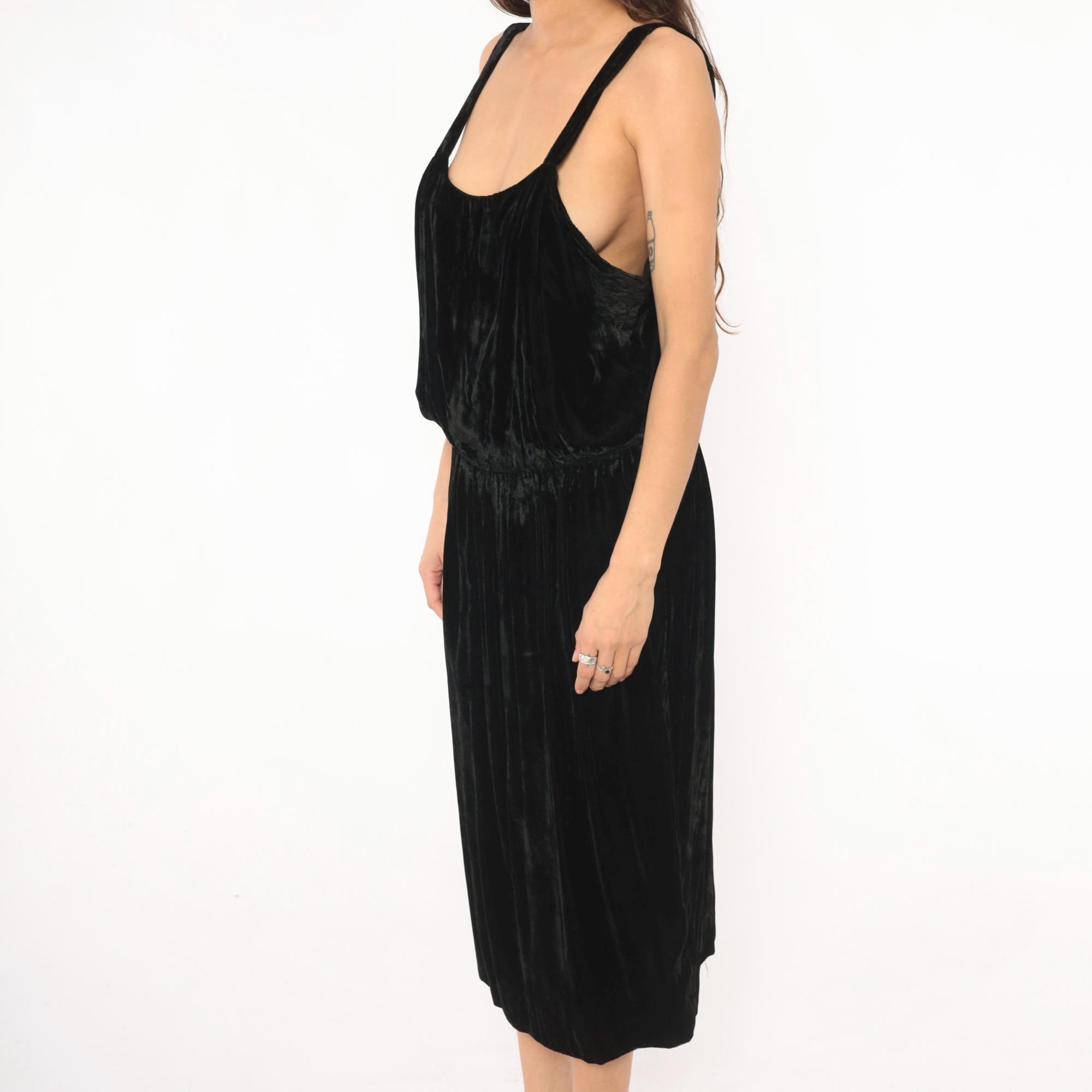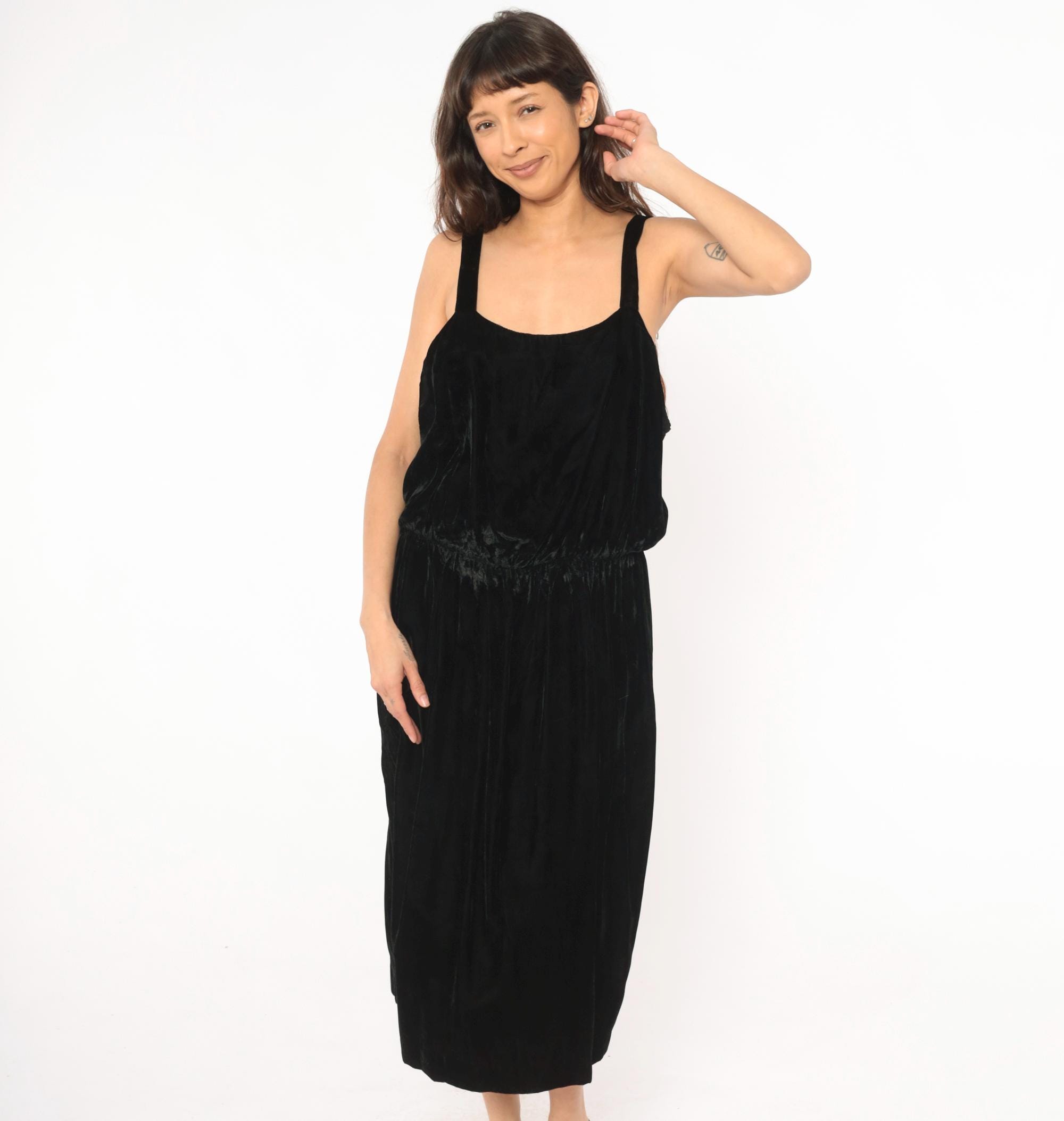 80s black velvet jumper dress from Late Edition LTD with wide straps and a scoop neckline on both the front and back. Gathered waist with a back zipper closure, fitted bodice and a full skirt falling to mid-calf length.