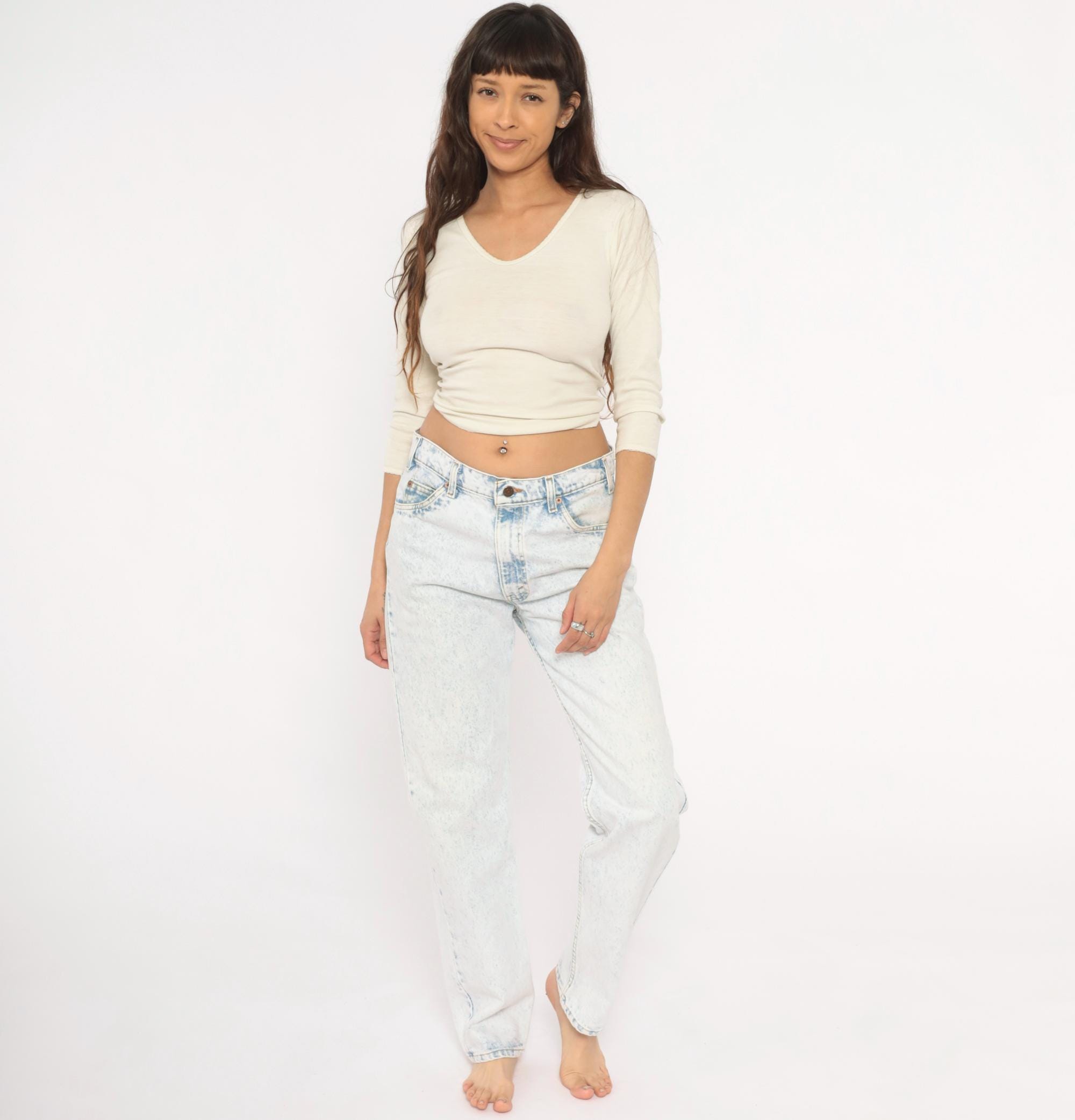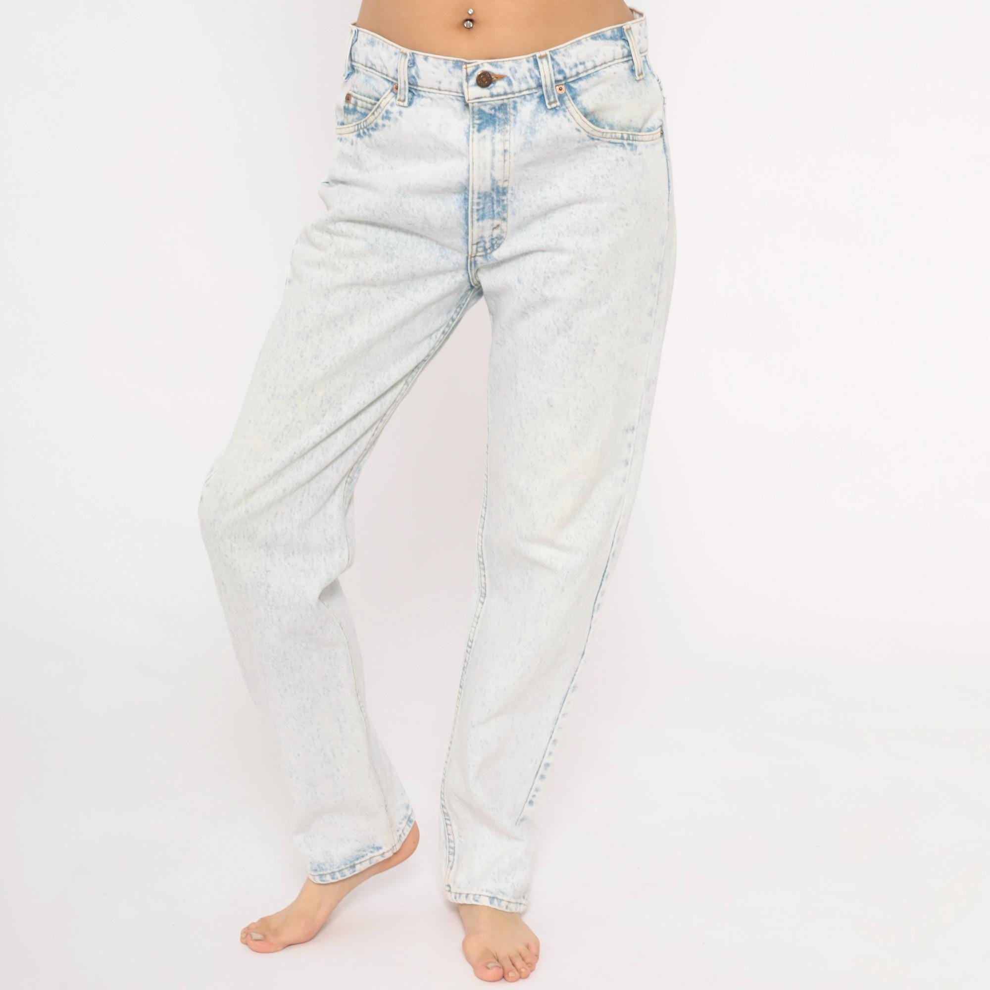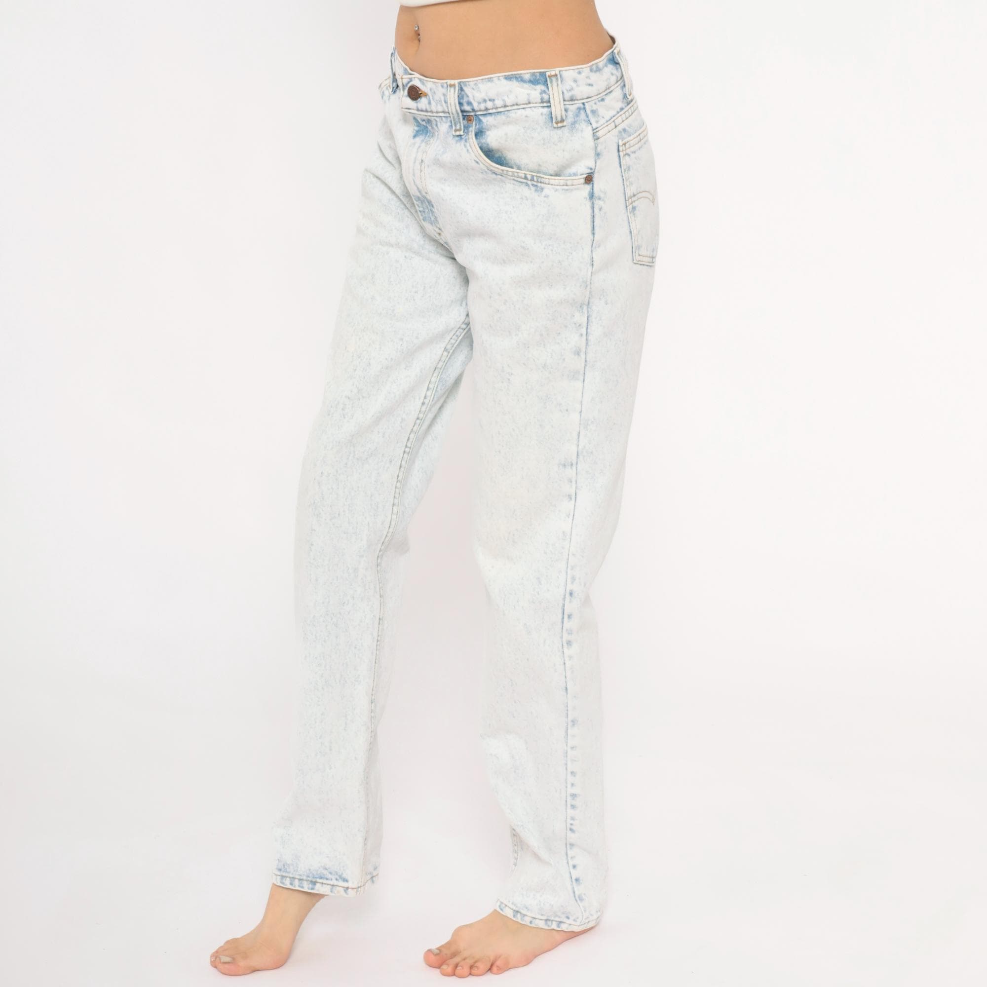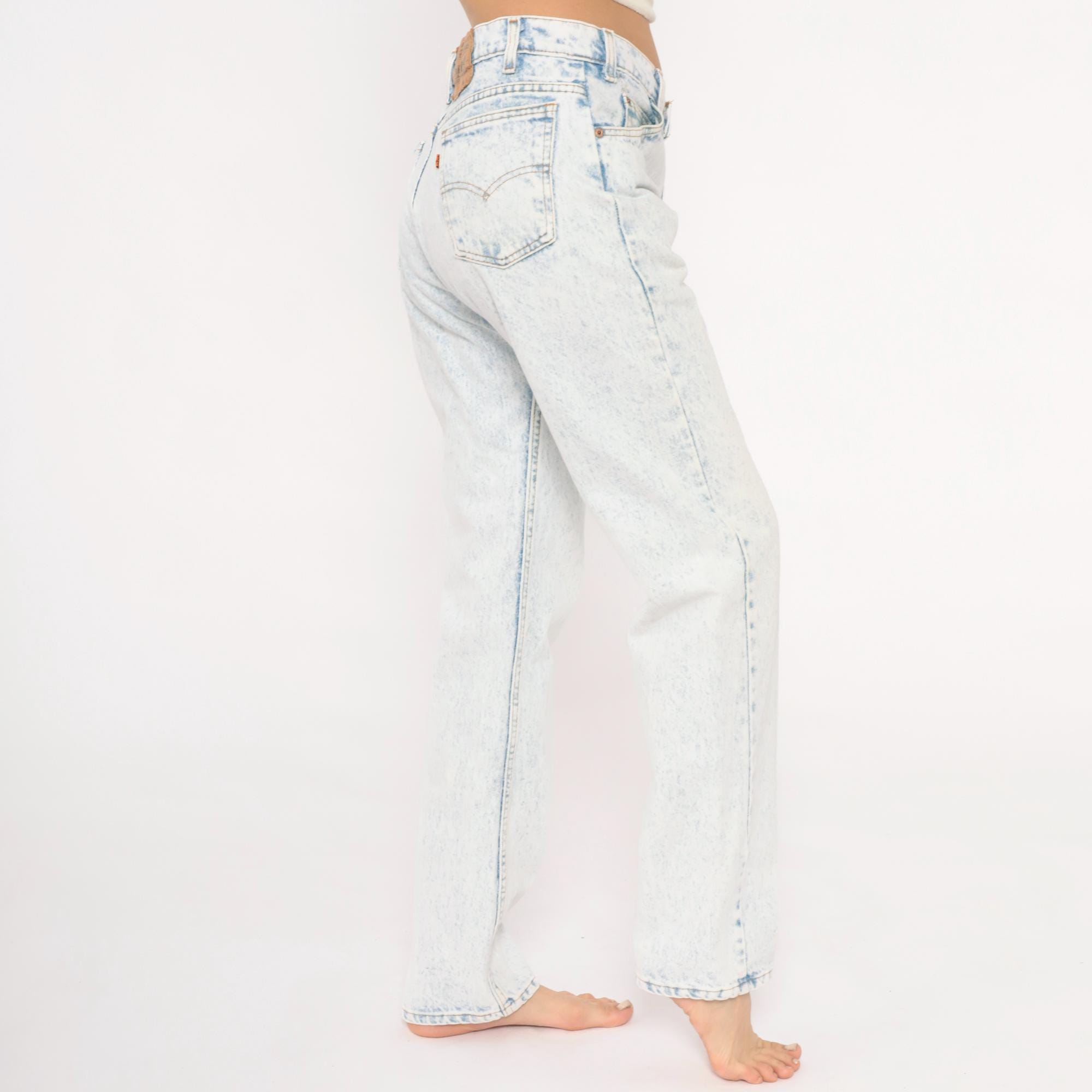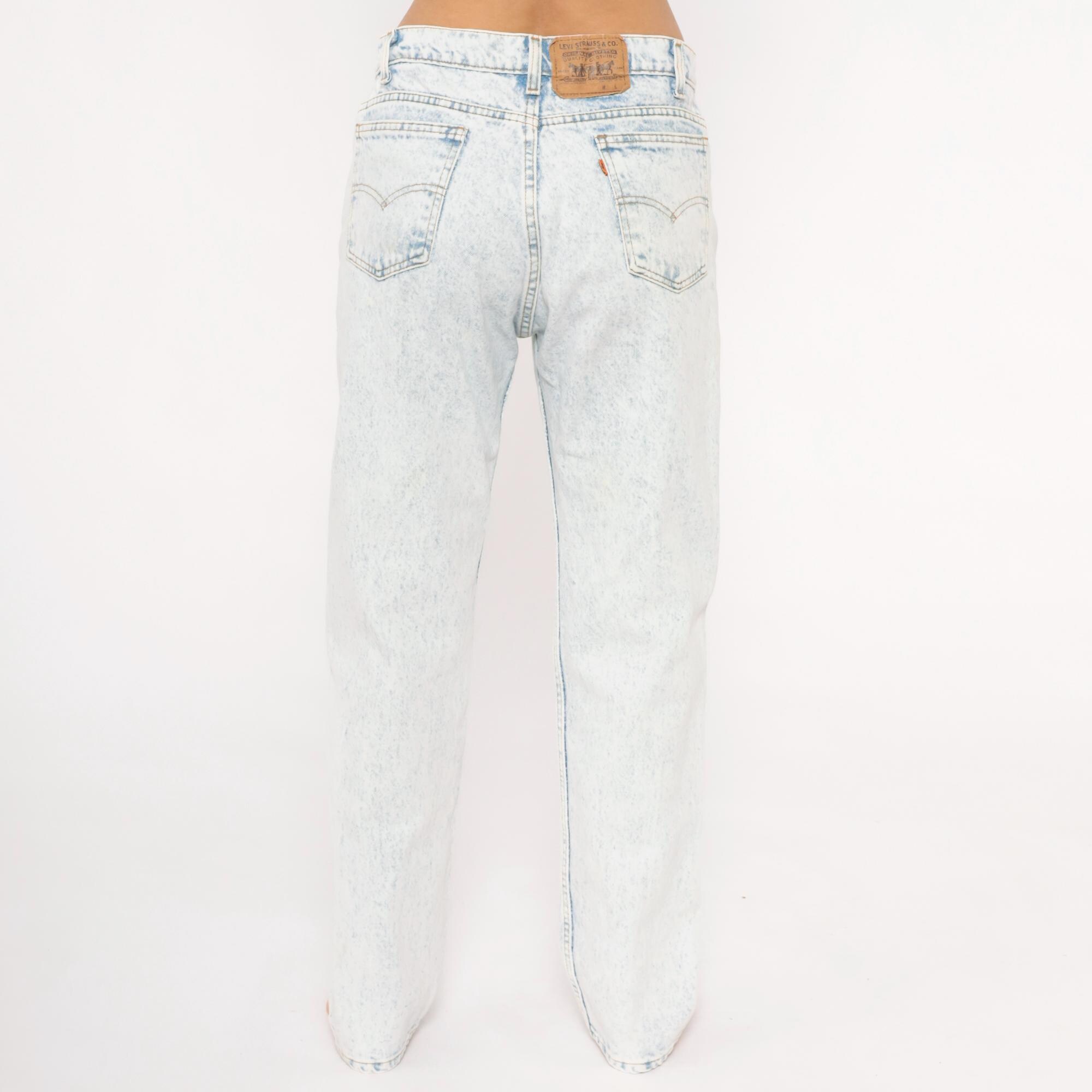 90s acid wash Levis jeans in a light blue and white bleached denim with a straight tapered leg and high waisted rise. Button and zipper front closure, five-pocket construction with side seam pockets. Orange tab on the back right pocket with the leather Levi Strauss & Co. patch at the back waistband.