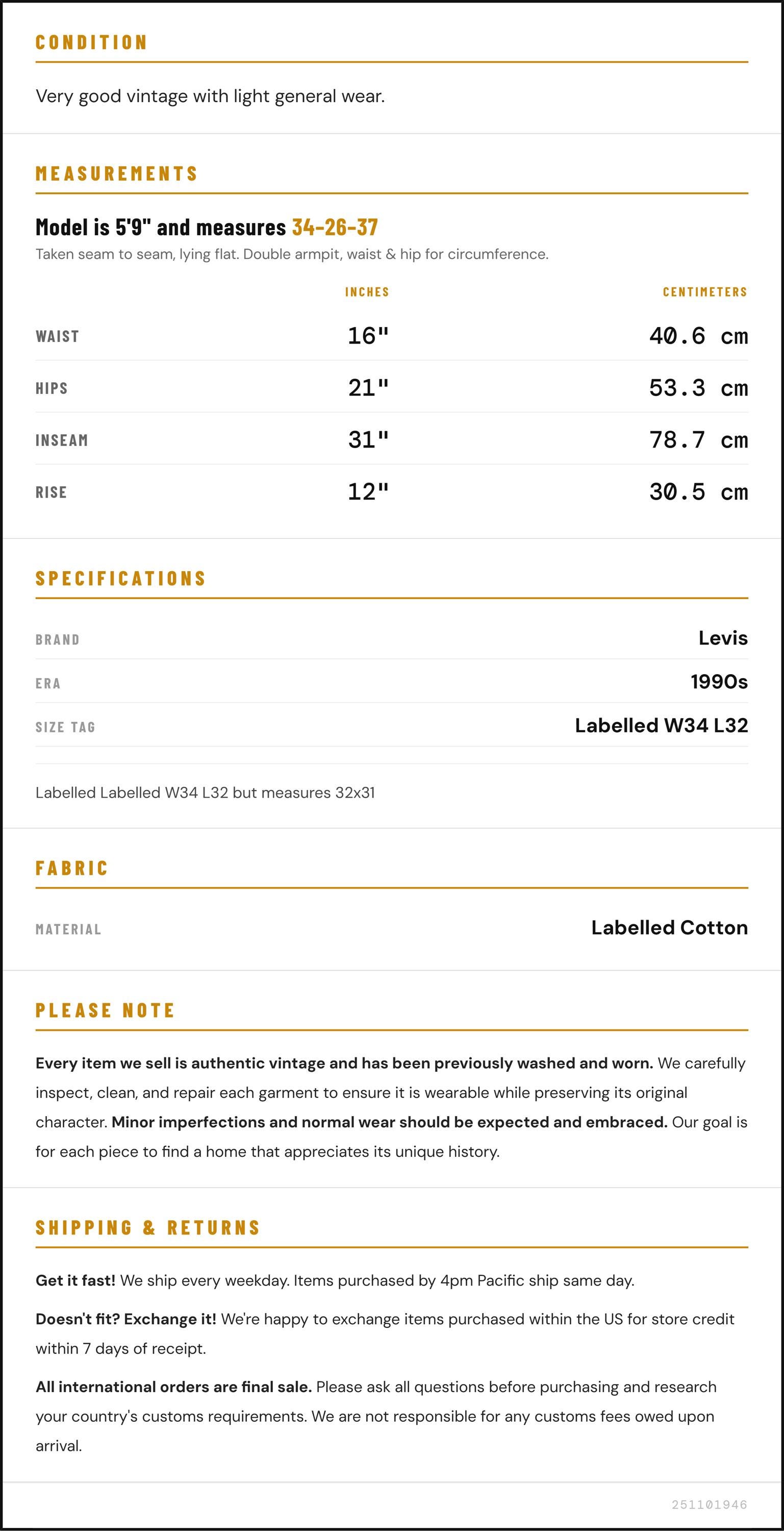Vintage denim was usually made without any stretch, unlike modern jeans. Check the measurements to ensure proper fit, and remember to give yourself a little wiggle room in the waist and hips, depending on your preferred fit.