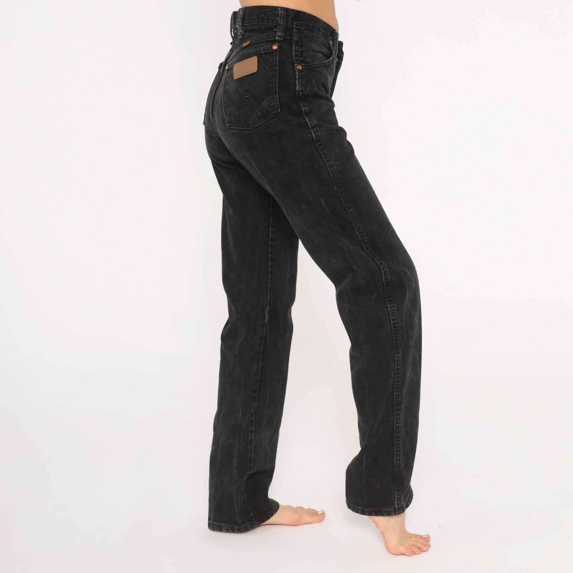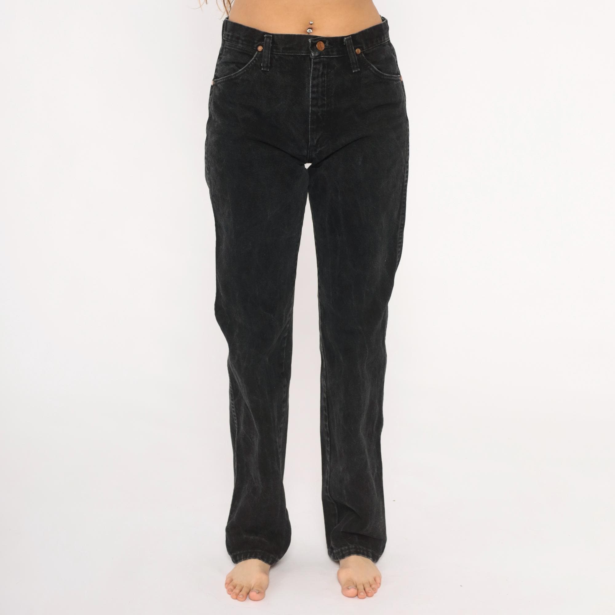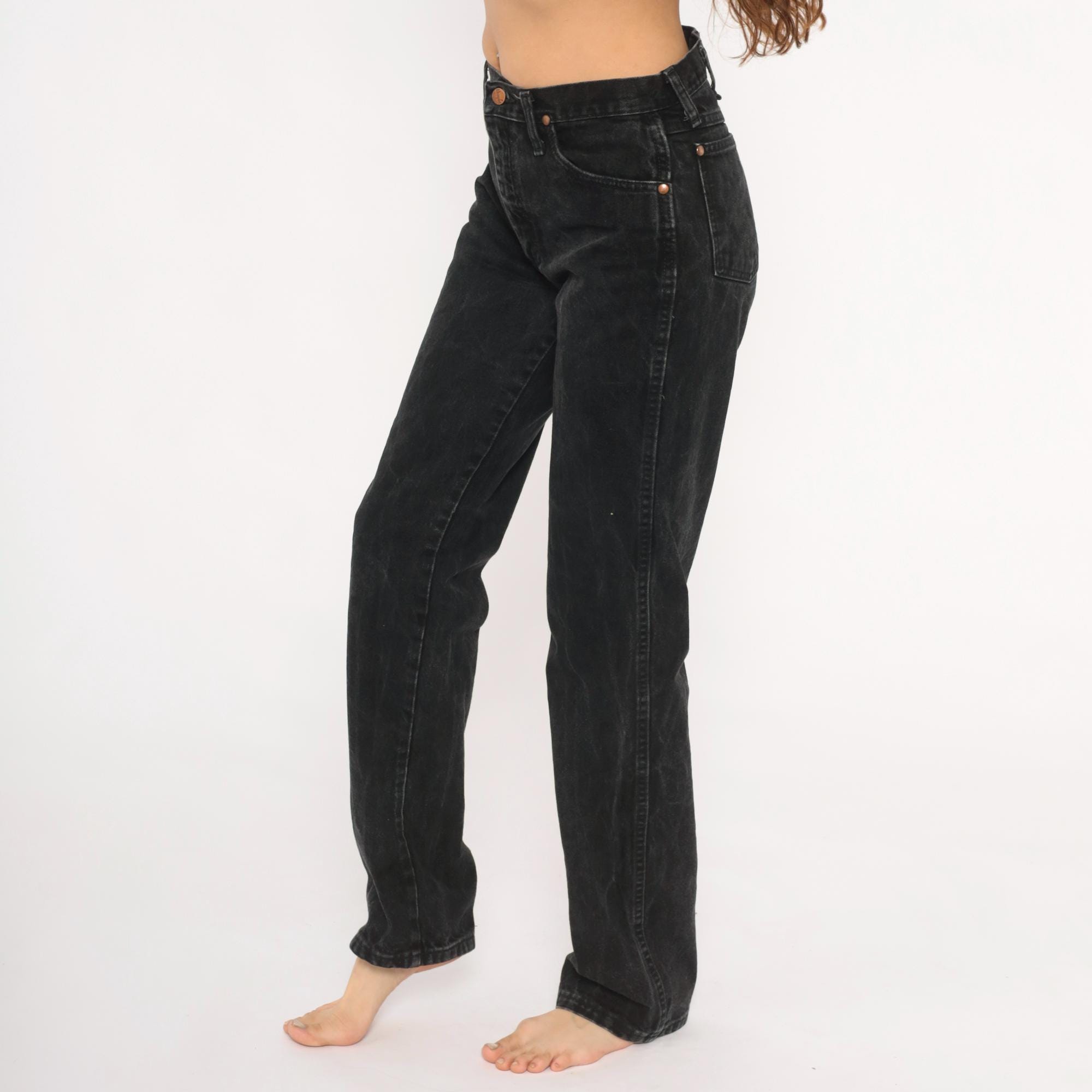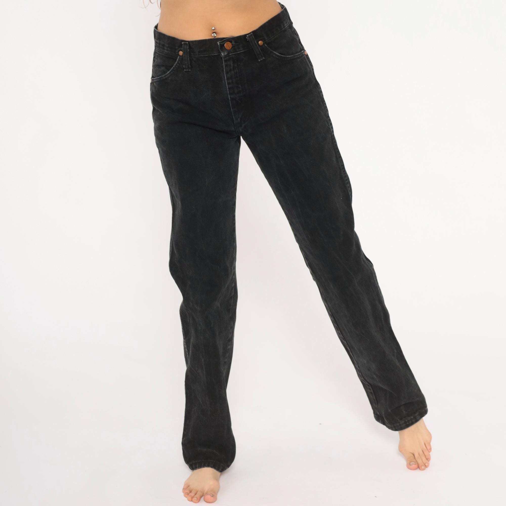 90s Wrangler jeans in a faded black wash with charcoal gray tones throughout. Five-pocket construction with copper-tone rivets, front zipper and button closure, and belt loops. Straight leg silhouette with a high rise waist, leather Wrangler patch on the back right pocket, and embroidered gold logo on the waistband.