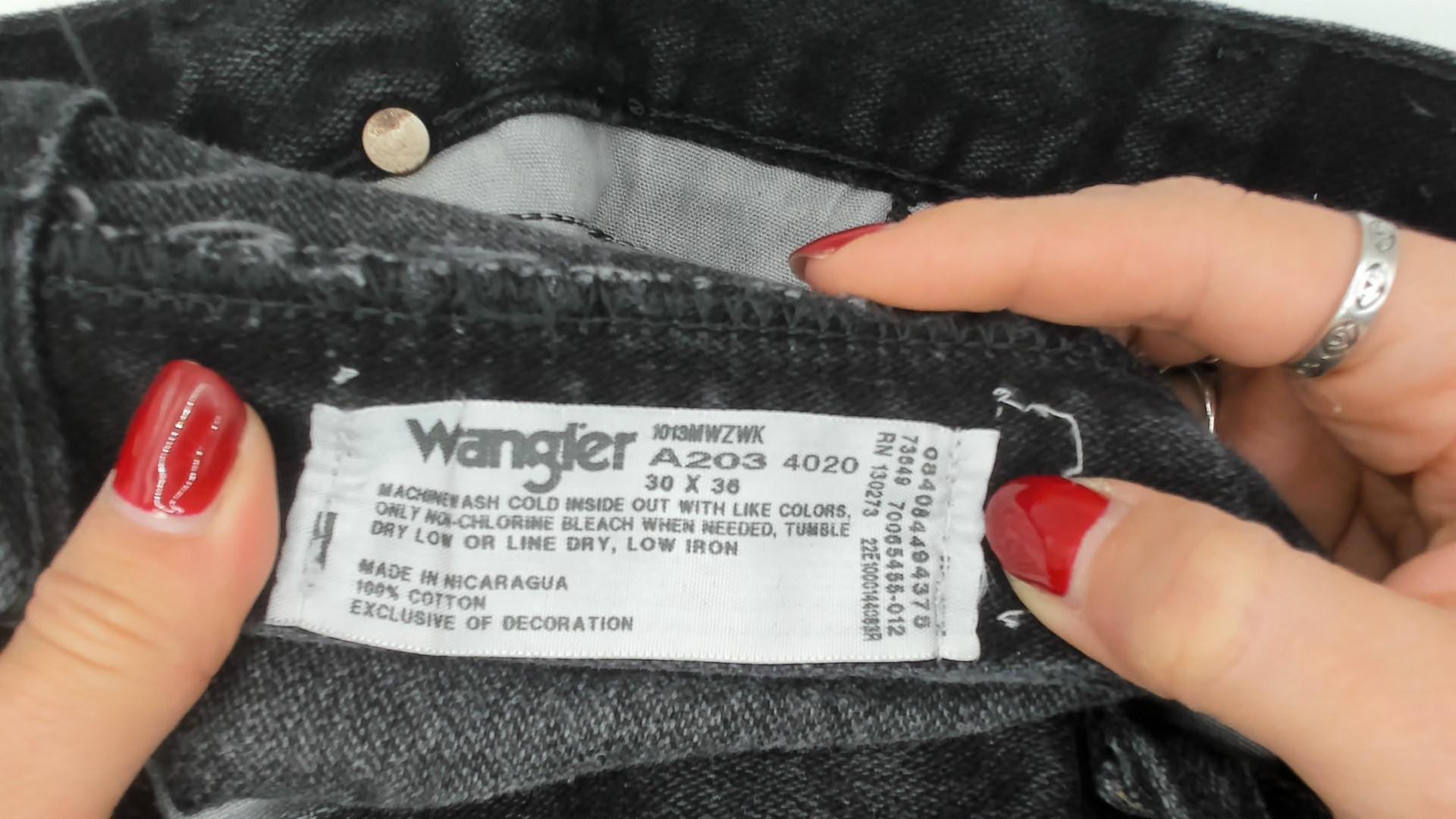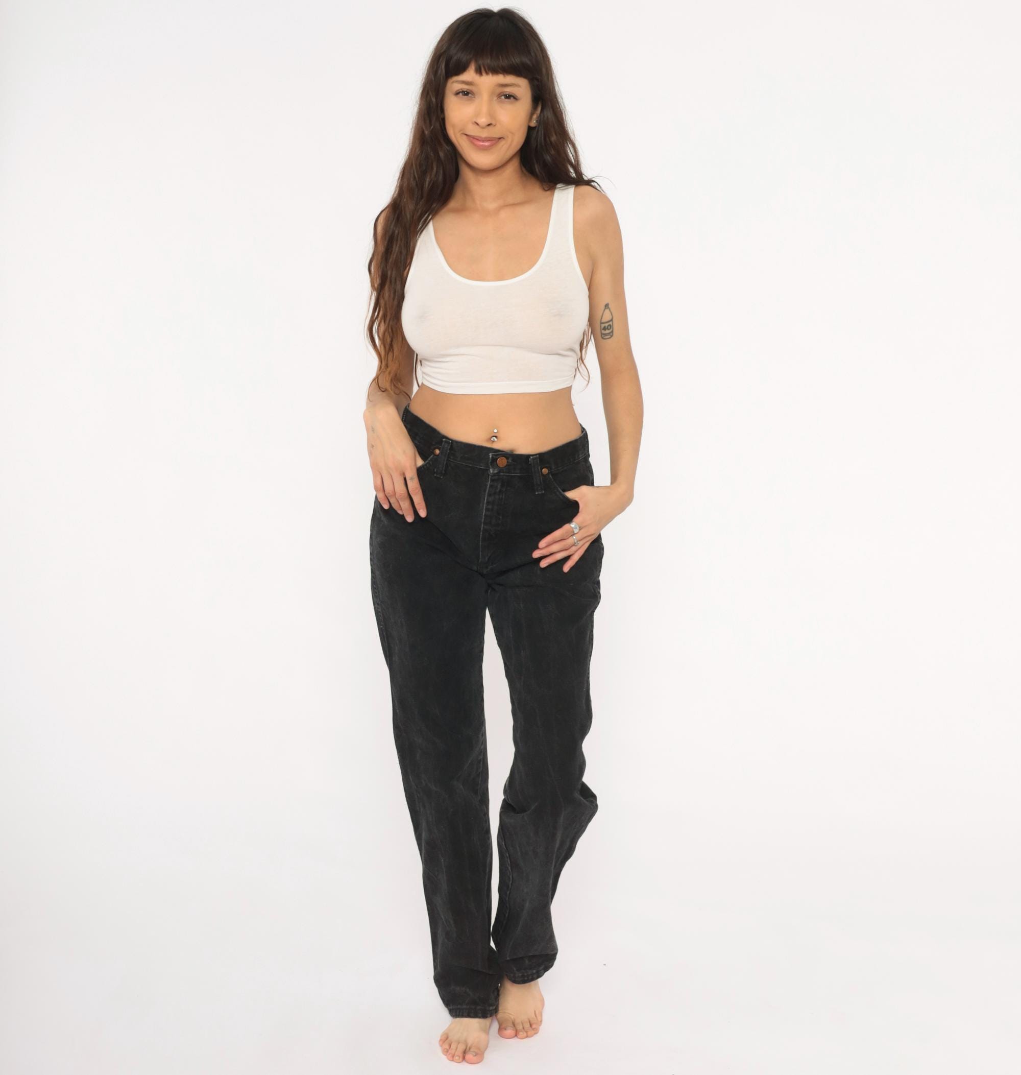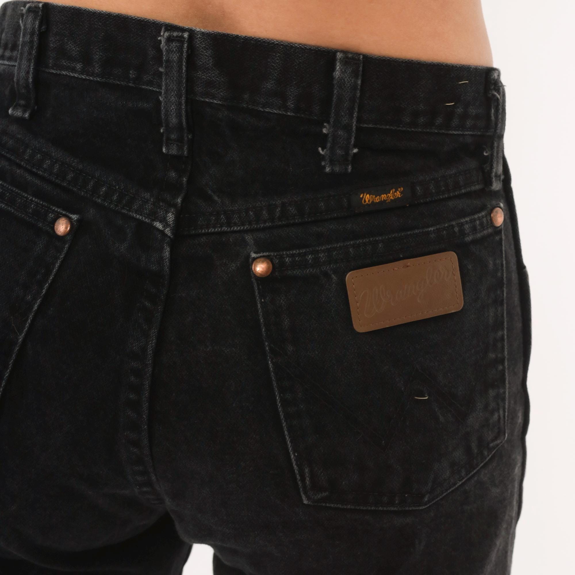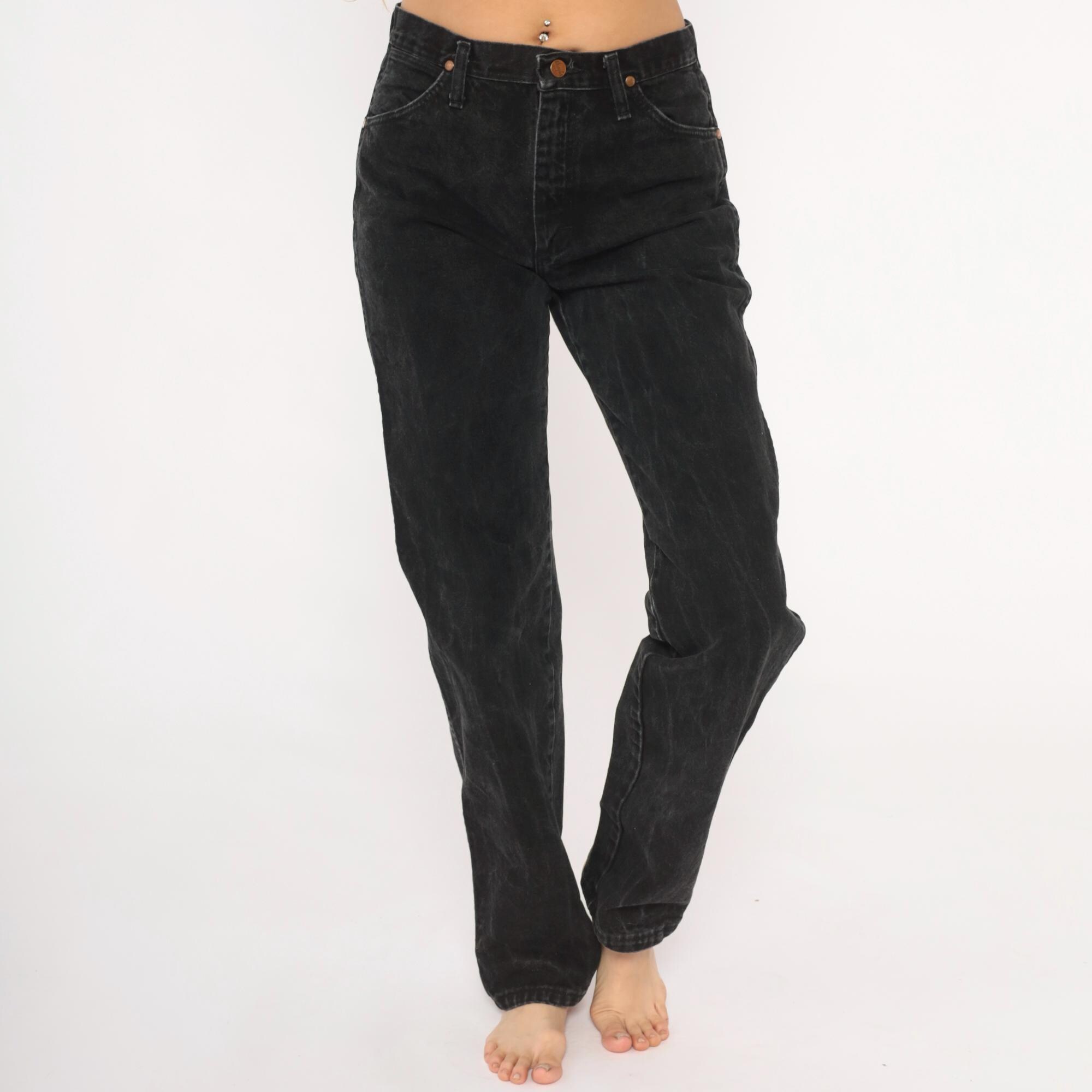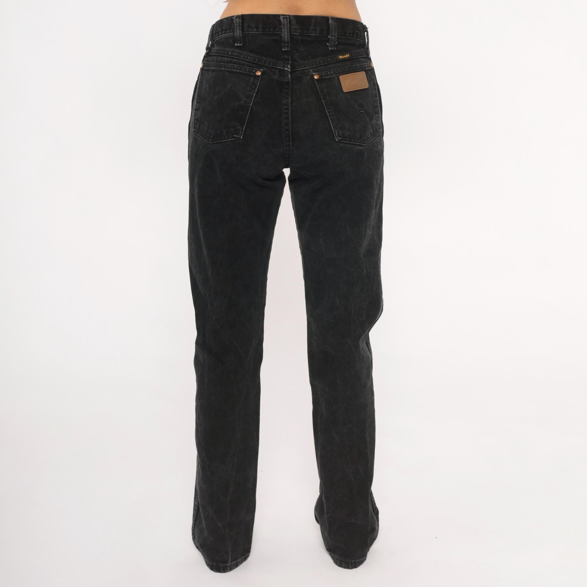 90s Wrangler jeans in a faded black wash with charcoal gray tones throughout. Five-pocket construction with copper-tone rivets, front zipper and button closure, and belt loops. Straight leg silhouette with a high rise waist, leather Wrangler patch on the back right pocket, and embroidered gold logo on the waistband.