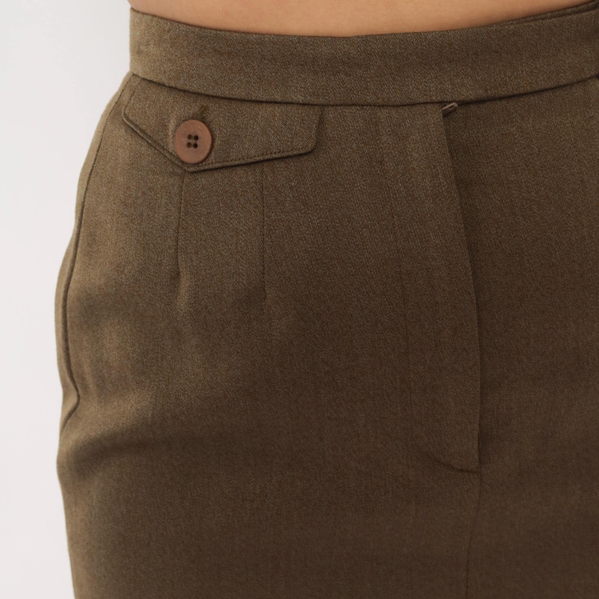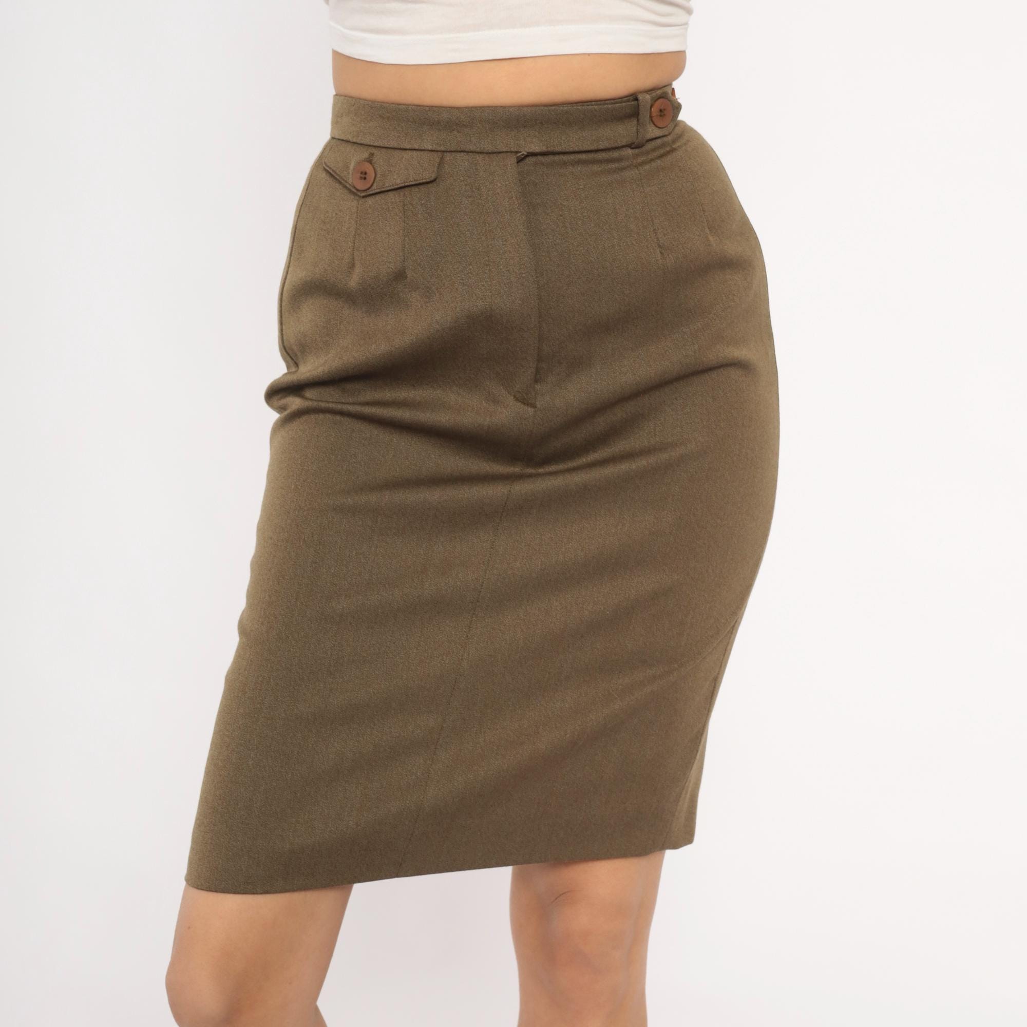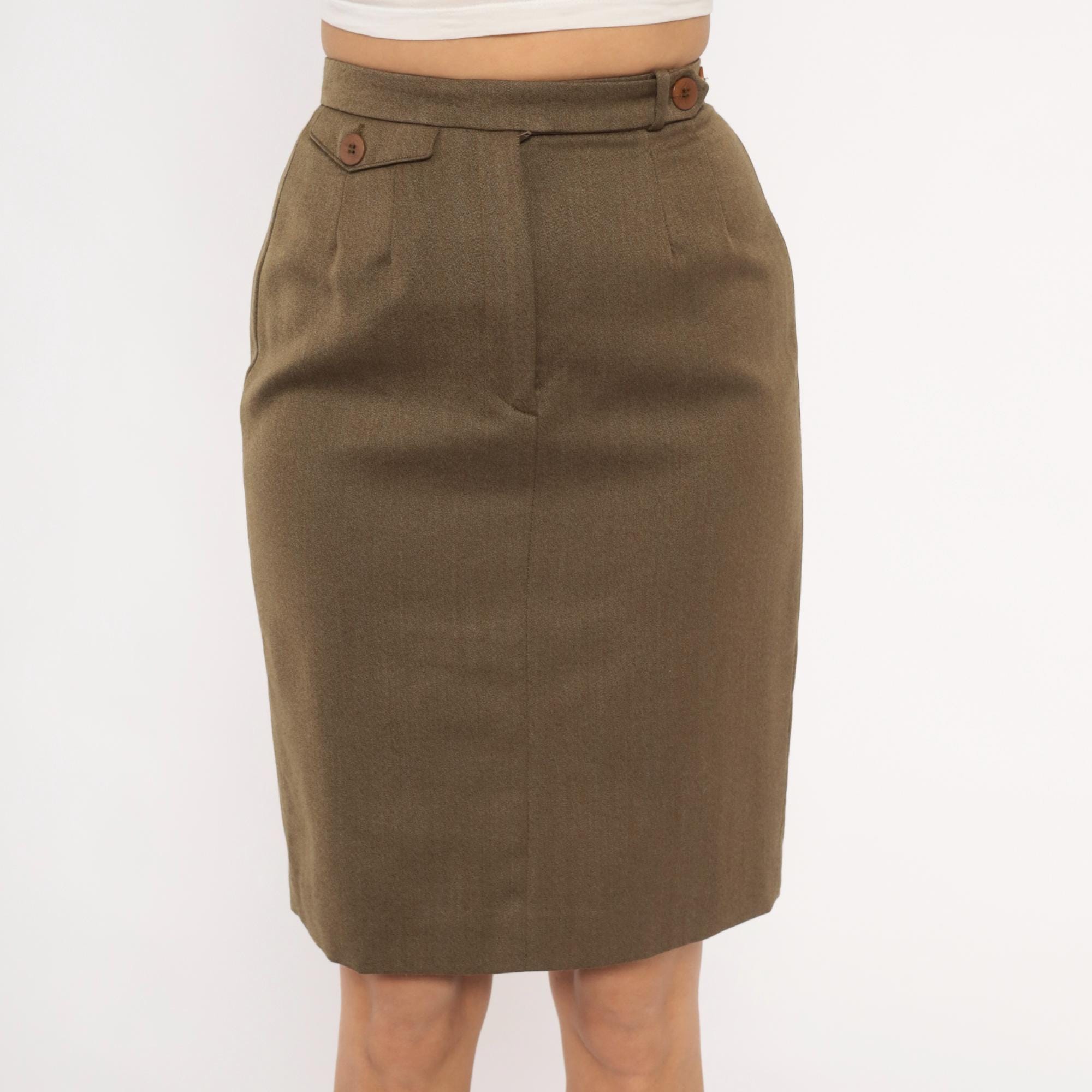 90s olive wool pencil skirt from Barry Bricken with a high waistband, two brown button tabs at the front waist, and a side zipper closure. Pleated front with a center seam running down both front and back panels. The skirt hits just above the knee with a small back vent, in a muted army green and tan heathered tone.
