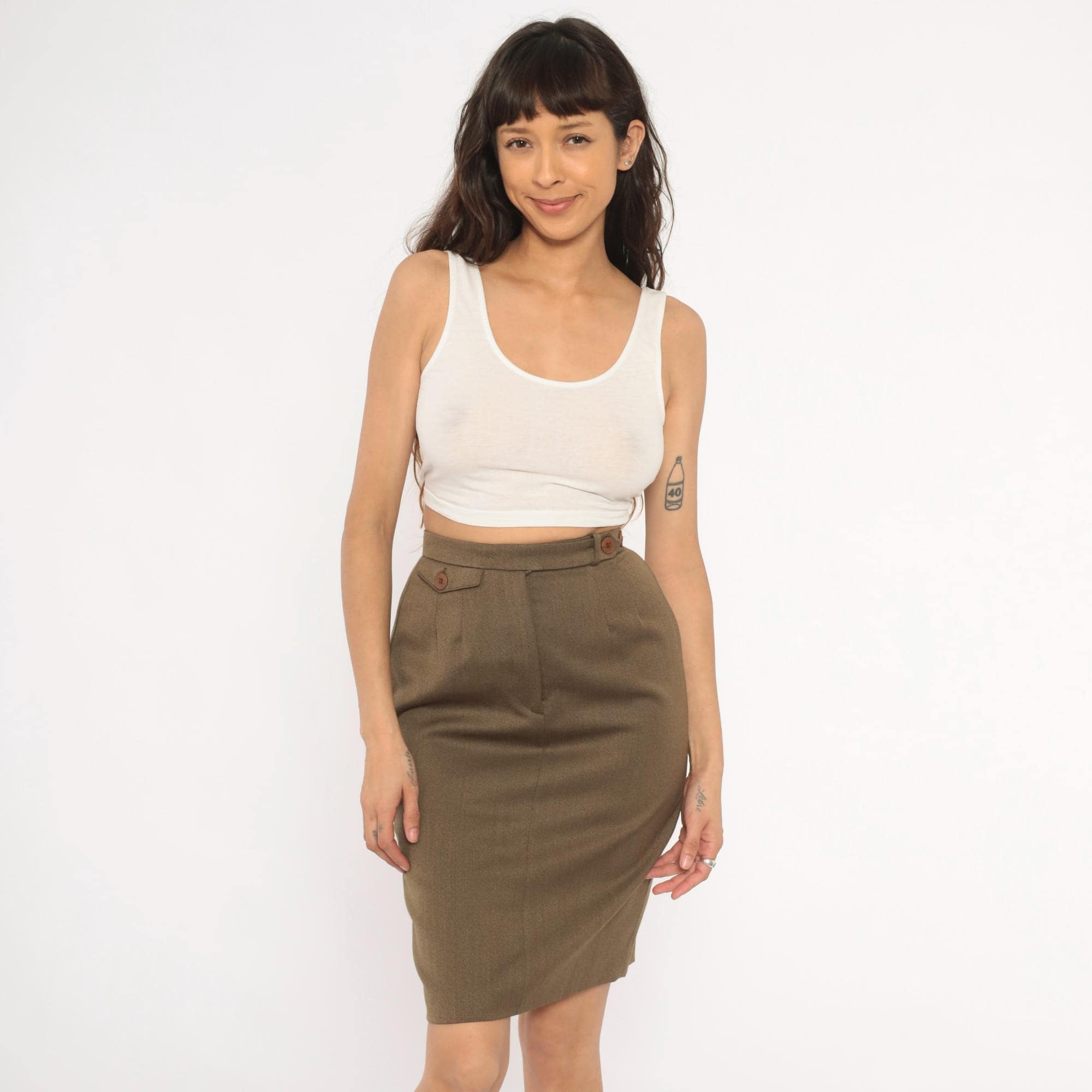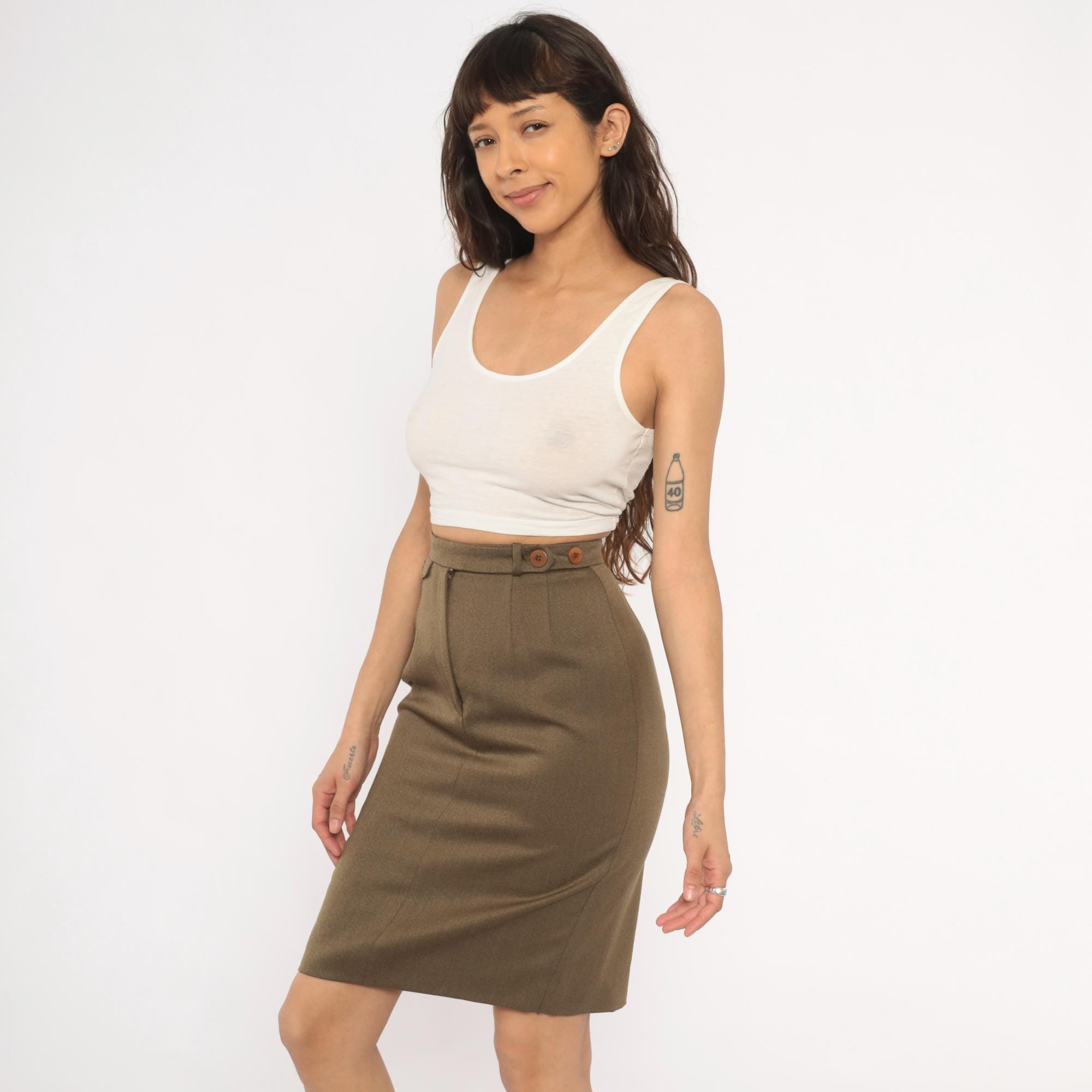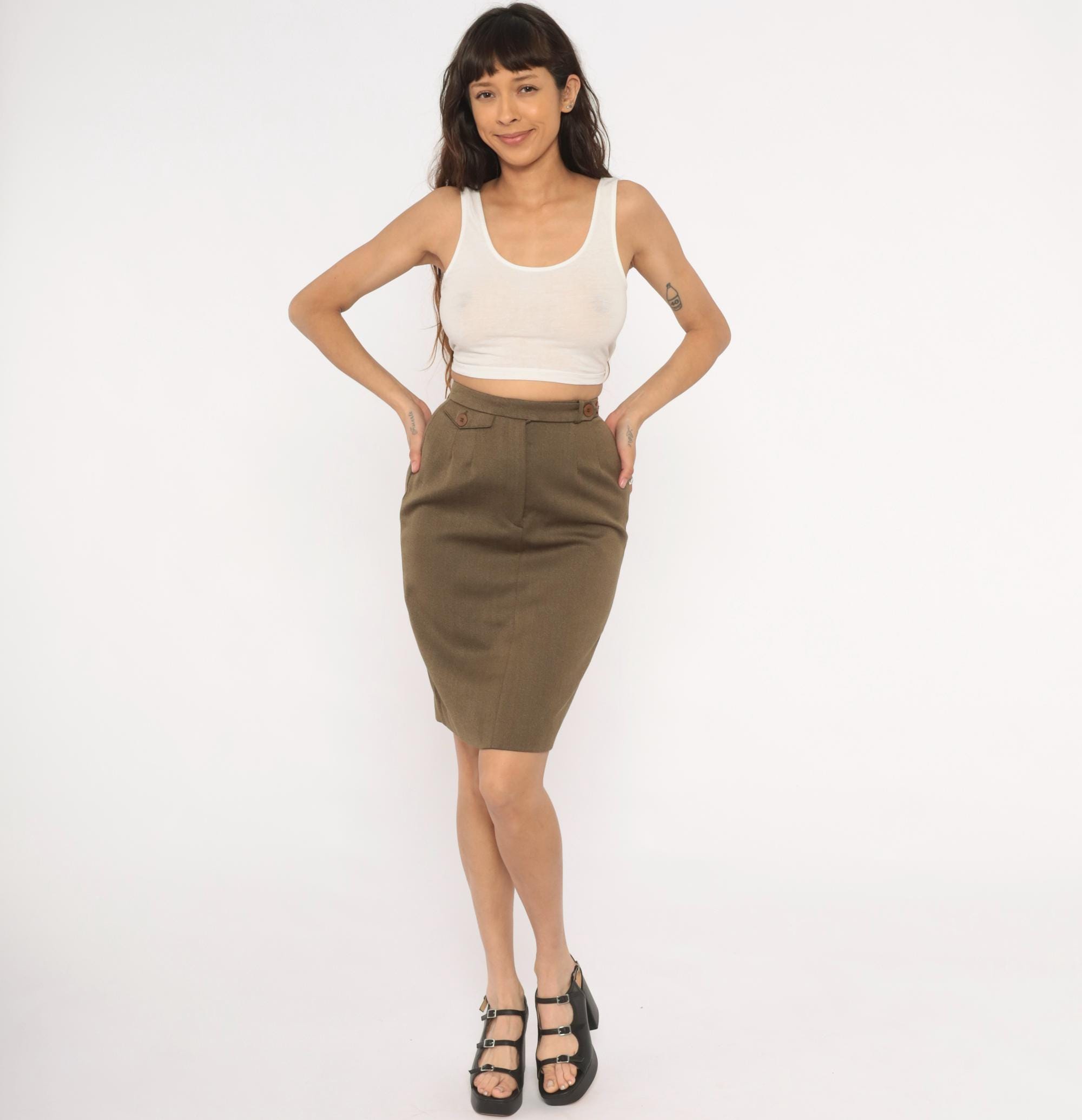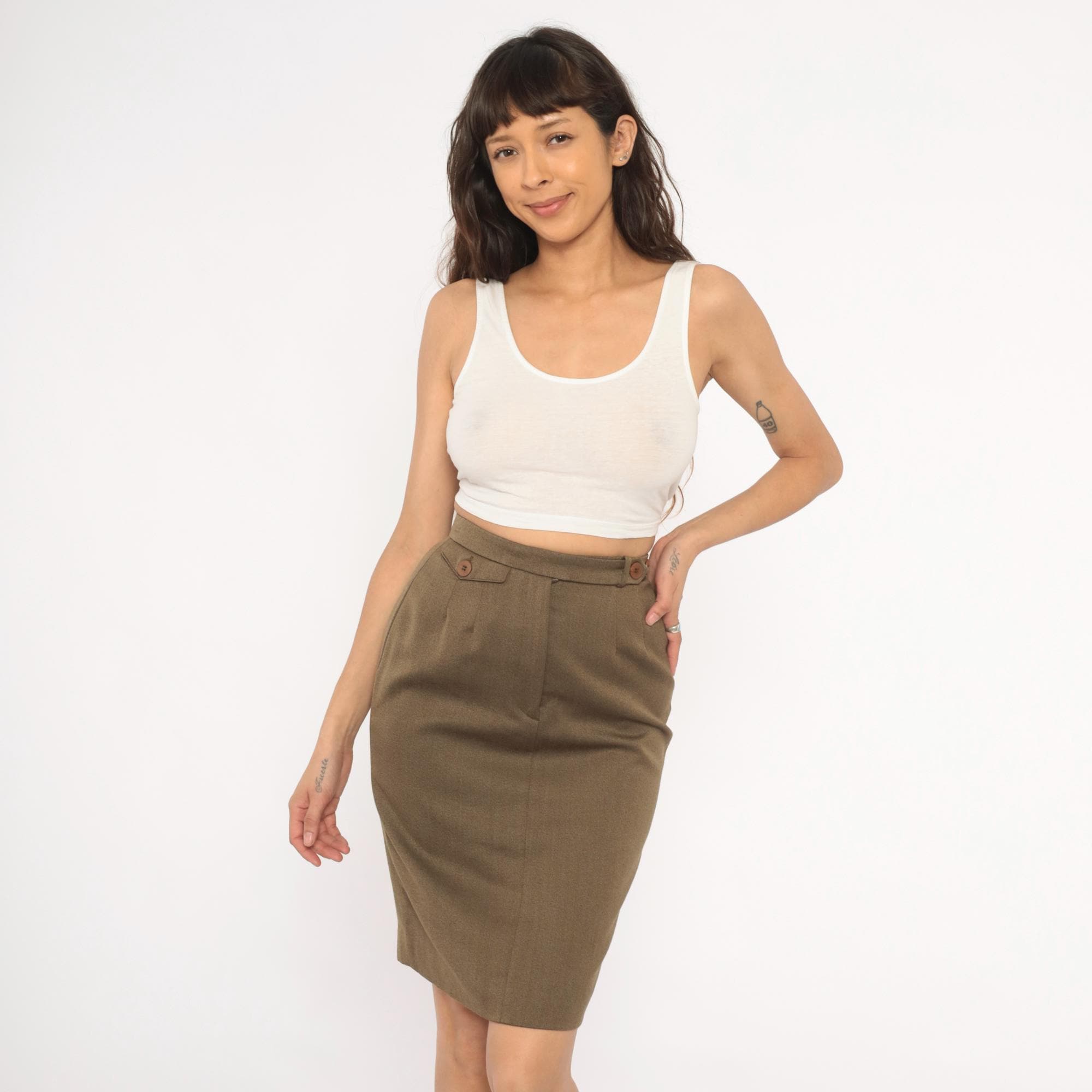 90s olive wool pencil skirt from Barry Bricken with a high waistband, two brown button tabs at the front waist, and a side zipper closure. Pleated front with a center seam running down both front and back panels. The skirt hits just above the knee with a small back vent, in a muted army green and tan heathered tone.