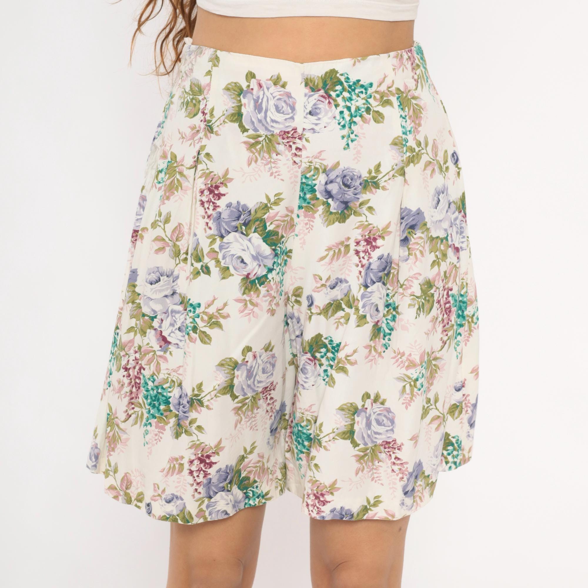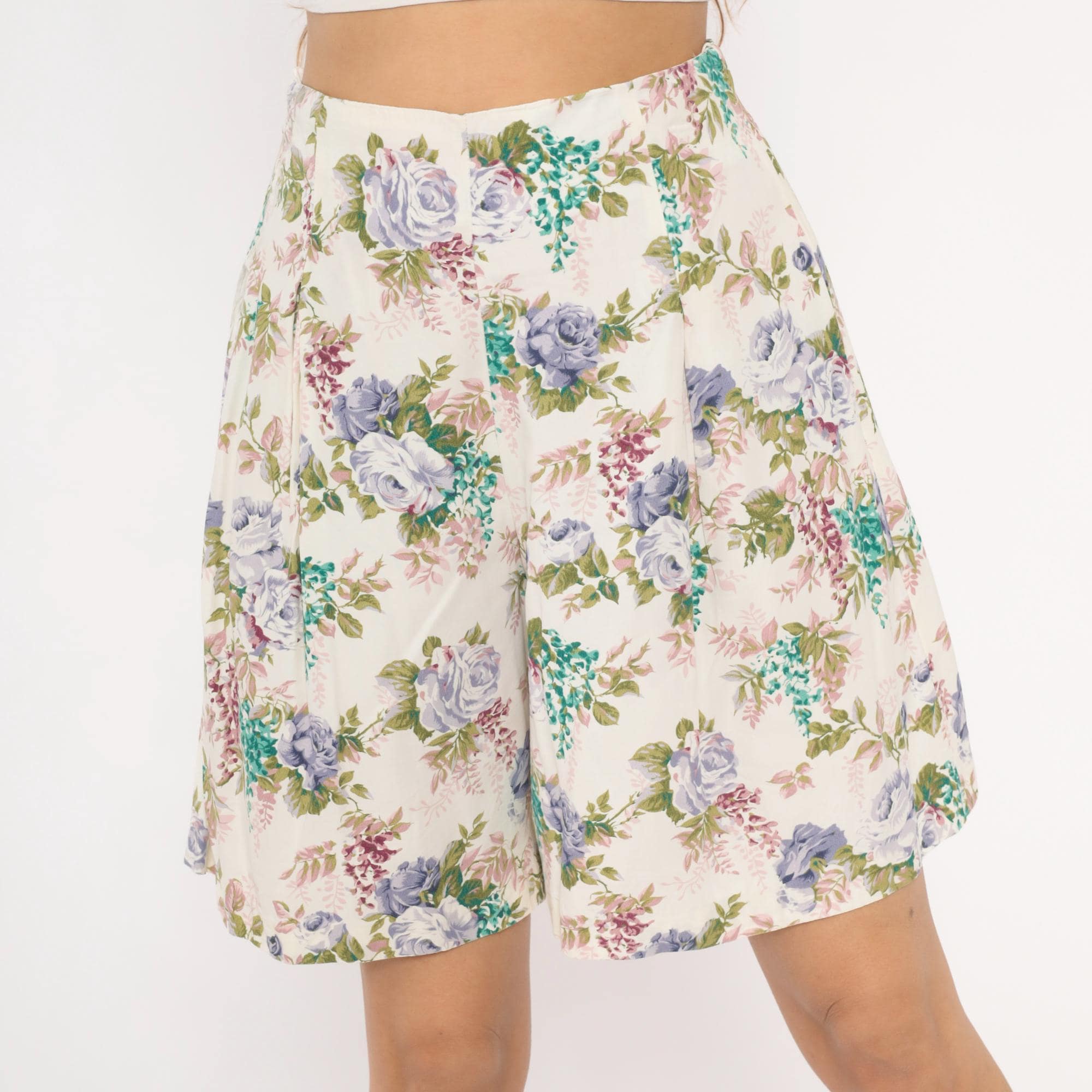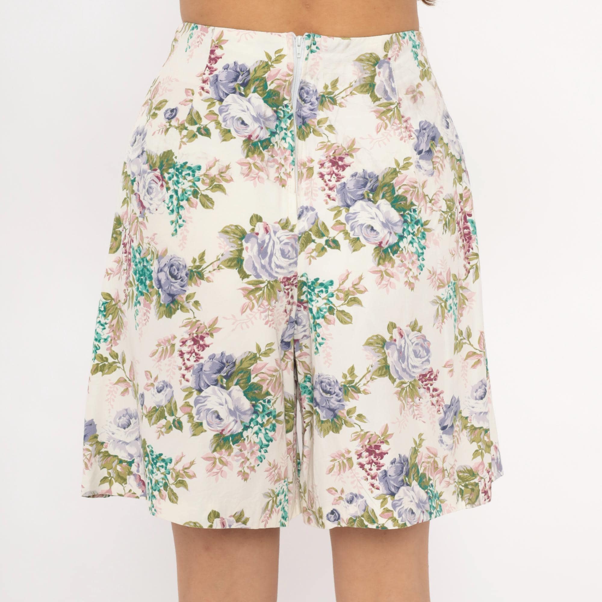 90s high-waisted culotte shorts in ivory with a purple and lavender rose print accented by teal, olive green, and mauve foliage. Pleated front, back zipper closure, and wide flowing legs that hit at the knee. White base with an all-over garden floral pattern.