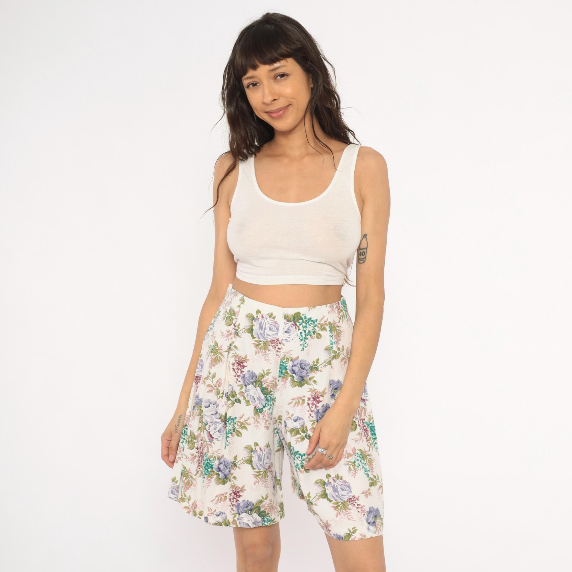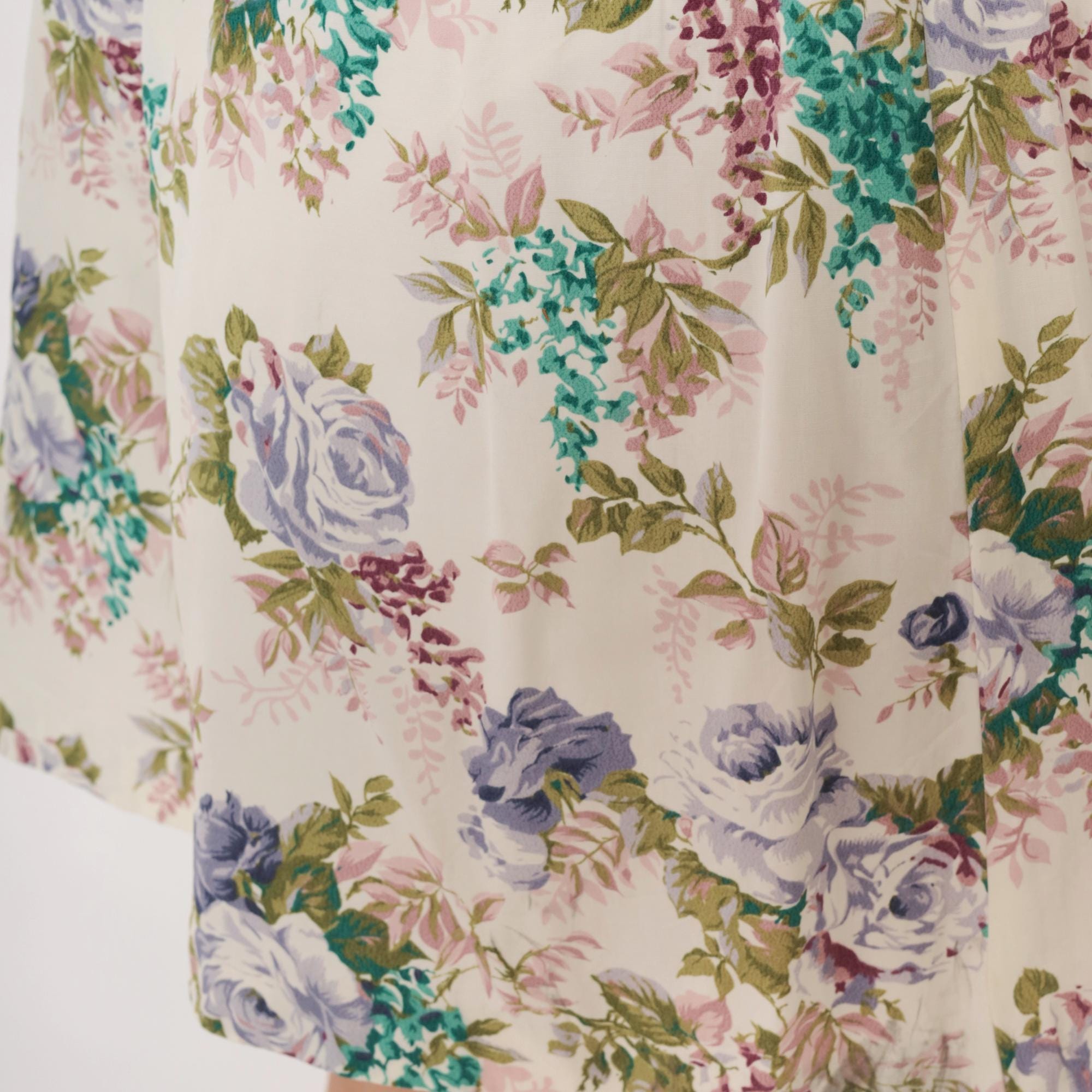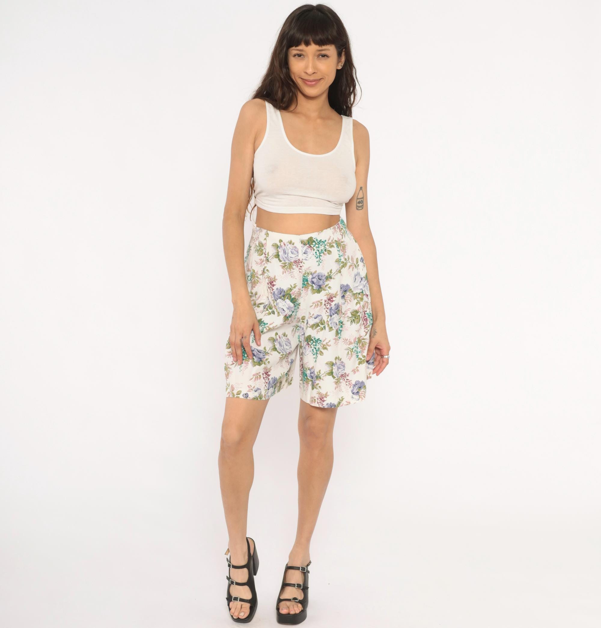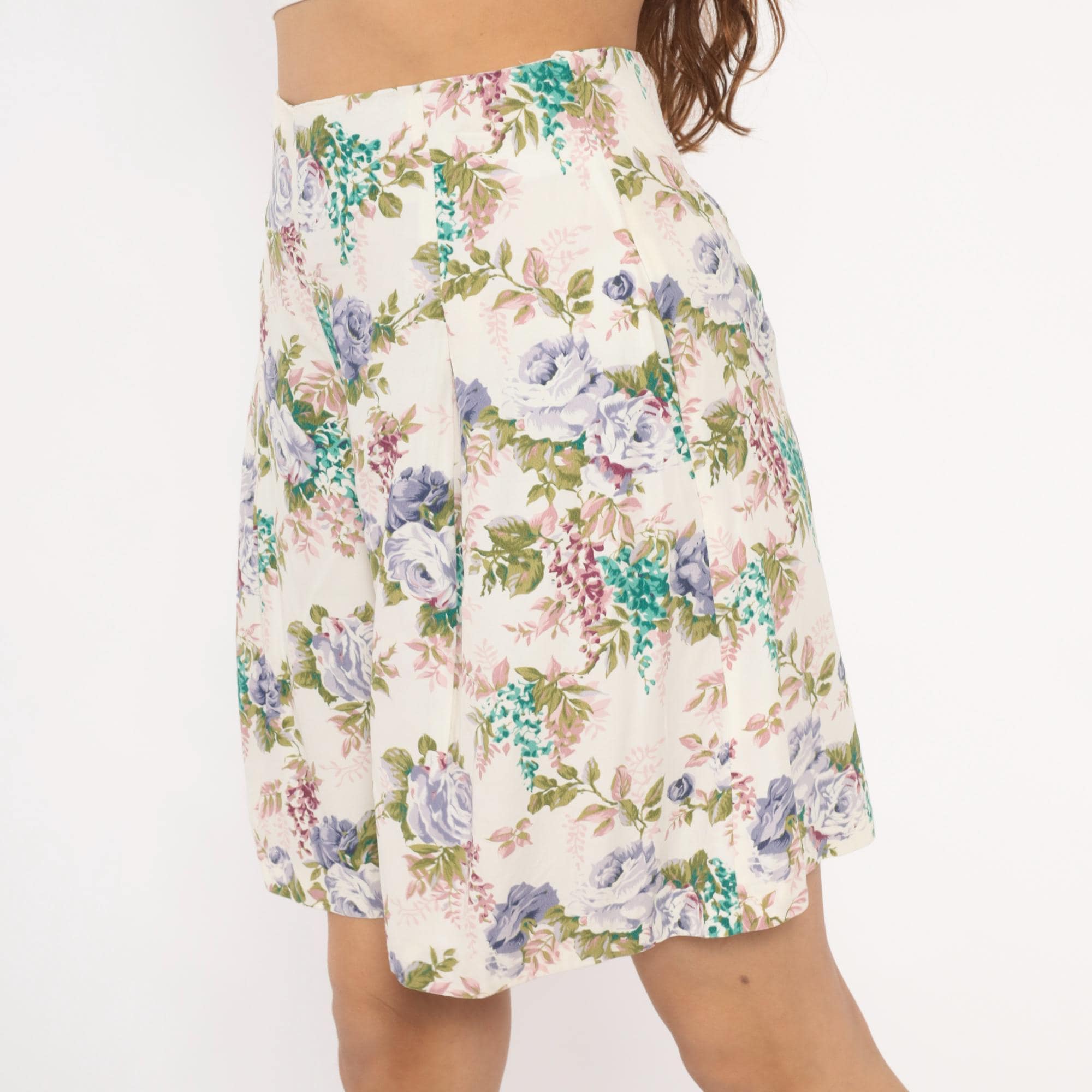 90s high-waisted culotte shorts in ivory with a purple and lavender rose print accented by teal, olive green, and mauve foliage. Pleated front, back zipper closure, and wide flowing legs that hit at the knee. White base with an all-over garden floral pattern.