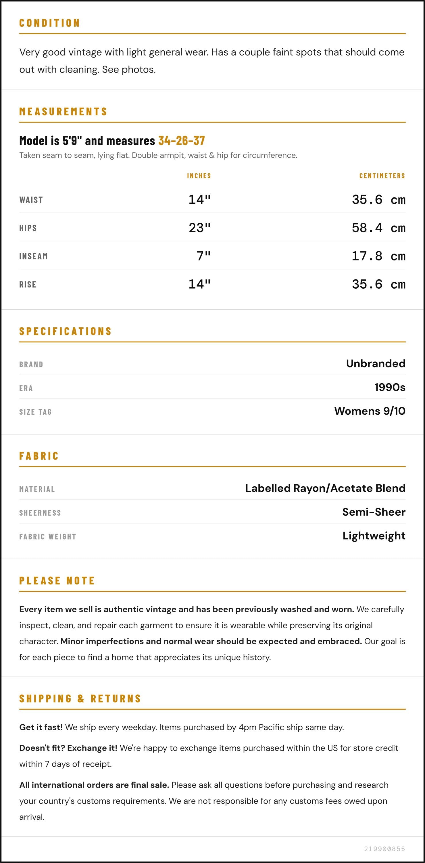 Vintage denim was usually made without any stretch, unlike modern jeans. Check the measurements to ensure proper fit, and remember to give yourself a little wiggle room in the waist and hips, depending on your preferred fit.