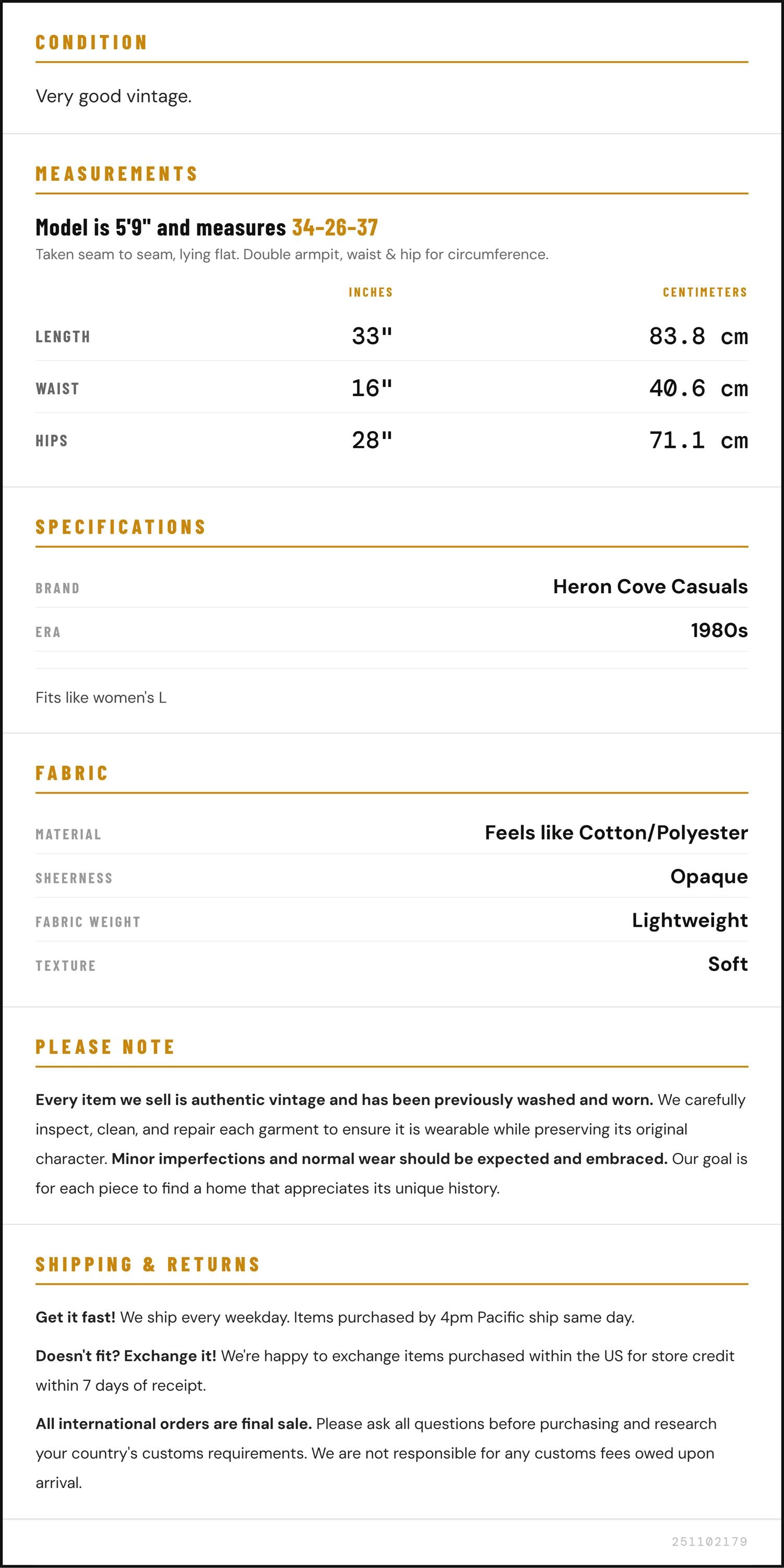 Vintage denim was usually made without any stretch, unlike modern jeans. Check the measurements to ensure proper fit, and remember to give yourself a little wiggle room in the waist and hips, depending on your preferred fit.