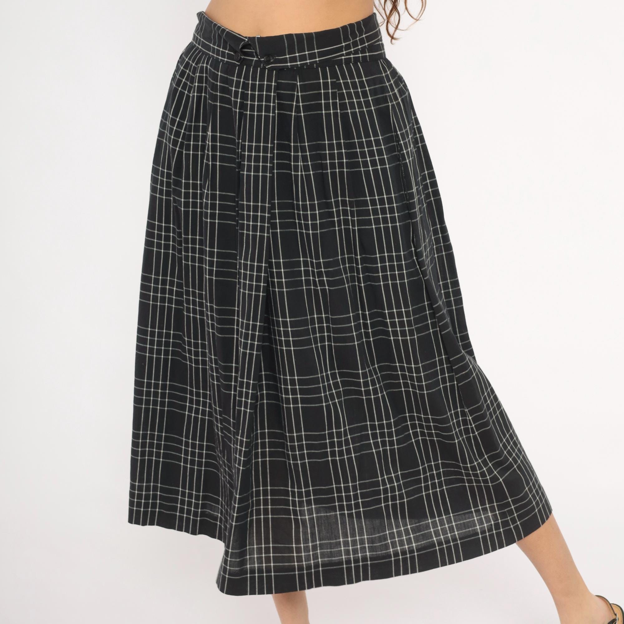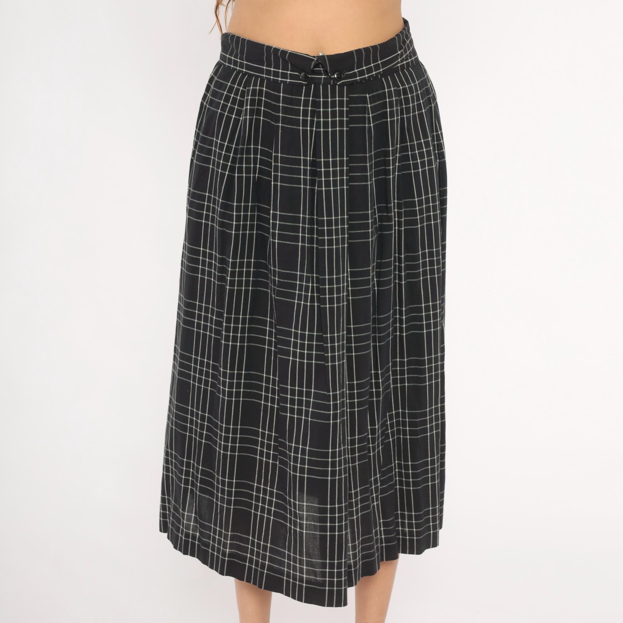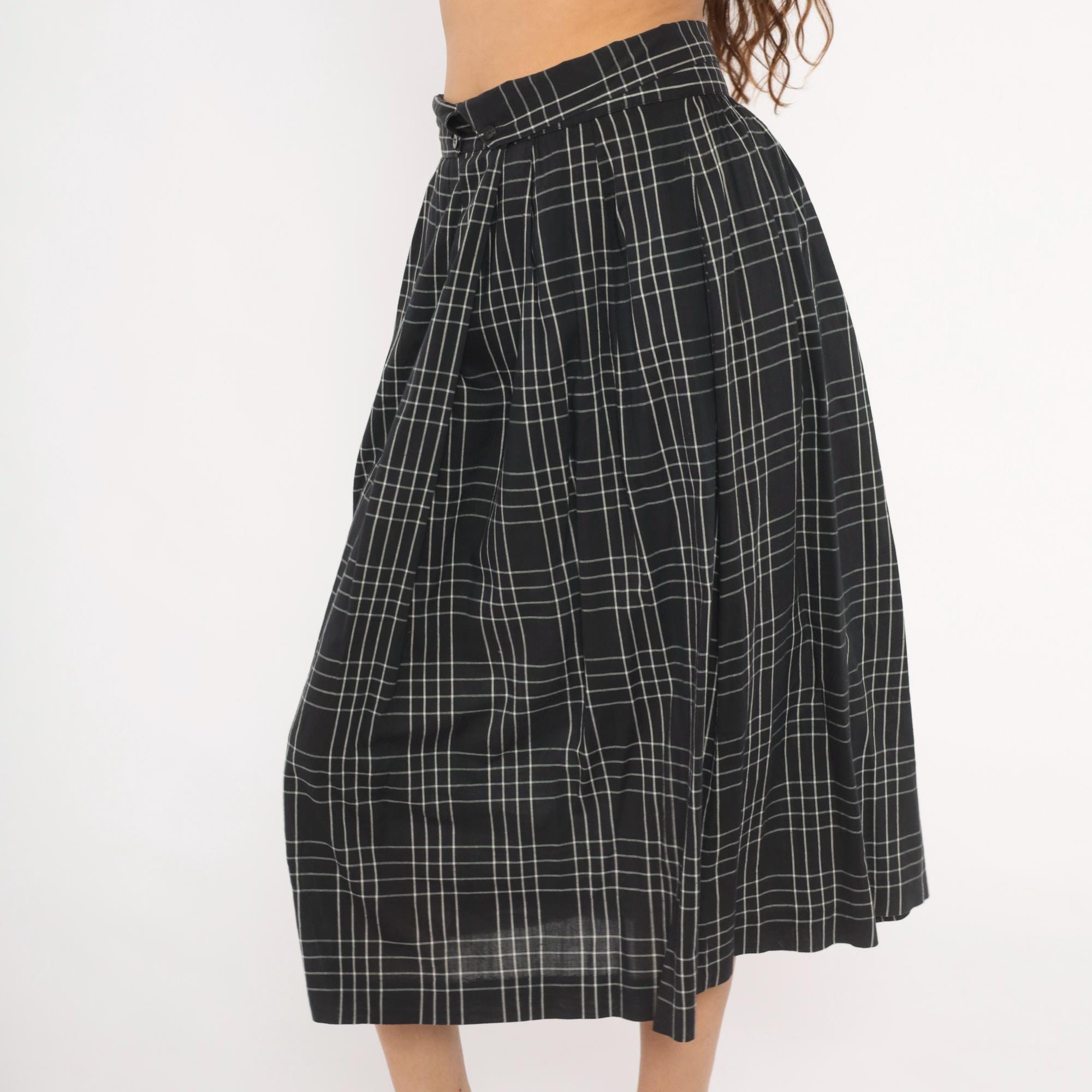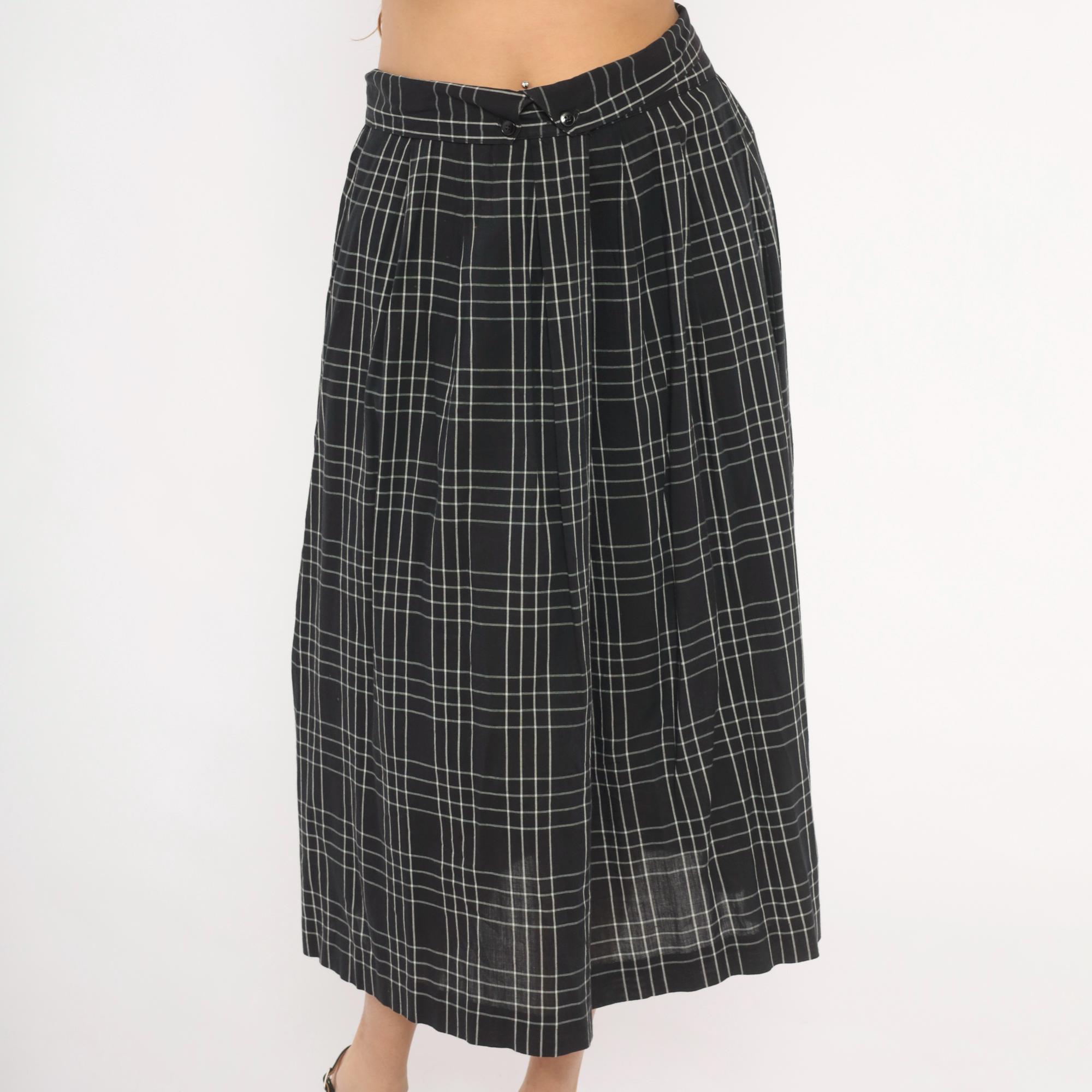 80s black and white windowpane plaid midi skirt from Heron Cove Casuals with pleated waist and A-line silhouette. Front button closure with two buttons at the waistband and a V-shaped tab opening at center front. Side seam pockets, gathered pleats at the waist, and a full sweep through the hip. Grid check pattern with thin white lines on a black ground.