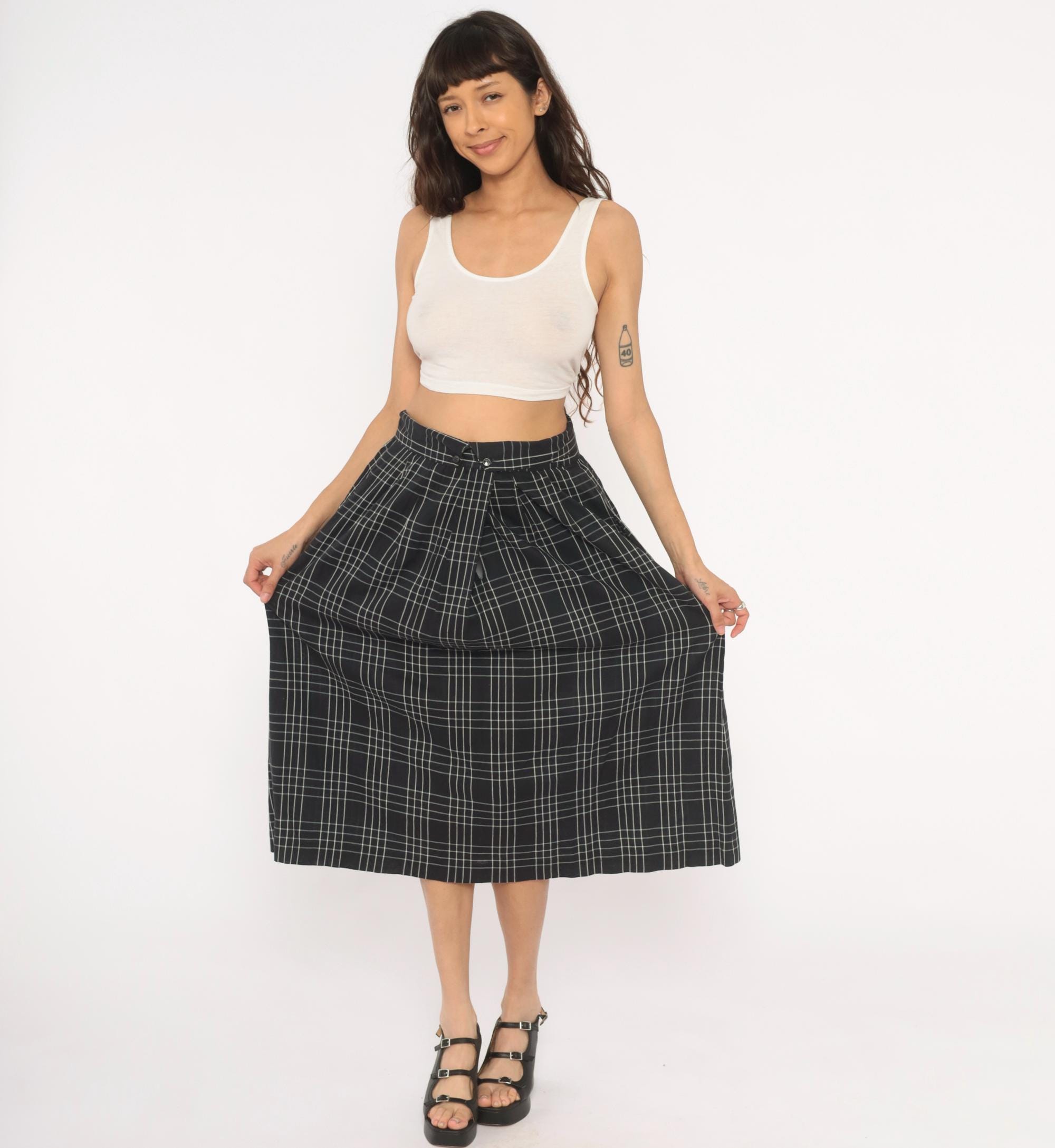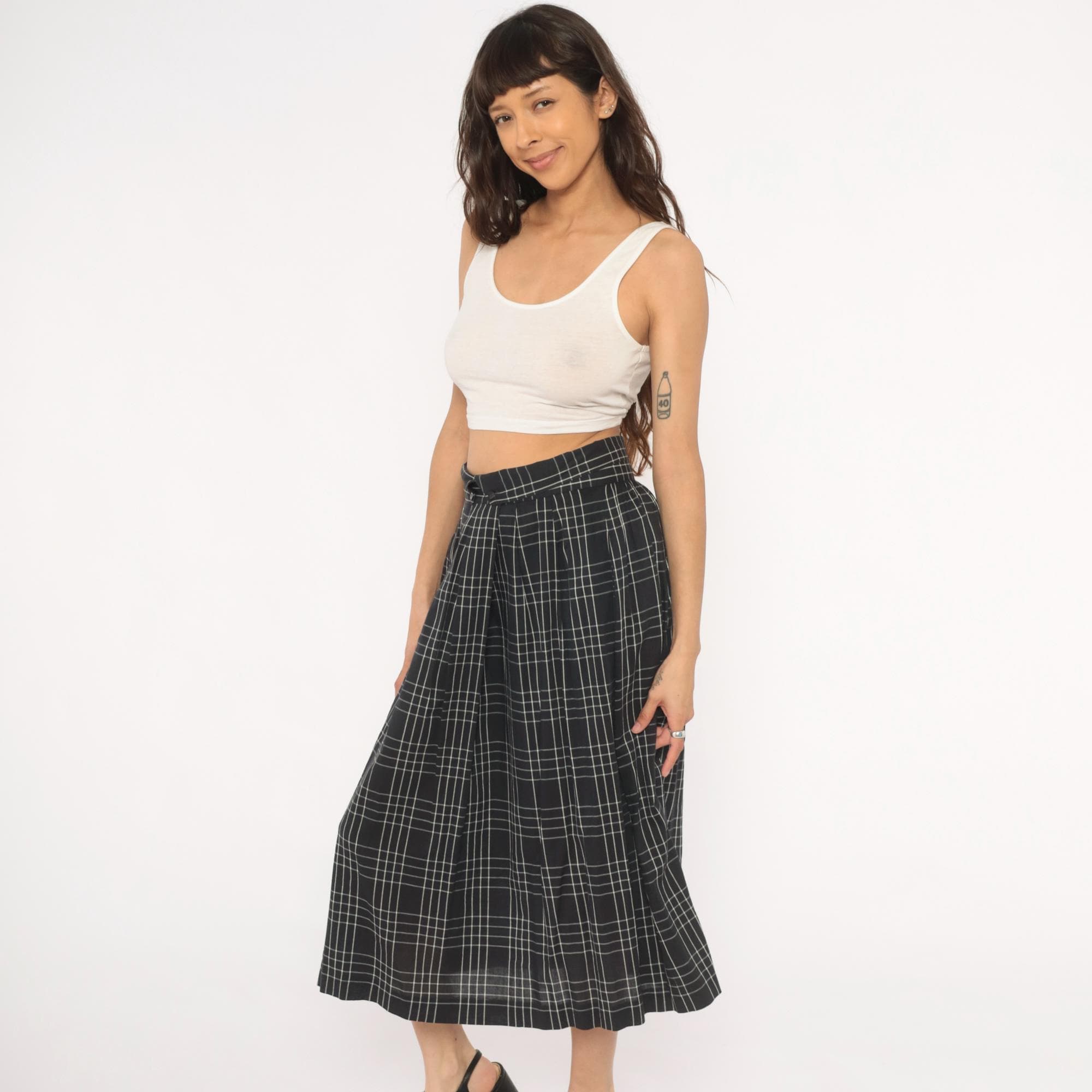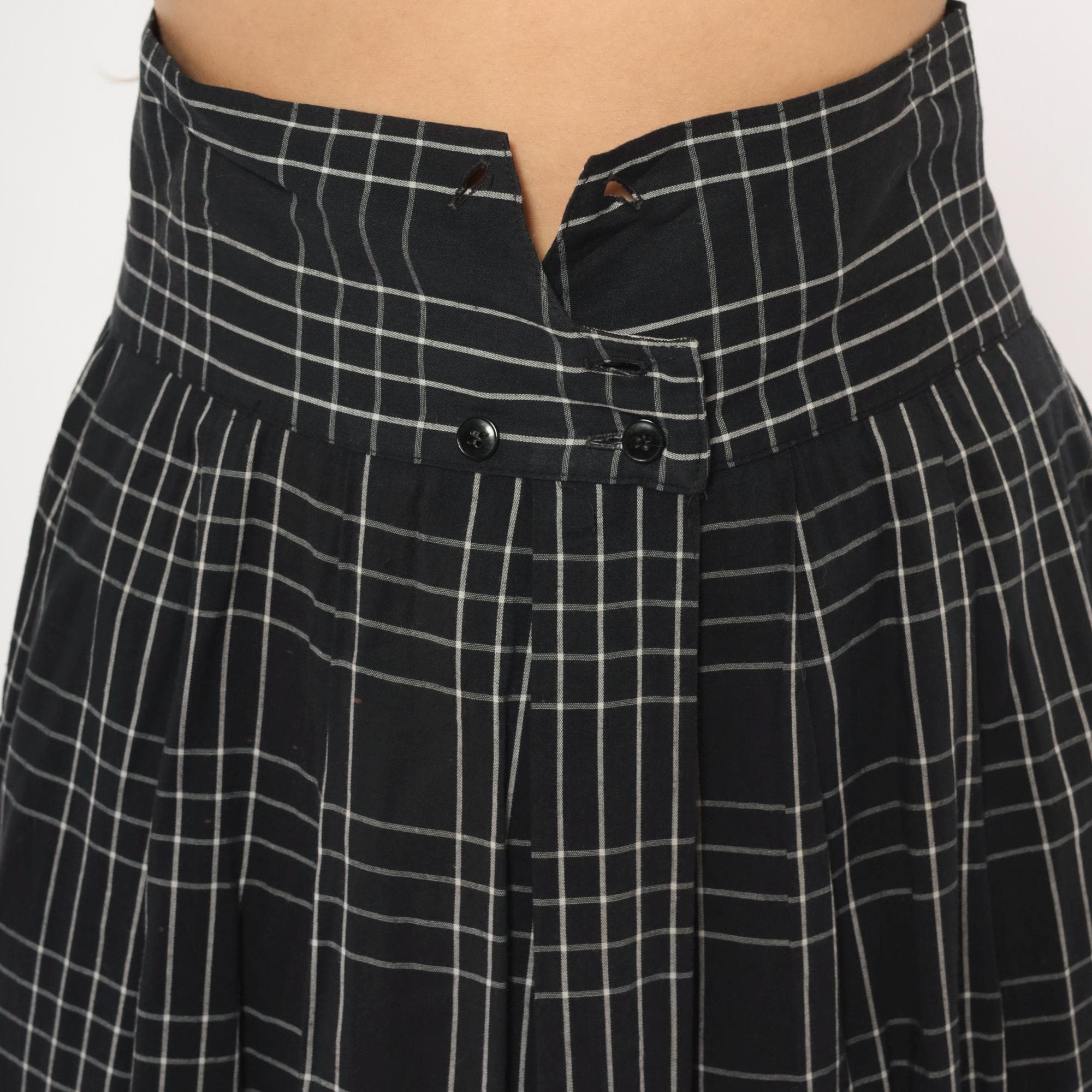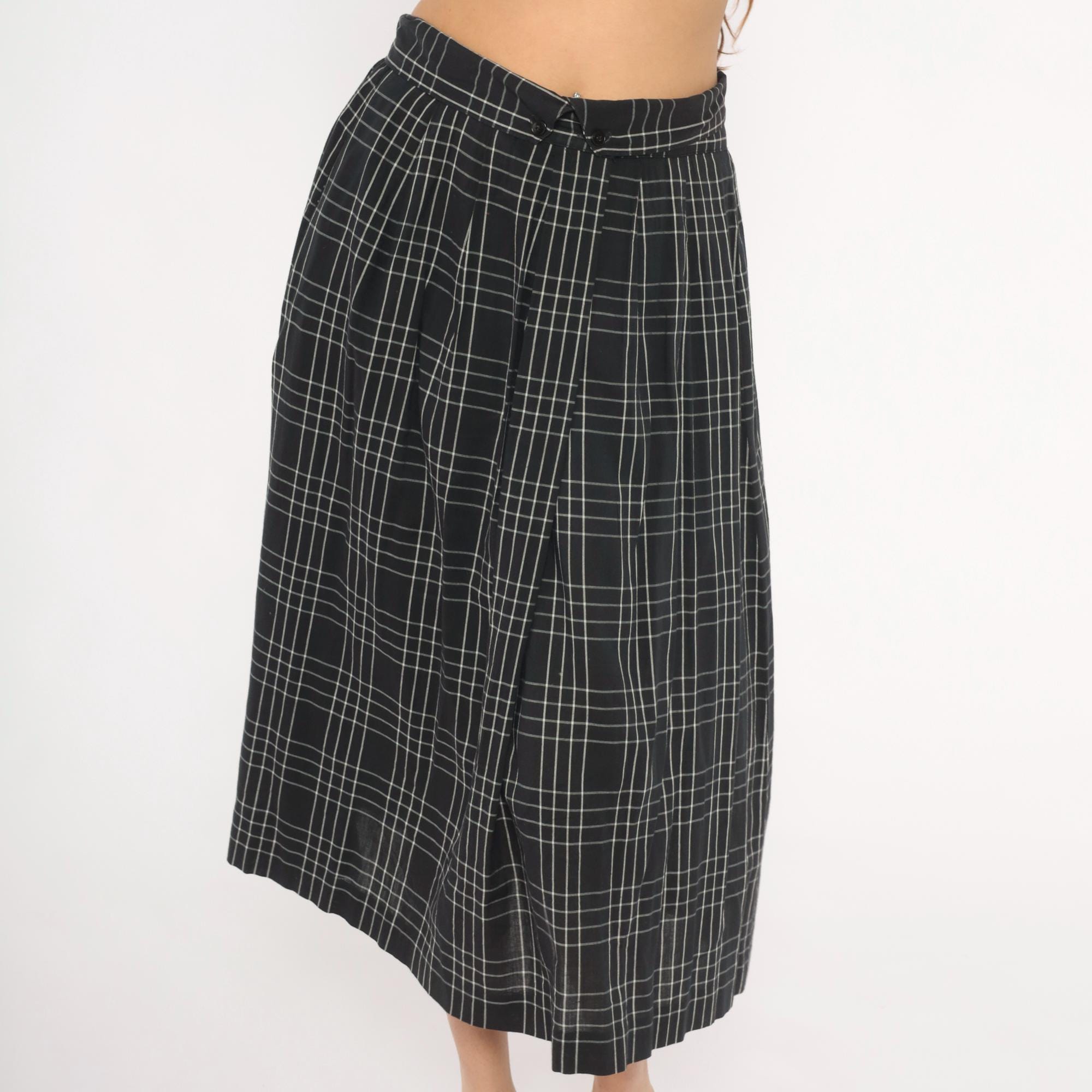 80s black and white windowpane plaid midi skirt from Heron Cove Casuals with pleated waist and A-line silhouette. Front button closure with two buttons at the waistband and a V-shaped tab opening at center front. Side seam pockets, gathered pleats at the waist, and a full sweep through the hip. Grid check pattern with thin white lines on a black ground.