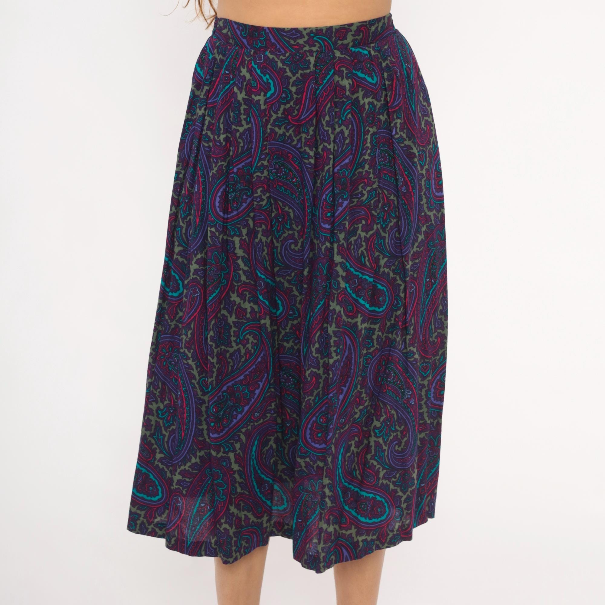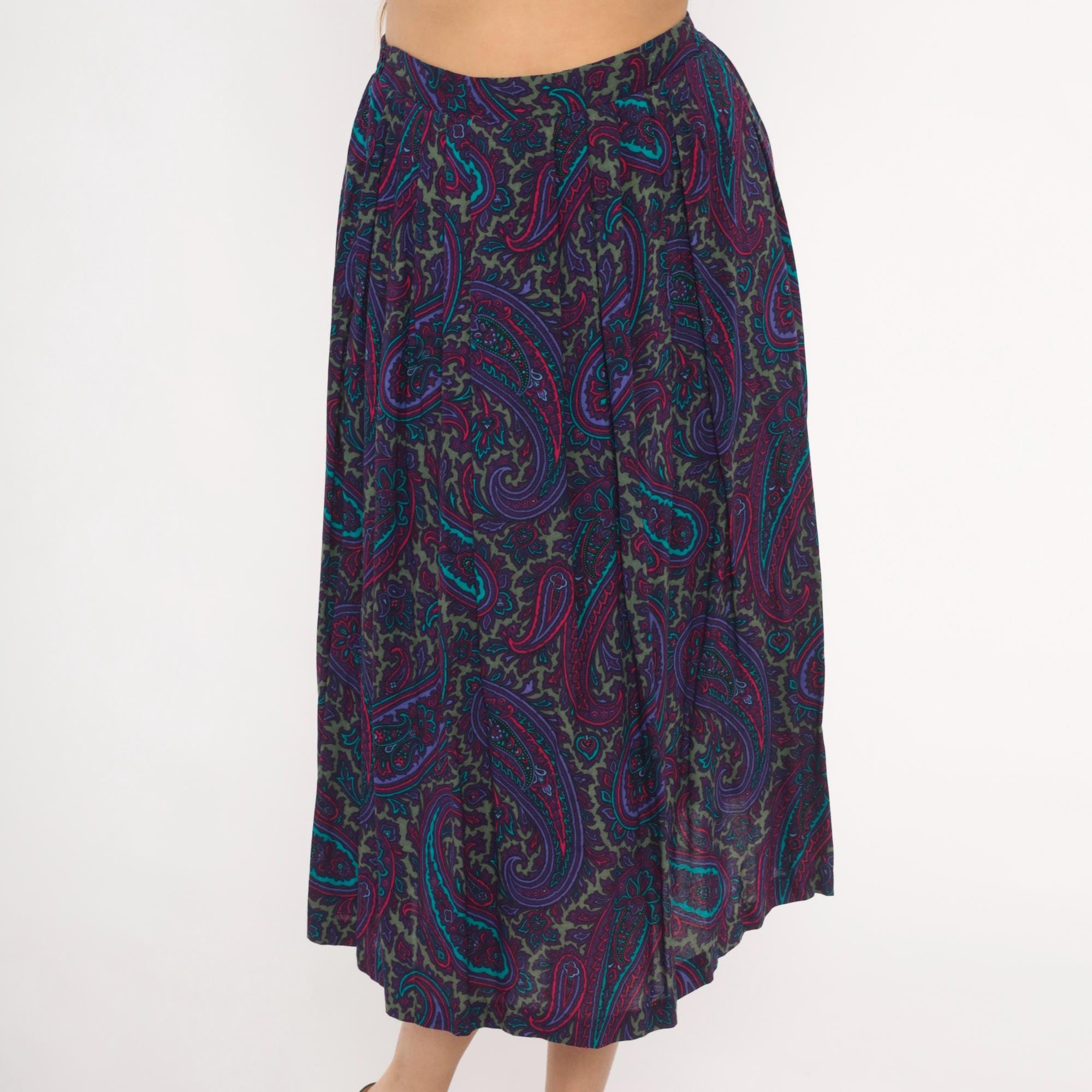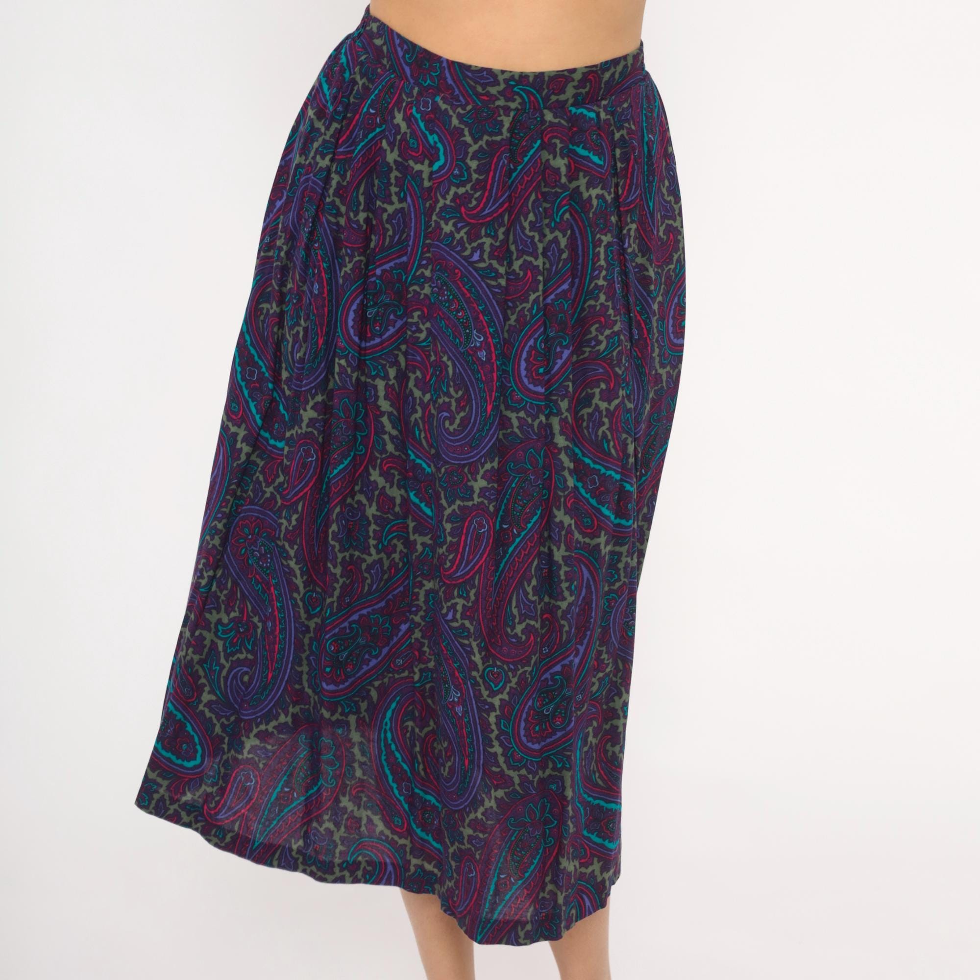 80s paisley skirt in deep purple, plum, teal, and olive green with intricate floral and scroll motifs throughout. A-line silhouette with gathered waist, elastic back waistband, and mid-calf length. Unlined with an allover ornate paisley pattern in jewel tones of violet, turquoise, magenta, and muted gold.