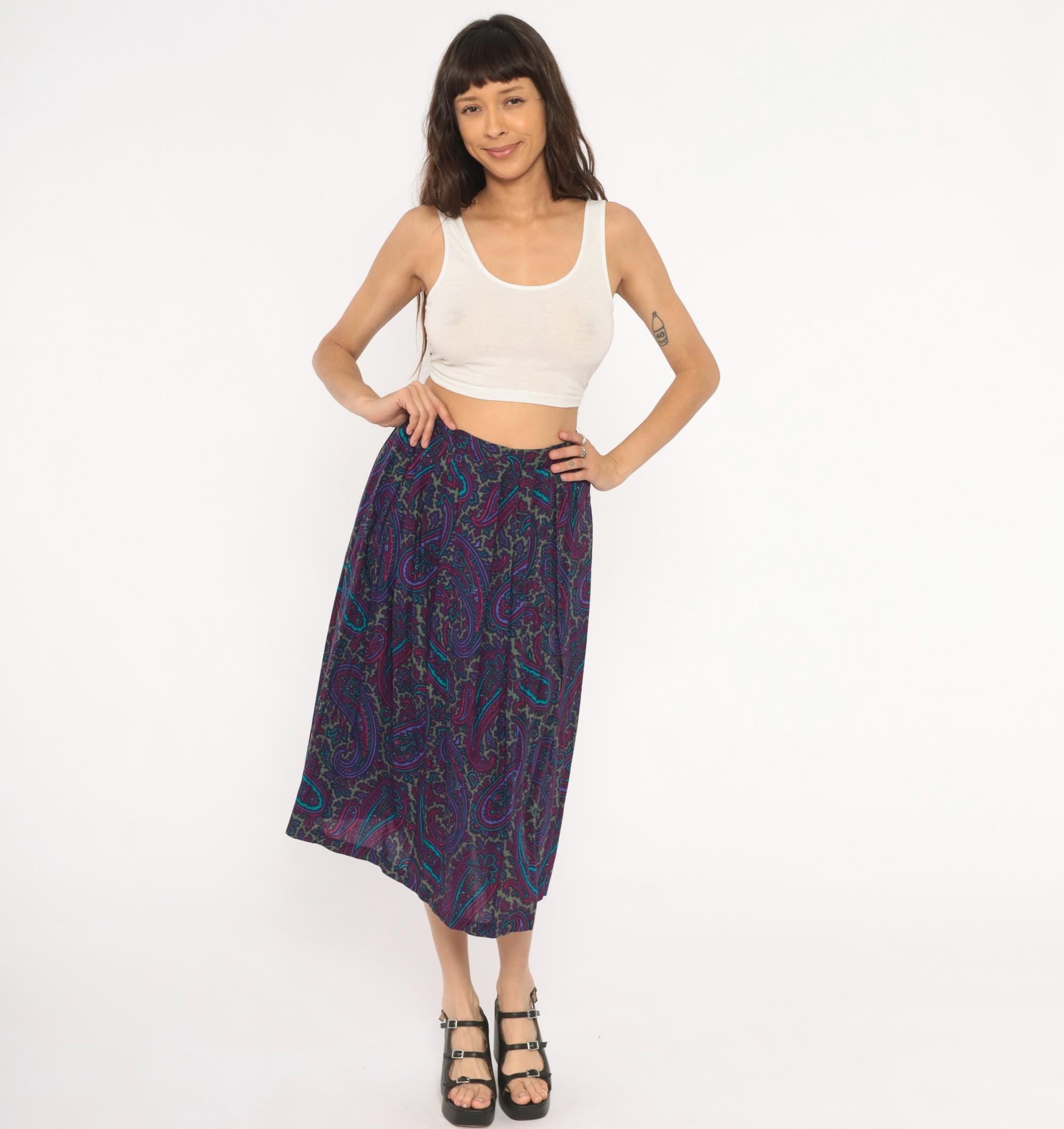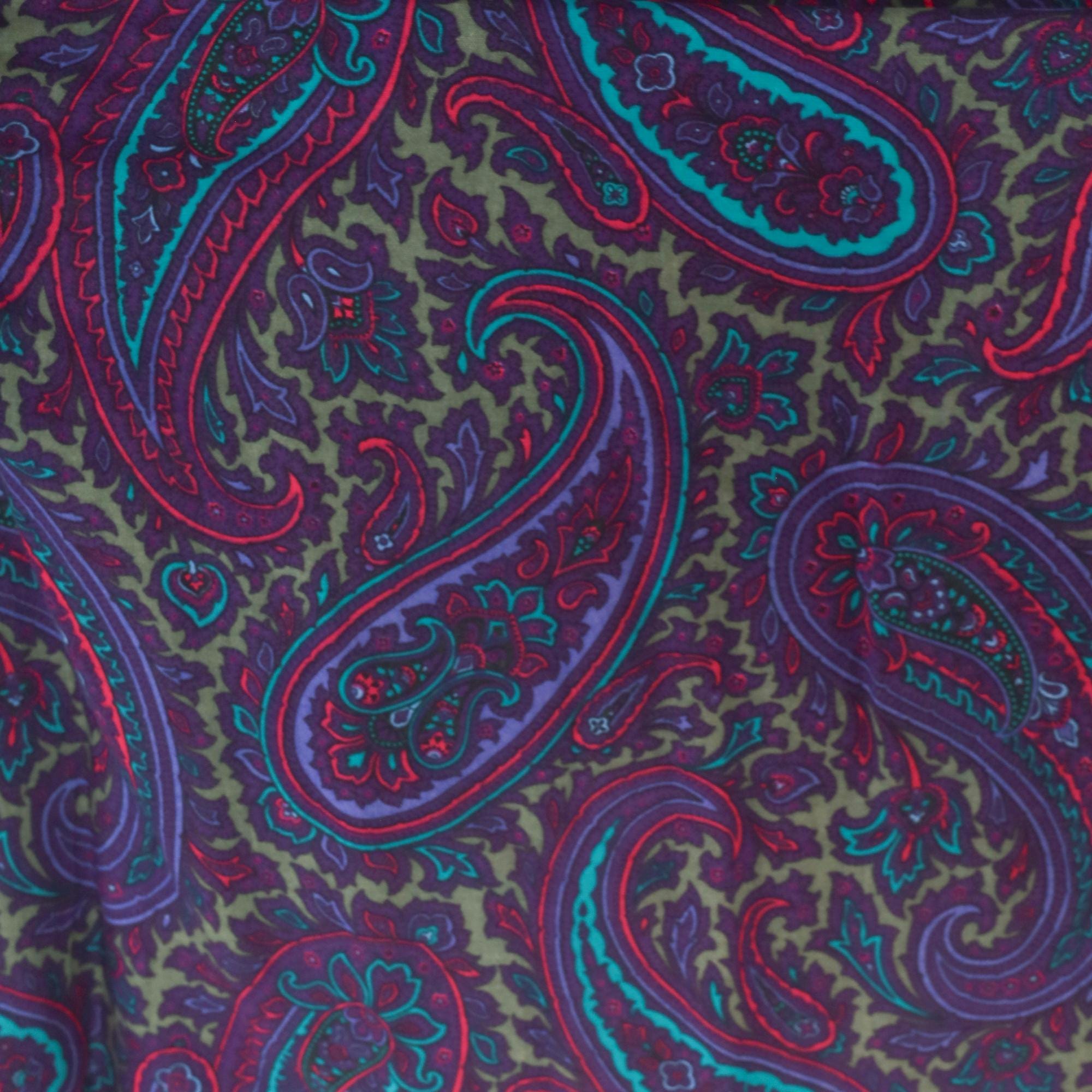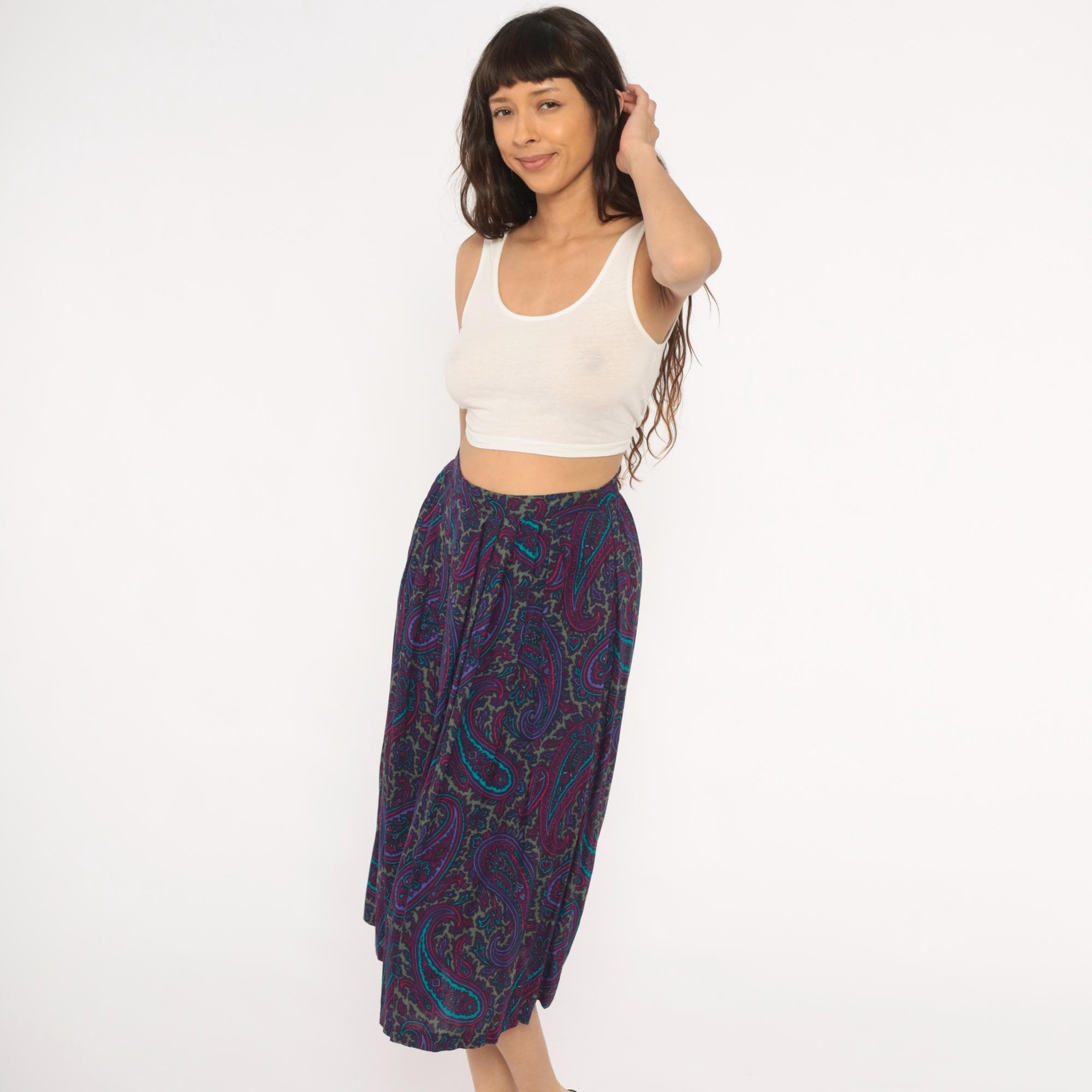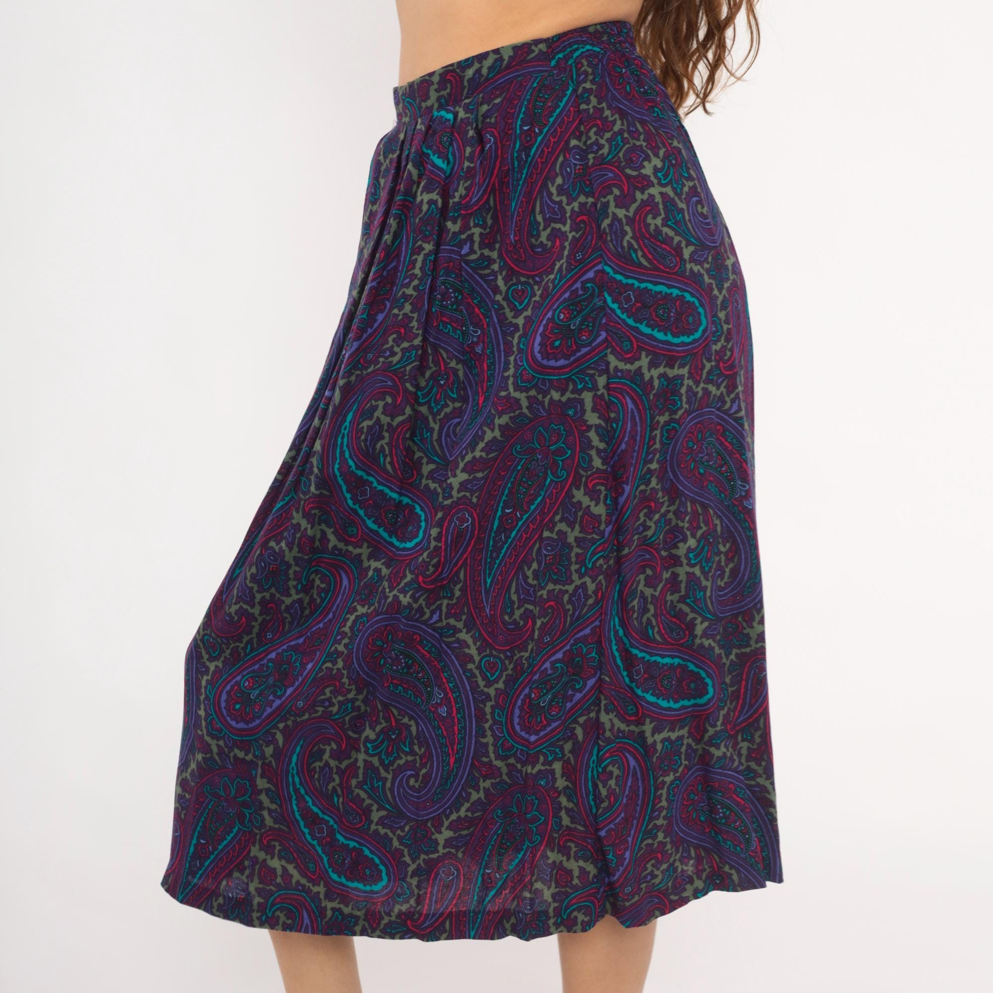 80s paisley skirt in deep purple, plum, teal, and olive green with intricate floral and scroll motifs throughout. A-line silhouette with gathered waist, elastic back waistband, and mid-calf length. Unlined with an allover ornate paisley pattern in jewel tones of violet, turquoise, magenta, and muted gold.