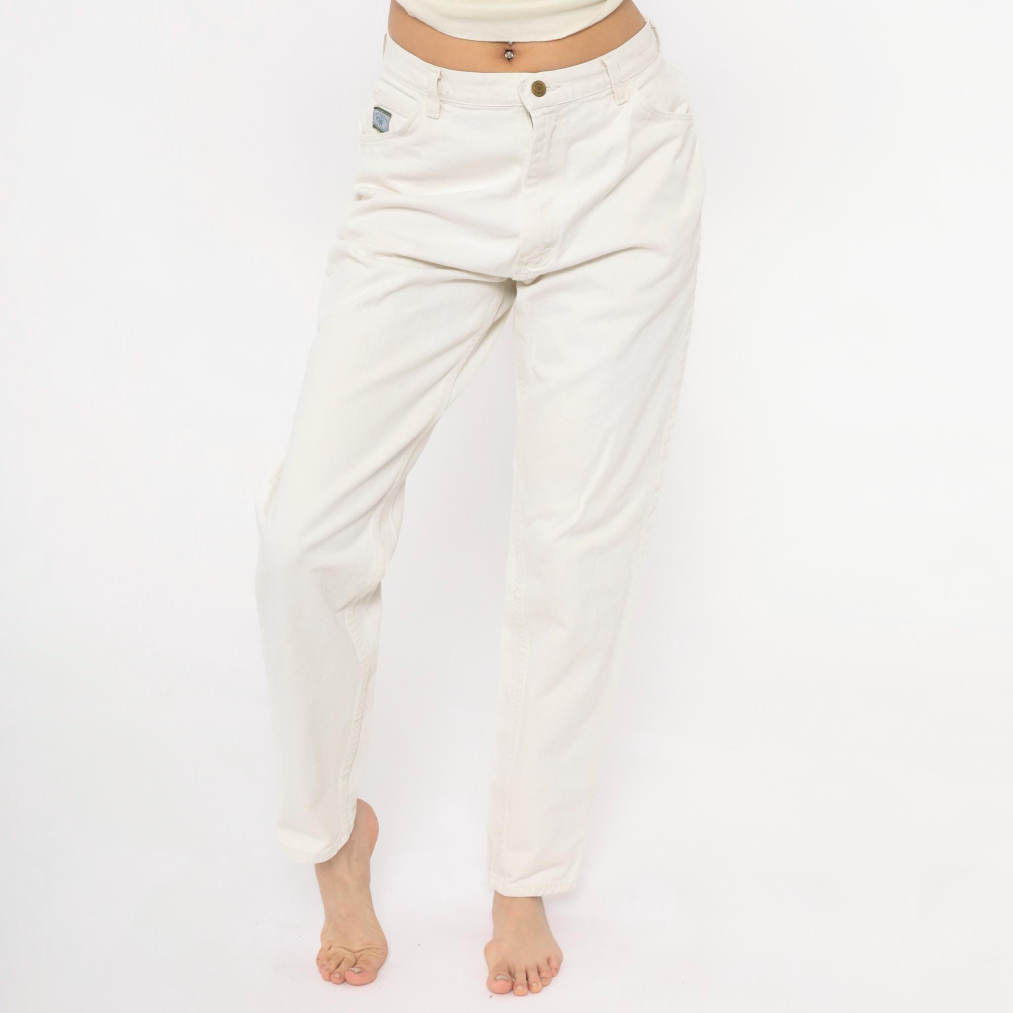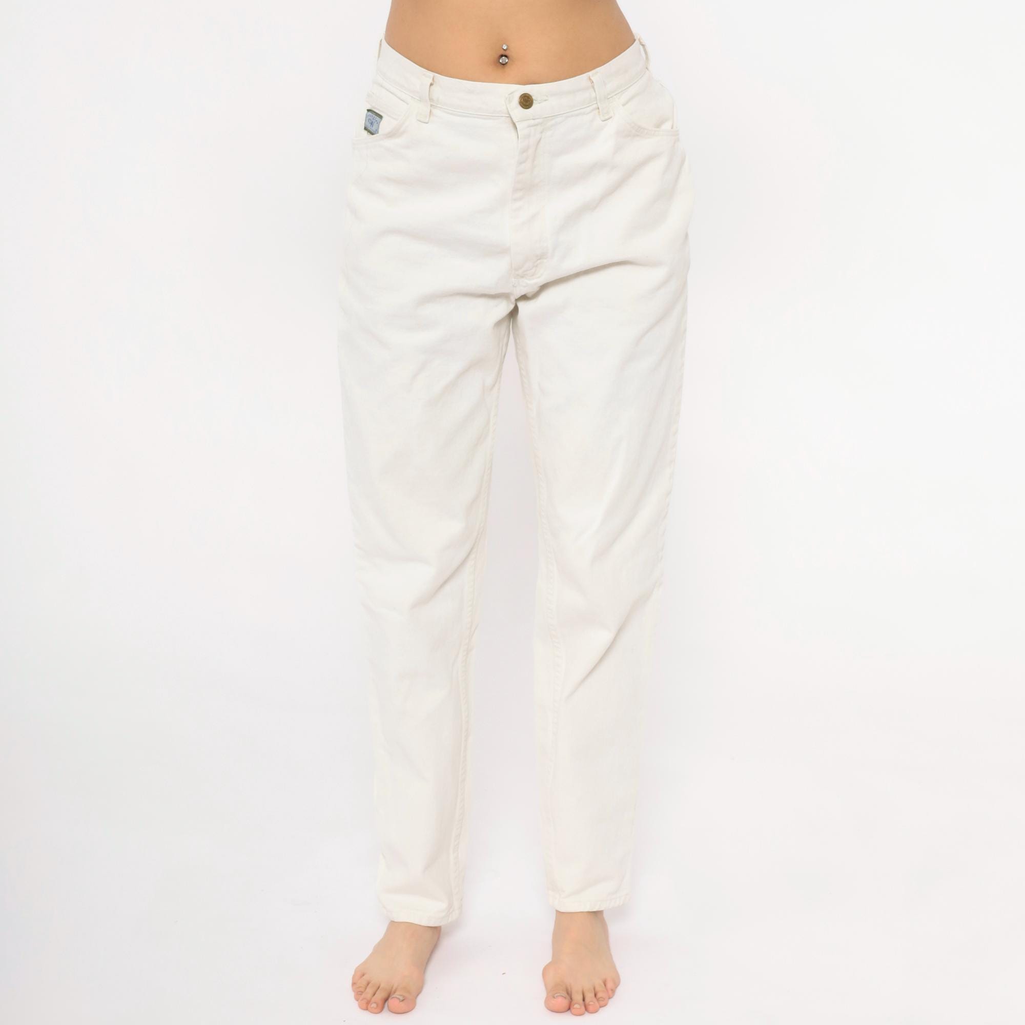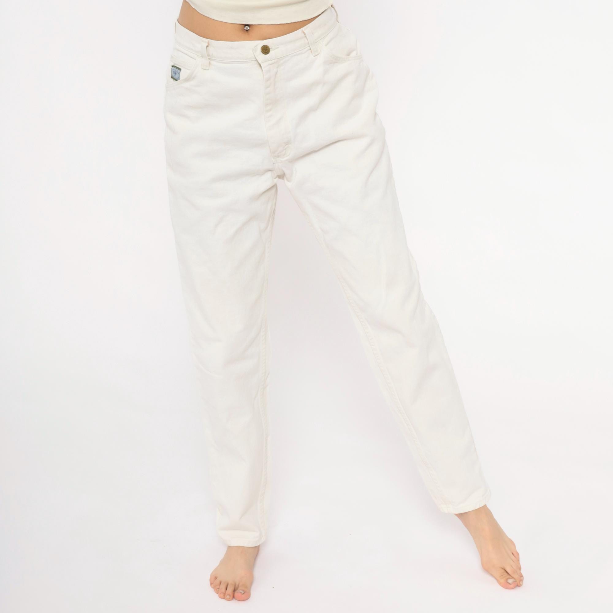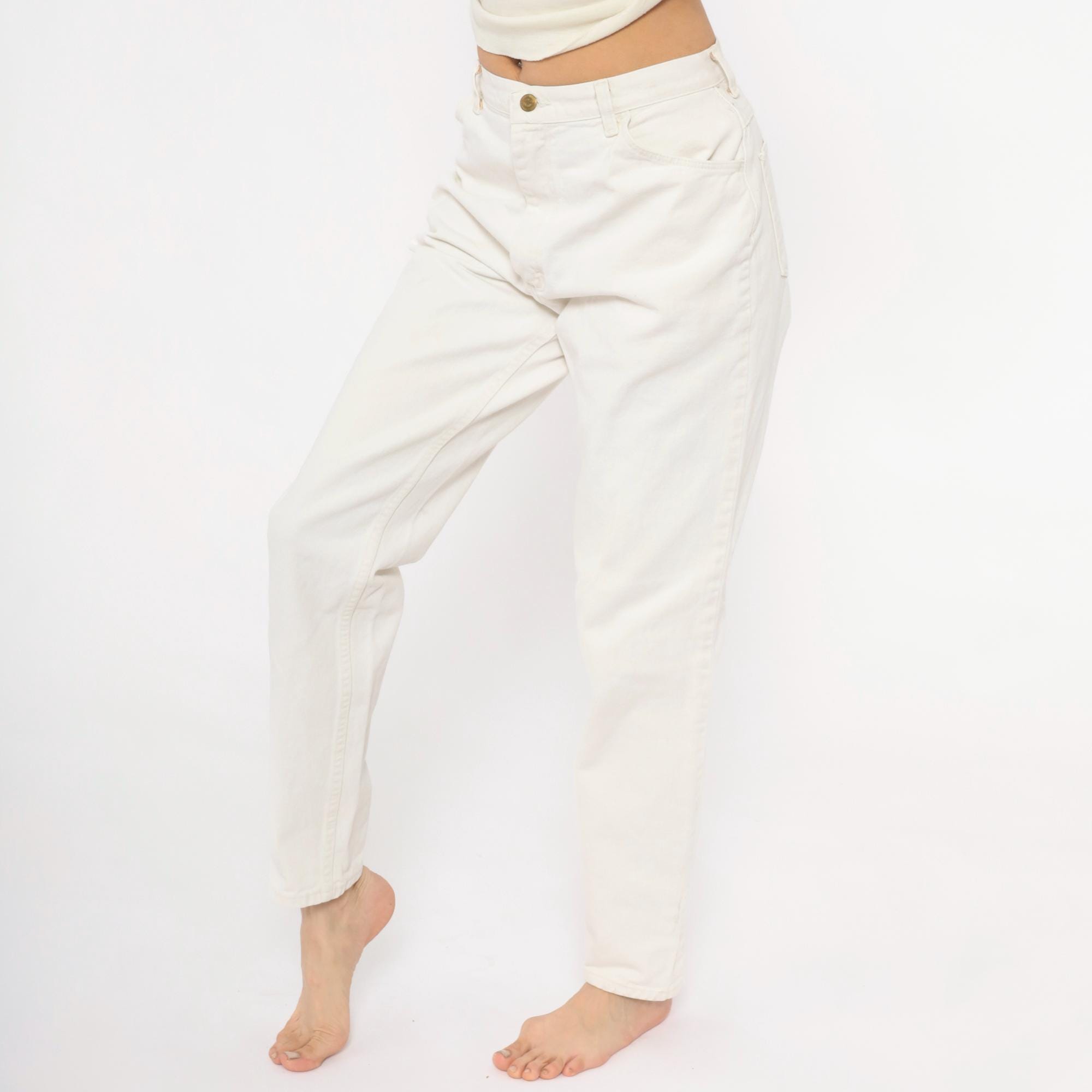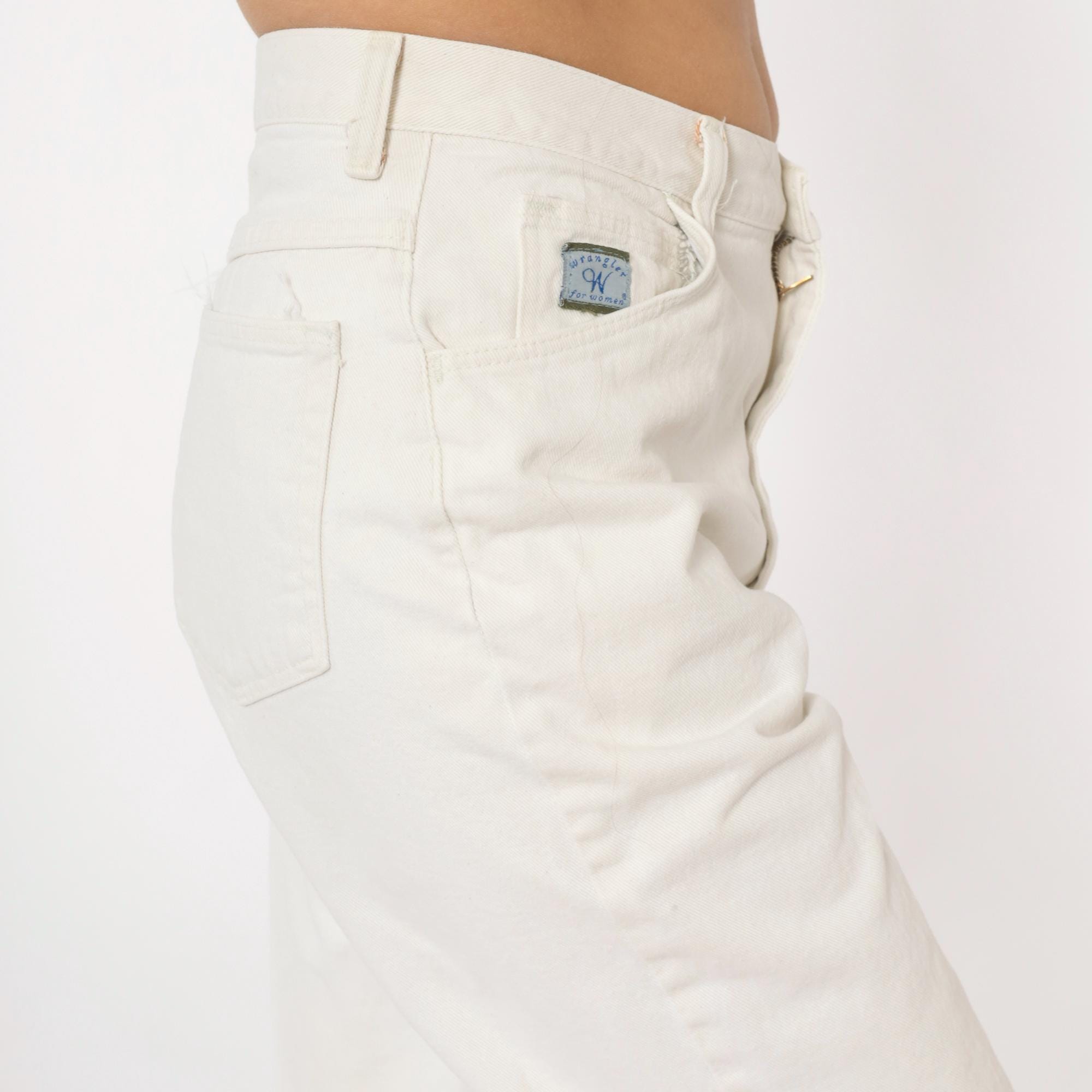90s white Wrangler jeans with a high-rise waist, tapered straight leg, and five-pocket construction. Zip fly with single button closure at the waistband. Small Wrangler for Women logo patch on the front right pocket.