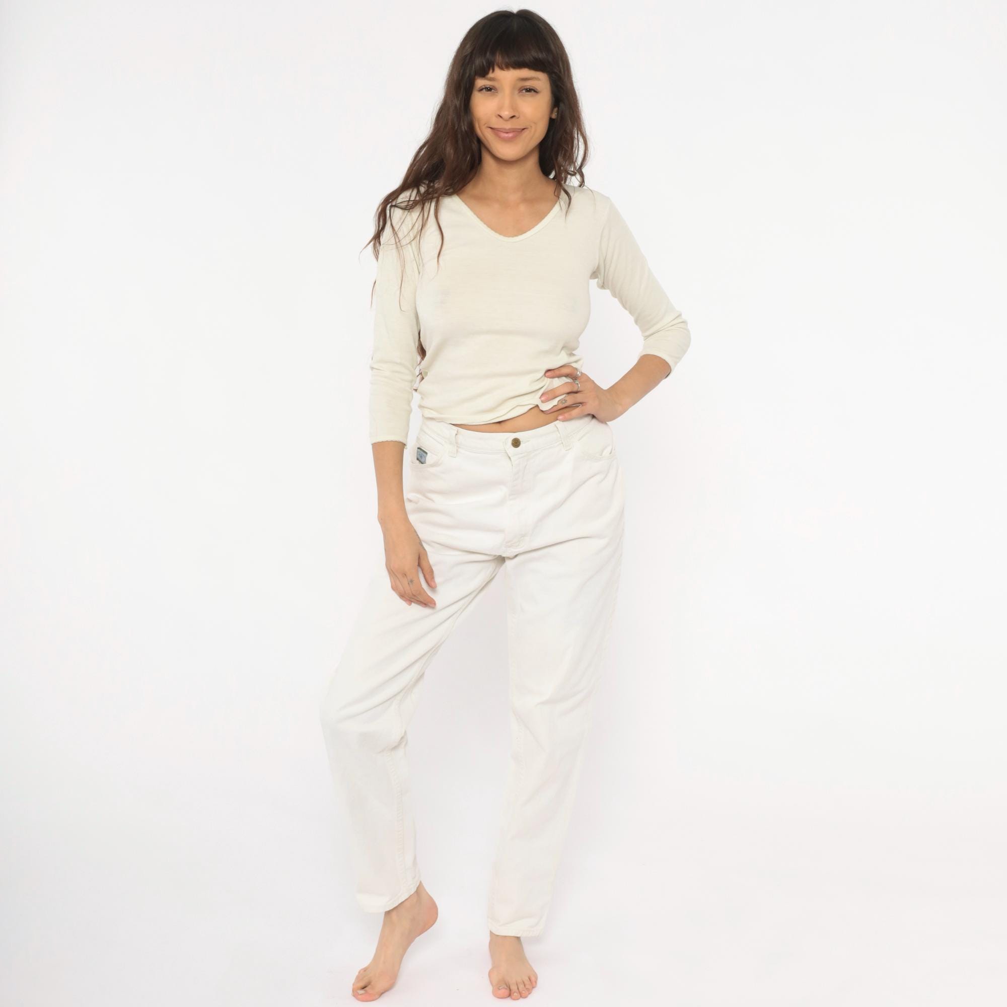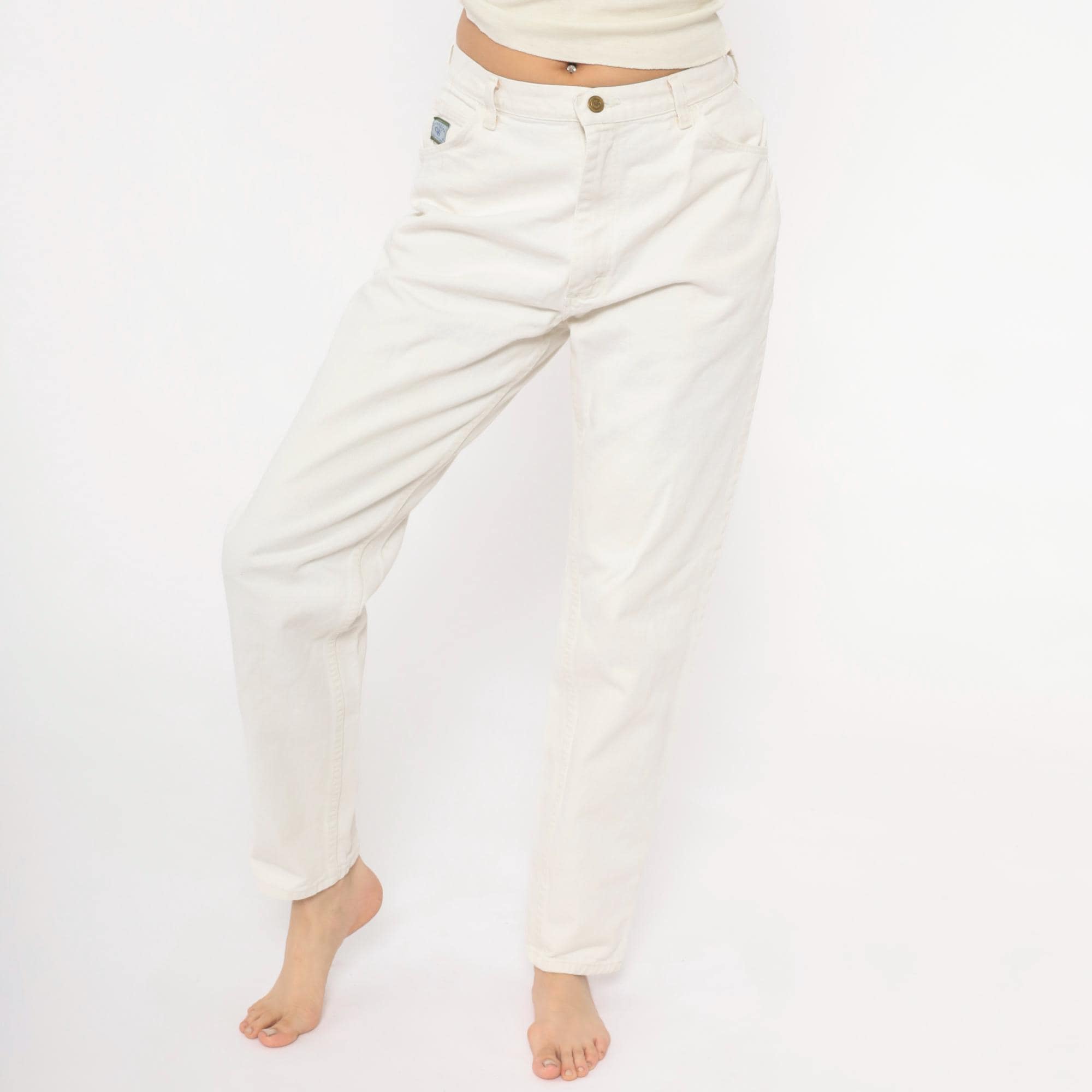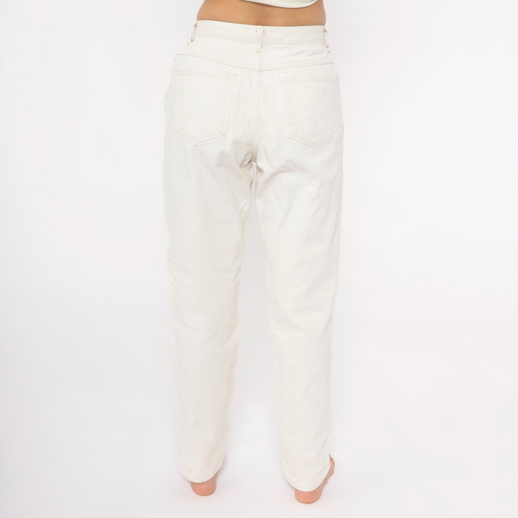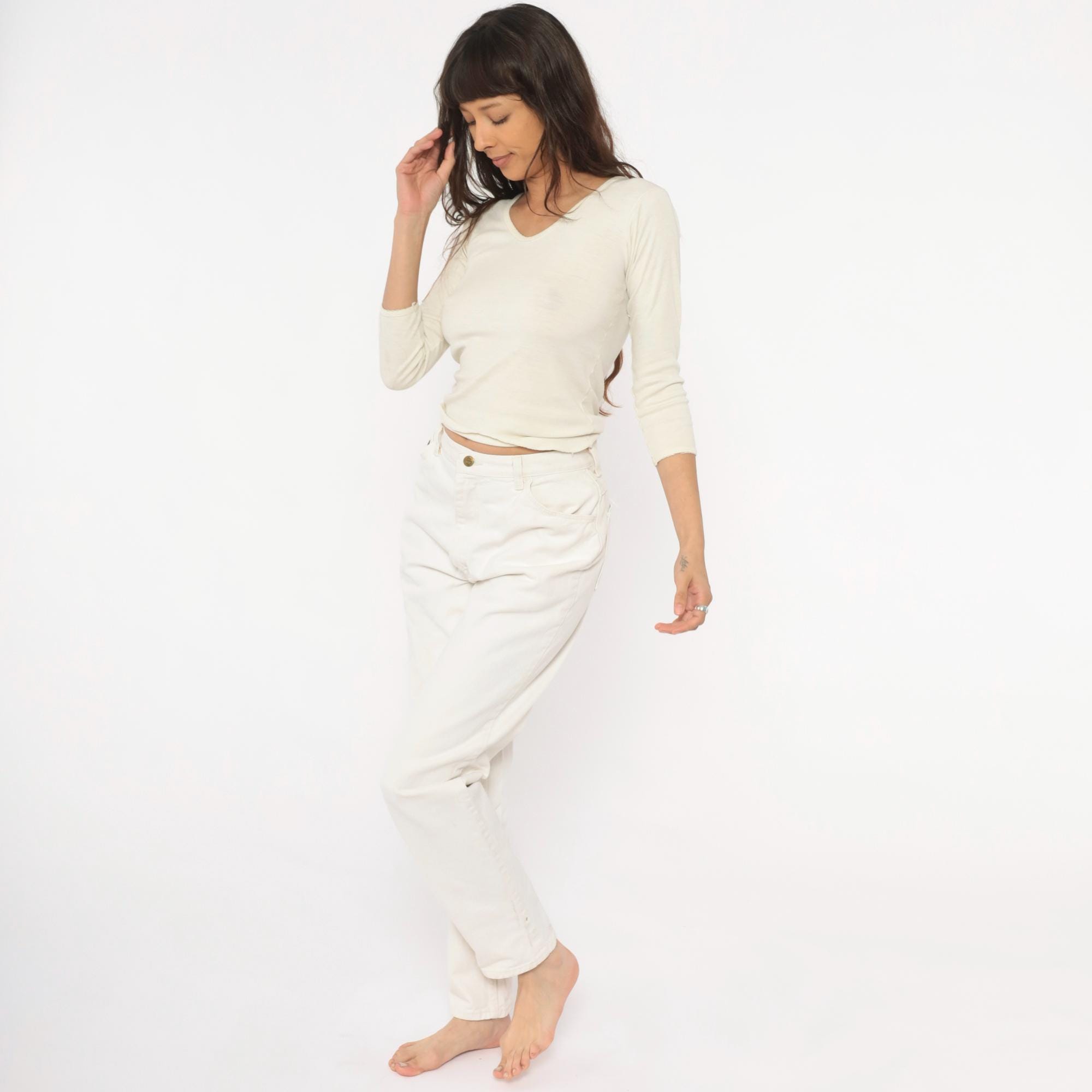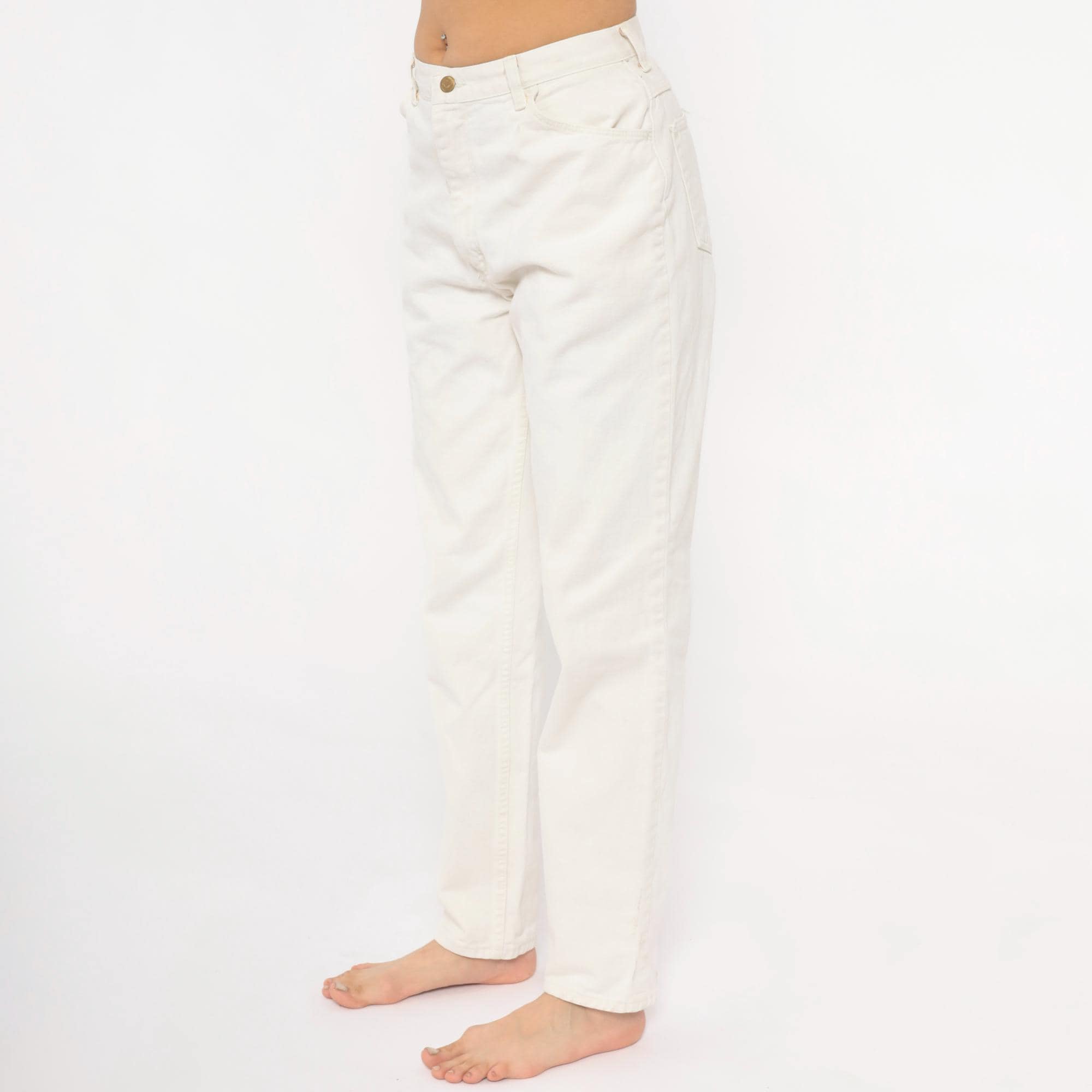90s white Wrangler jeans with a high-rise waist, tapered straight leg, and five-pocket construction. Zip fly with single button closure at the waistband. Small Wrangler for Women logo patch on the front right pocket.