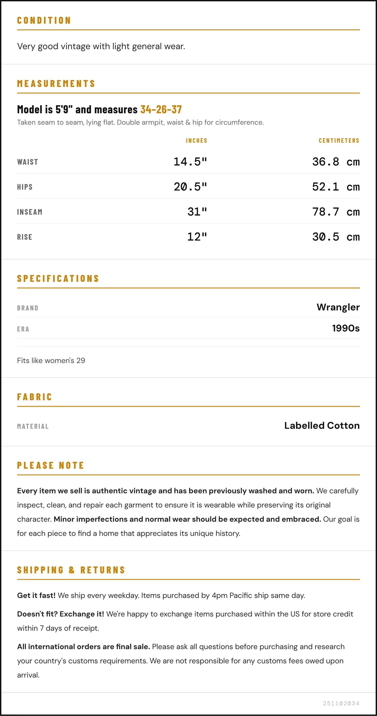 Vintage denim was usually made without any stretch, unlike modern jeans. Check the measurements to ensure proper fit, and remember to give yourself a little wiggle room in the waist and hips, depending on your preferred fit.