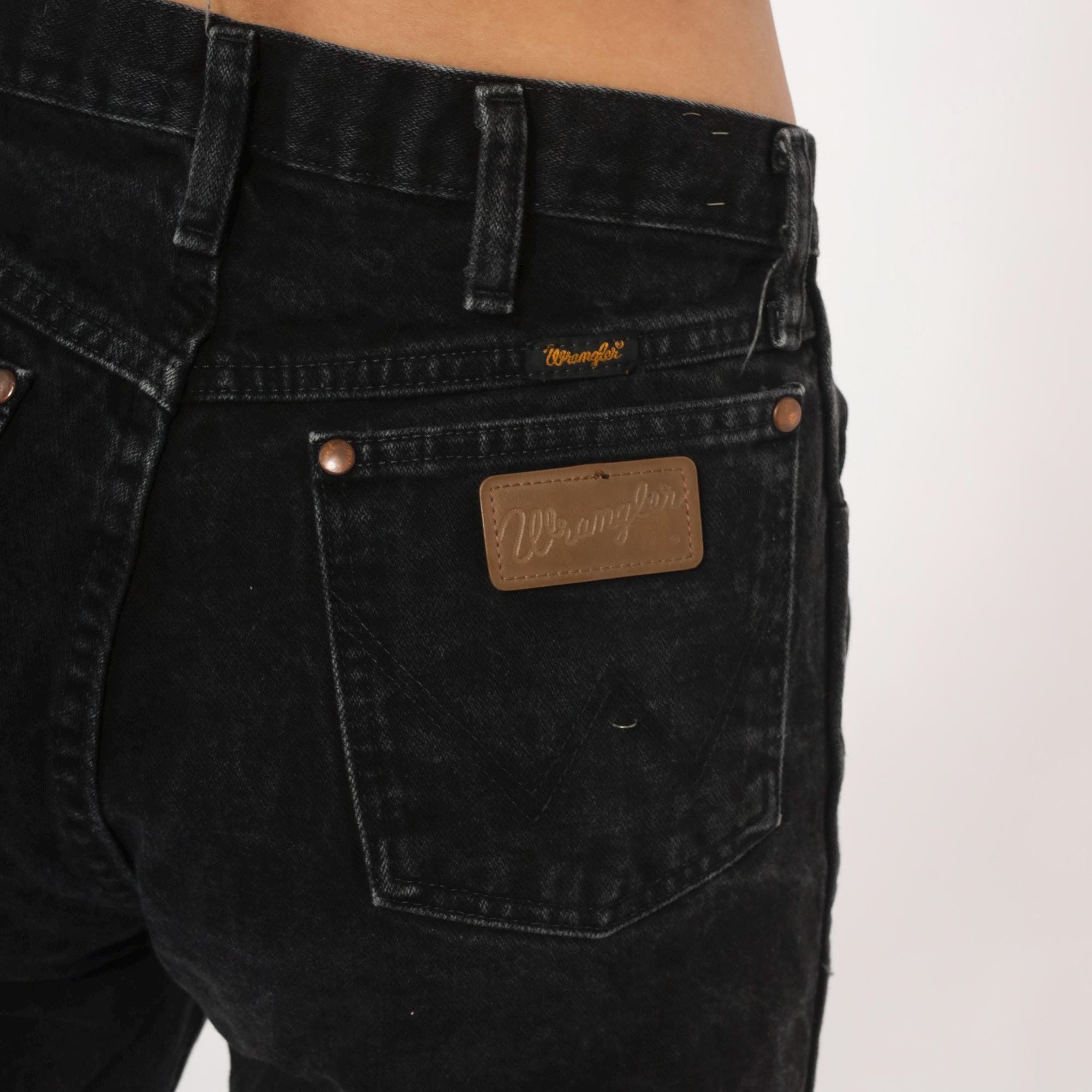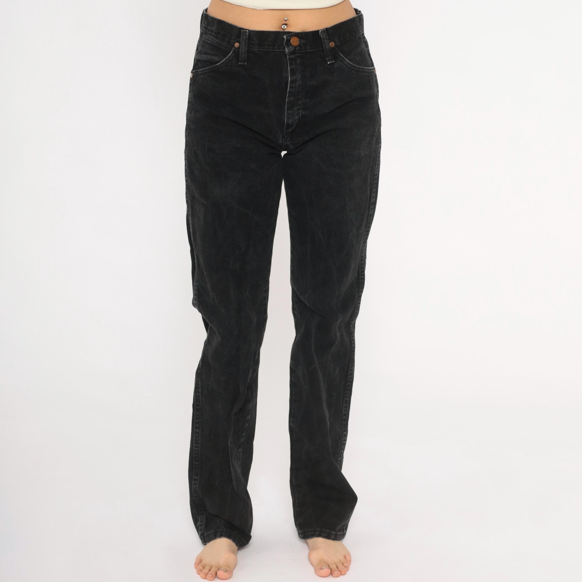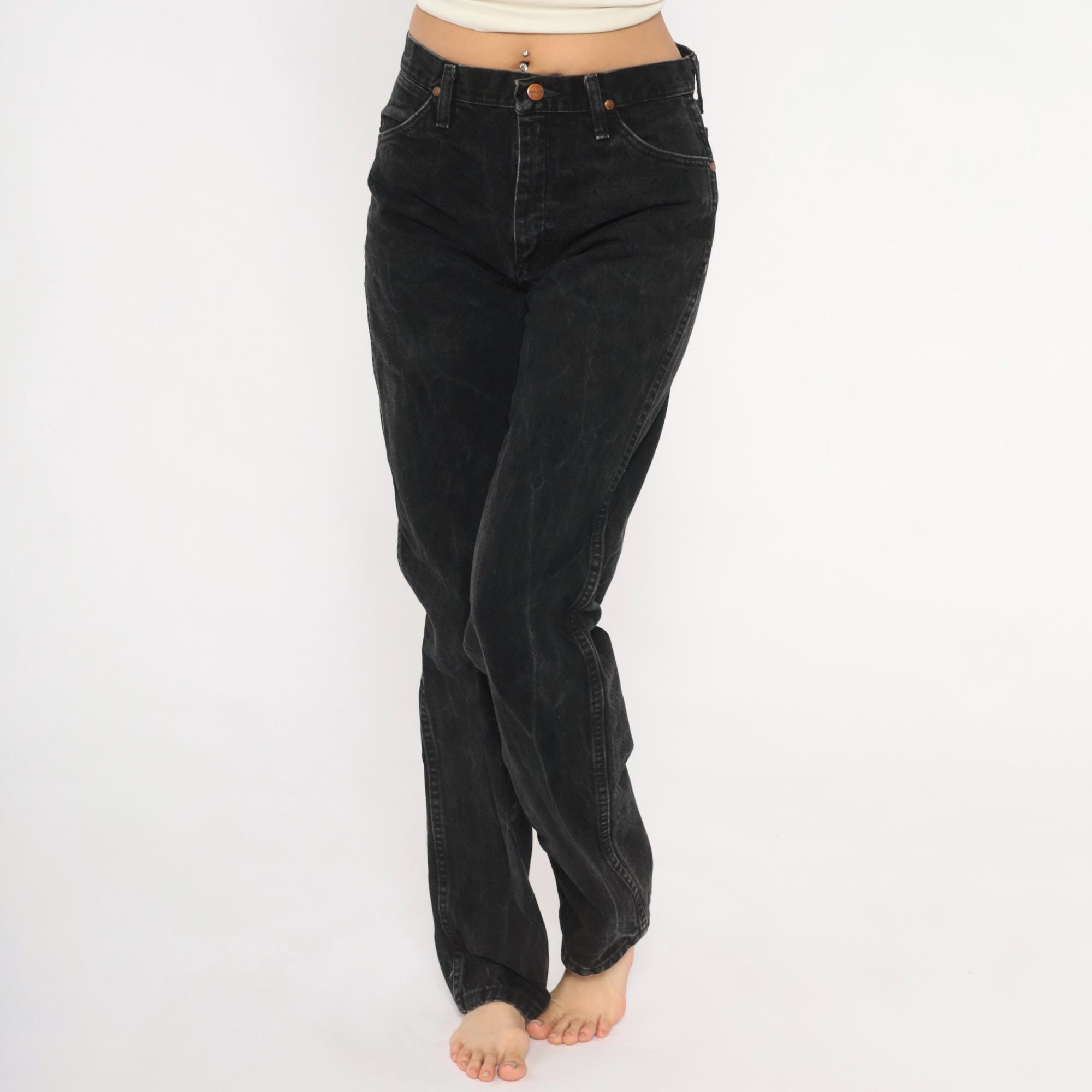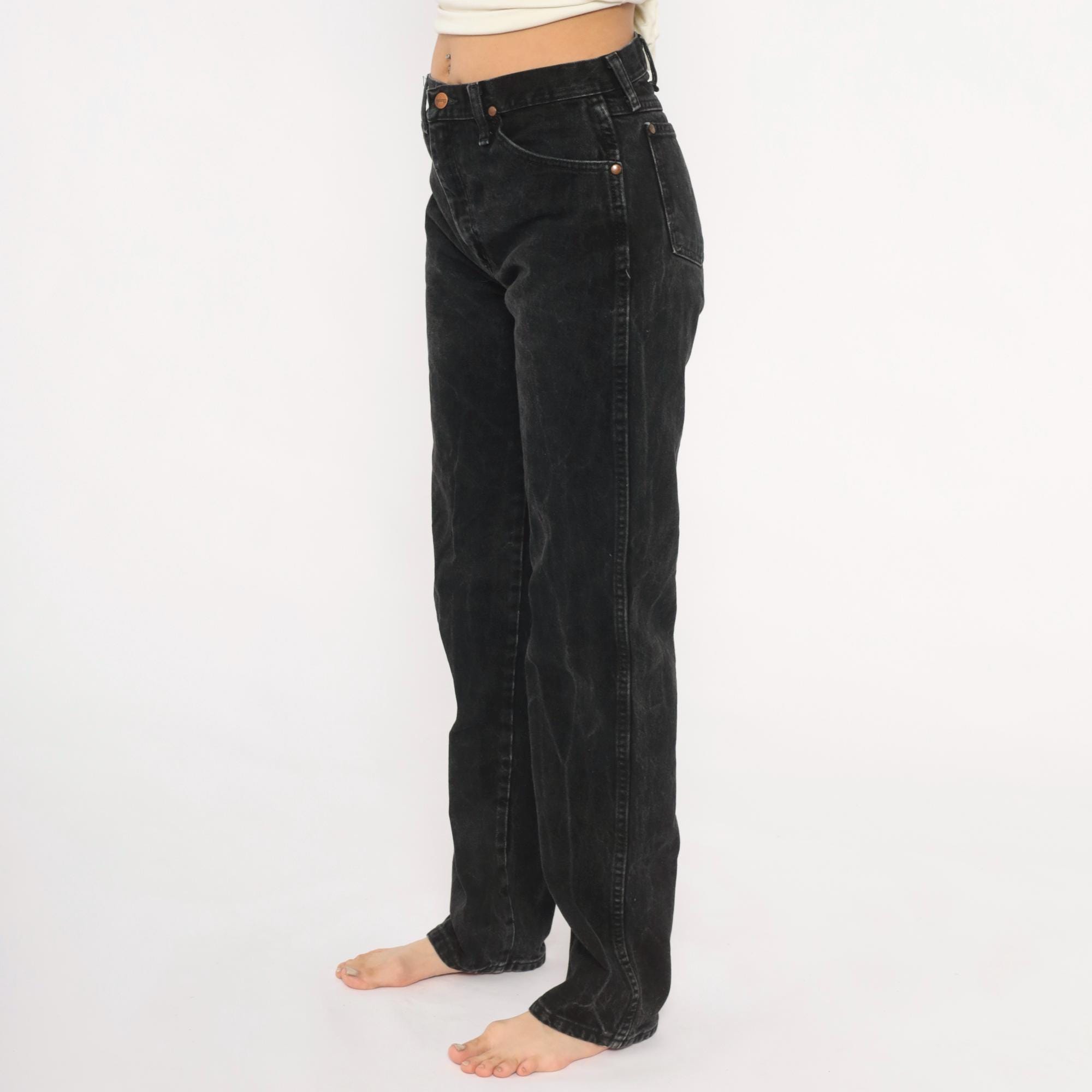 90s Wrangler jeans in a faded black wash with charcoal tones throughout. High rise with straight leg cut, zipper fly with button closure, five-pocket construction including side seam and back pockets. Wrangler leather patch on the back right pocket and embroidered gold script logo on the rear waistband.