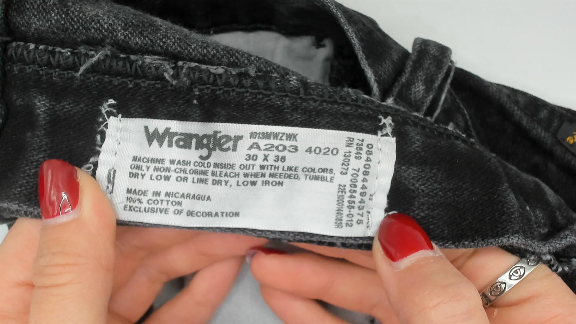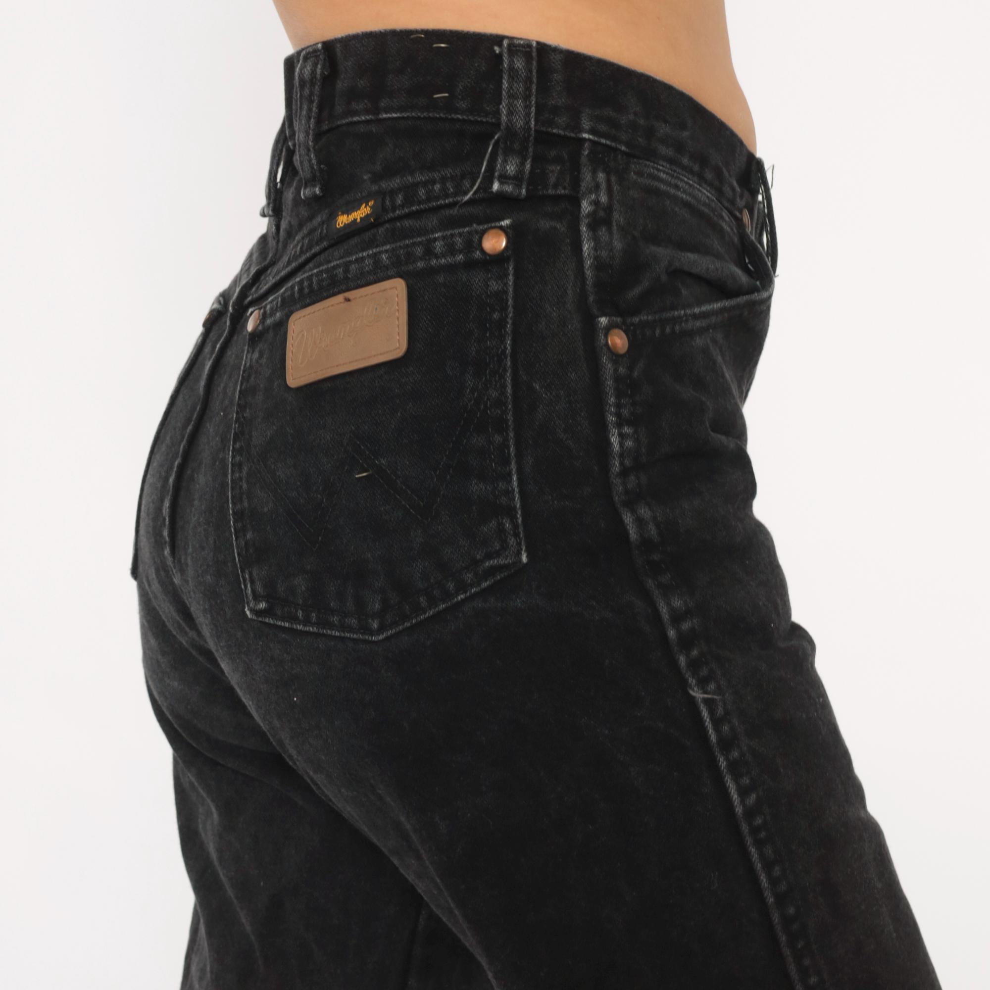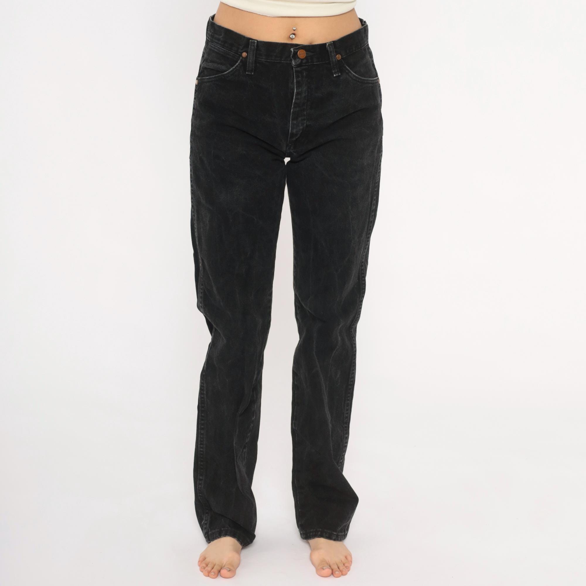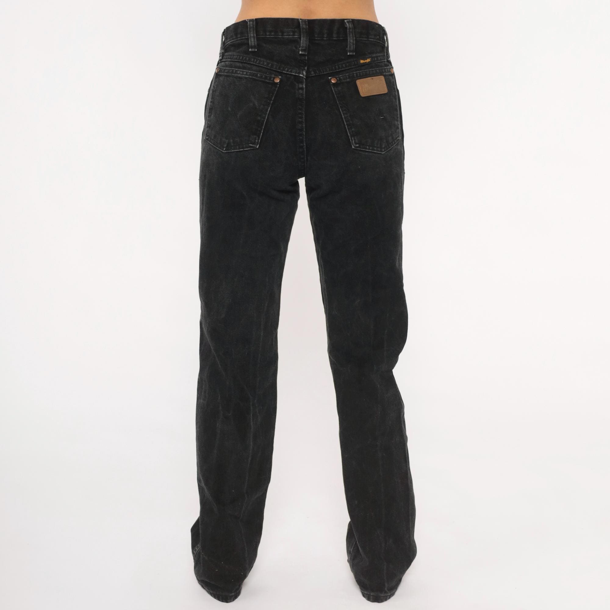 90s Wrangler jeans in a faded black wash with charcoal tones throughout. High rise with straight leg cut, zipper fly with button closure, five-pocket construction including side seam and back pockets. Wrangler leather patch on the back right pocket and embroidered gold script logo on the rear waistband.