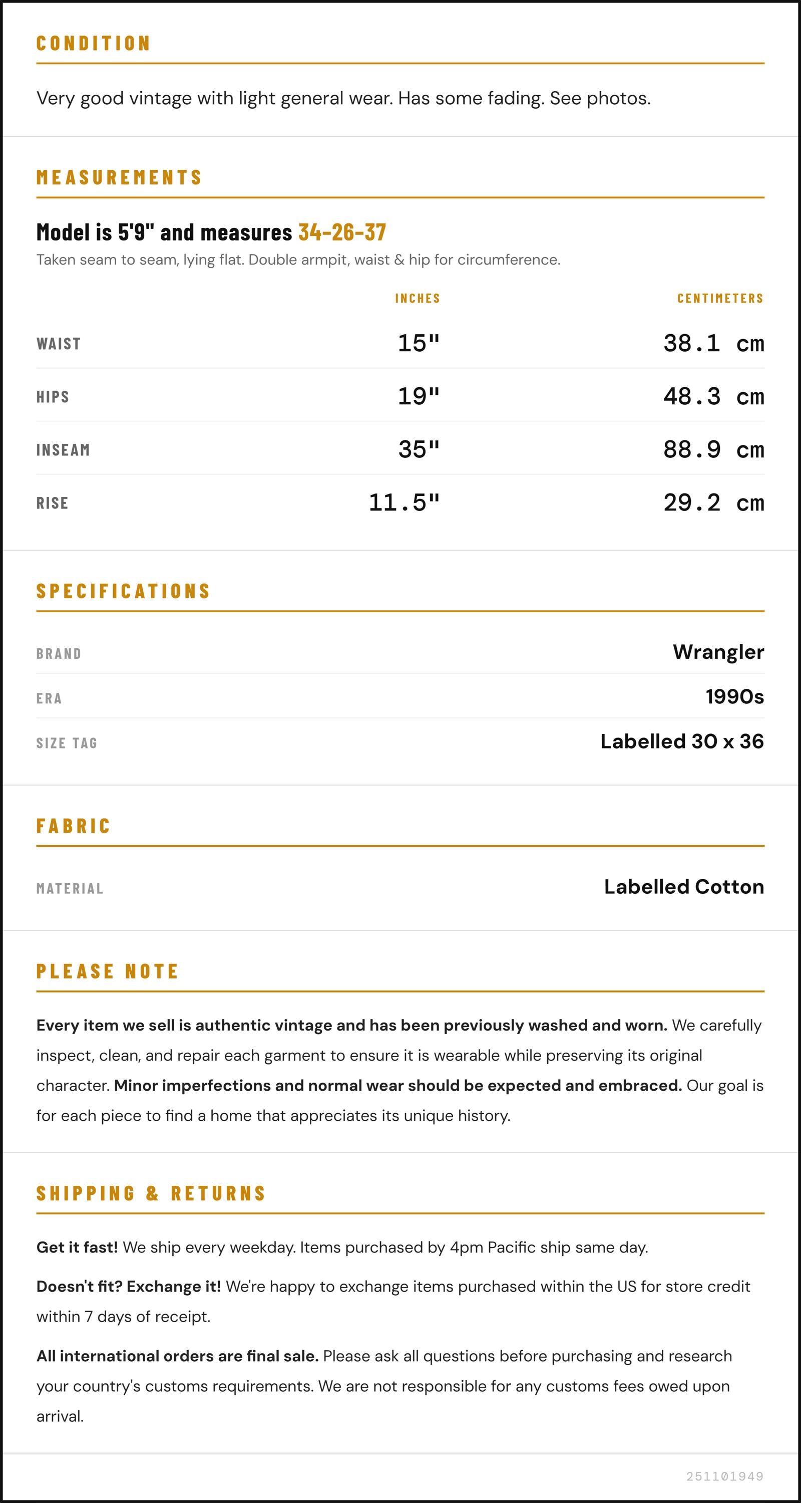 Vintage denim was usually made without any stretch, unlike modern jeans. Check the measurements to ensure proper fit, and remember to give yourself a little wiggle room in the waist and hips, depending on your preferred fit.