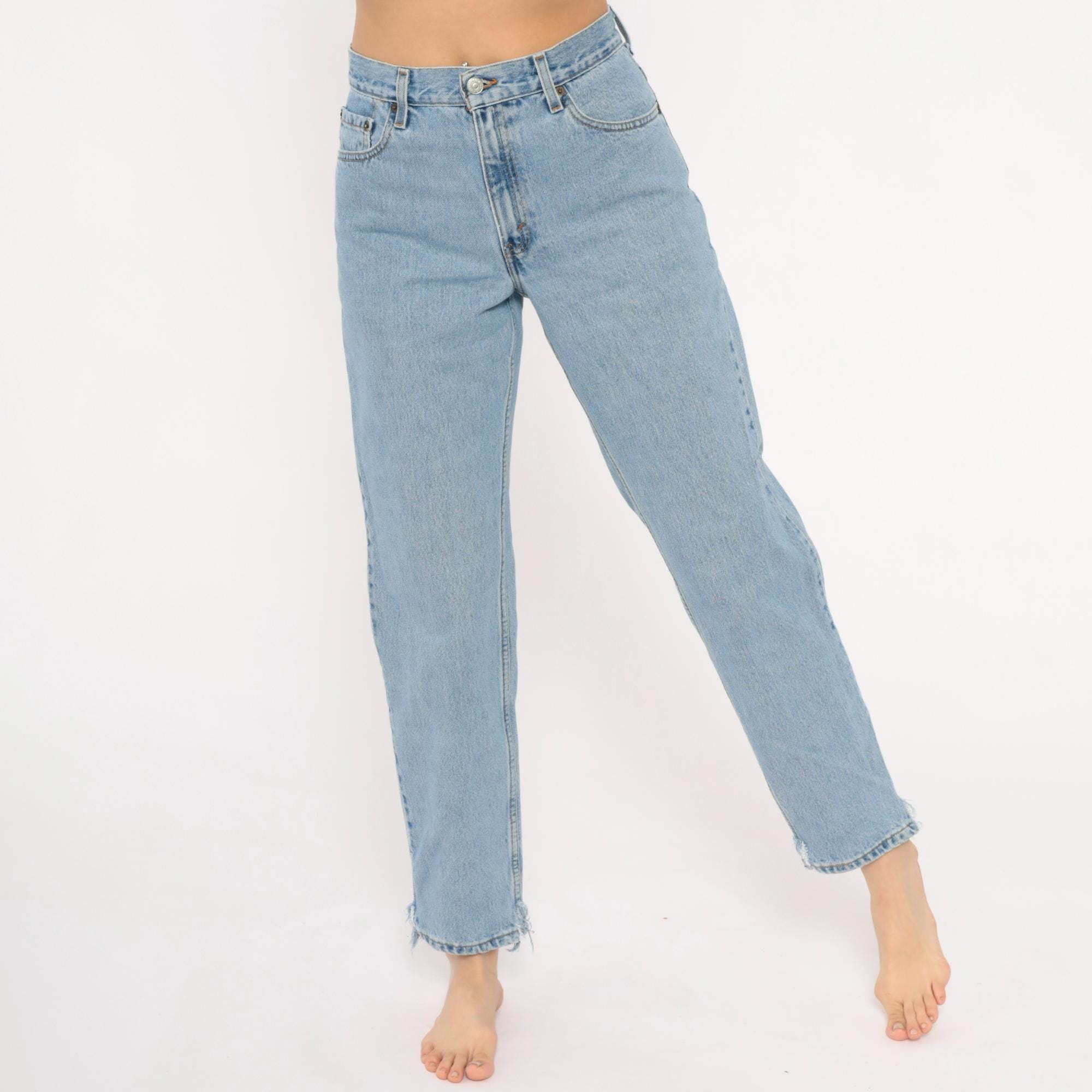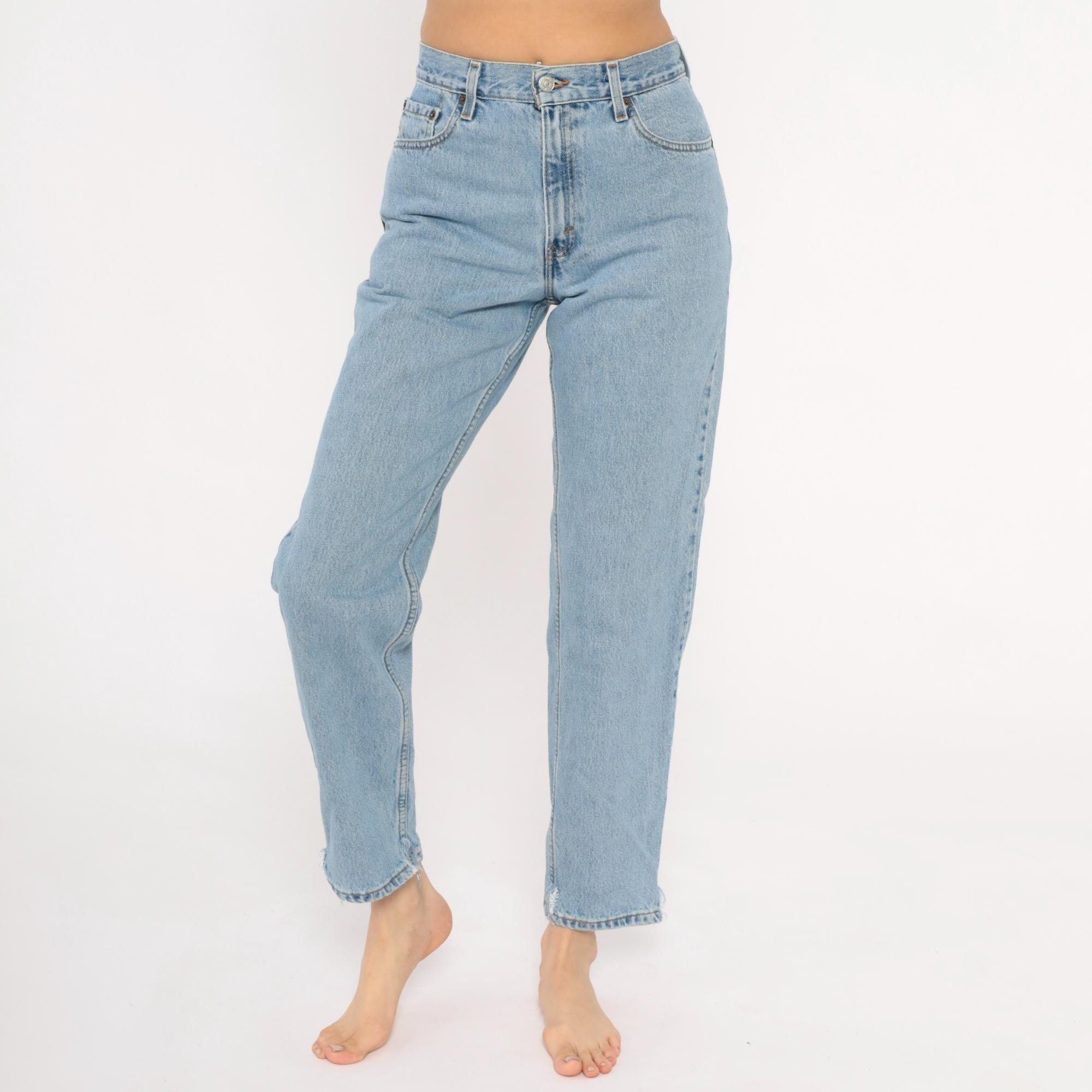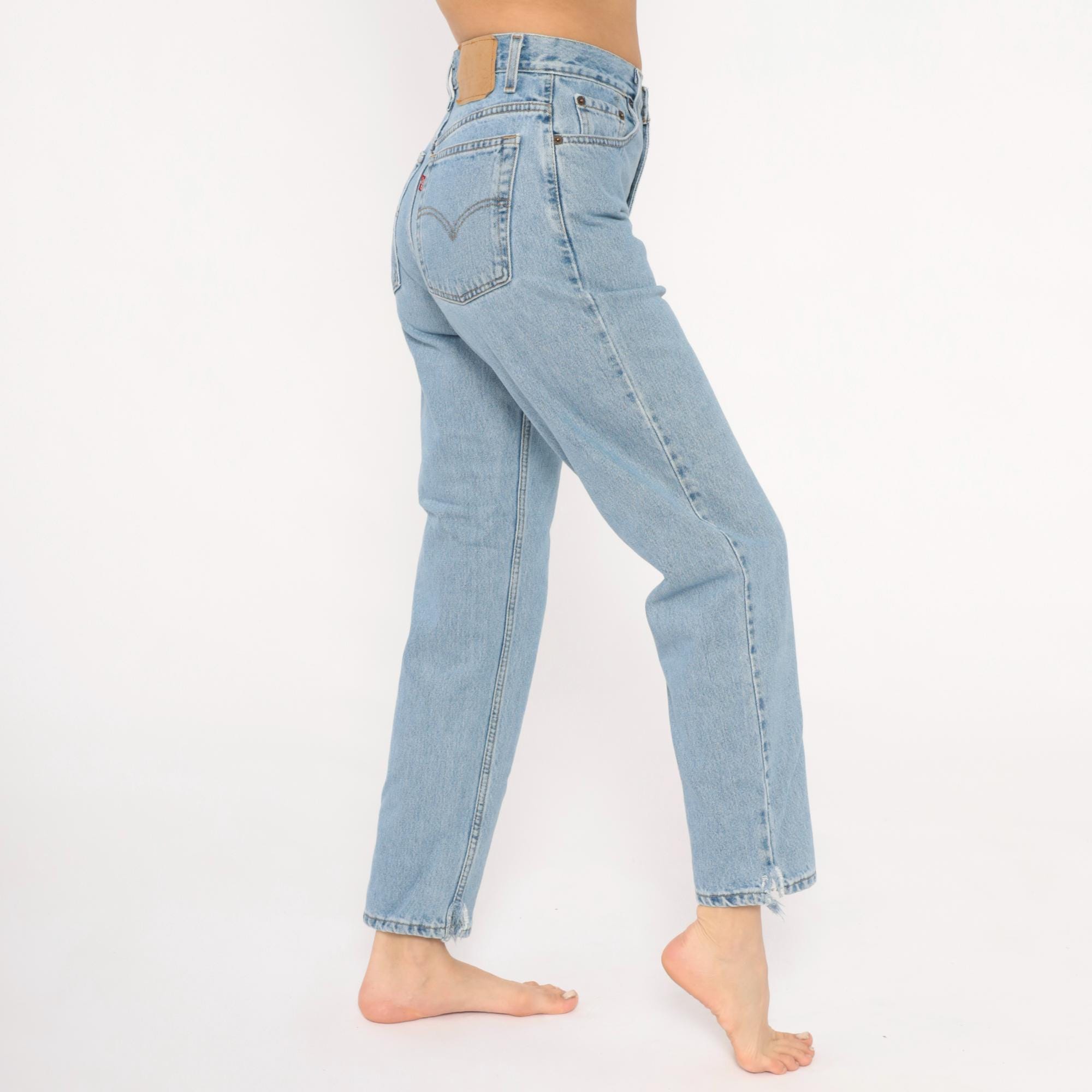 2000s Levi 550 relaxed fit tapered leg jeans in a light wash blue denim with faded whiskering at the hips. High rise waist, five-pocket styling, front zipper and button closure. Raw cut hem at the ankle, classic arcuate stitching on back pockets, and leather brand patch at the rear waistband.