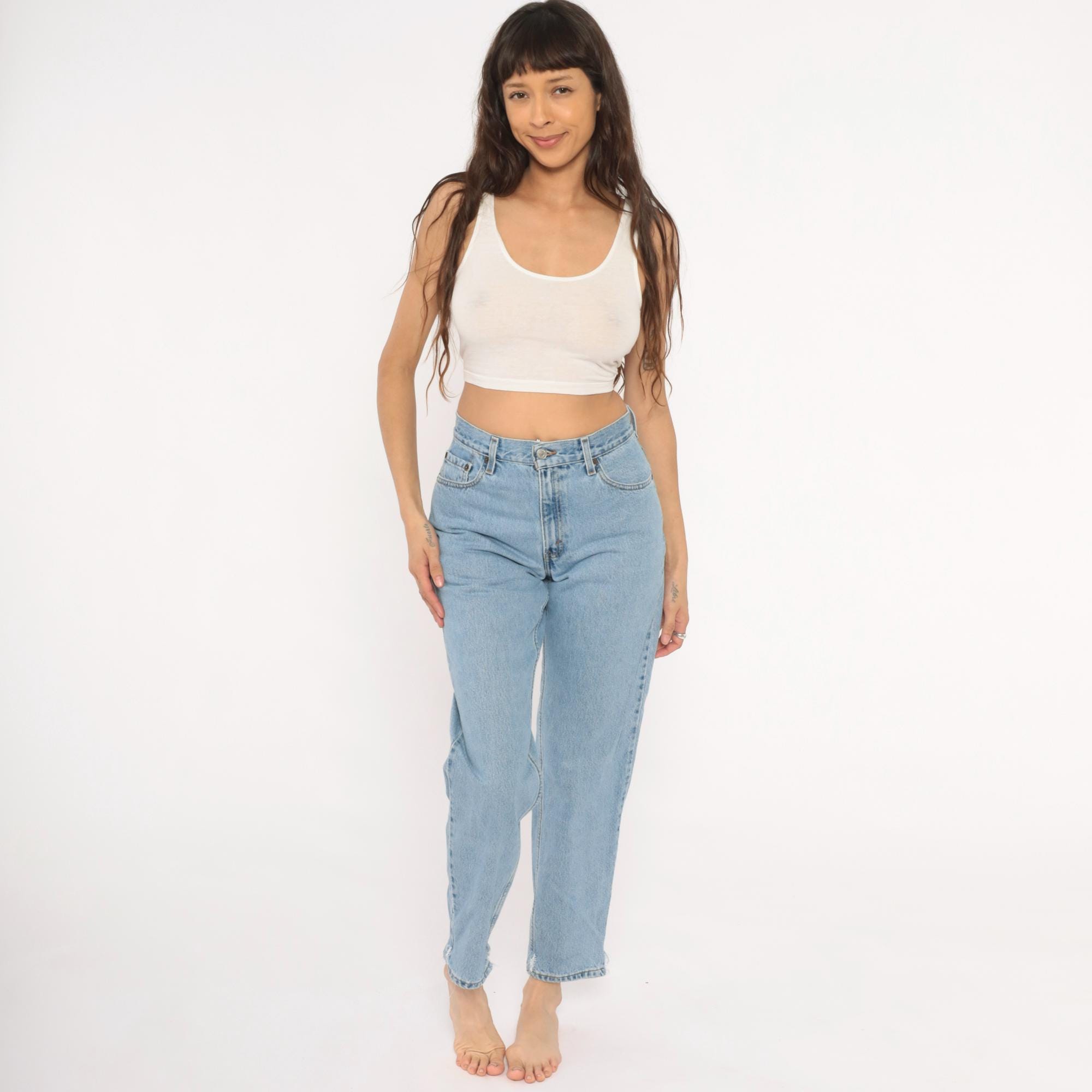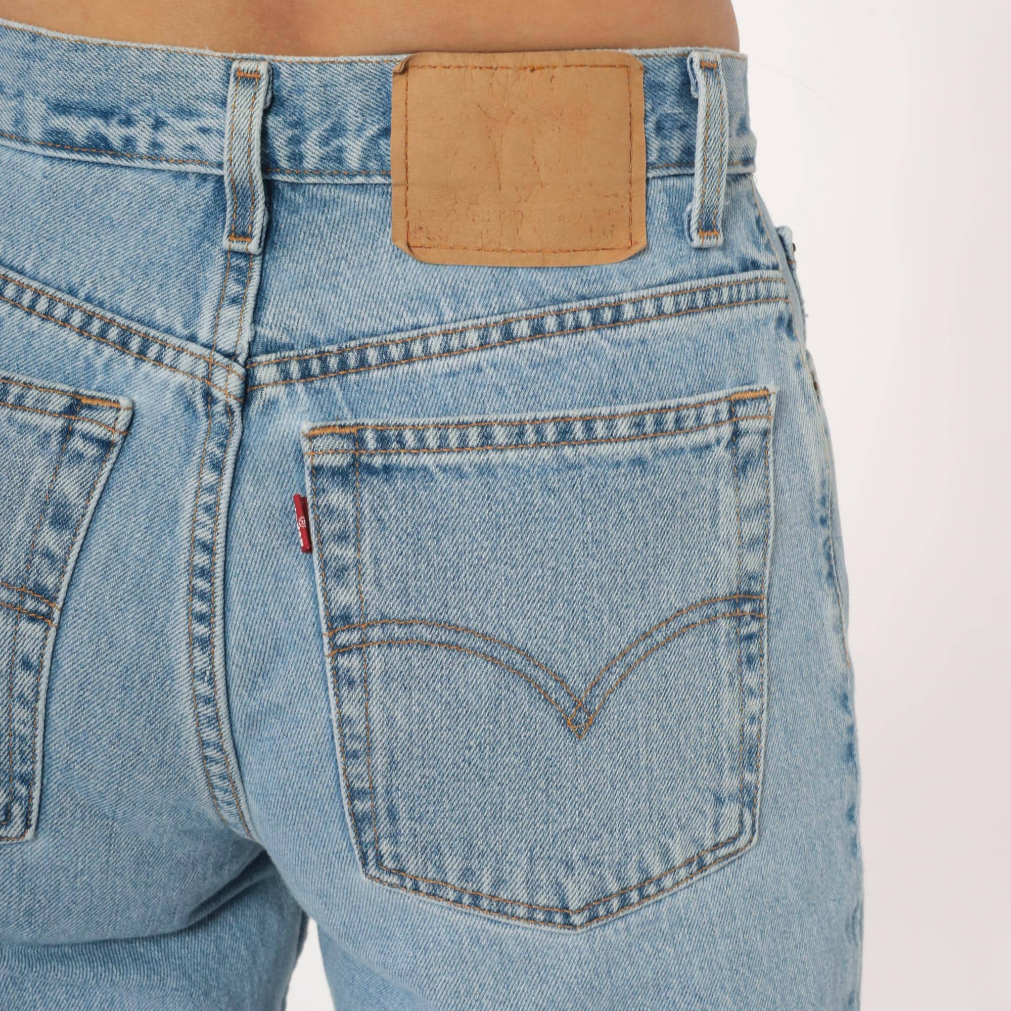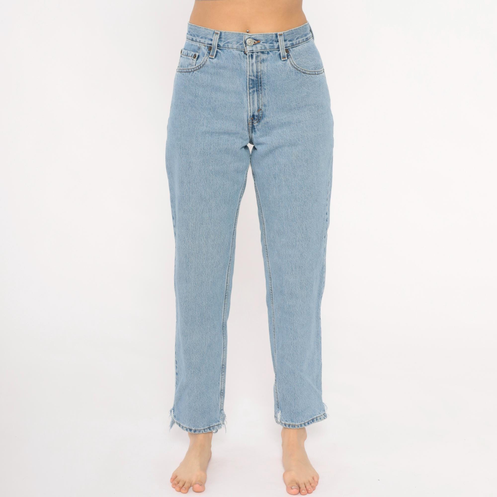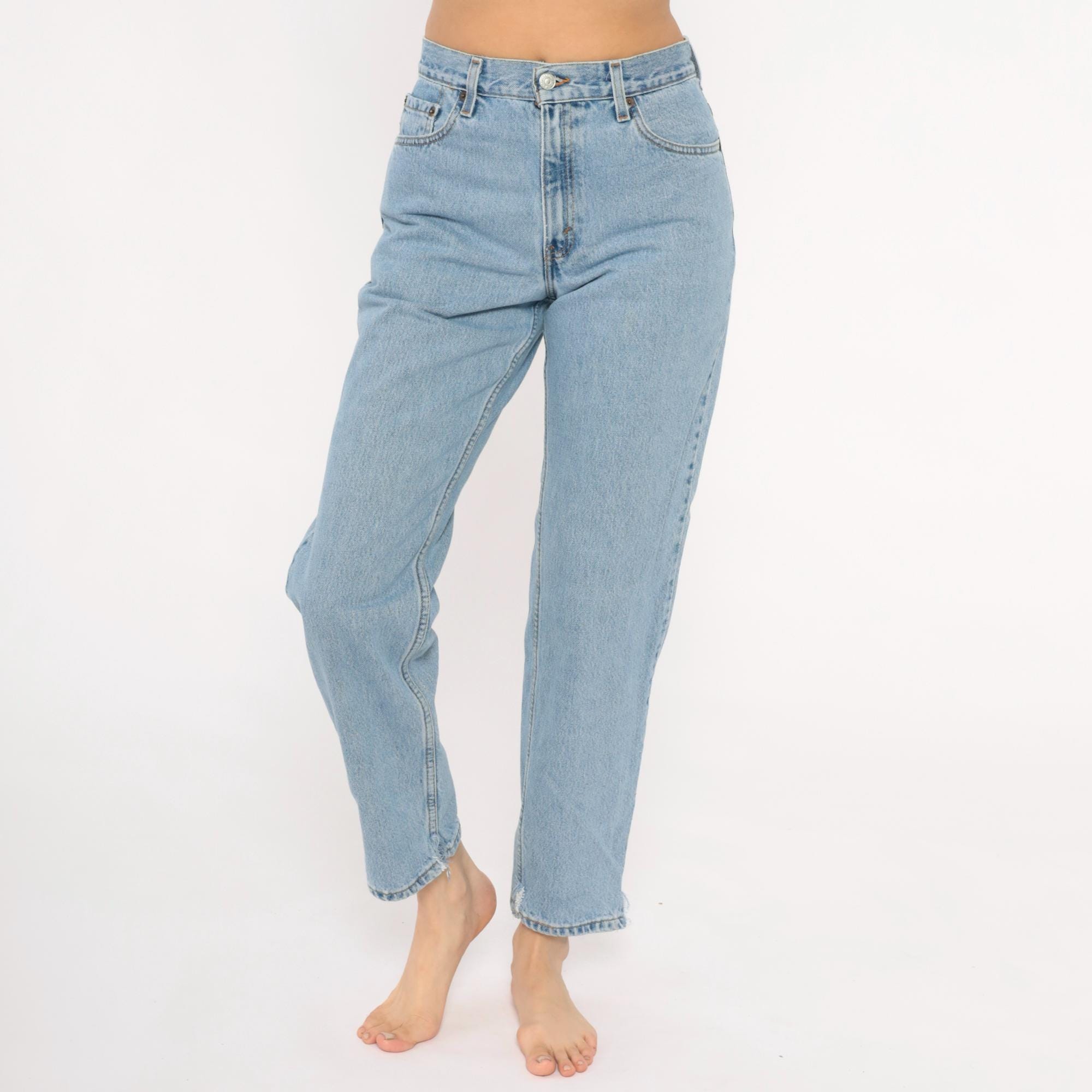2000s Levi 550 relaxed fit tapered leg jeans in a light wash blue denim with faded whiskering at the hips. High rise waist, five-pocket styling, front zipper and button closure. Raw cut hem at the ankle, classic arcuate stitching on back pockets, and leather brand patch at the rear waistband.