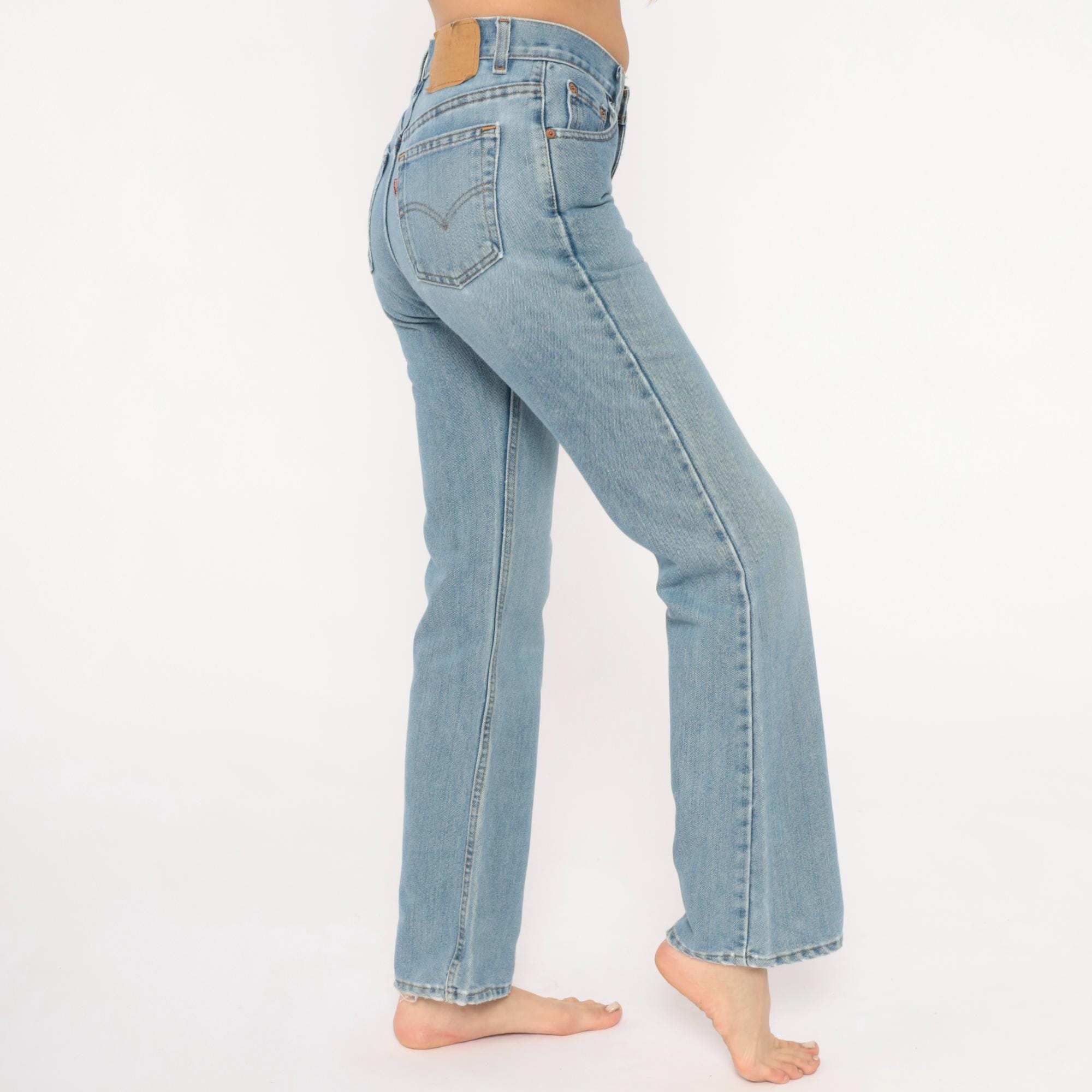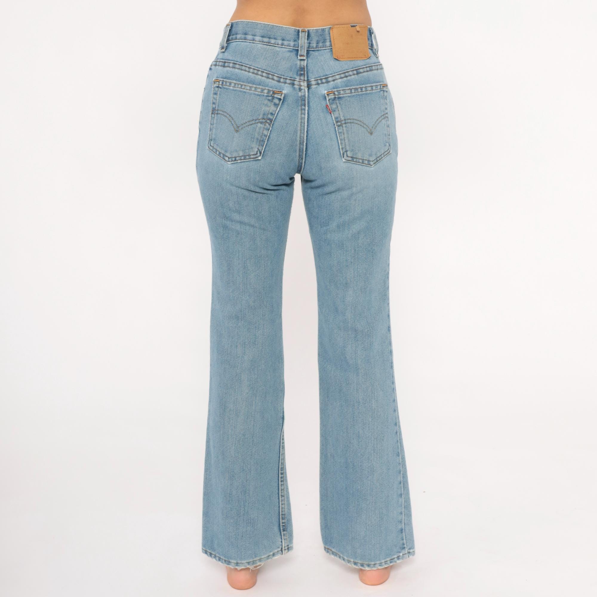 90s Levis 517 boot cut jeans in a light wash blue denim with allover fading. Low rise waist, zip fly with button closure, classic five-pocket construction. Straight through the thigh with a flared leg opening, copper rivets, and the iconic leather back patch.
