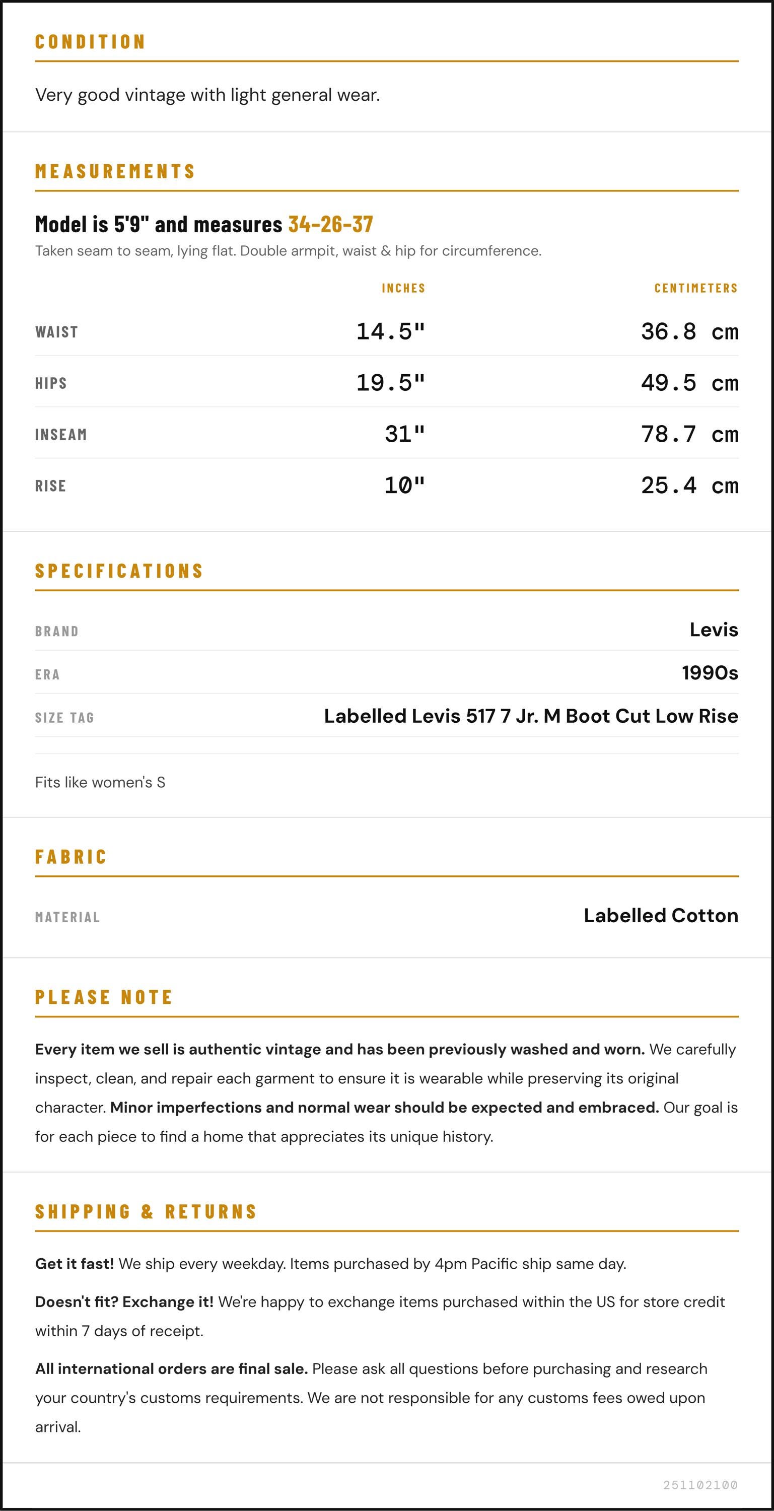 Vintage denim was usually made without any stretch, unlike modern jeans. Check the measurements to ensure proper fit, and remember to give yourself a little wiggle room in the waist and hips, depending on your preferred fit.