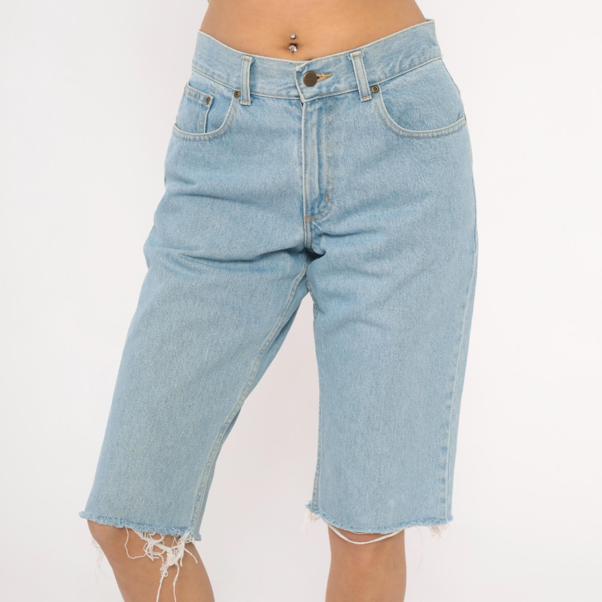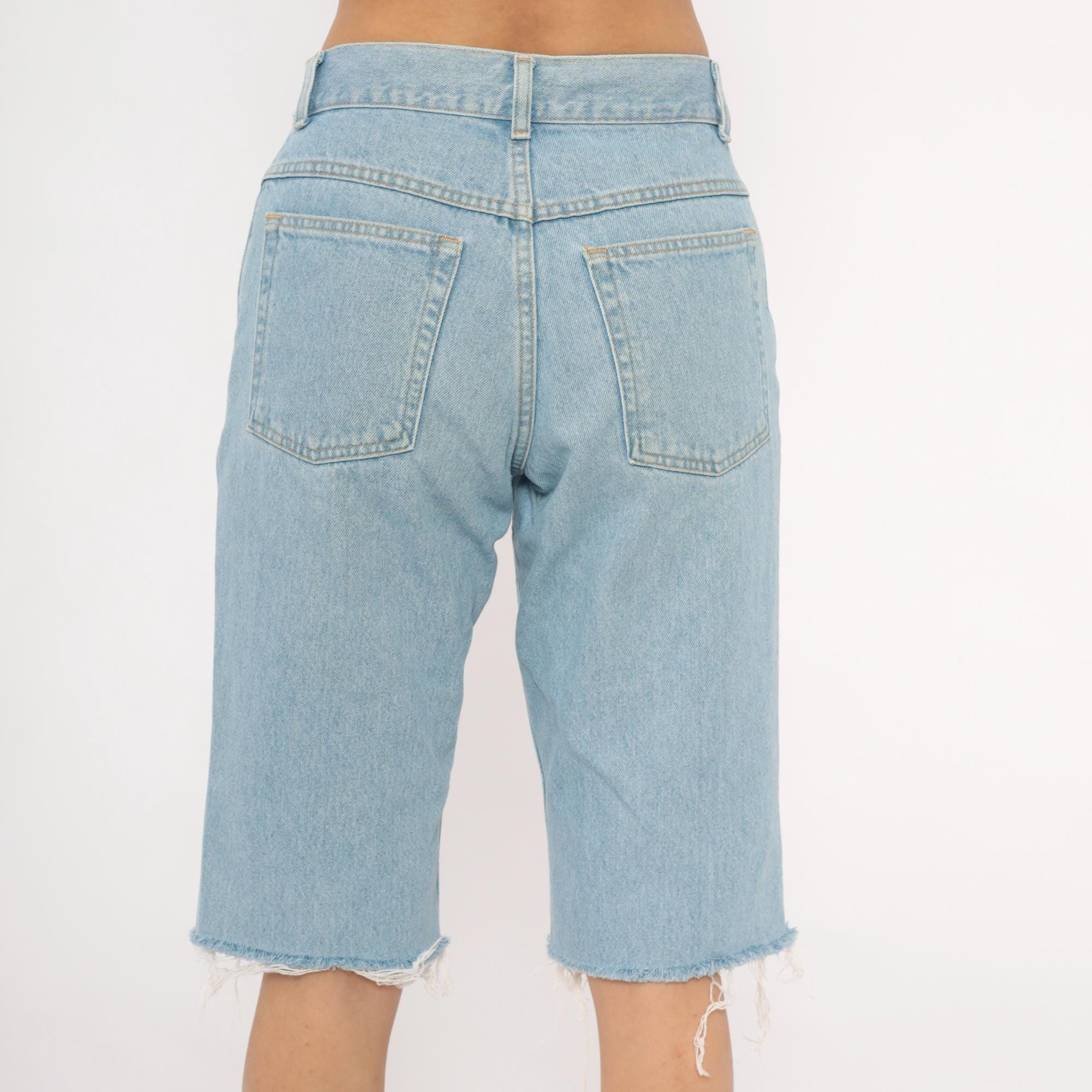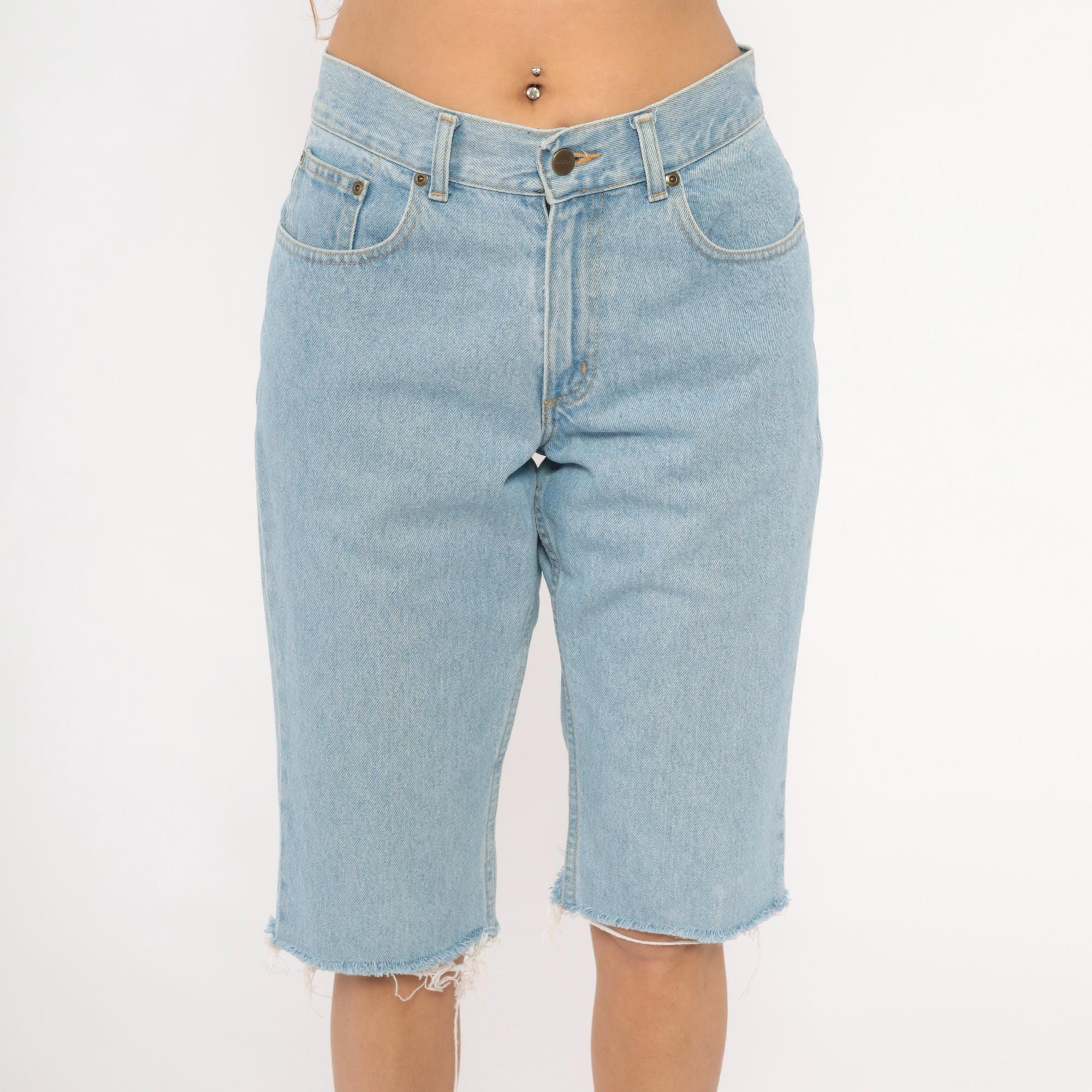 Light wash denim cutoff bermuda shorts from LL Bean with raw frayed hems at the knee. High-waisted with a zip fly and button closure, five-pocket construction, and belt loops. Faded blue cotton with contrast gold topstitching throughout.