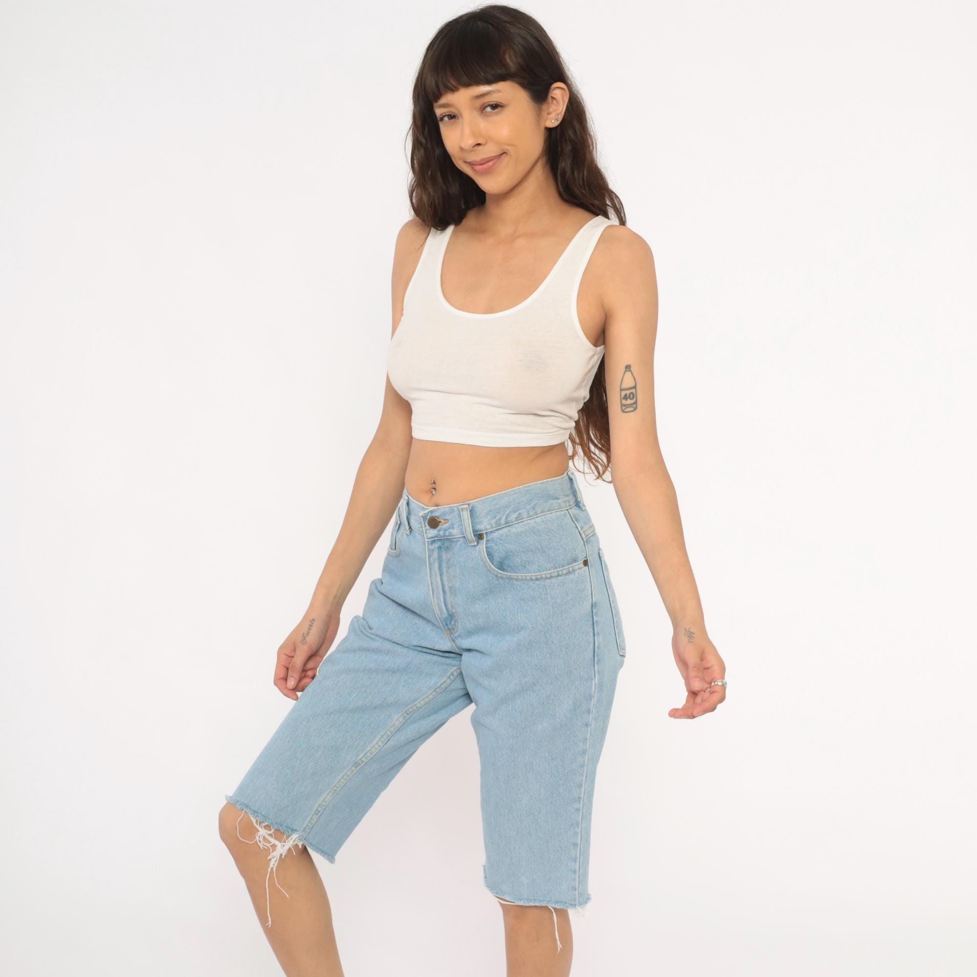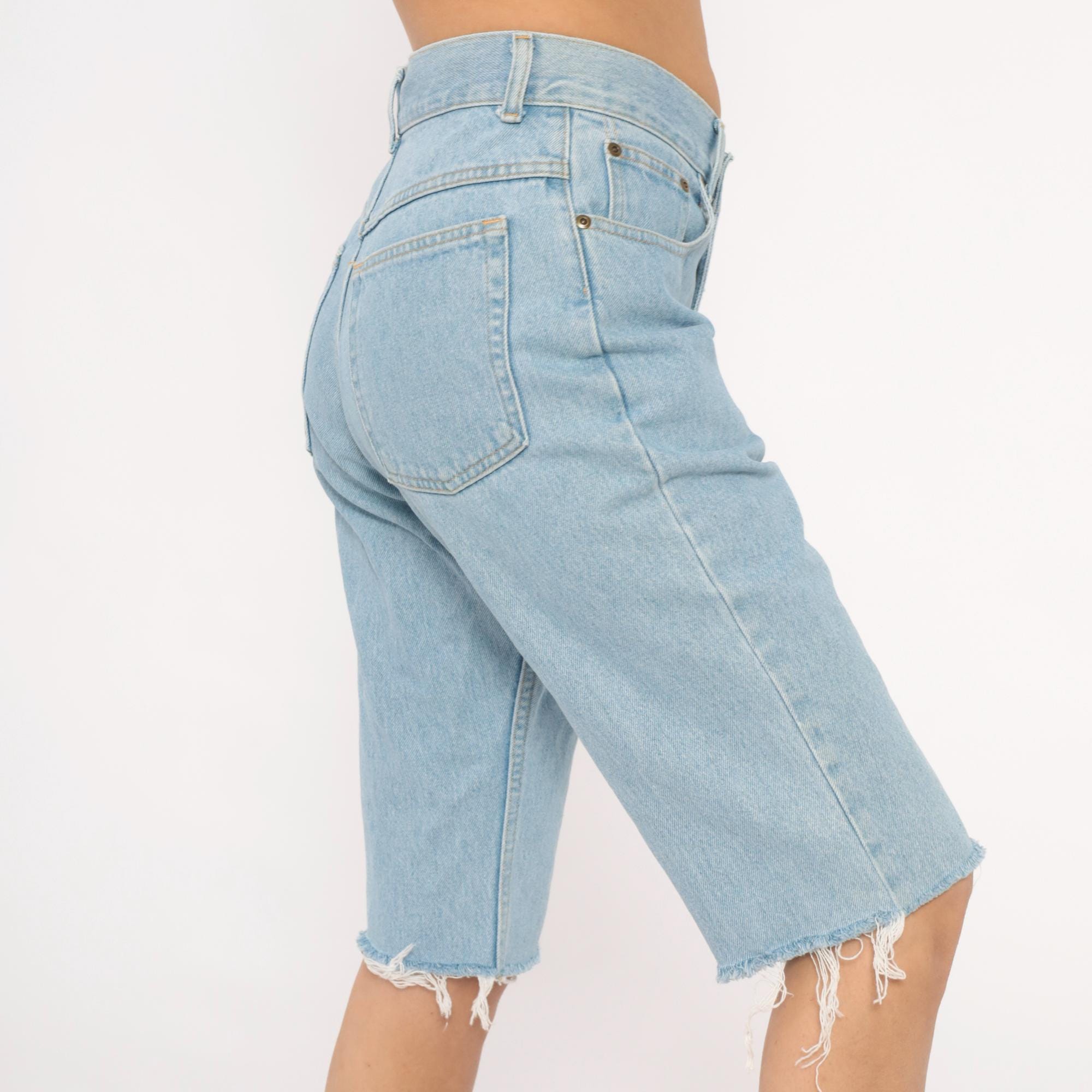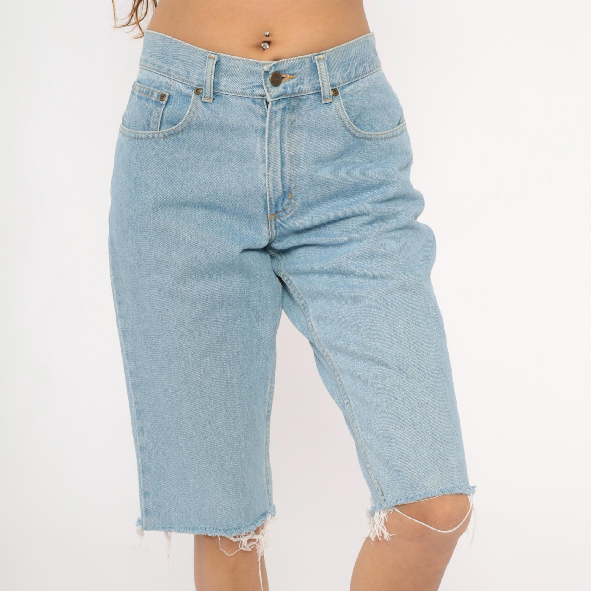 Light wash denim cutoff bermuda shorts from LL Bean with raw frayed hems at the knee. High-waisted with a zip fly and button closure, five-pocket construction, and belt loops. Faded blue cotton with contrast gold topstitching throughout.