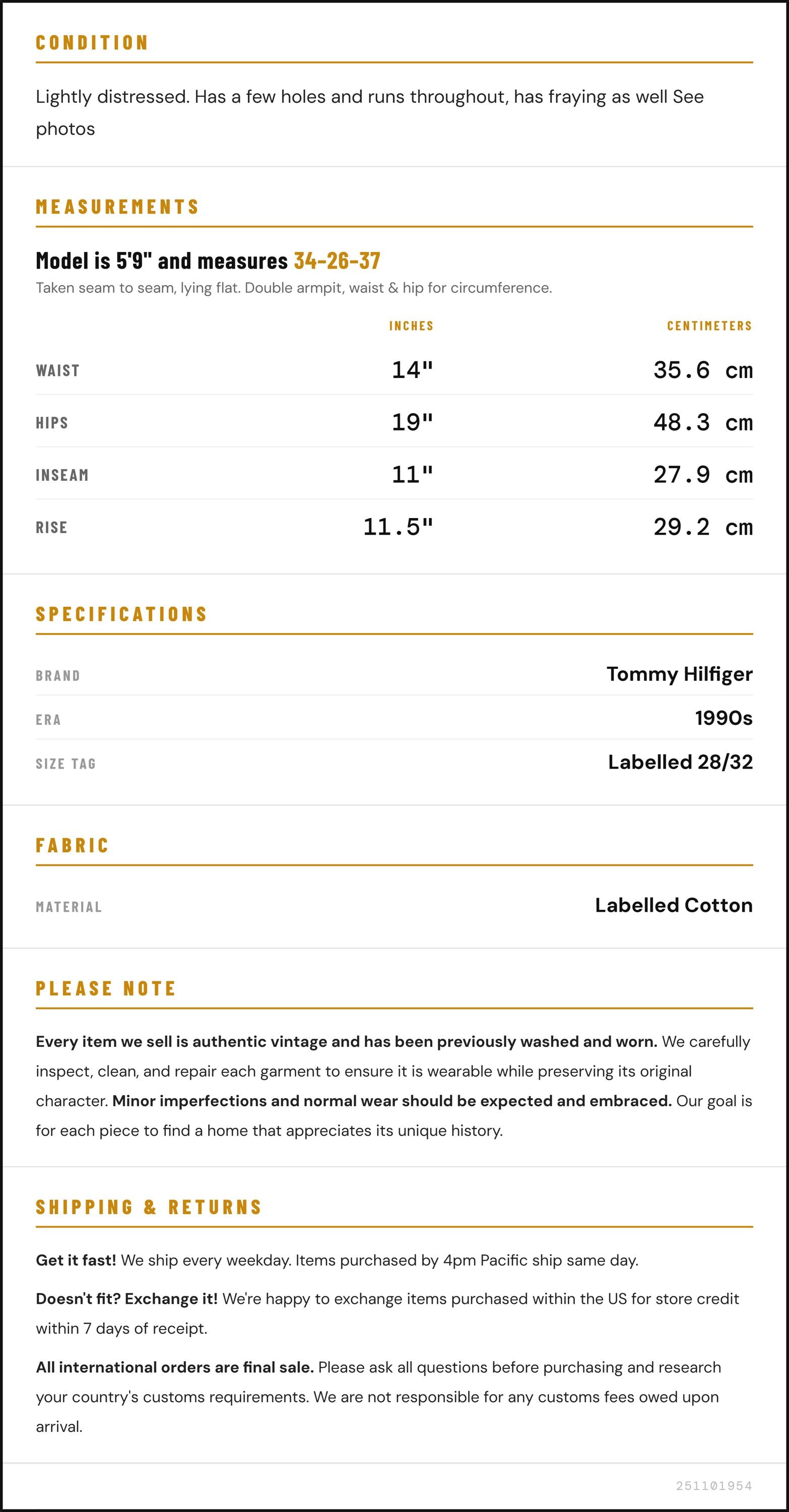 Vintage denim was usually made without any stretch, unlike modern jeans. Check the measurements to ensure proper fit, and remember to give yourself a little wiggle room in the waist and hips, depending on your preferred fit.