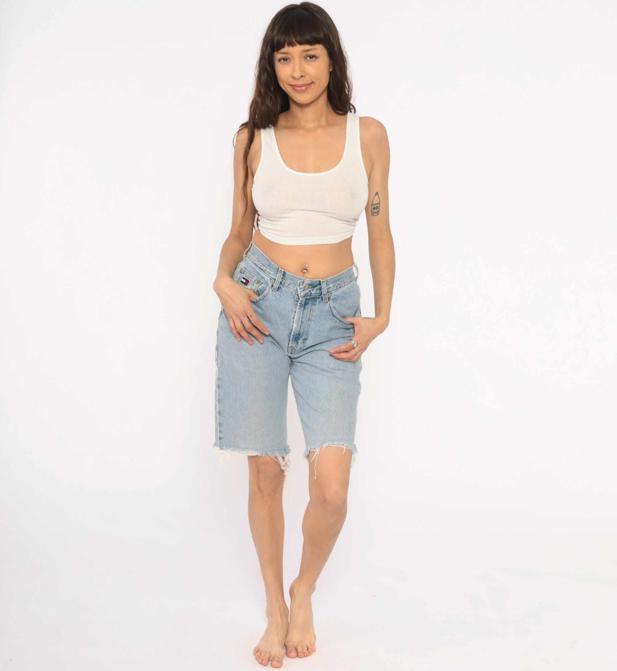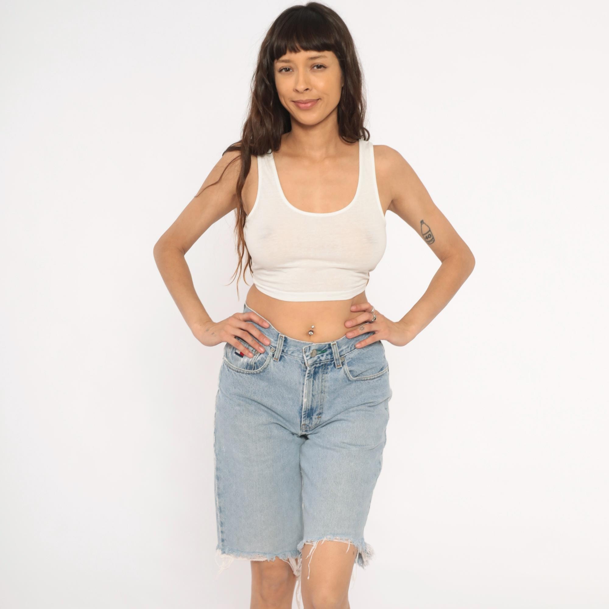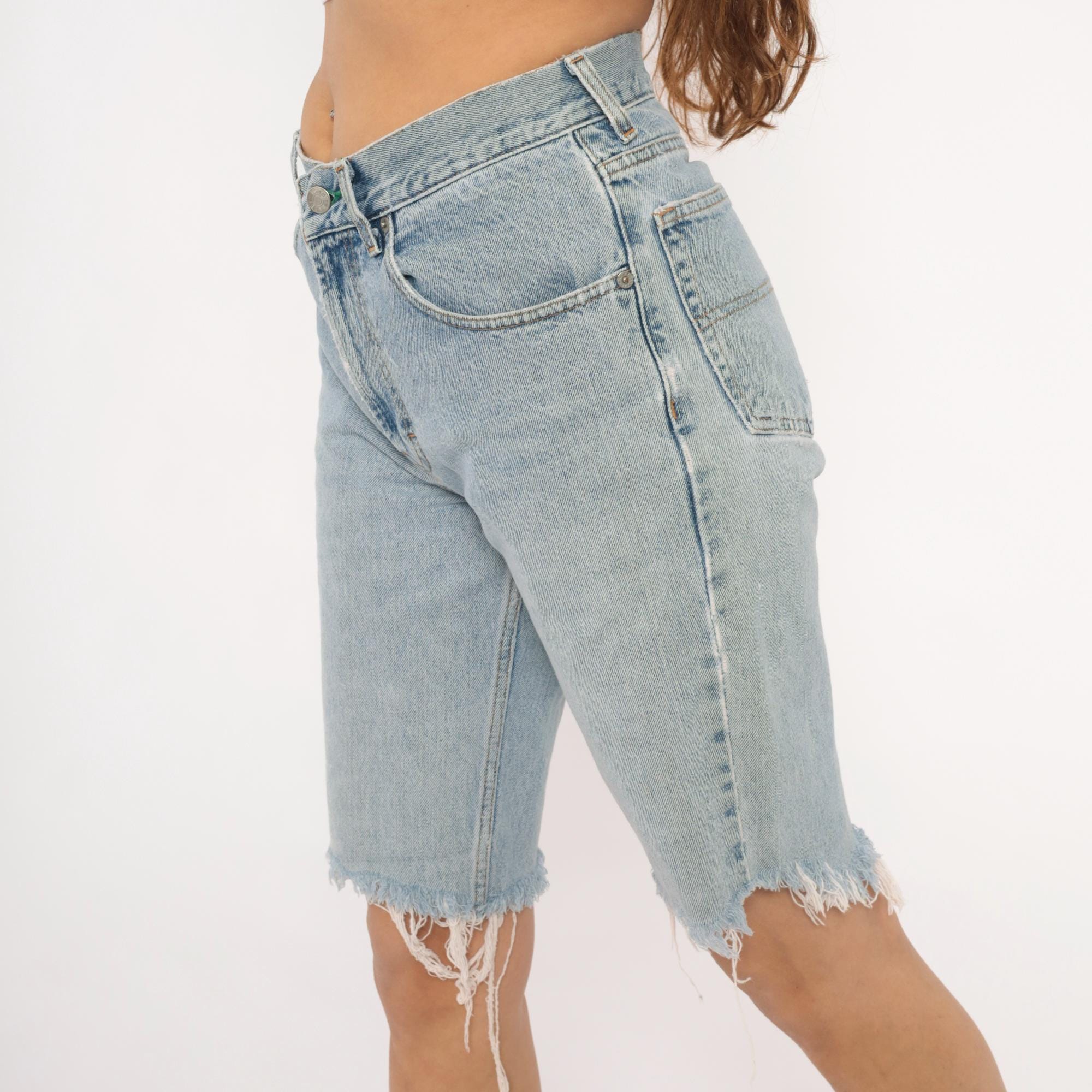 90s Tommy Hilfiger light wash denim bermuda shorts with raw cutoff hems and distressed detailing throughout. Five-pocket construction with front zipper closure, high rise waist, and relaxed straight leg. Embroidered flag logo on the front coin pocket and back waistband. Light blue faded wash with visible holes, runs, and fraying.