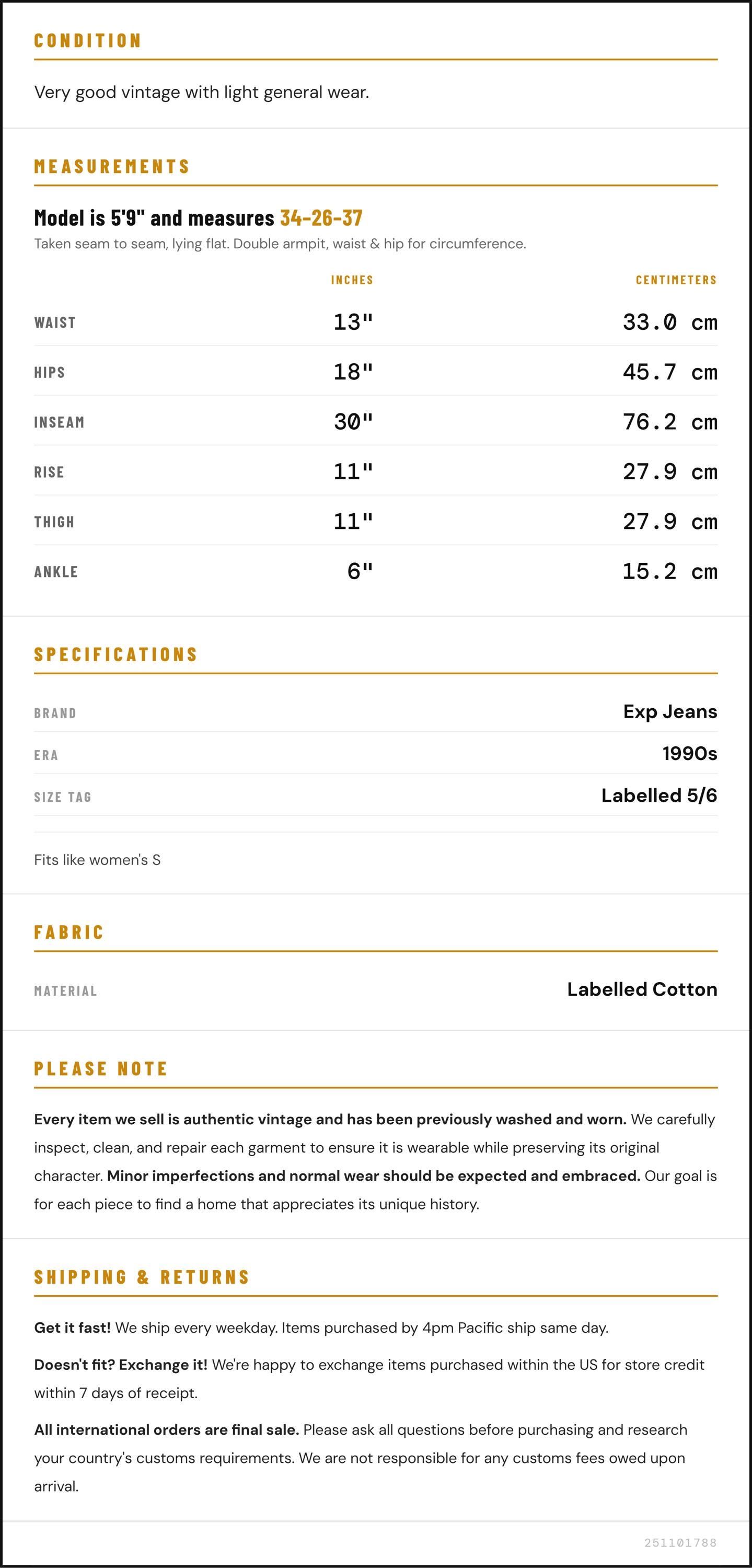 Vintage denim was usually made without any stretch, unlike modern jeans. Check the measurements to ensure proper fit, and remember to give yourself a little wiggle room in the waist and hips, depending on your preferred fit.