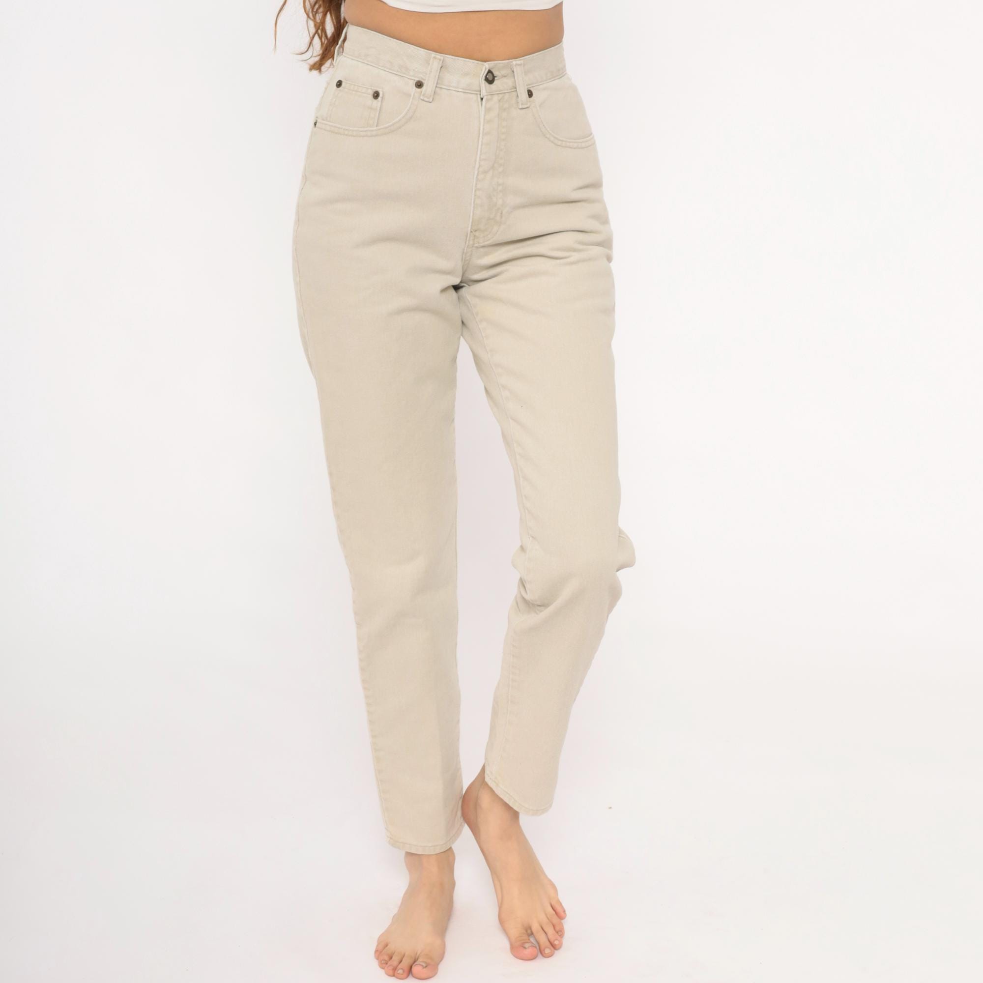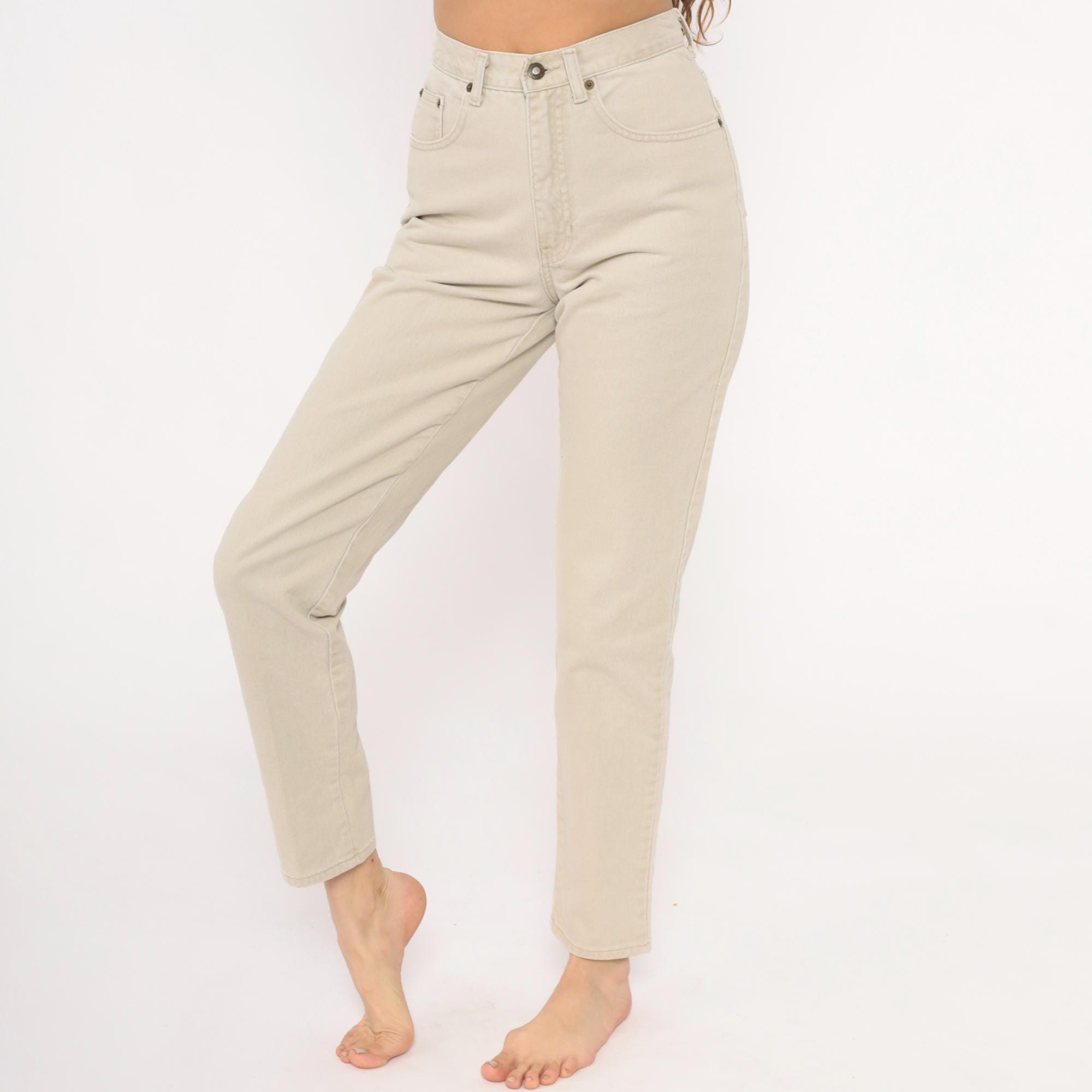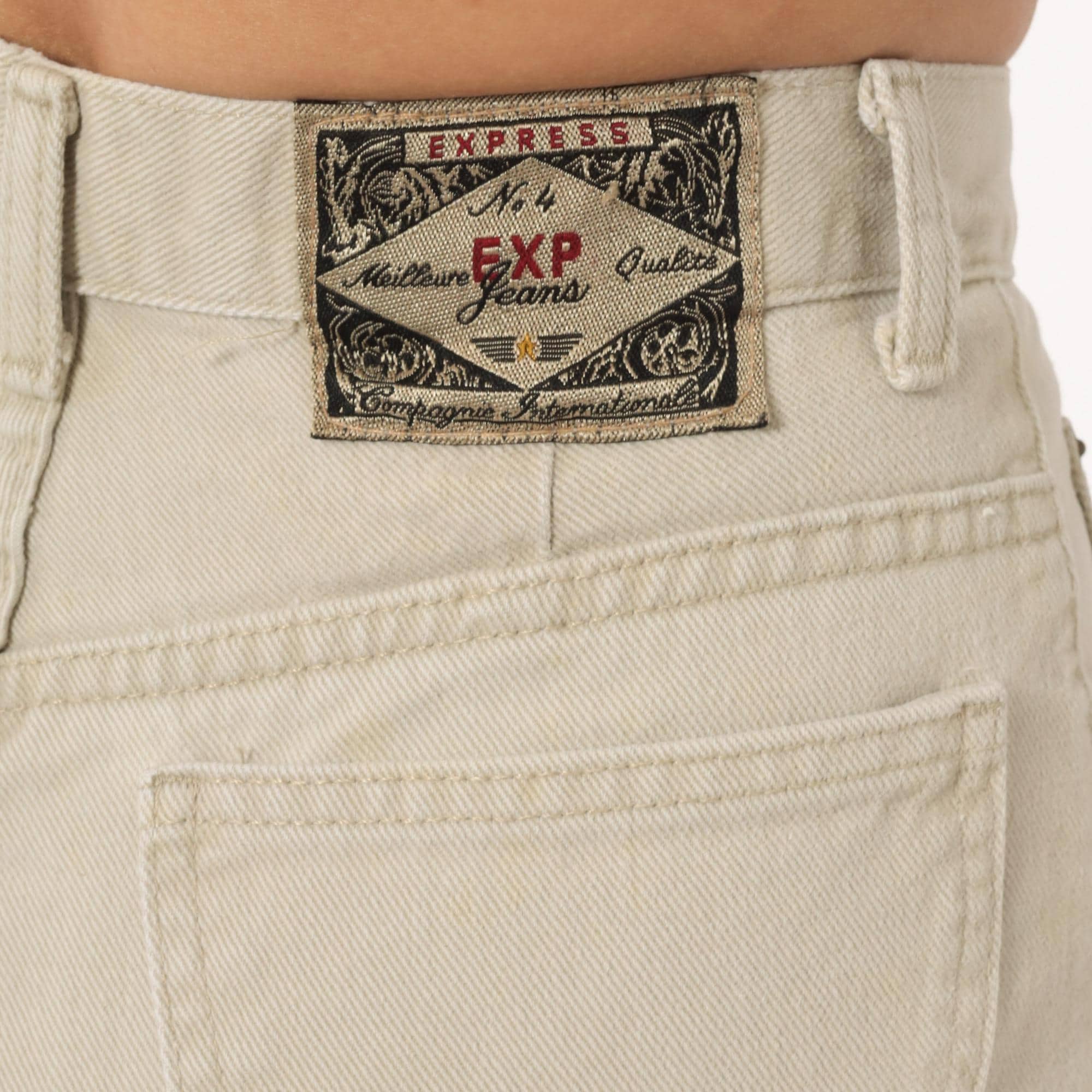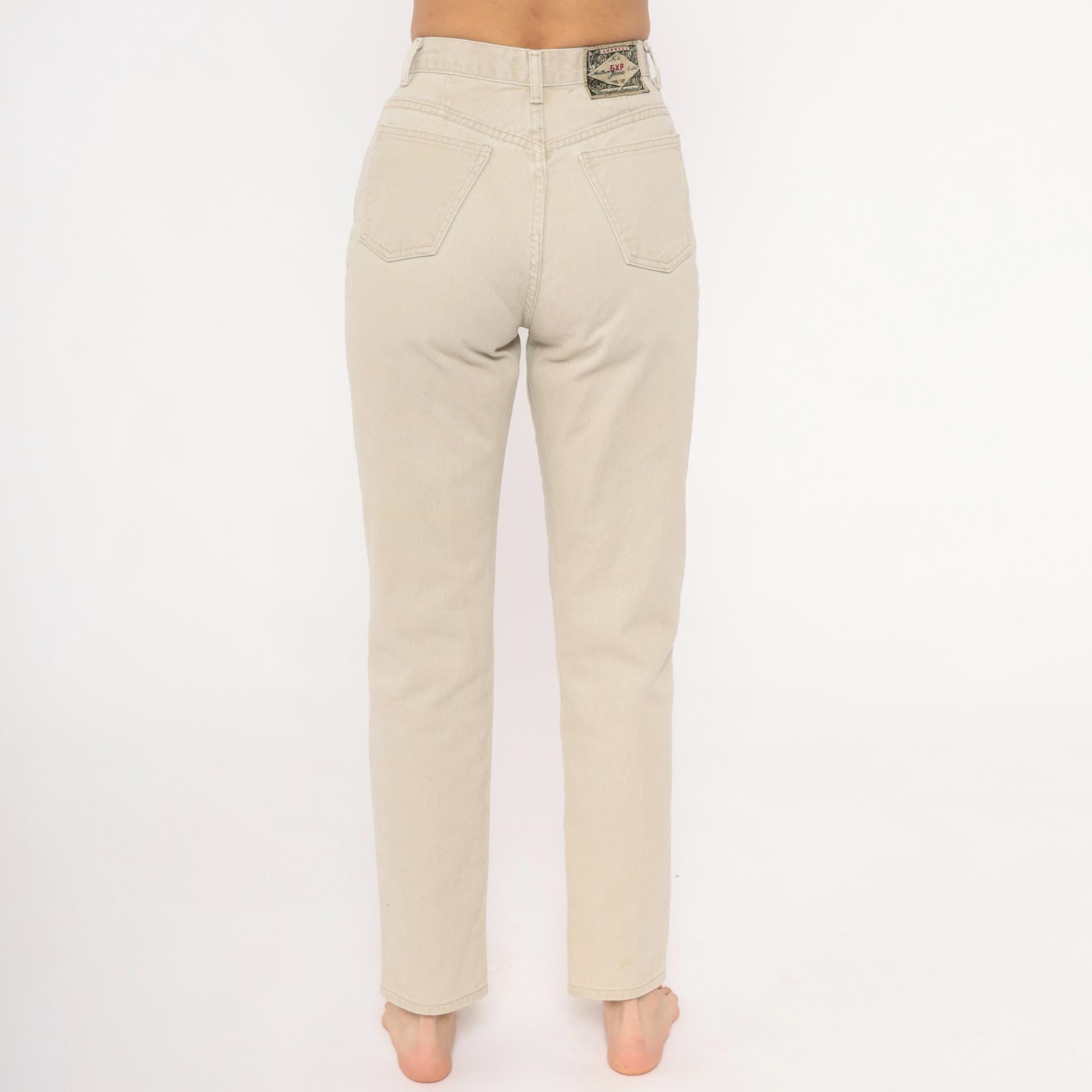 90s high-waisted jeans from Exp Jeans in a cream beige cotton denim with a straight tapered leg and ankle-length cut. Five-pocket construction with front zipper and button closure, bronze-tone rivet details, and a back waistband brand patch. Natural sand tone throughout with tonal stitching.