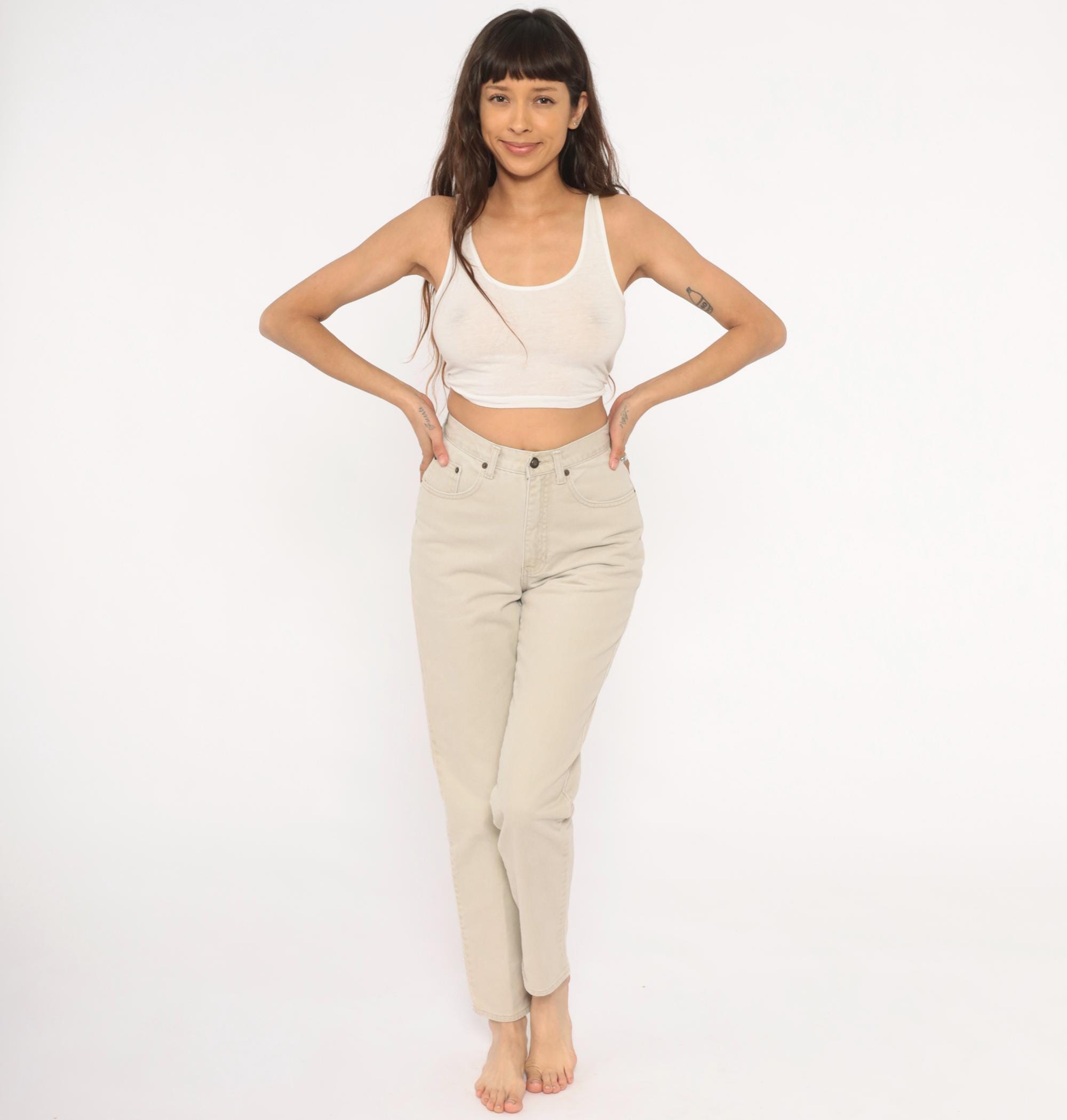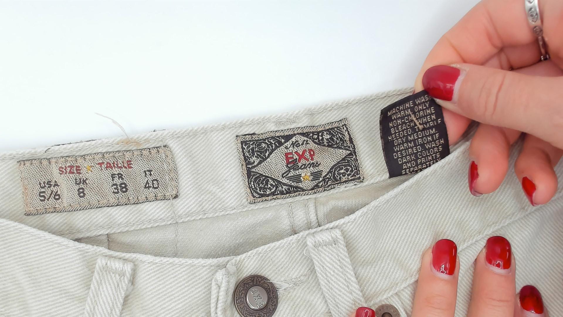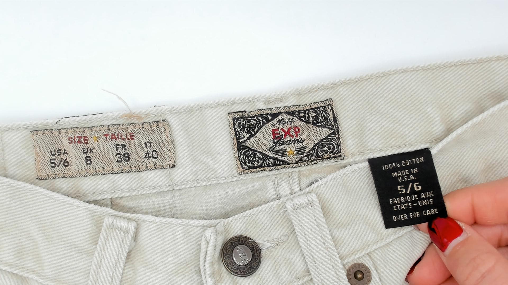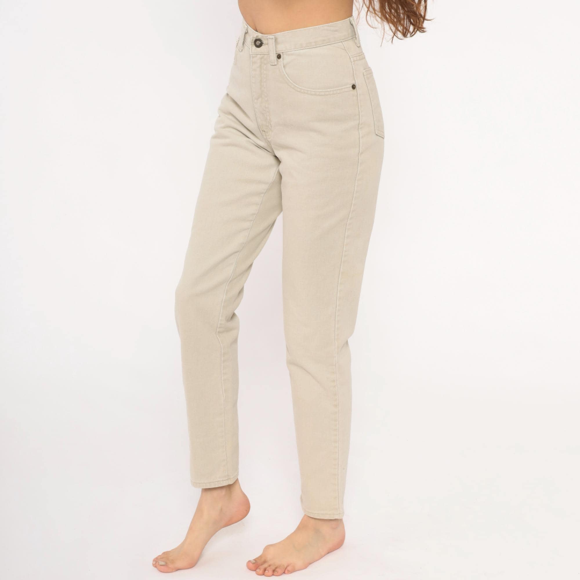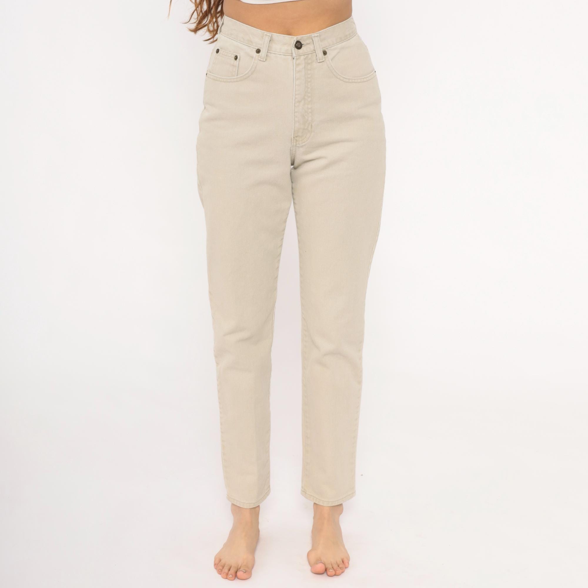 90s high-waisted jeans from Exp Jeans in a cream beige cotton denim with a straight tapered leg and ankle-length cut. Five-pocket construction with front zipper and button closure, bronze-tone rivet details, and a back waistband brand patch. Natural sand tone throughout with tonal stitching.
