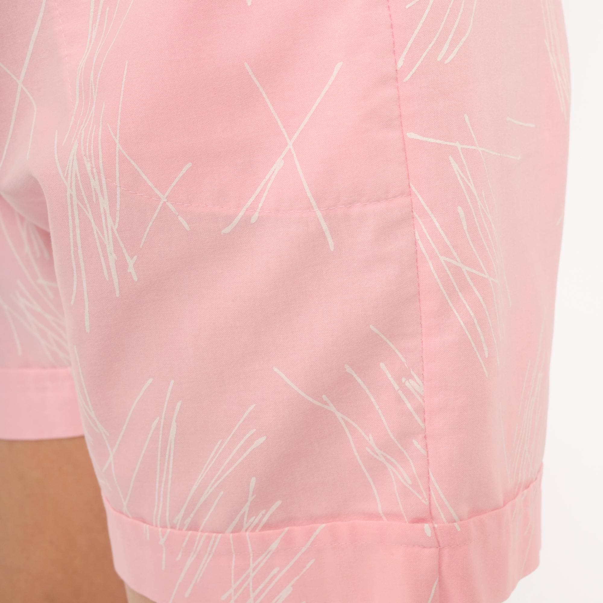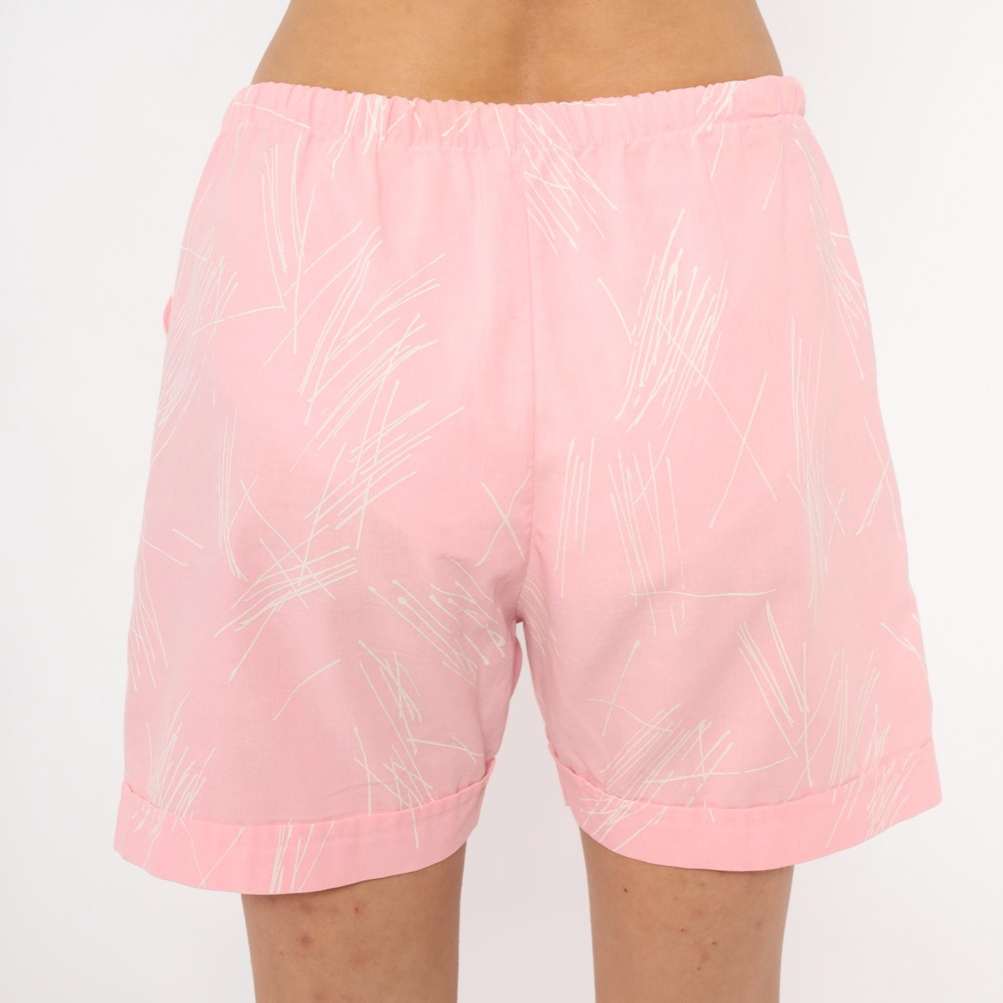 90s pink shorts with an allover white abstract scribble line print on a blush background. Elastic waistband, pull-on closure, cuffed hems, and side seam pockets. Lined interior with a relaxed, straight leg silhouette.