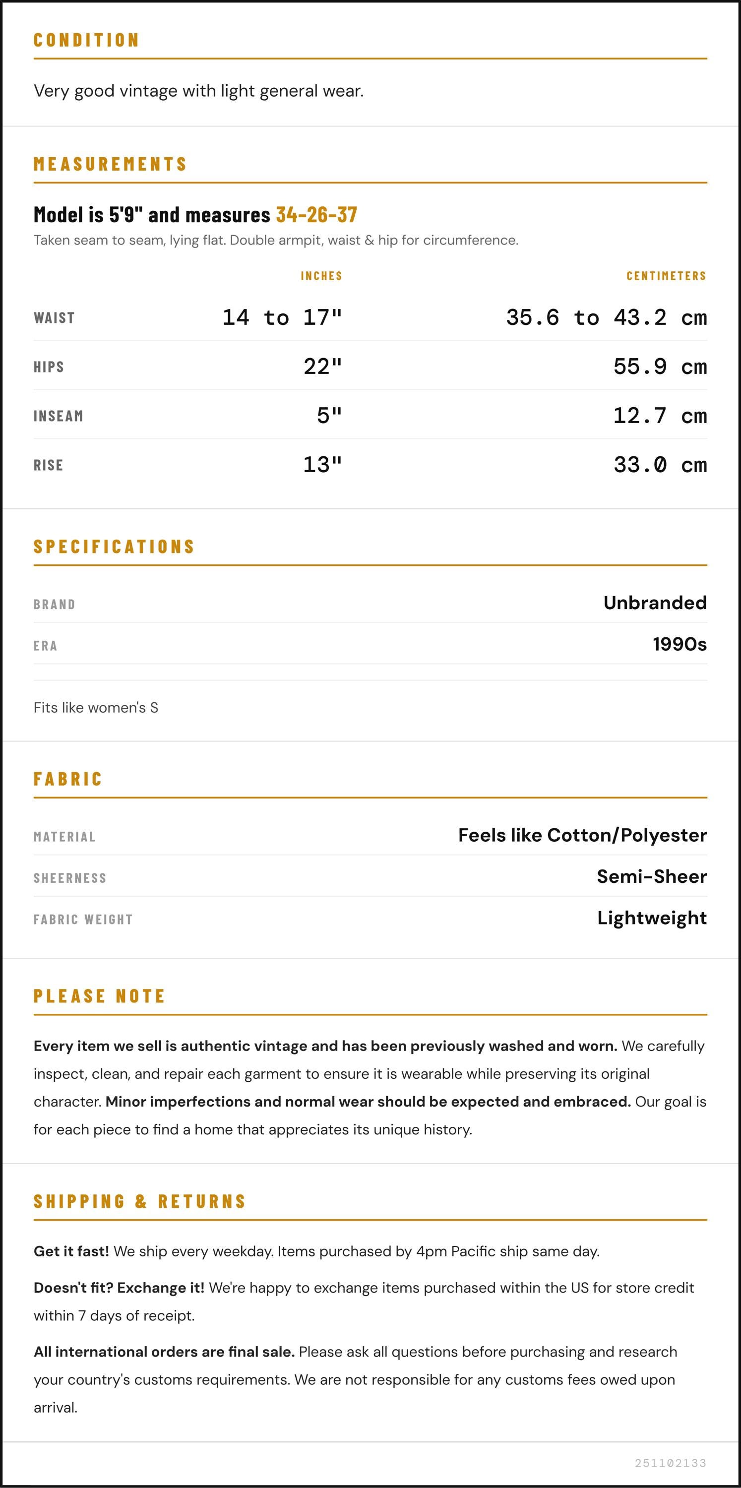 Vintage denim was usually made without any stretch, unlike modern jeans. Check the measurements to ensure proper fit, and remember to give yourself a little wiggle room in the waist and hips, depending on your preferred fit.