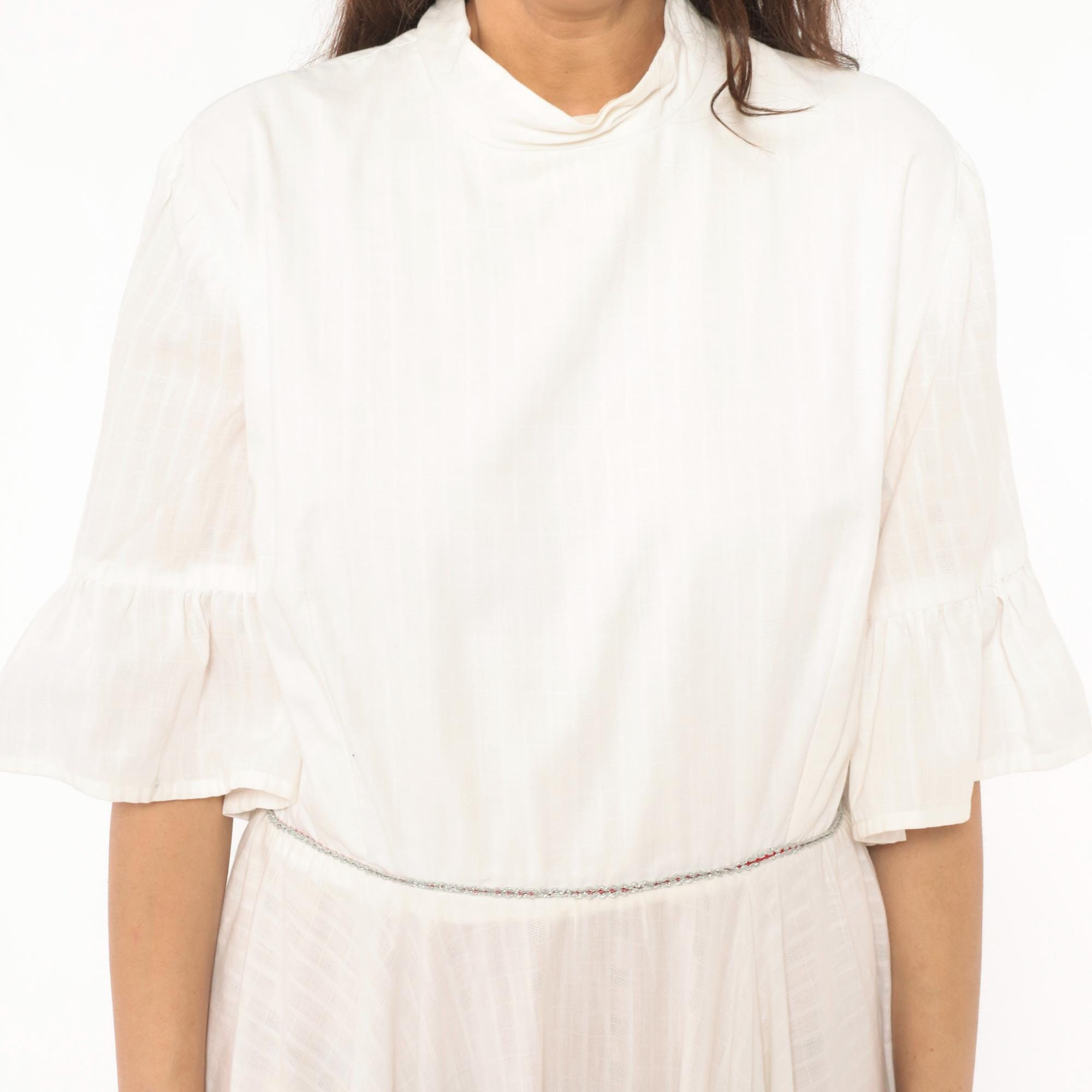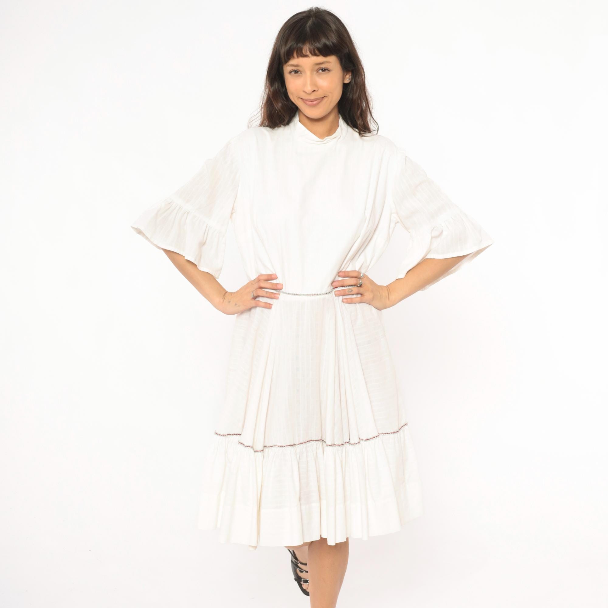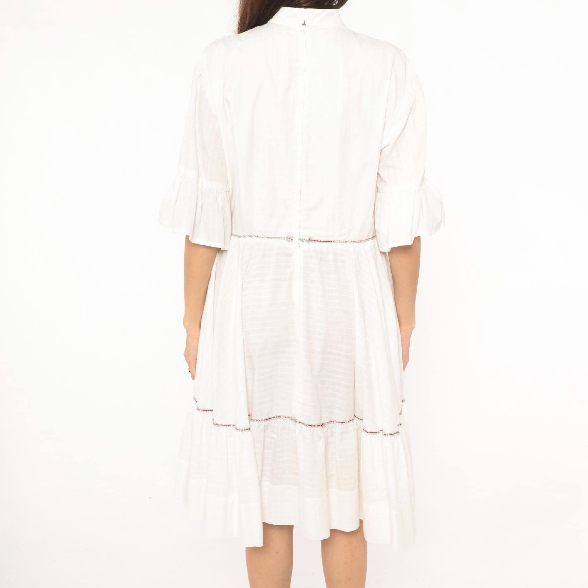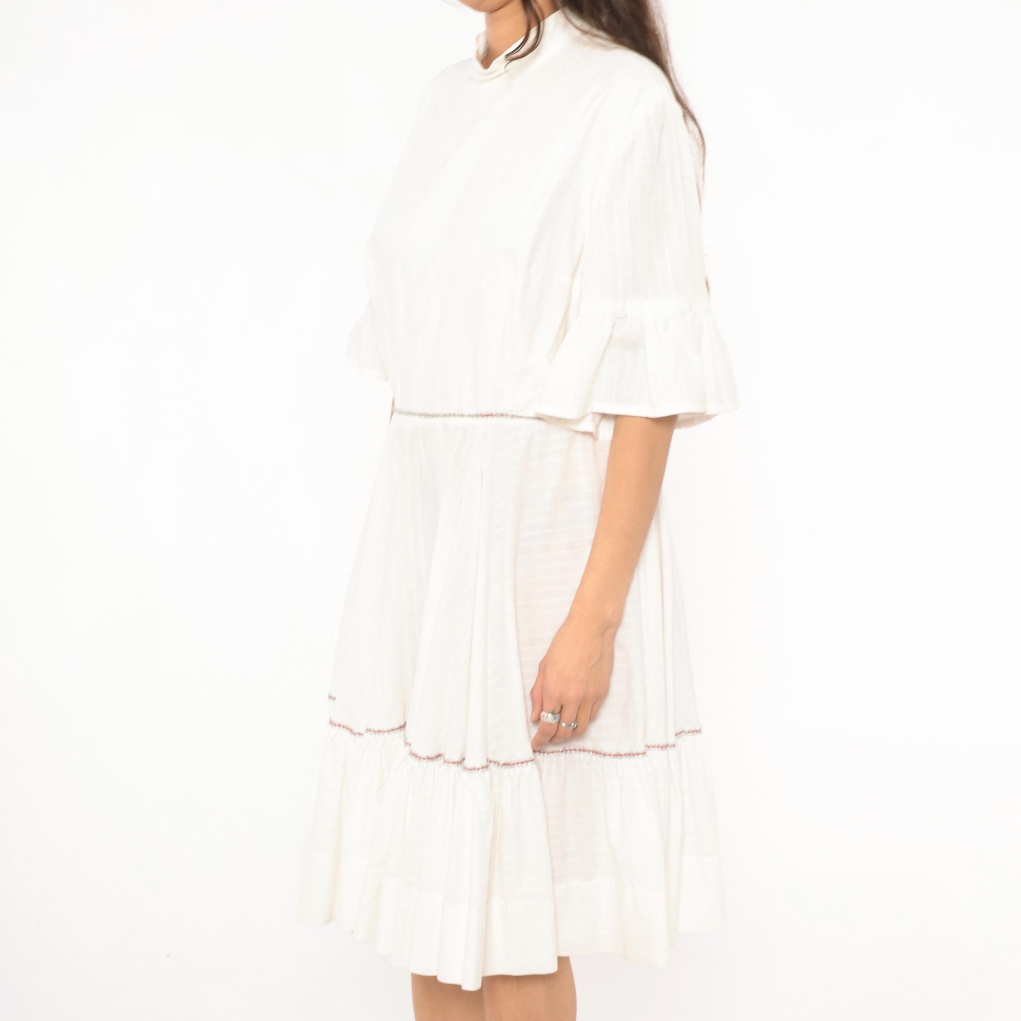 Ivory 60s dress with a mock neckline, half-length bell sleeves with ruffled cuffs, and a back zipper closure. Fitted bodice with a gathered, tiered skirt and a wide ruffle hem panel. Delicate contrast piping in a subtle multicolor braid at the waistline seam and above the lower ruffle tier.