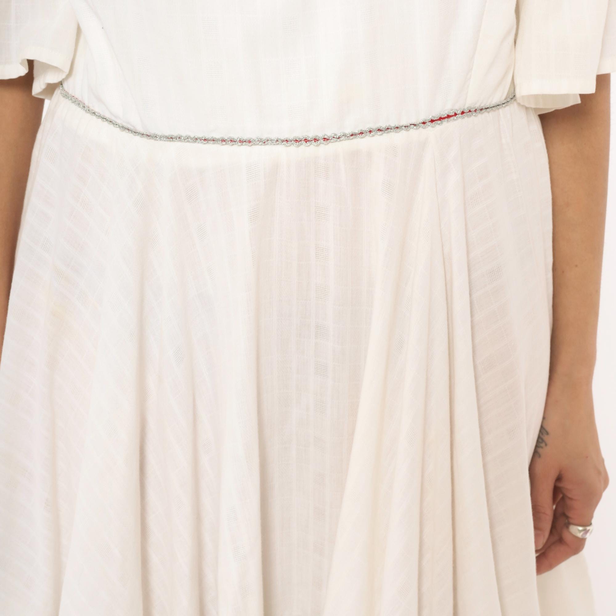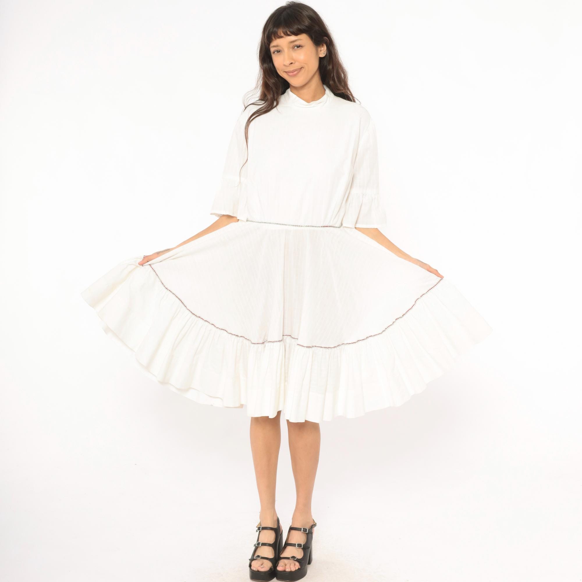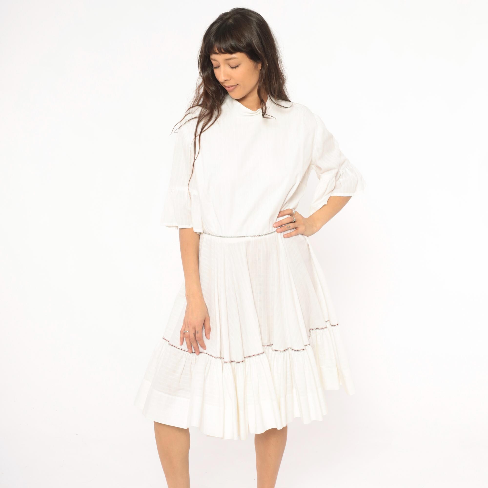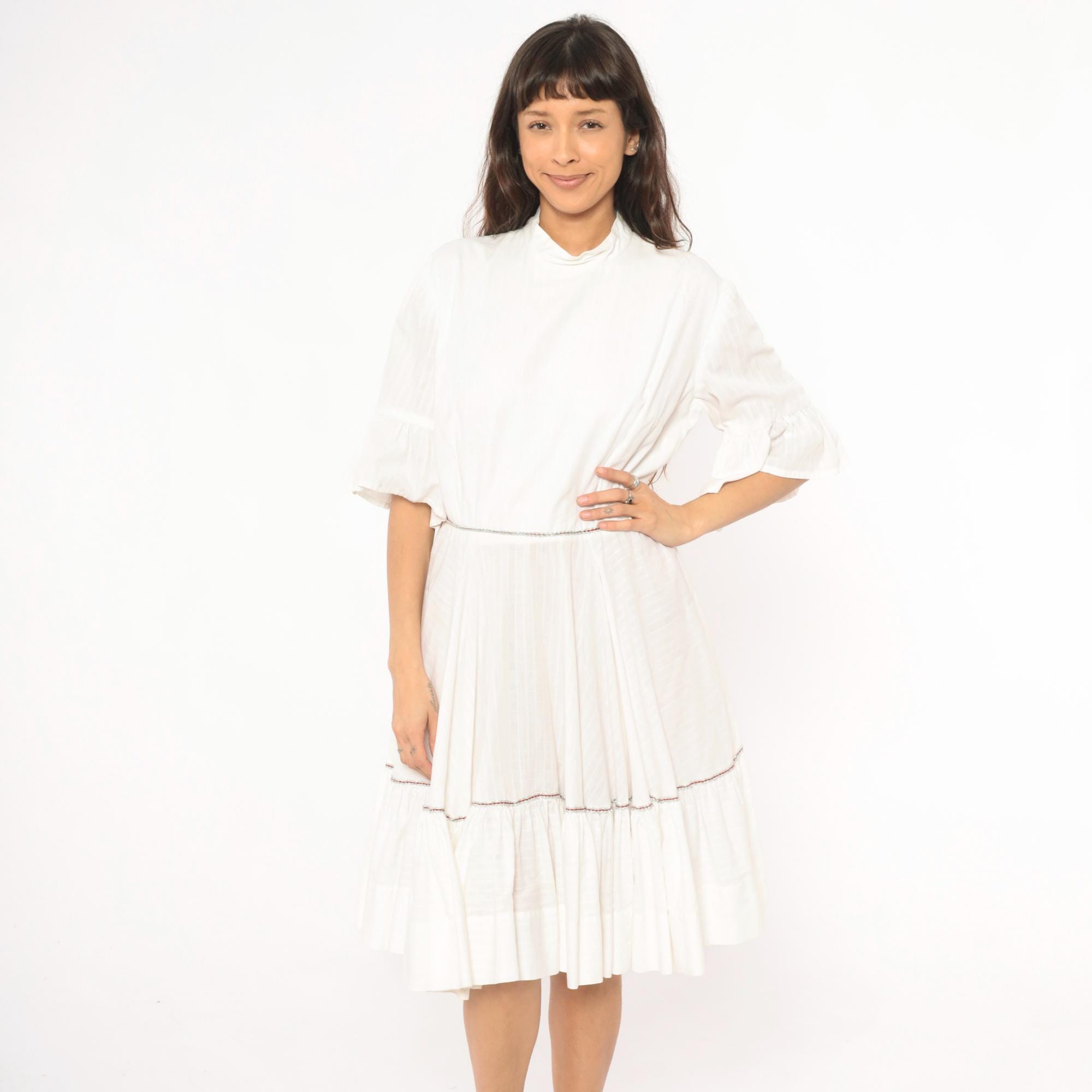 Ivory 60s dress with a mock neckline, half-length bell sleeves with ruffled cuffs, and a back zipper closure. Fitted bodice with a gathered, tiered skirt and a wide ruffle hem panel. Delicate contrast piping in a subtle multicolor braid at the waistline seam and above the lower ruffle tier.