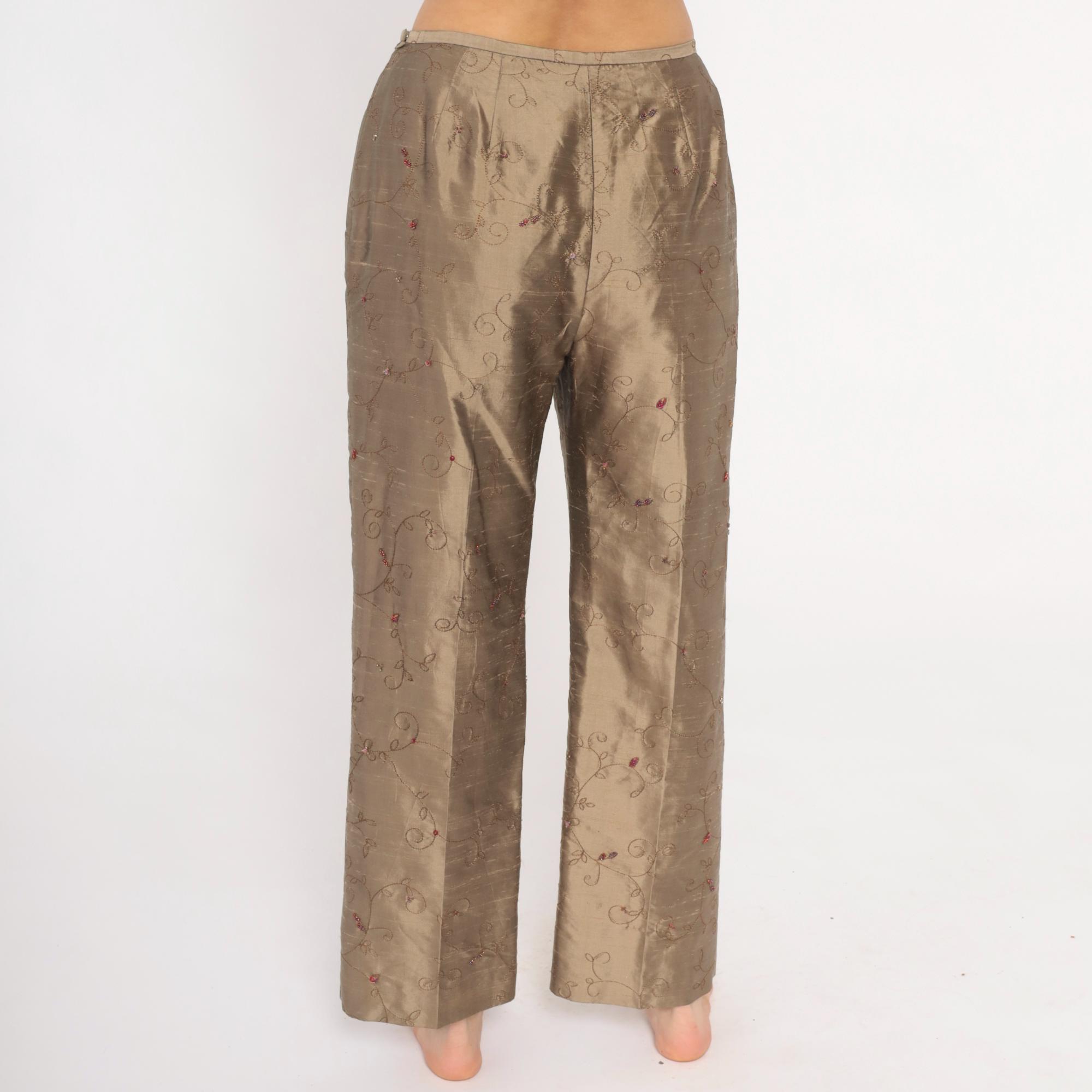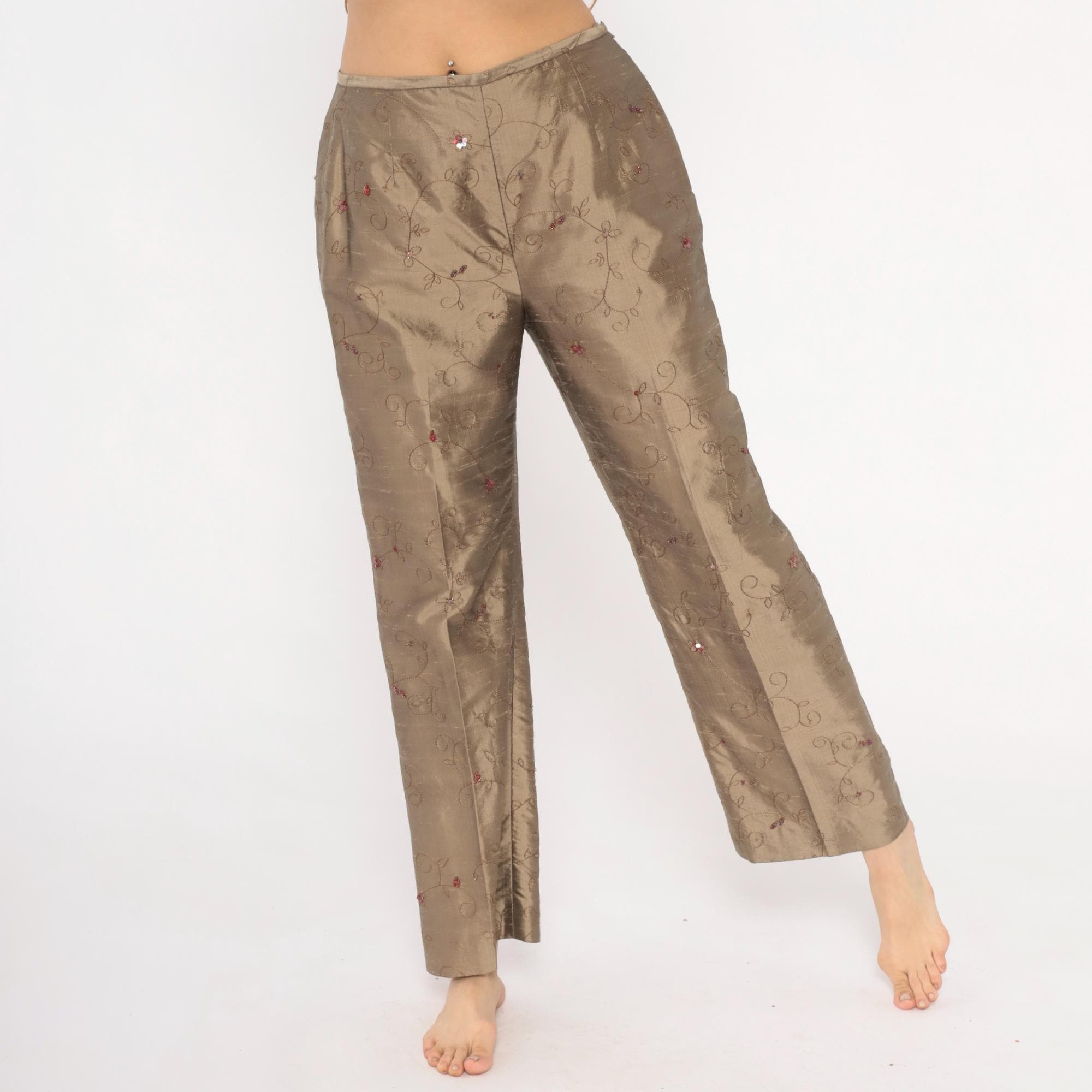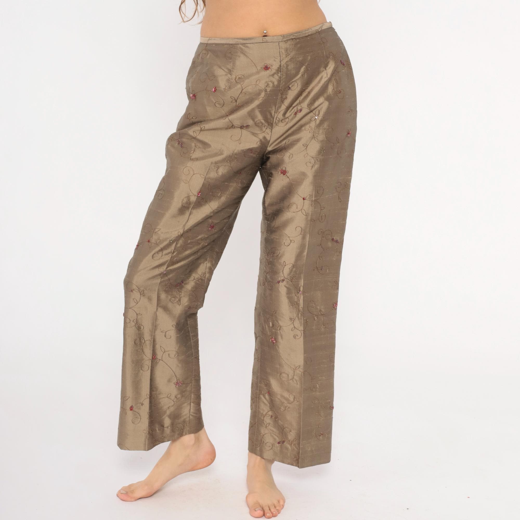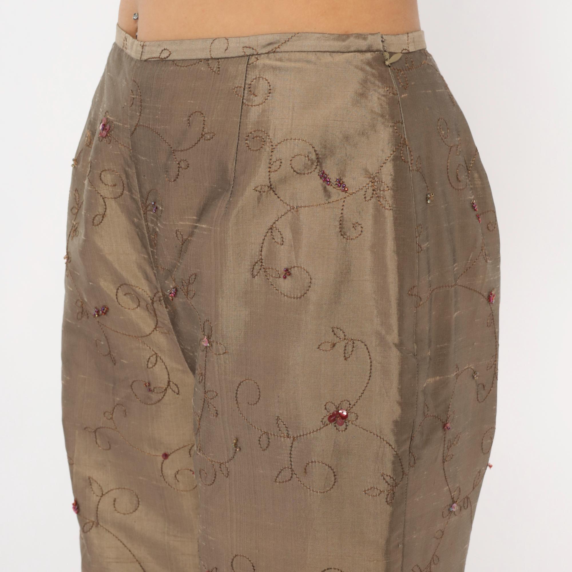 2000s low rise silk trousers from Depeche Mode in a tan-gold tone with allover tonal embroidered vine and leaf pattern. Small beaded accents in pink, red, and amber are scattered along the embroidered vines. Straight leg cut with a side zipper closure and no pockets. Flat front with a smooth waistband.