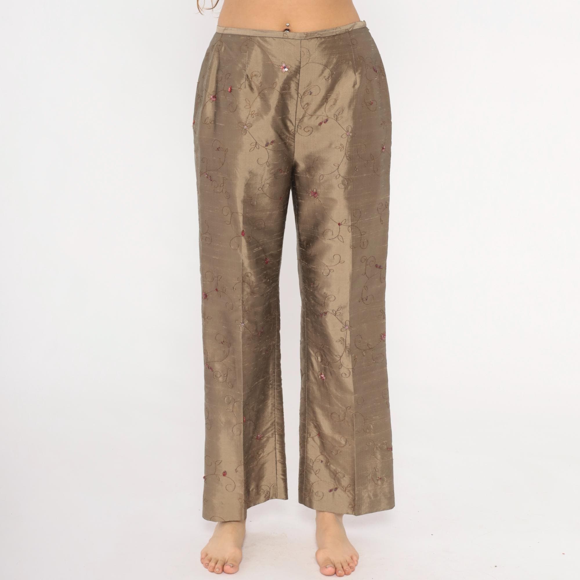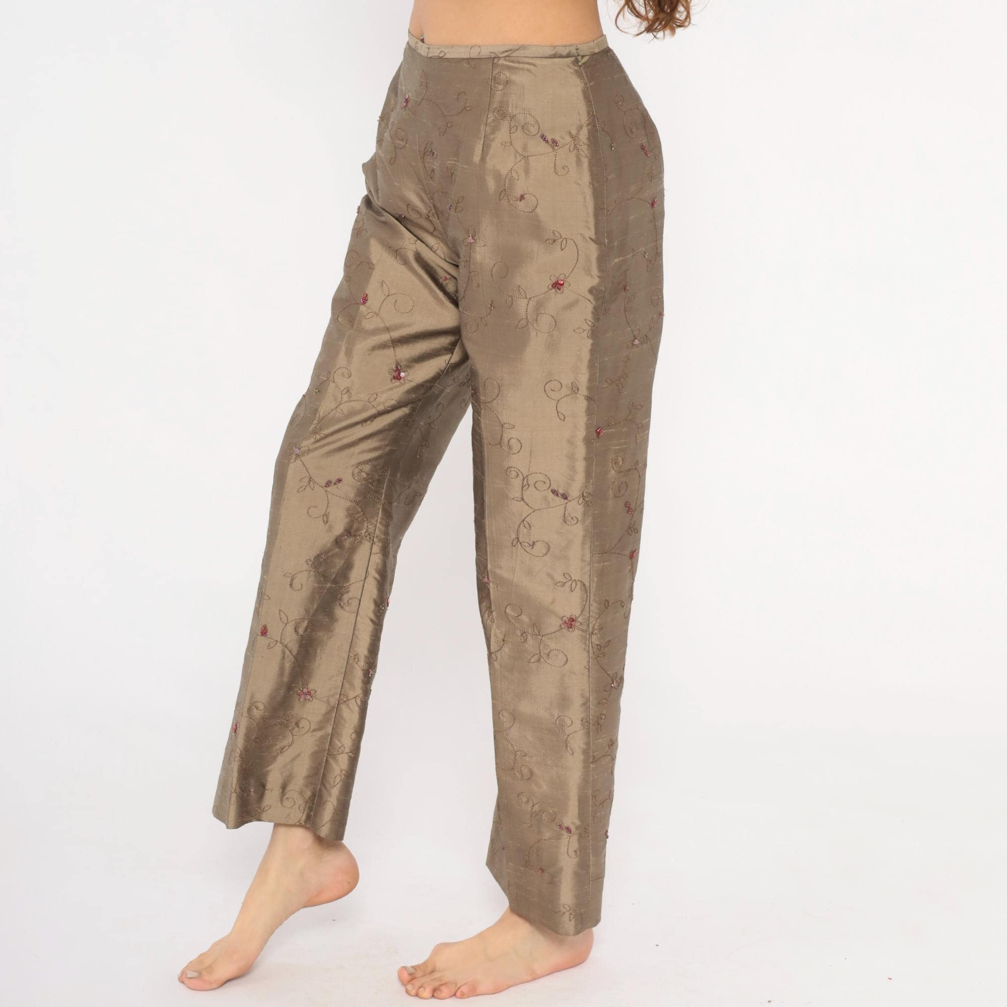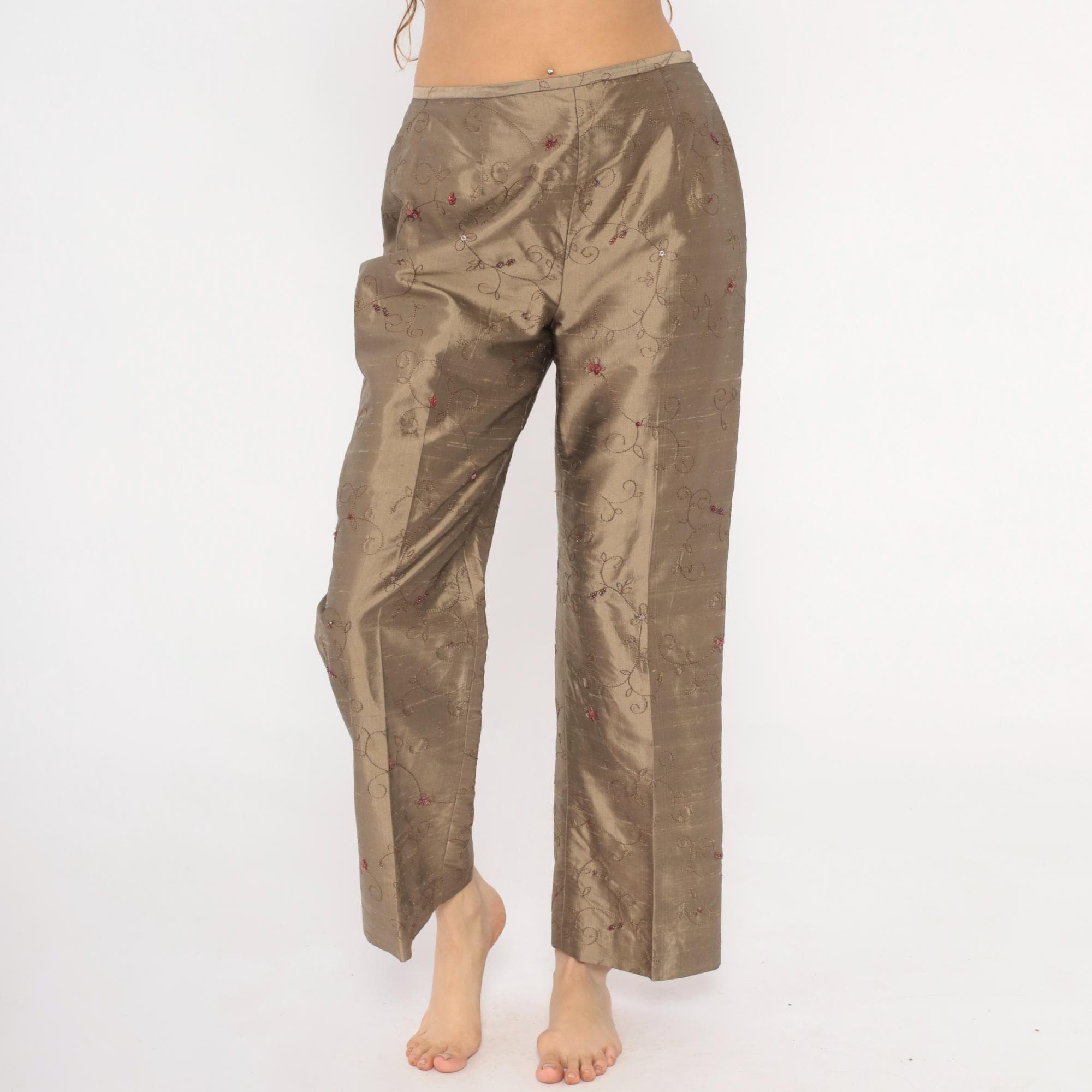 2000s low rise silk trousers from Depeche Mode in a tan-gold tone with allover tonal embroidered vine and leaf pattern. Small beaded accents in pink, red, and amber are scattered along the embroidered vines. Straight leg cut with a side zipper closure and no pockets. Flat front with a smooth waistband.