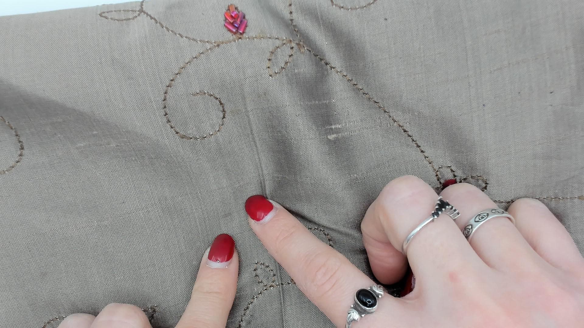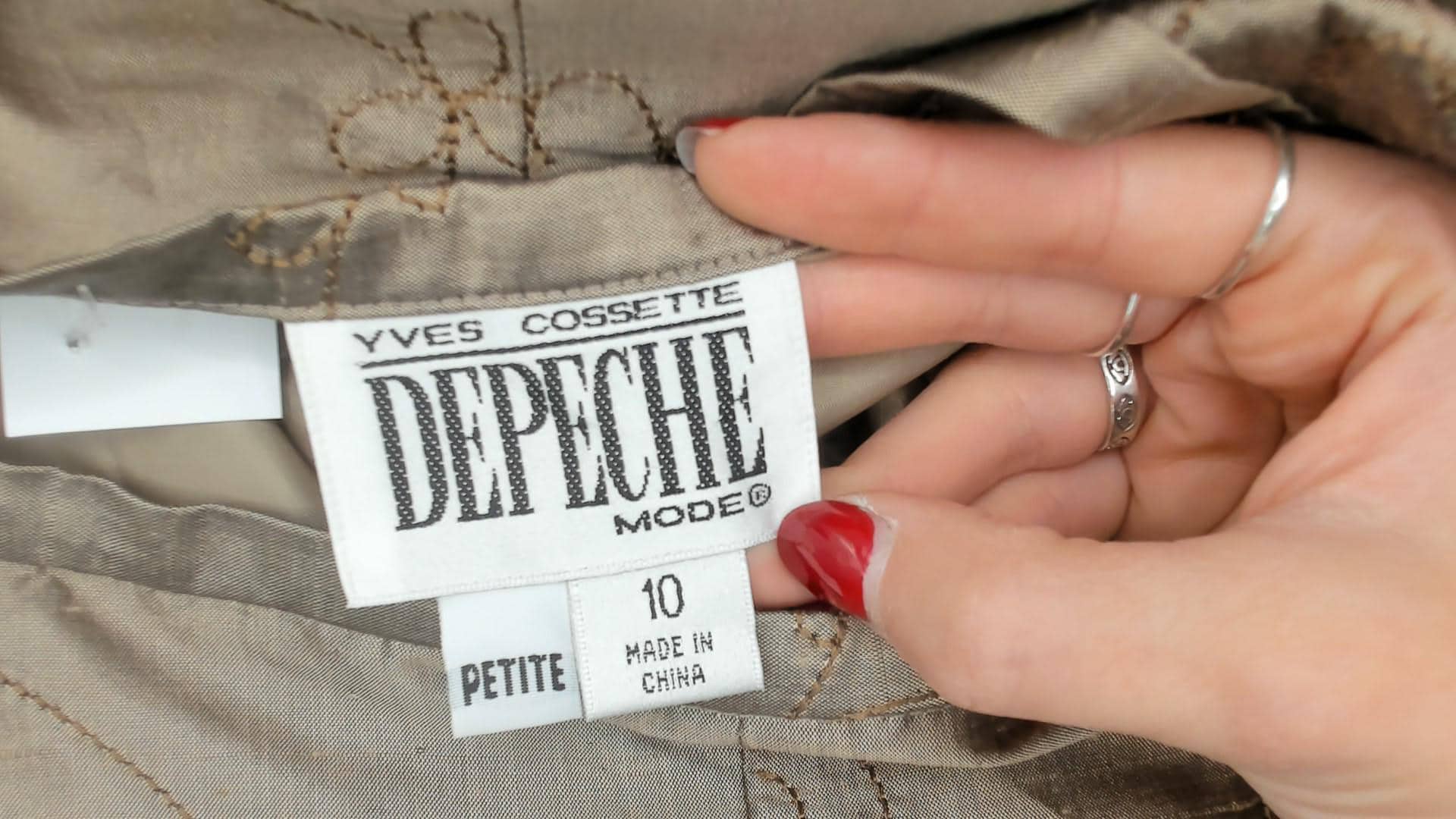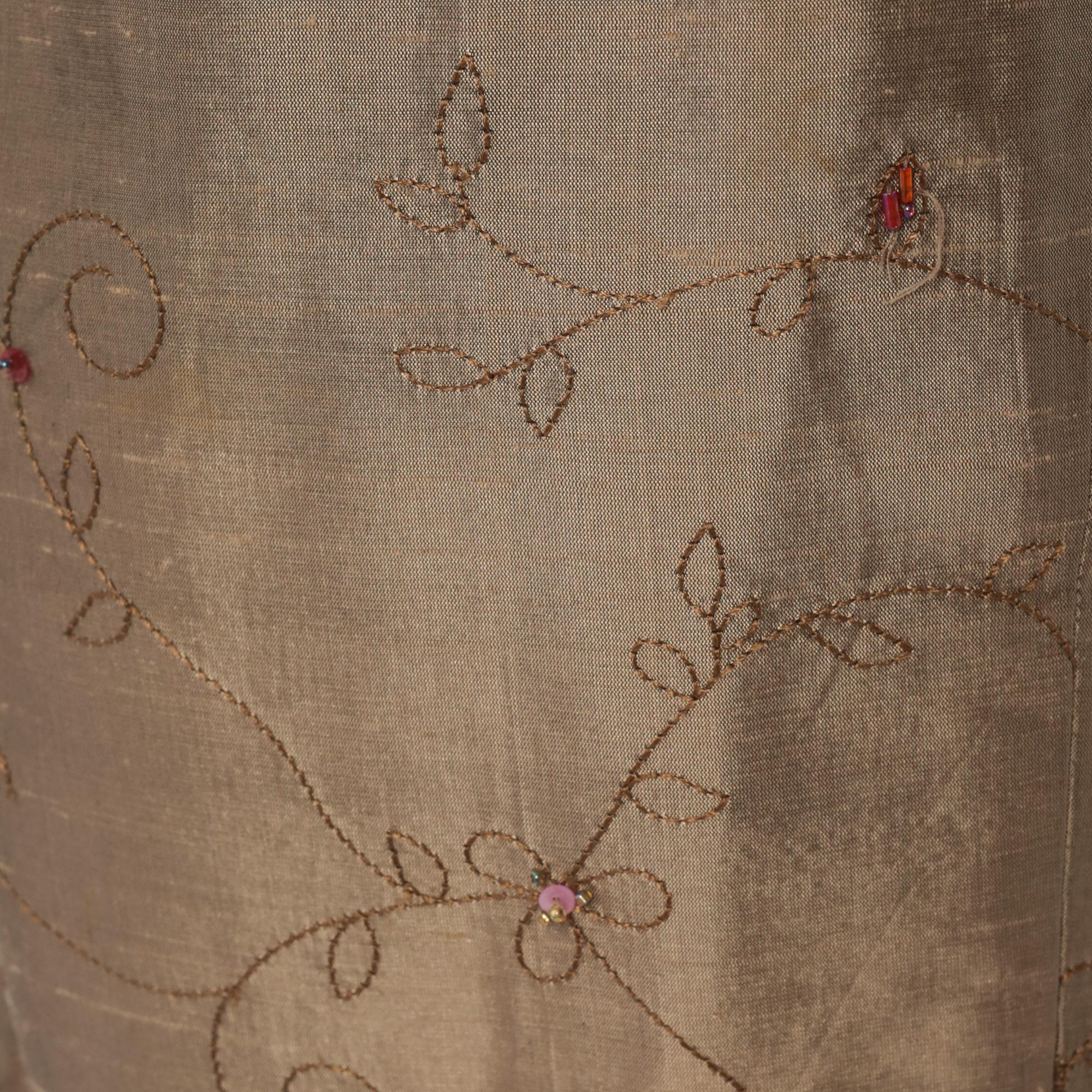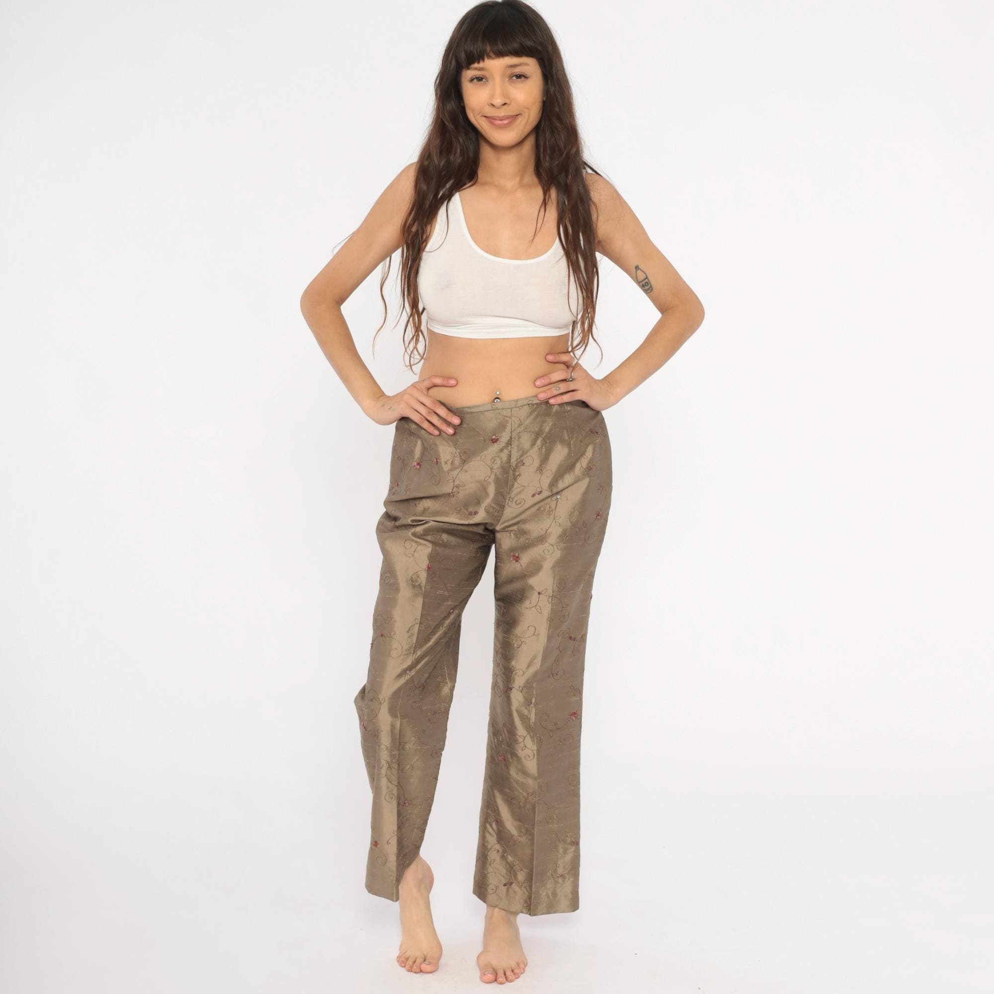 2000s low rise silk trousers from Depeche Mode in a tan-gold tone with allover tonal embroidered vine and leaf pattern. Small beaded accents in pink, red, and amber are scattered along the embroidered vines. Straight leg cut with a side zipper closure and no pockets. Flat front with a smooth waistband.