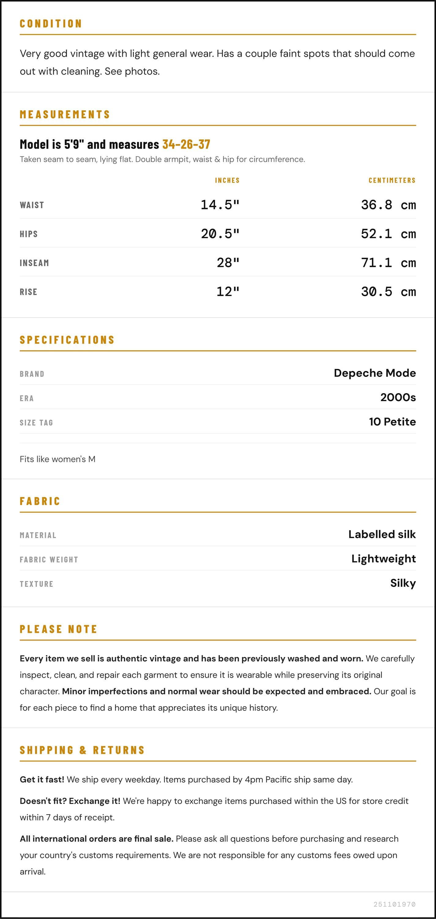 Vintage denim was usually made without any stretch, unlike modern jeans. Check the measurements to ensure proper fit, and remember to give yourself a little wiggle room in the waist and hips, depending on your preferred fit.