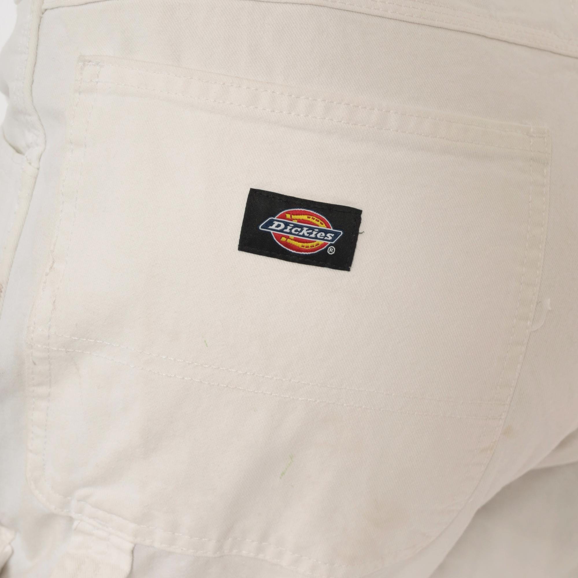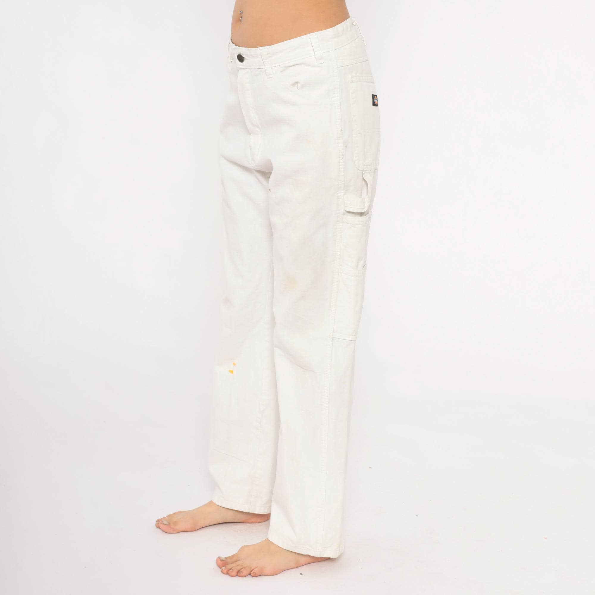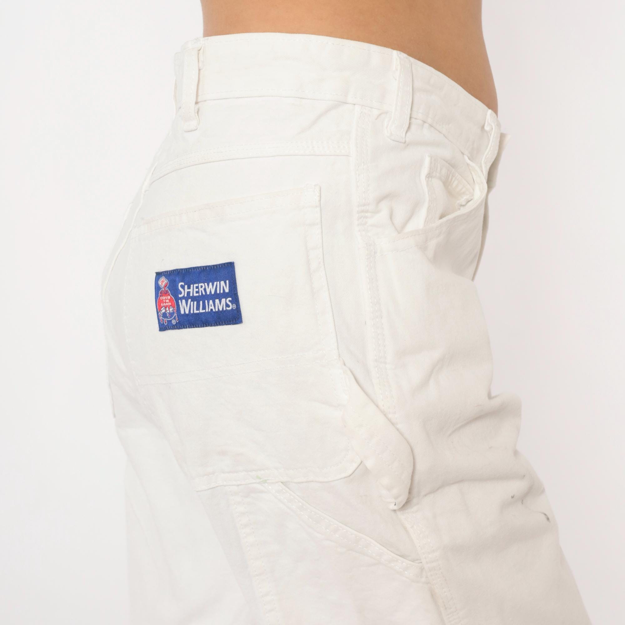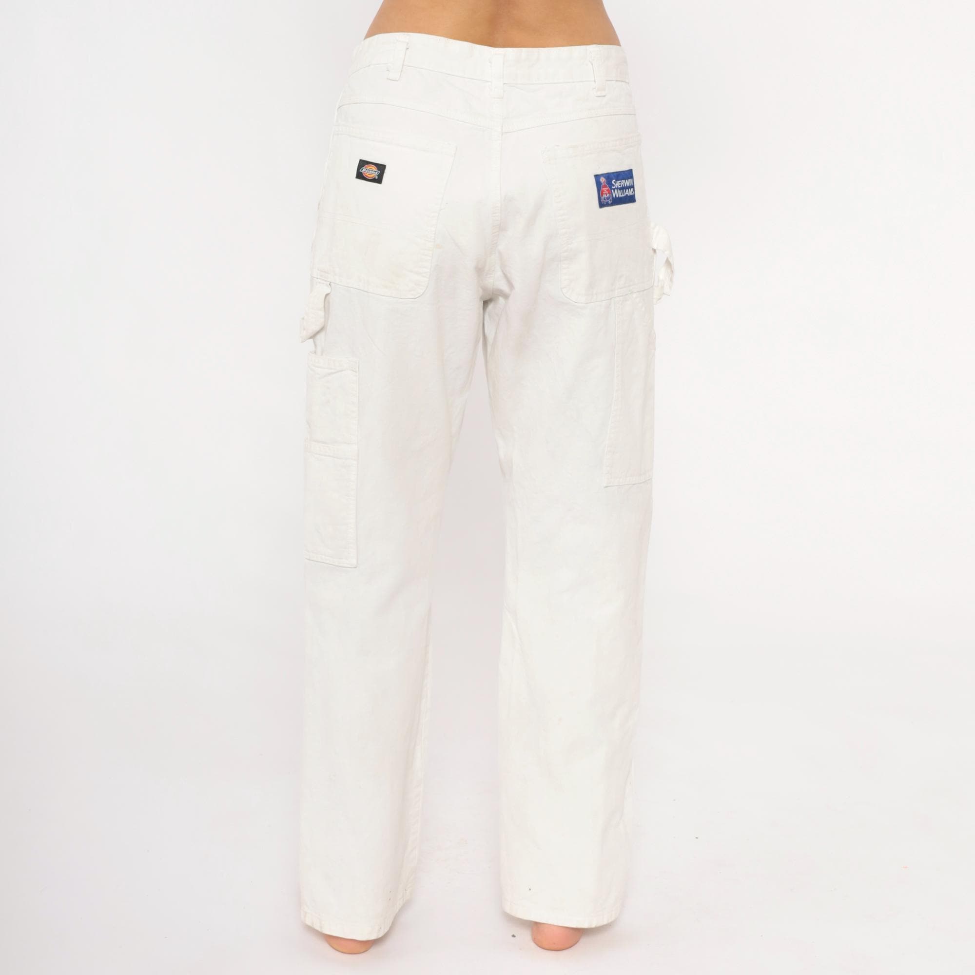 White Dickies carpenter pants from the 2000s with a Sherwin Williams patch on the back left pocket. Straight leg cut with front zipper and button closure, side seam pockets, and cargo-style flap pockets on both outer thighs. A hammer loop sits on the right hip, and scattered paint marks in yellow and tan across the legs add authentic workwear character. Double-knee reinforcement panels on both legs.