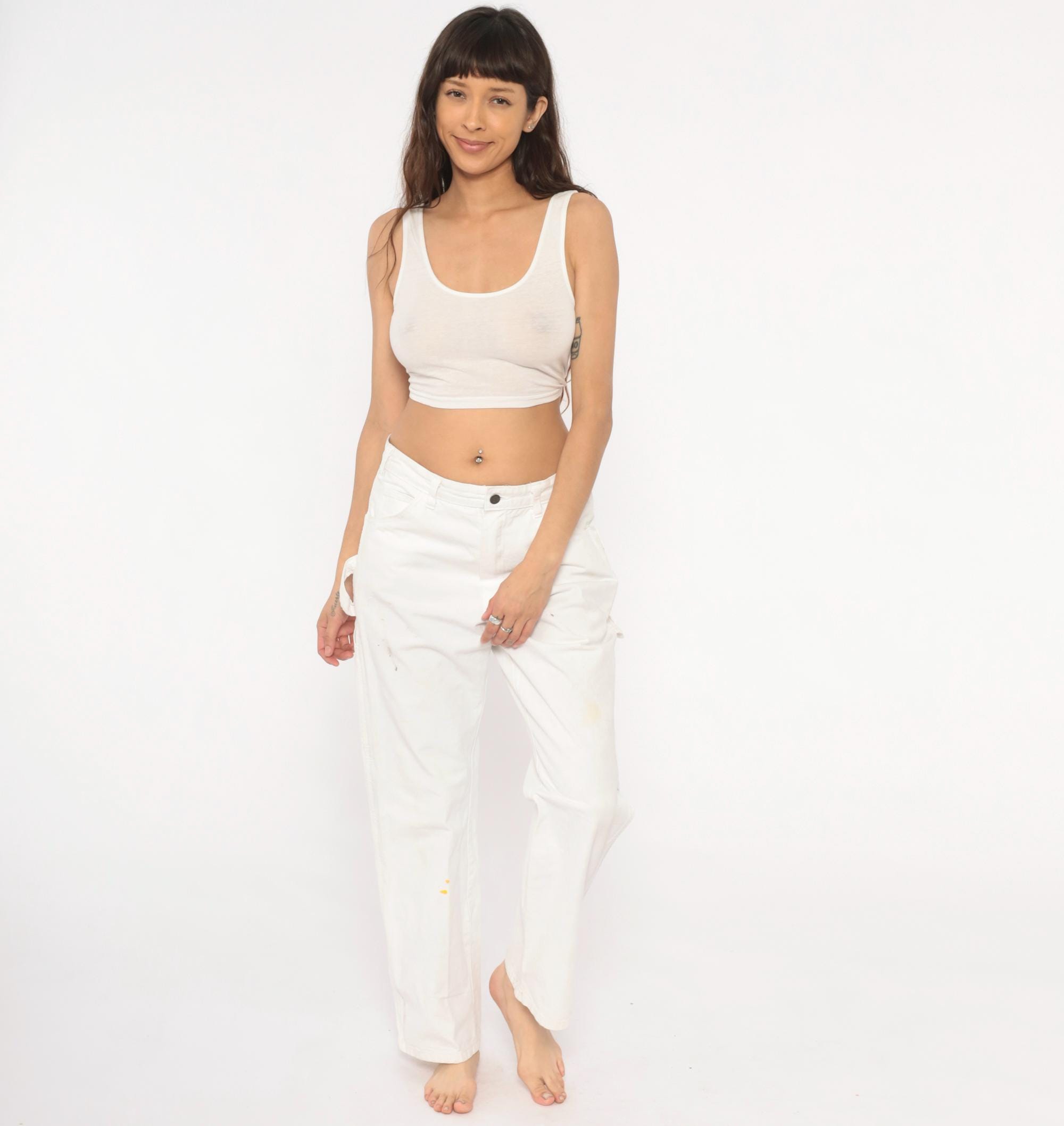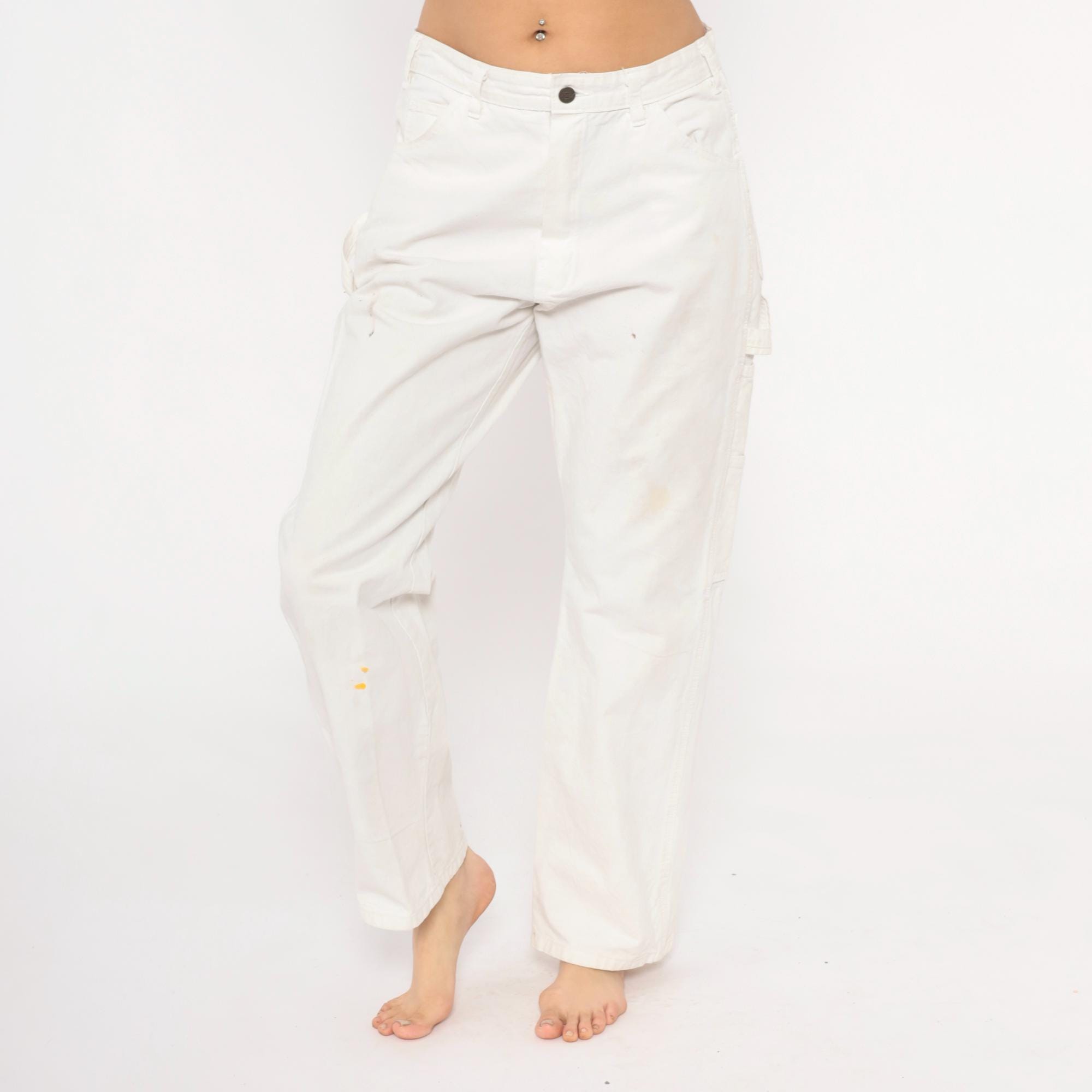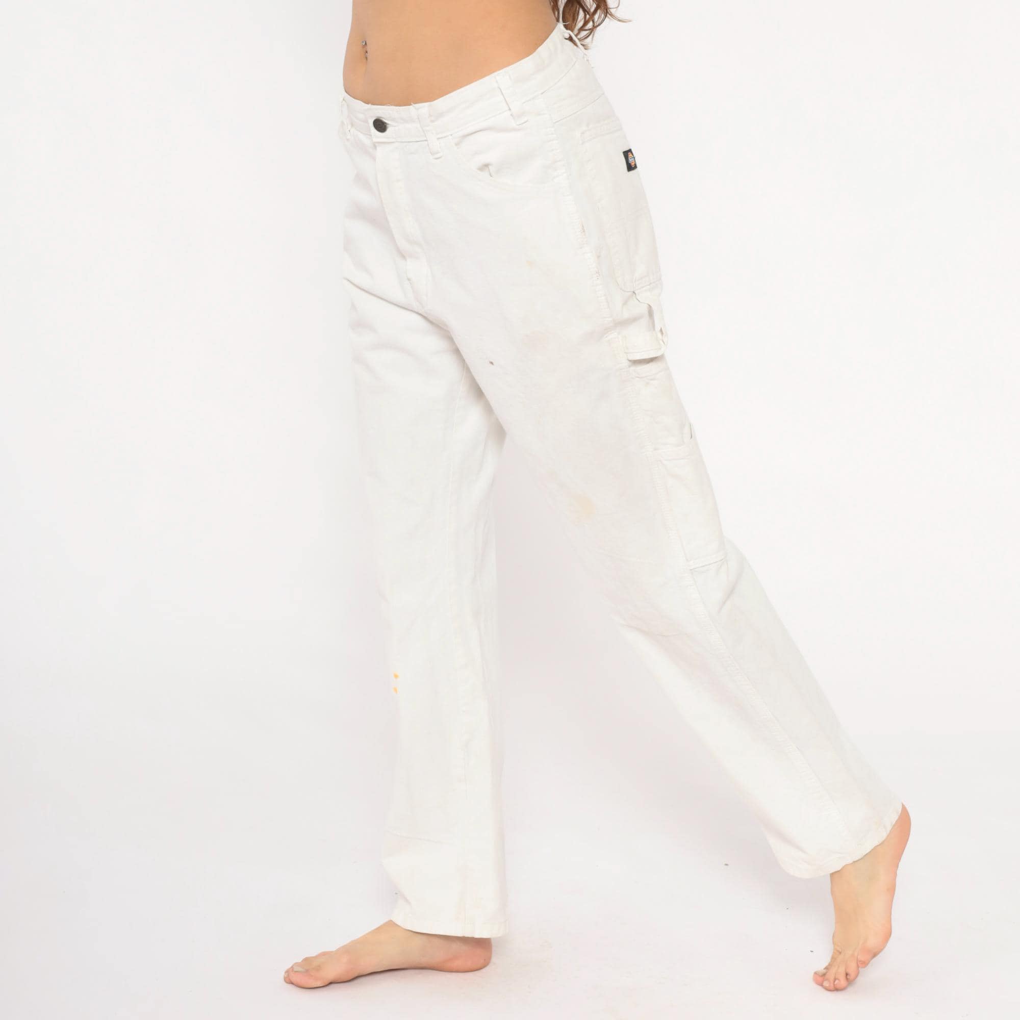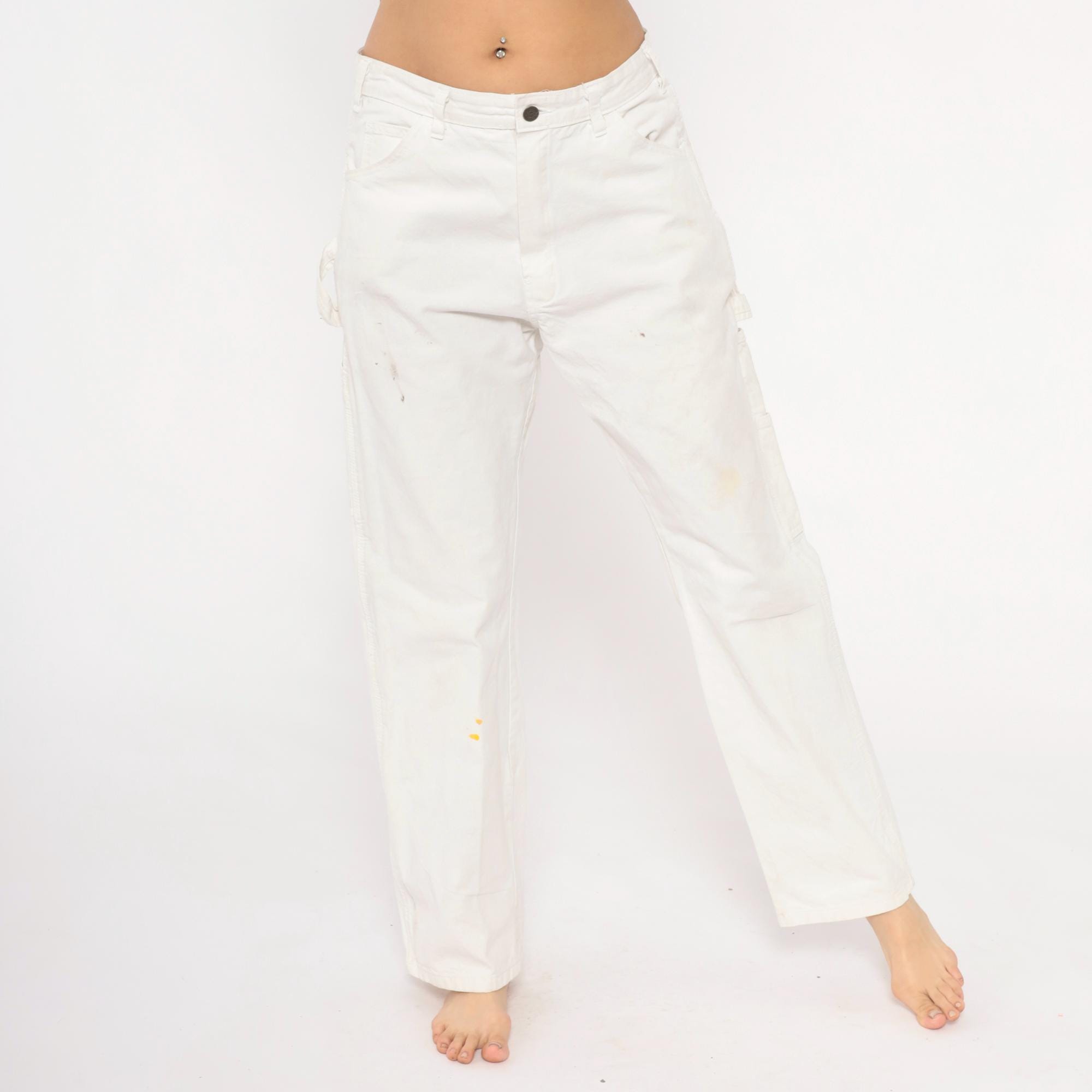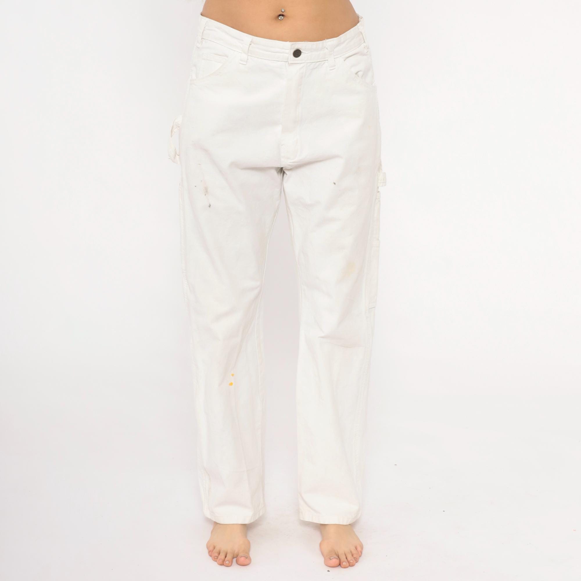 White Dickies carpenter pants from the 2000s with a Sherwin Williams patch on the back left pocket. Straight leg cut with front zipper and button closure, side seam pockets, and cargo-style flap pockets on both outer thighs. A hammer loop sits on the right hip, and scattered paint marks in yellow and tan across the legs add authentic workwear character. Double-knee reinforcement panels on both legs.