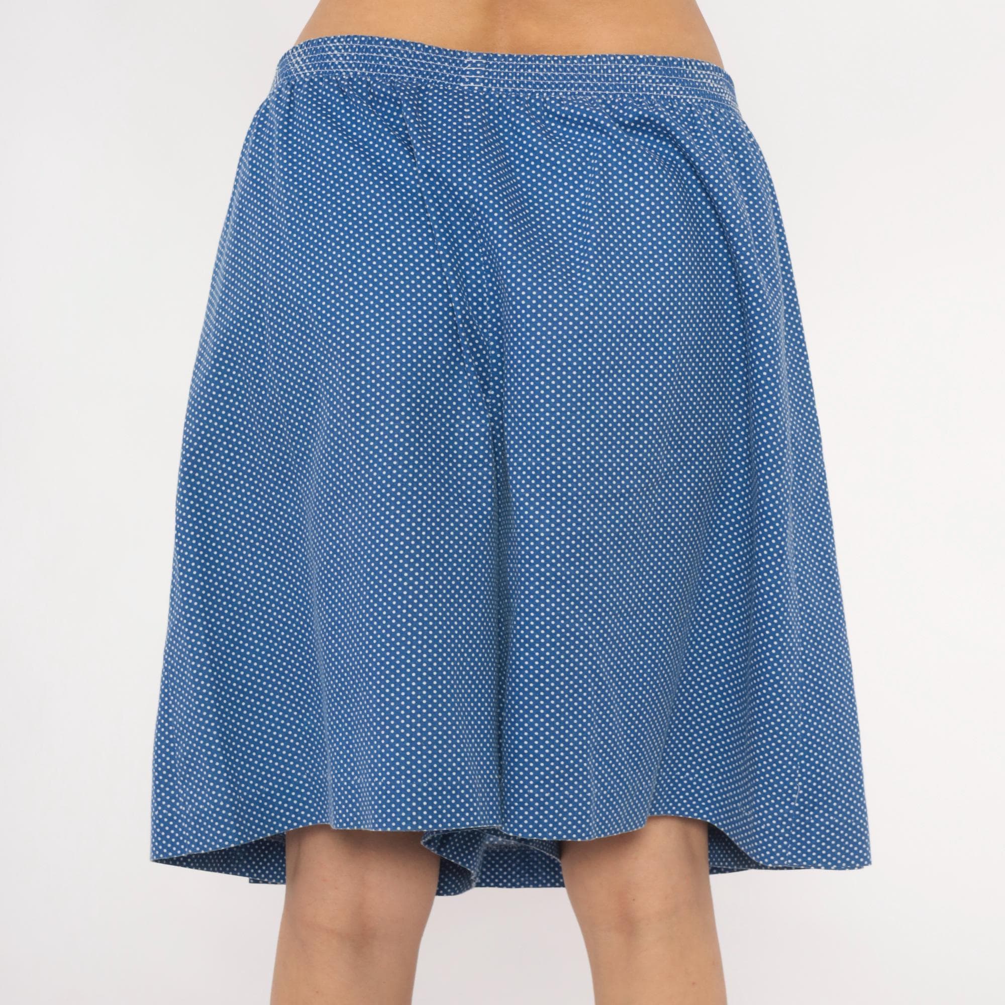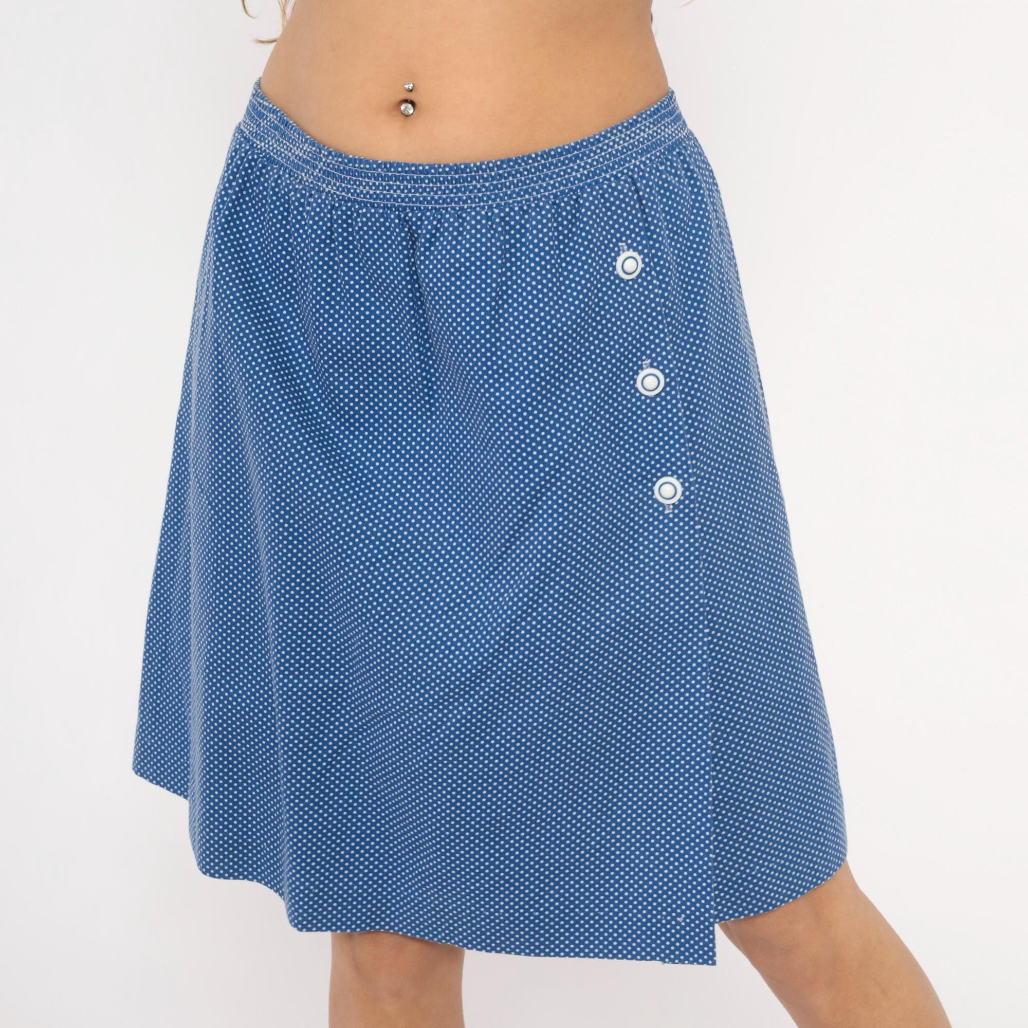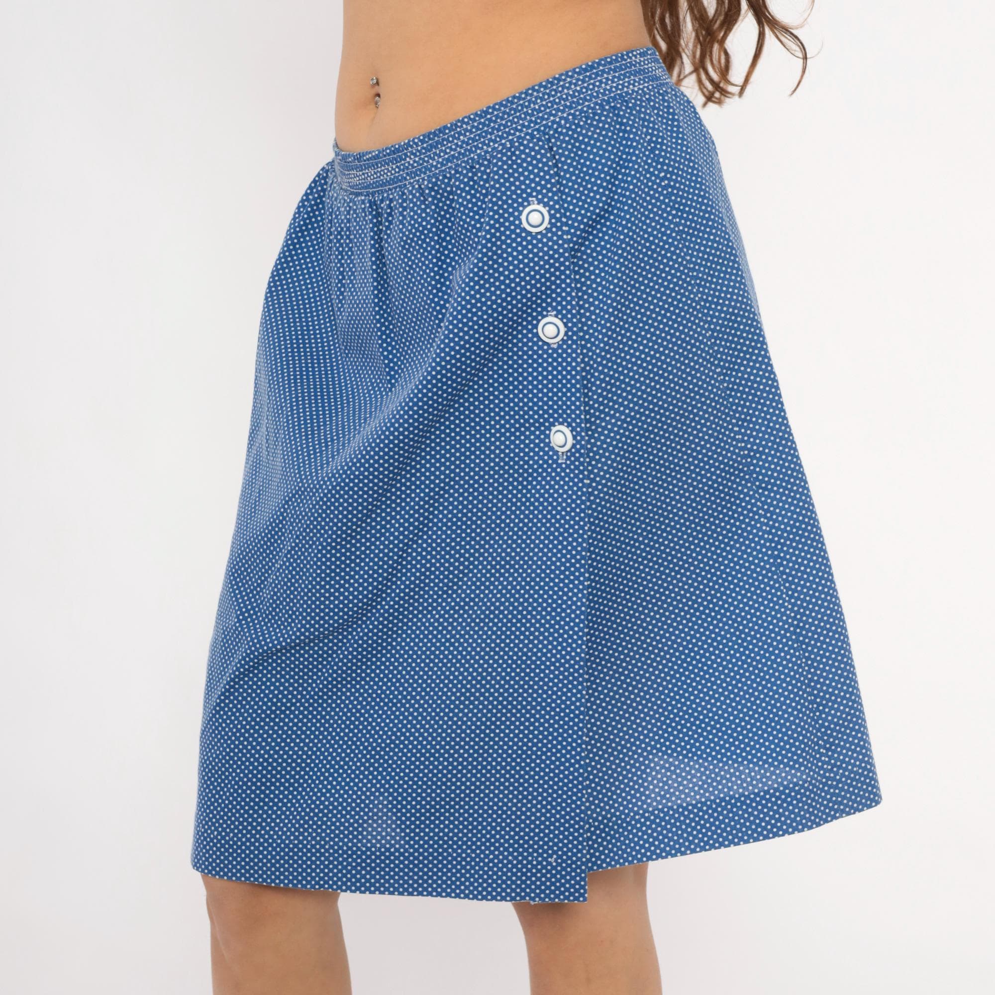 80s blue and white polka dot skort from G.W. with an A-line wrap skirt overlay and knee-length shorts underneath. Three white snap buttons along the left side secure the skirt panel, with an elastic waistband and gathered front. Small-scale dot print across the entire garment in a periwinkle blue base with white dots.