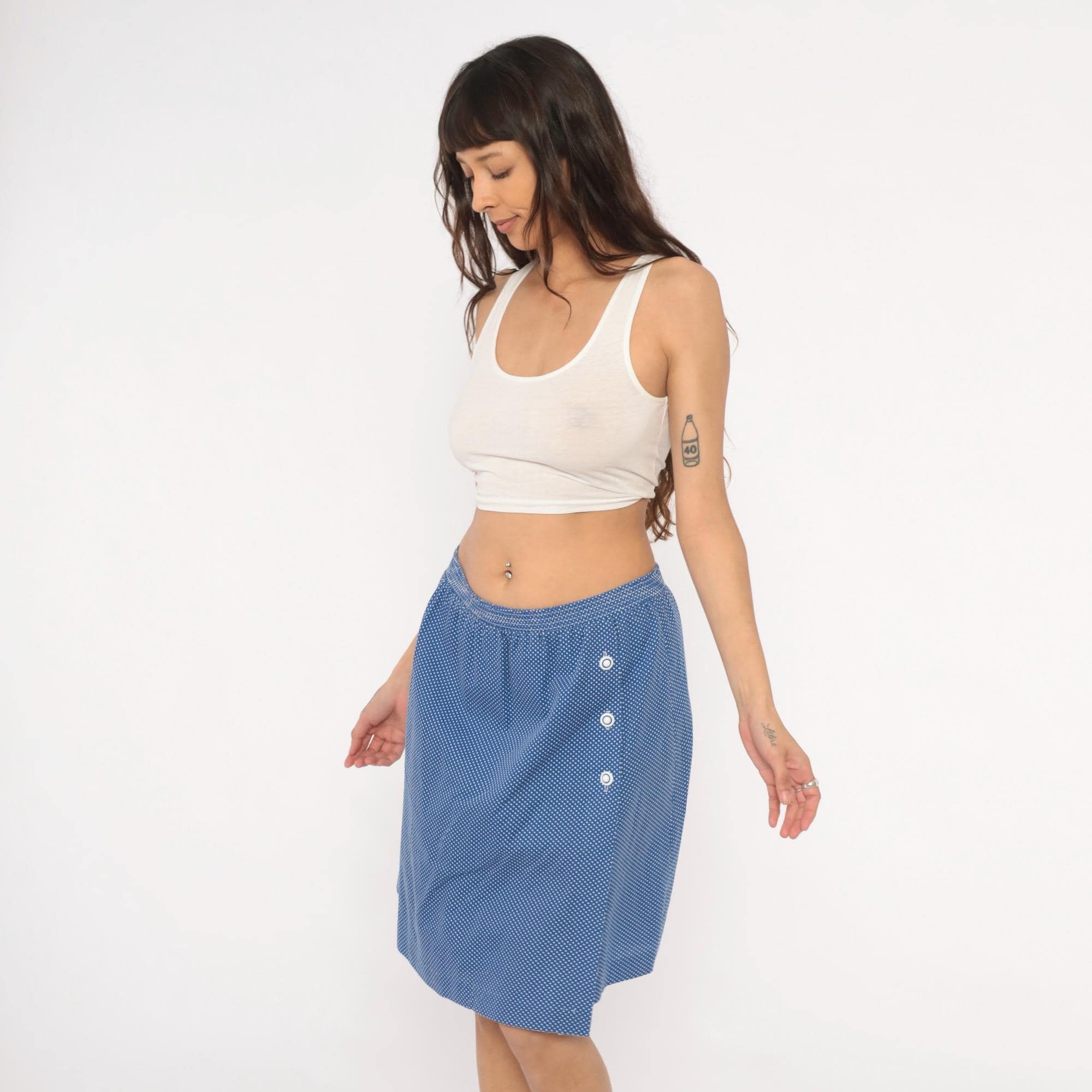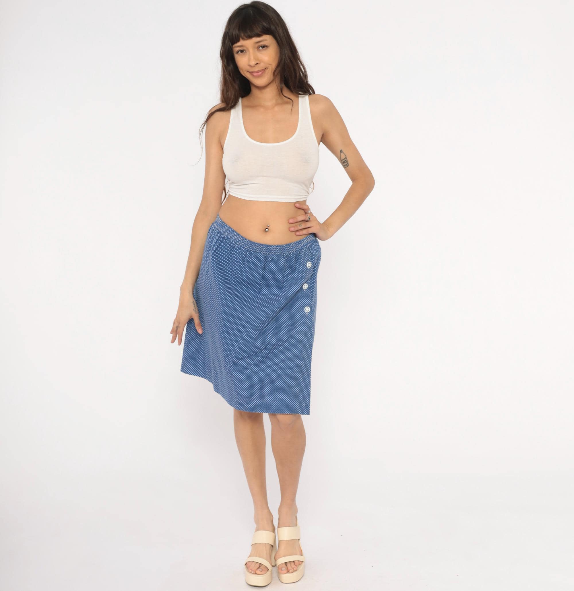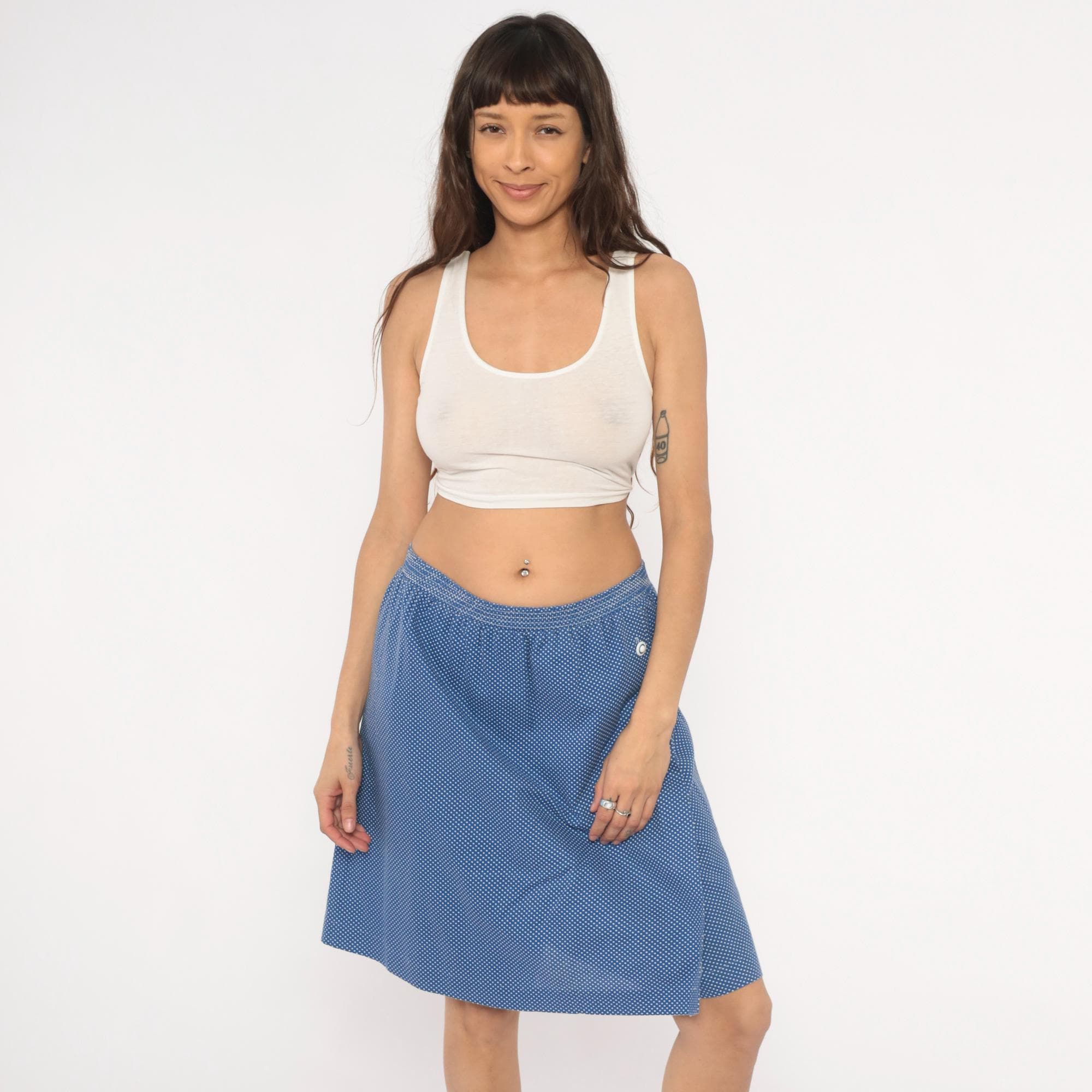 80s blue and white polka dot skort from G.W. with an A-line wrap skirt overlay and knee-length shorts underneath. Three white snap buttons along the left side secure the skirt panel, with an elastic waistband and gathered front. Small-scale dot print across the entire garment in a periwinkle blue base with white dots.