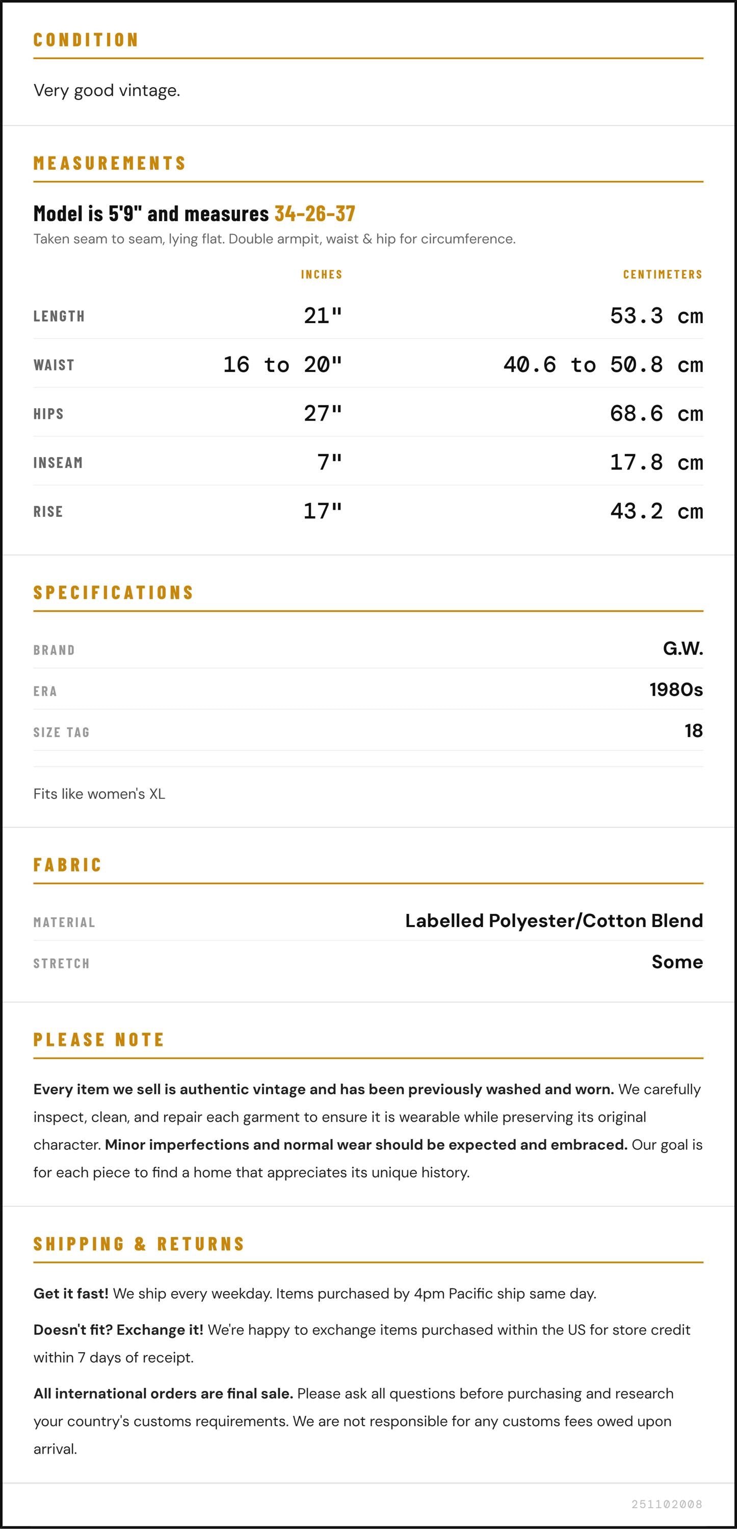 Vintage denim was usually made without any stretch, unlike modern jeans. Check the measurements to ensure proper fit, and remember to give yourself a little wiggle room in the waist and hips, depending on your preferred fit.