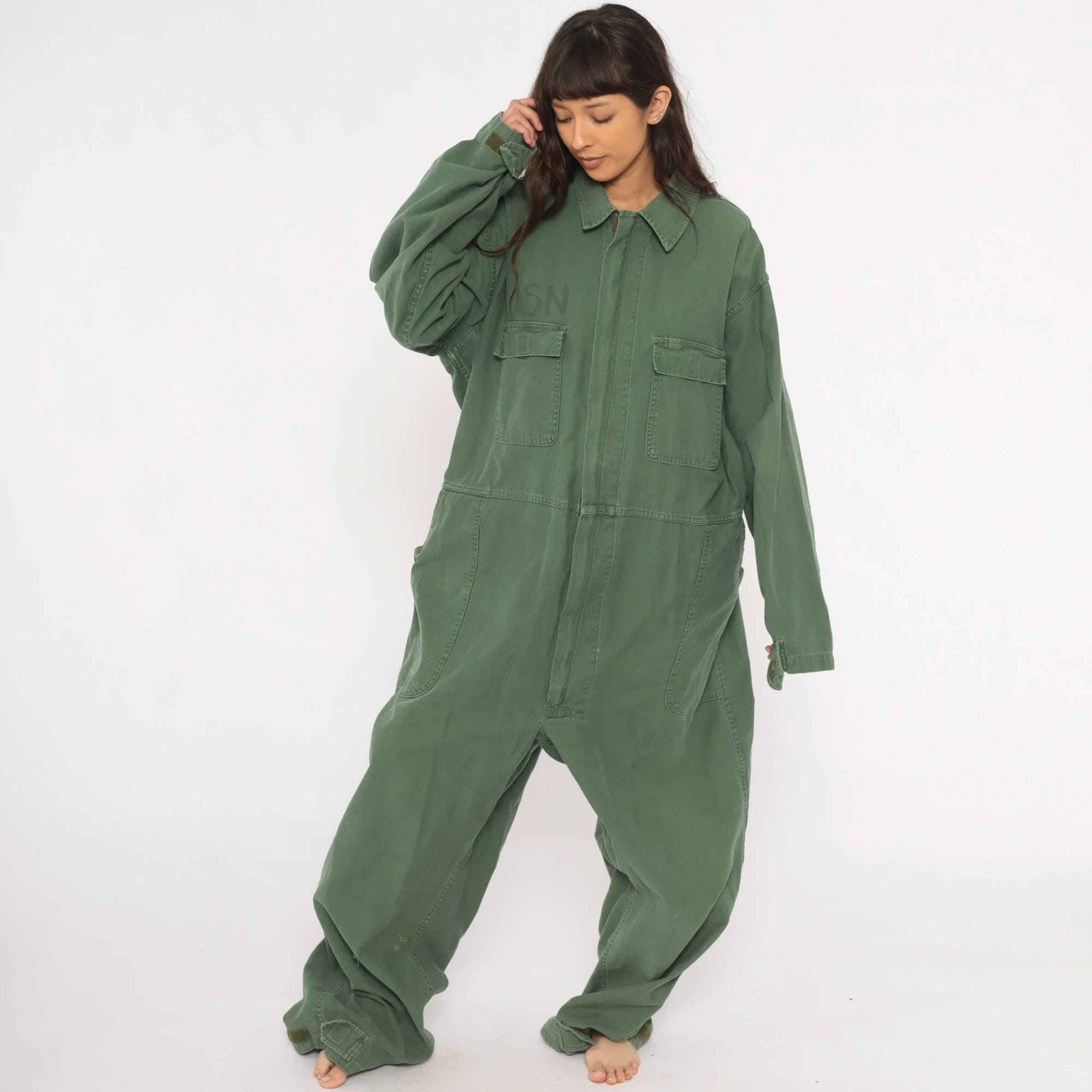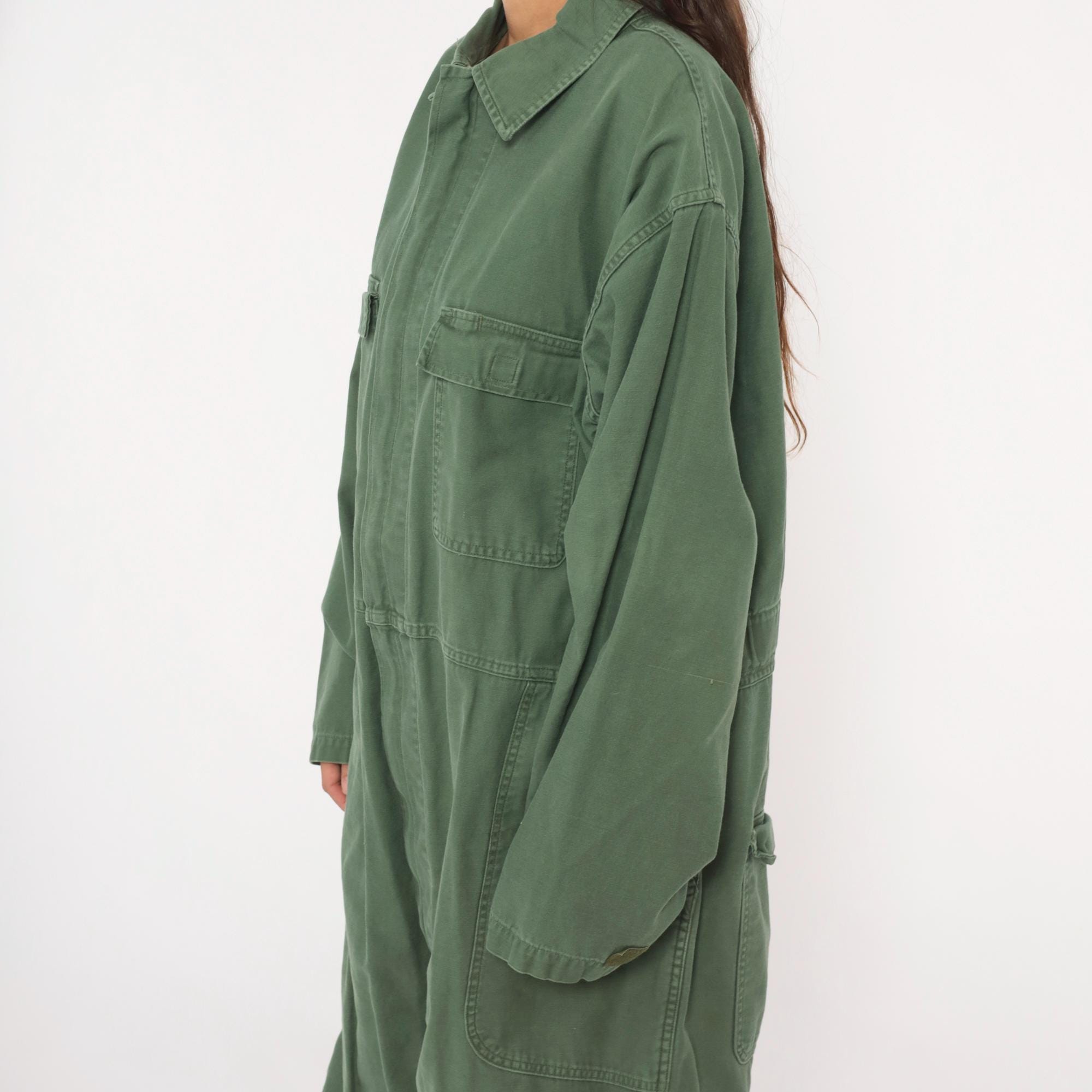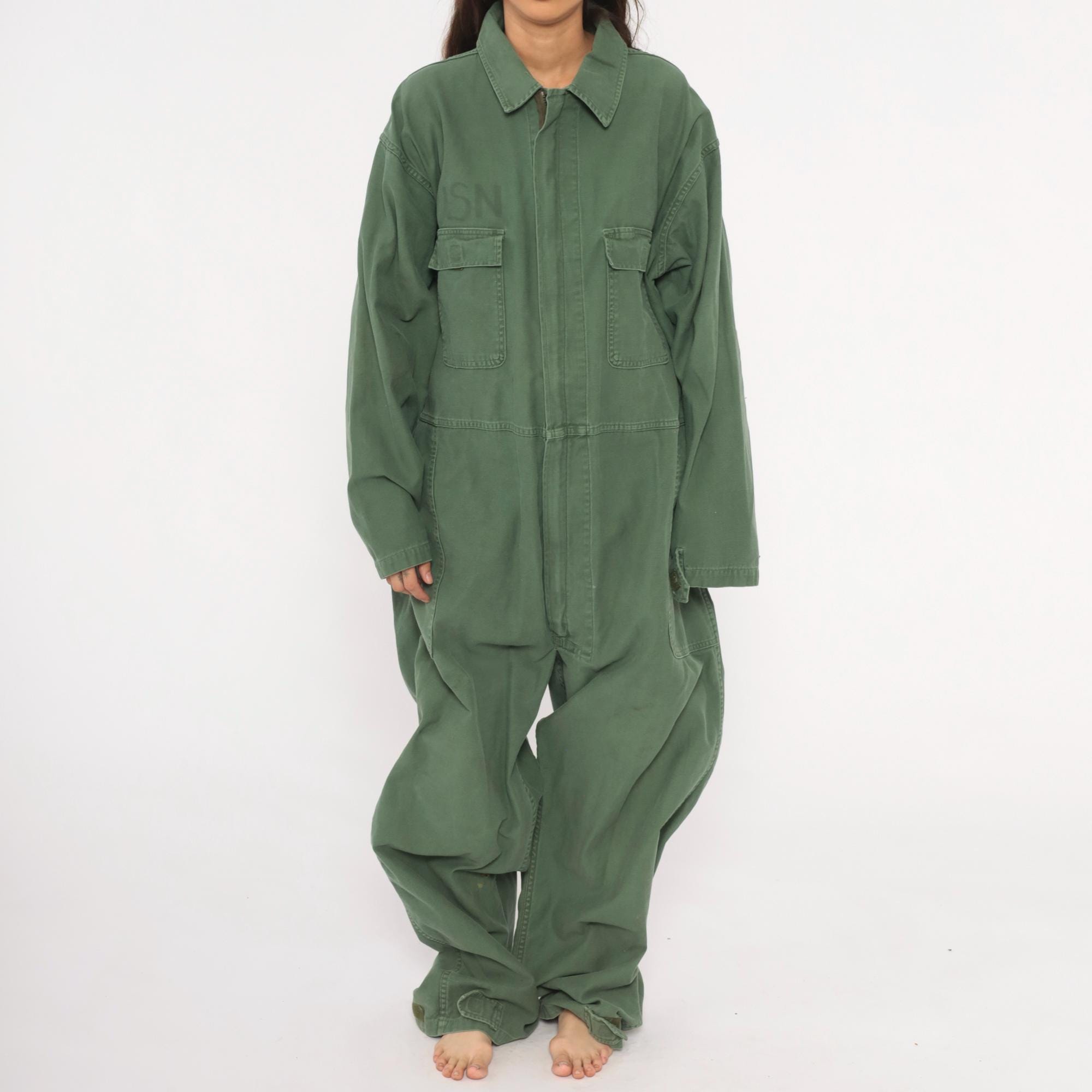 90s olive drab USN-stamped coveralls from Equa Industries Inc with a full front zipper closure and pointed fold-down collar. Two flap chest pockets, side seam pockets, and two flap back pockets. Long sleeves with straight cuffs, a waist seam, and wide straight legs.