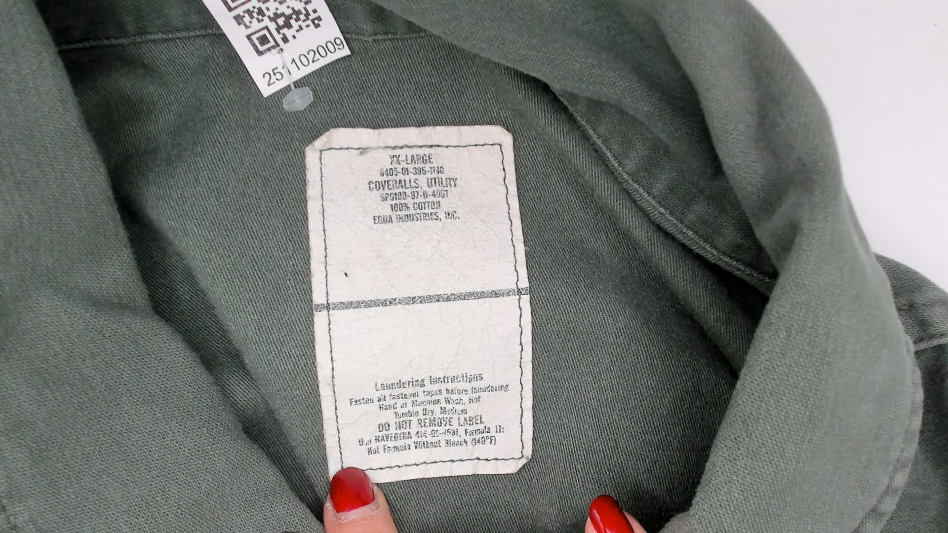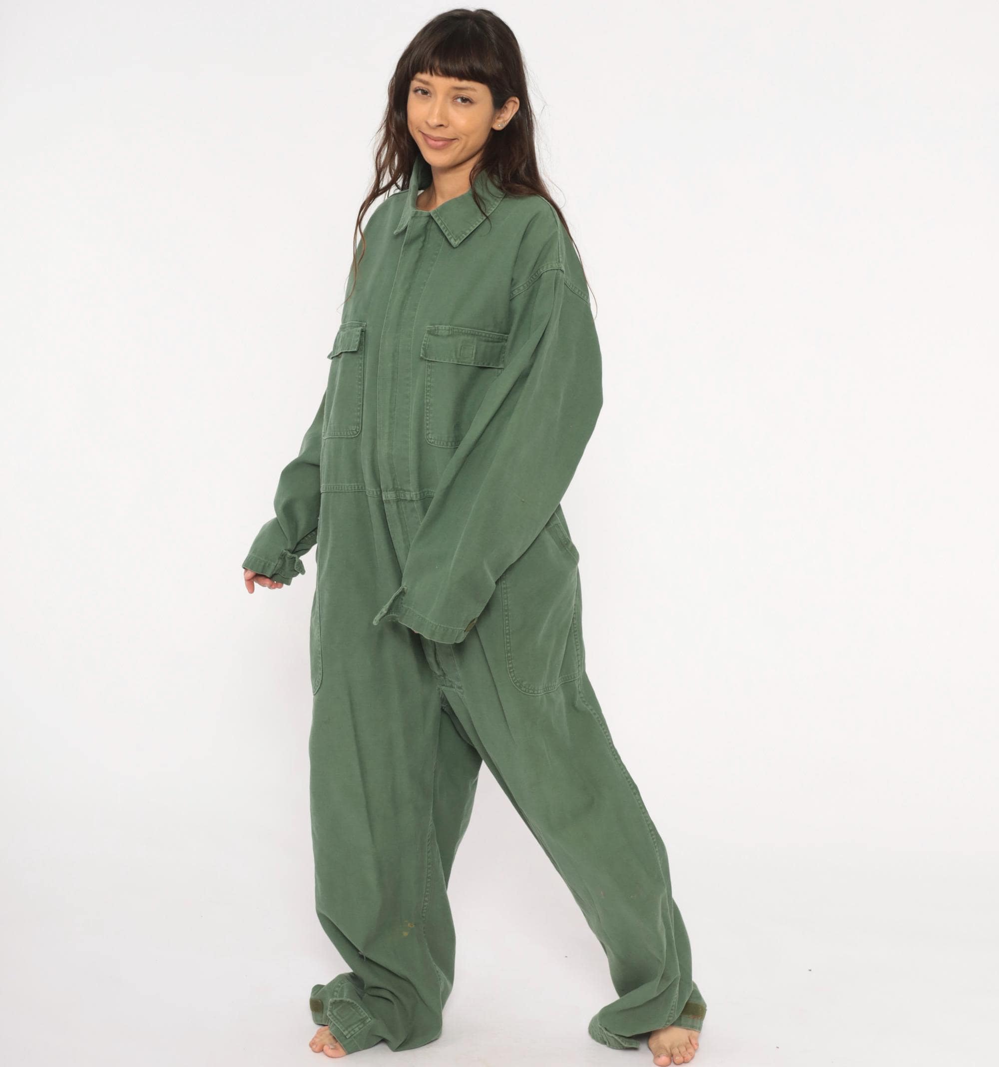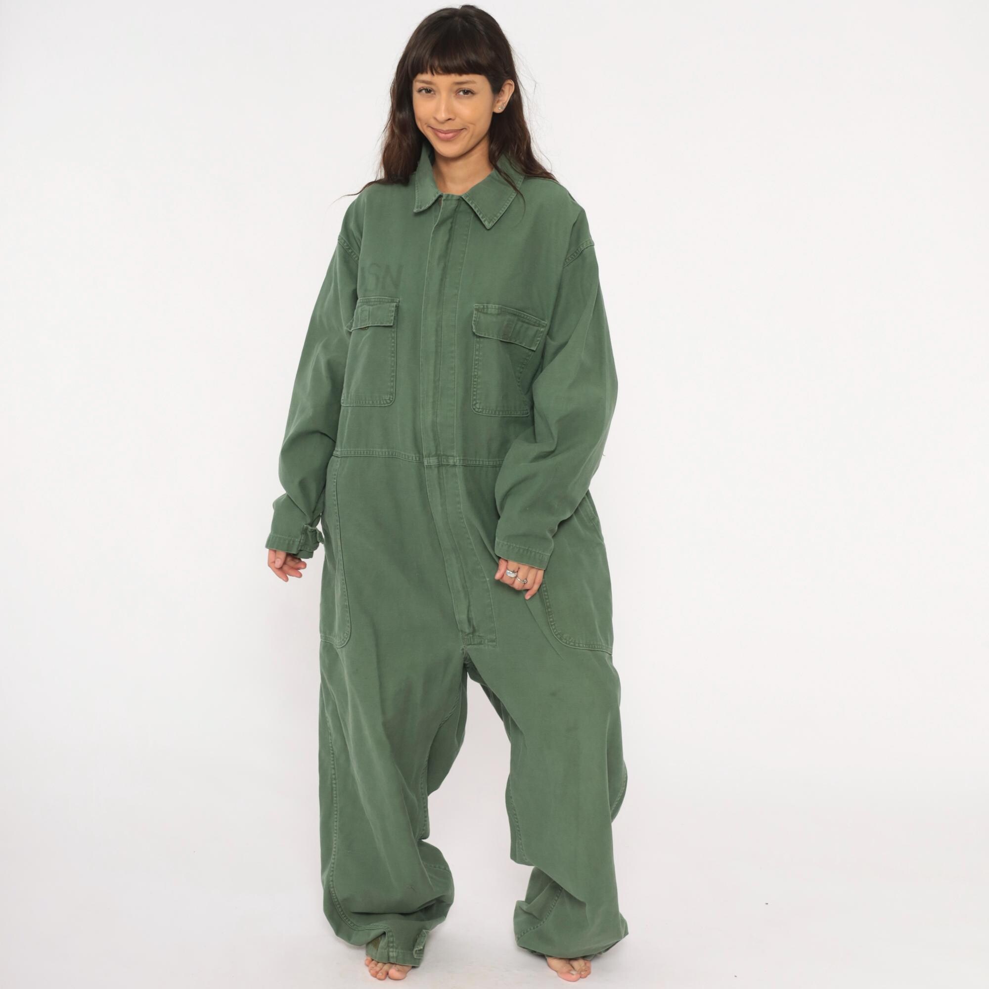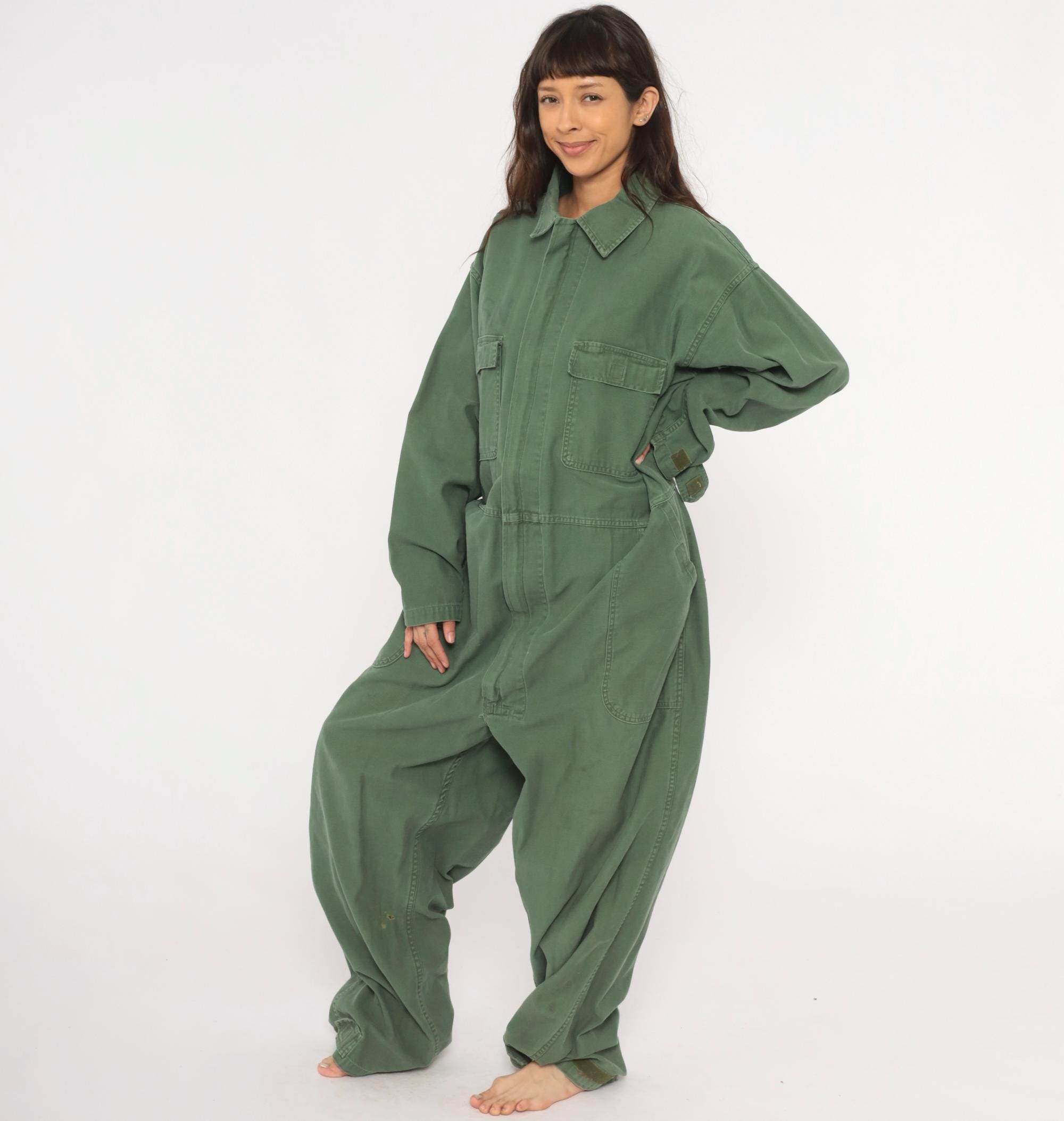 90s olive drab USN-stamped coveralls from Equa Industries Inc with a full front zipper closure and pointed fold-down collar. Two flap chest pockets, side seam pockets, and two flap back pockets. Long sleeves with straight cuffs, a waist seam, and wide straight legs.