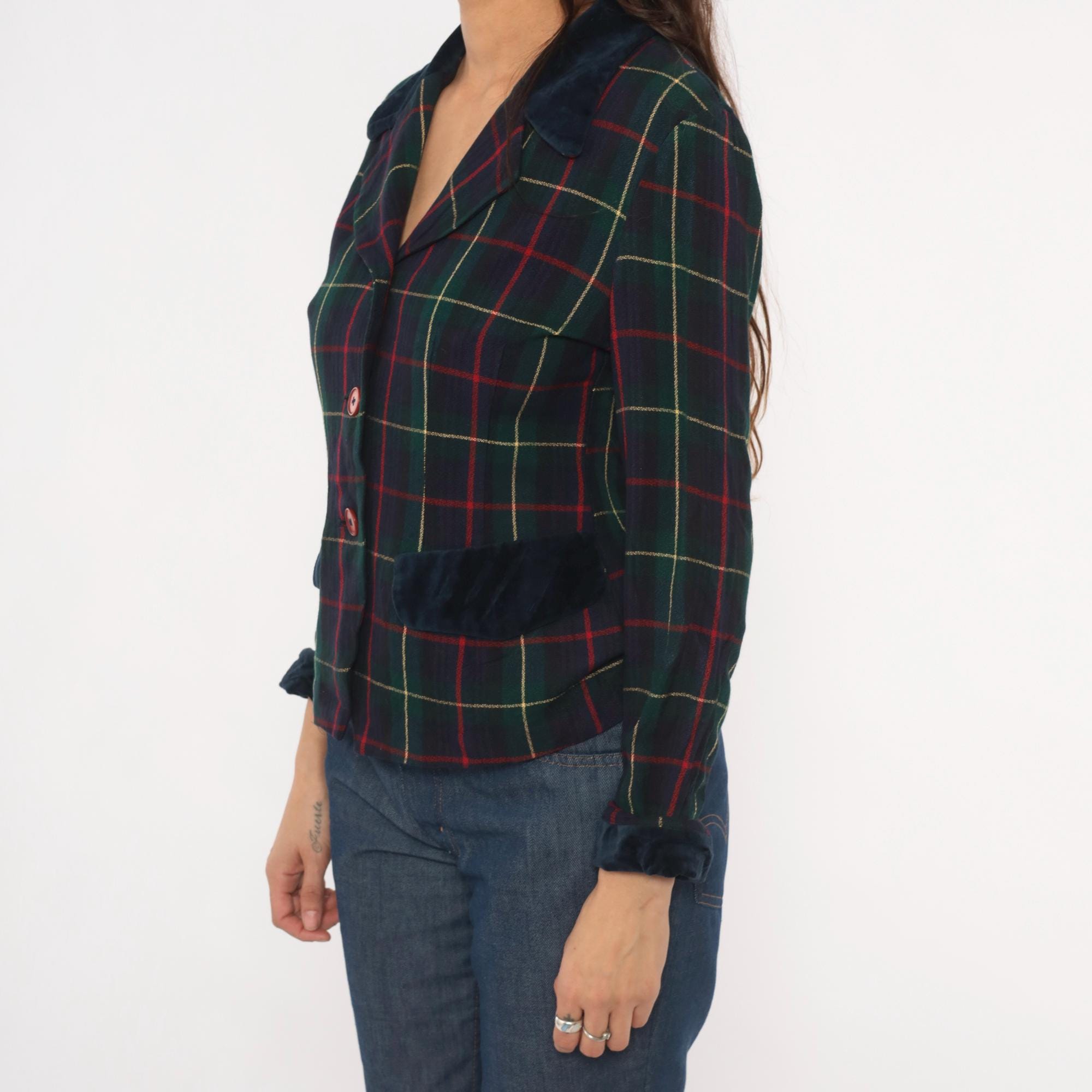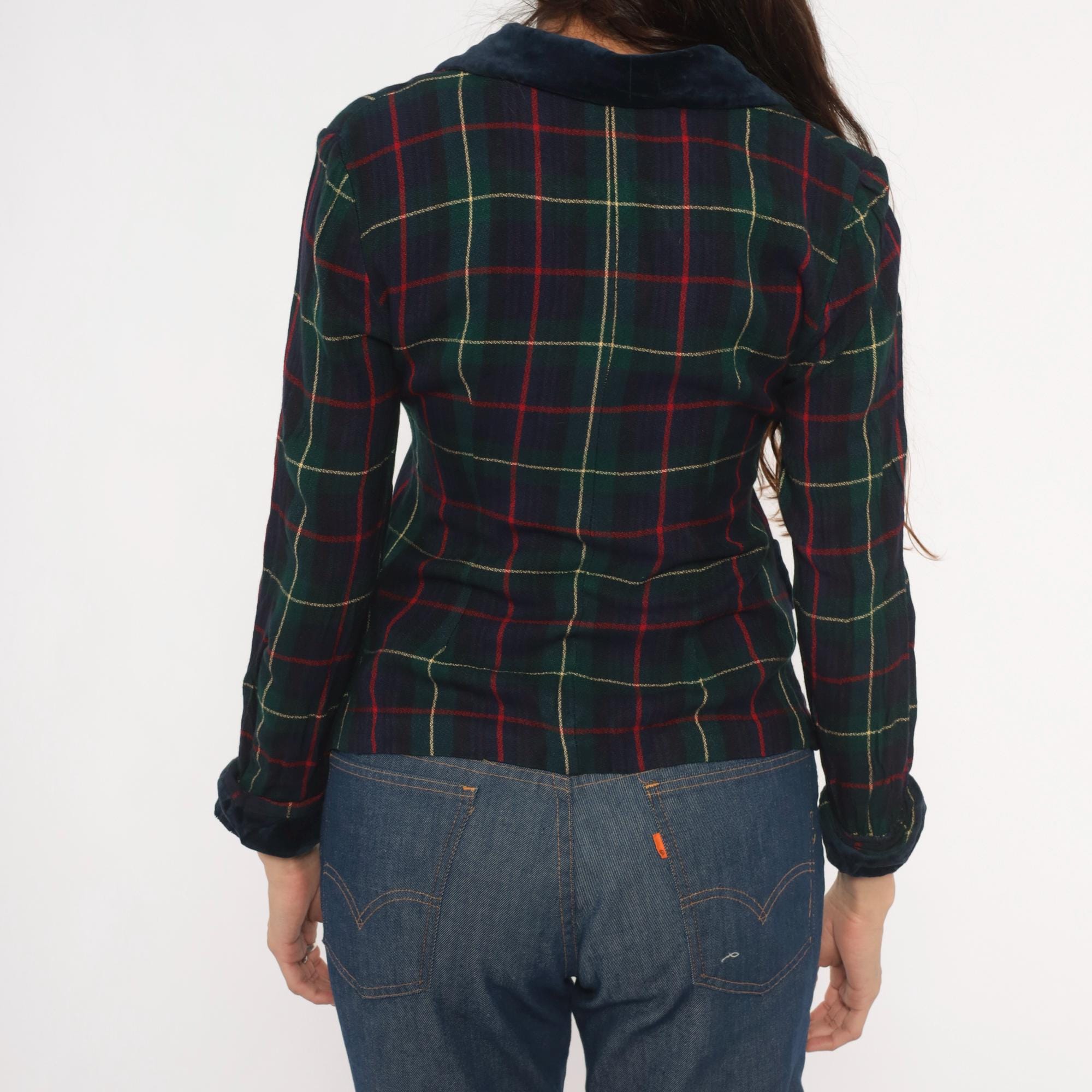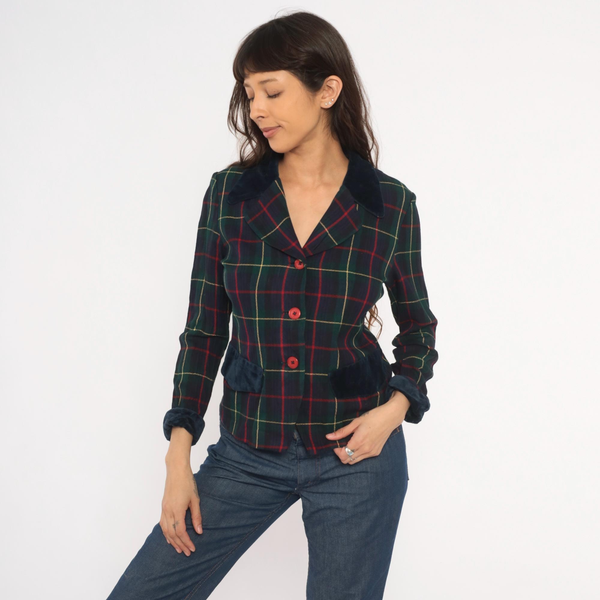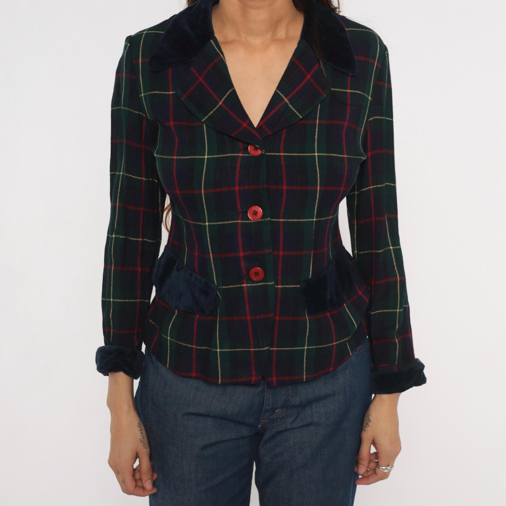 90s tartan plaid blazer from Dani Max in navy, forest green, and red with gold accent lines. Dark navy velvet collar, pocket flaps, and cuffs contrast against the woven plaid body. Three red button front closure, notched lapel, and fitted waist with a cropped hip length cut.